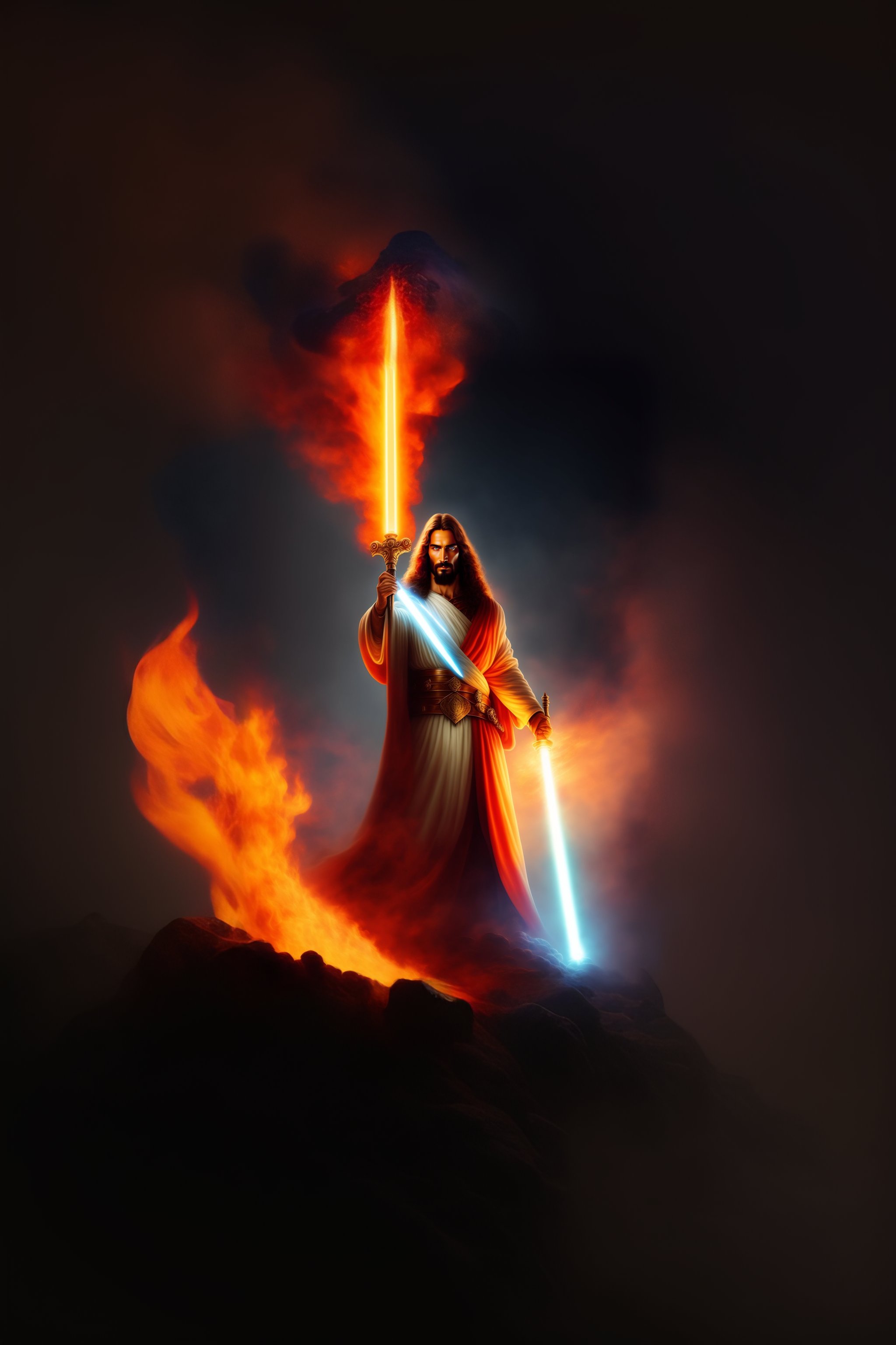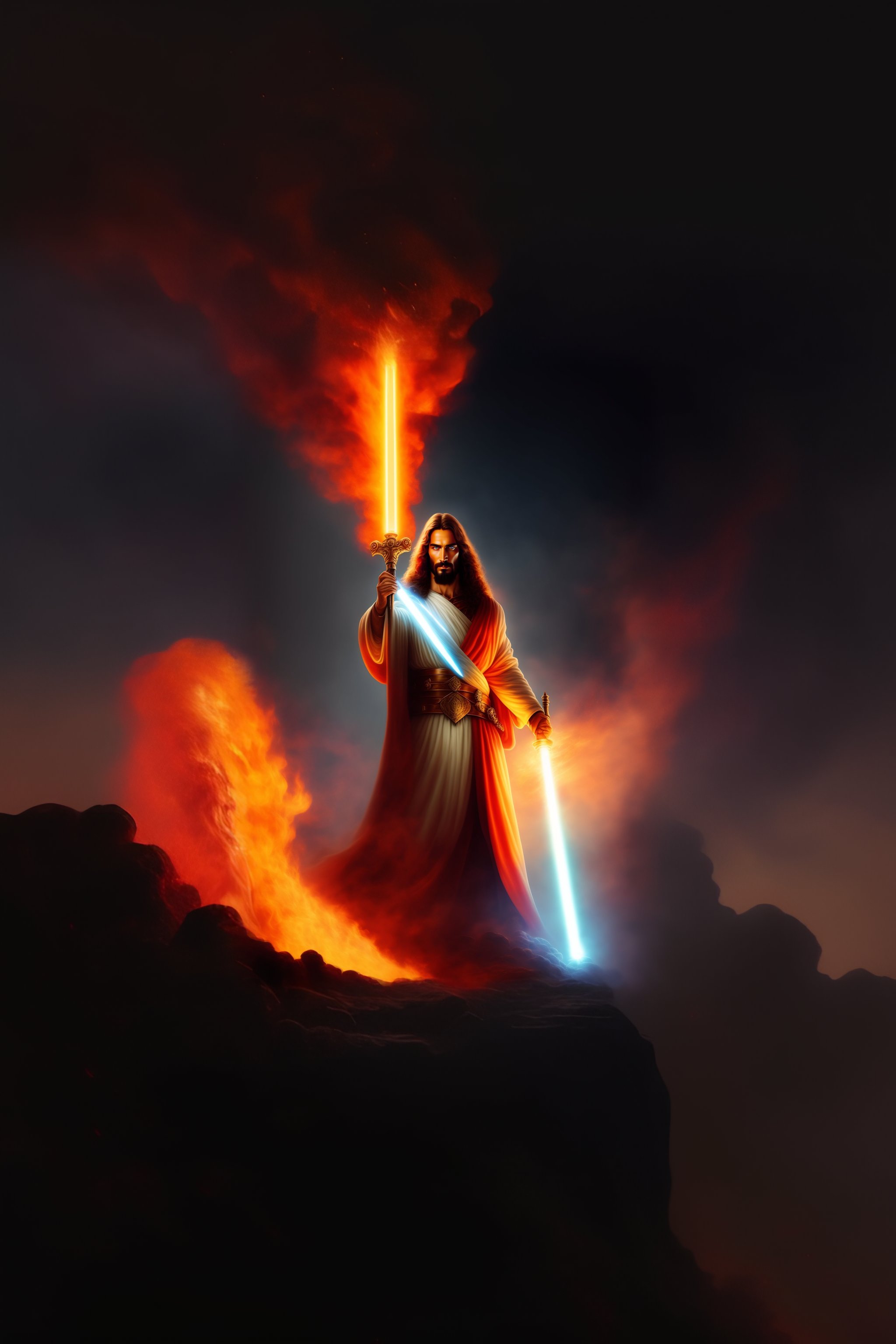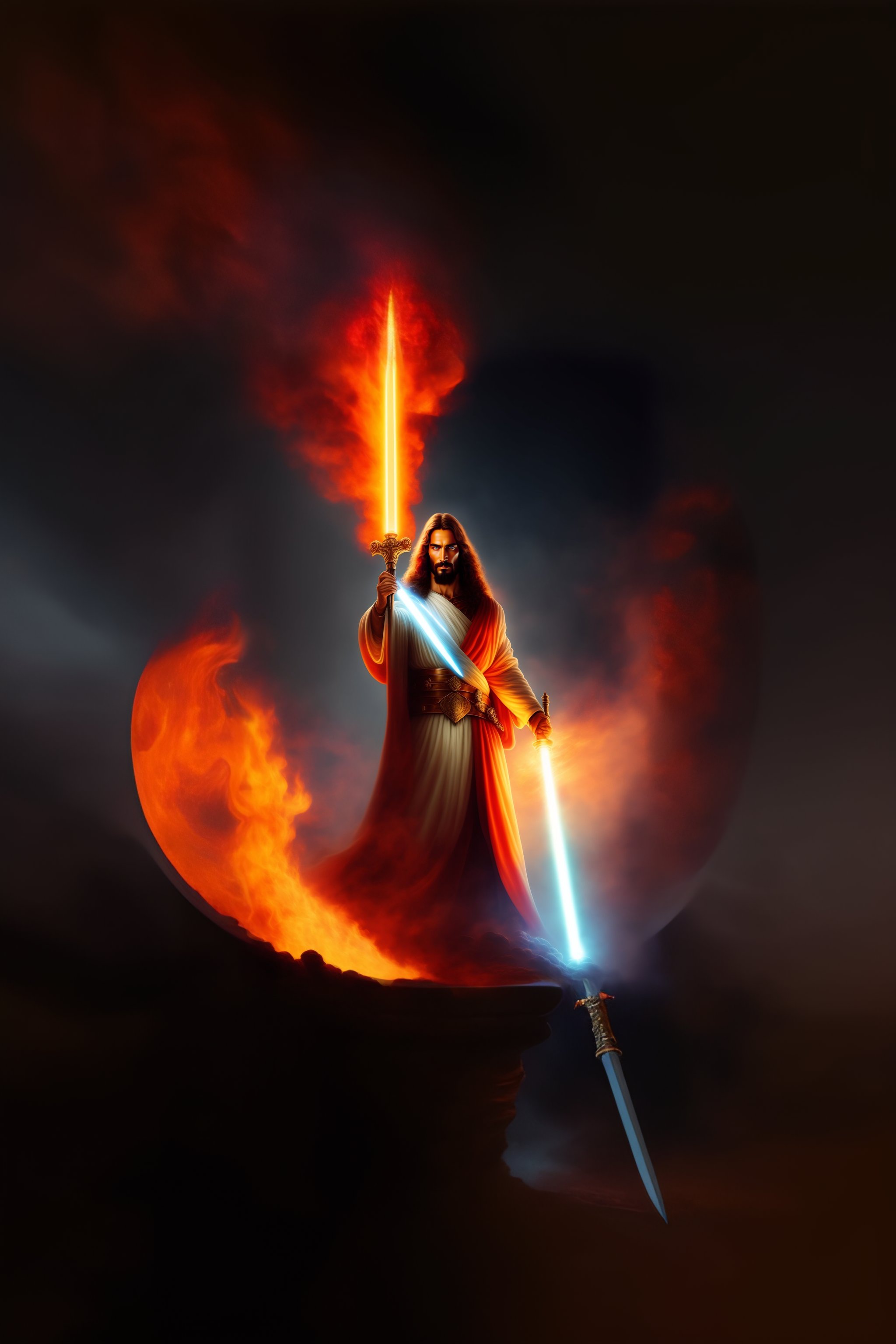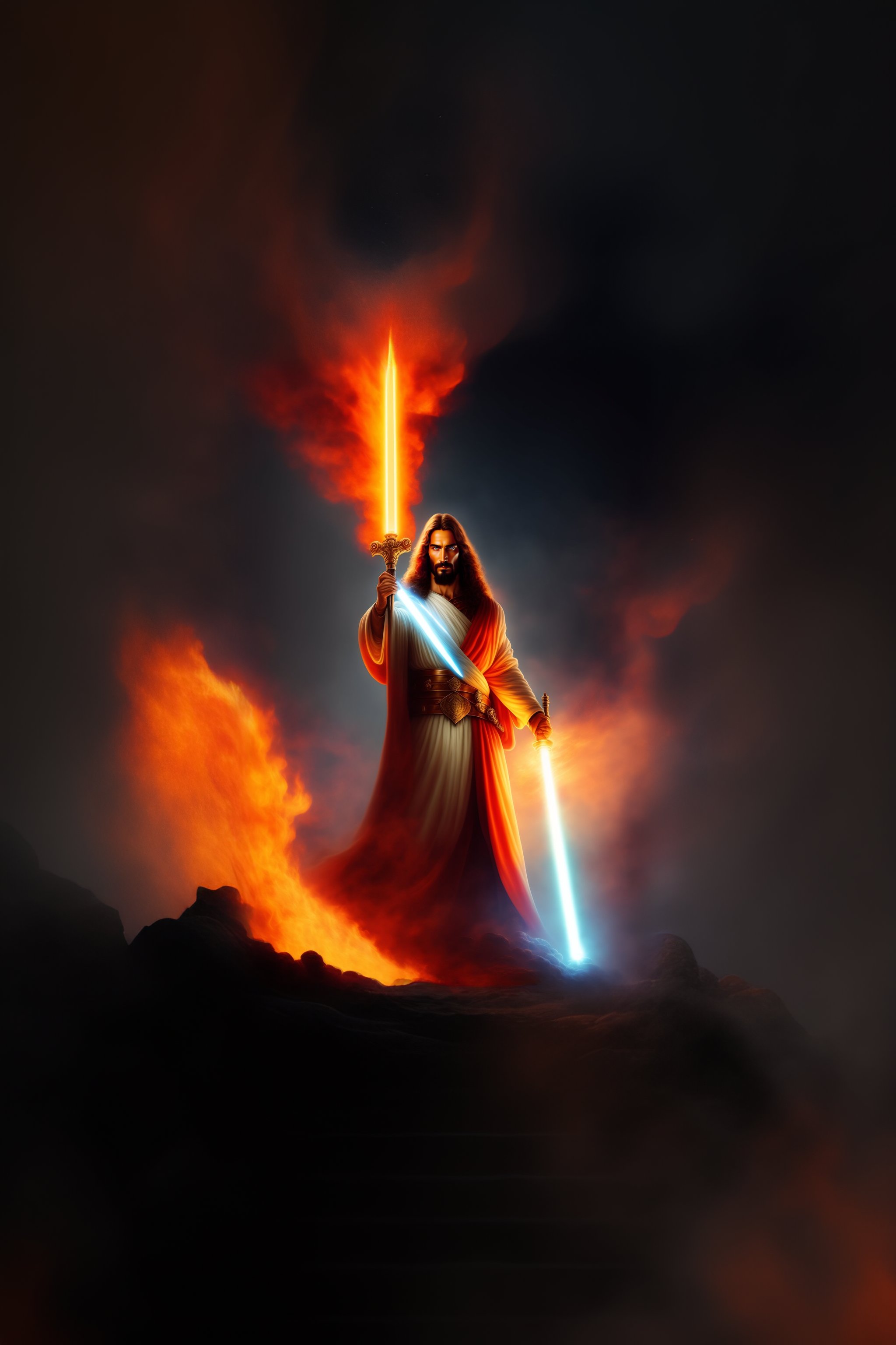 Jesus with burning eyes, full body on a white cloud, holding a flaming doom eternal crucible long sword lightsaber in his right hand