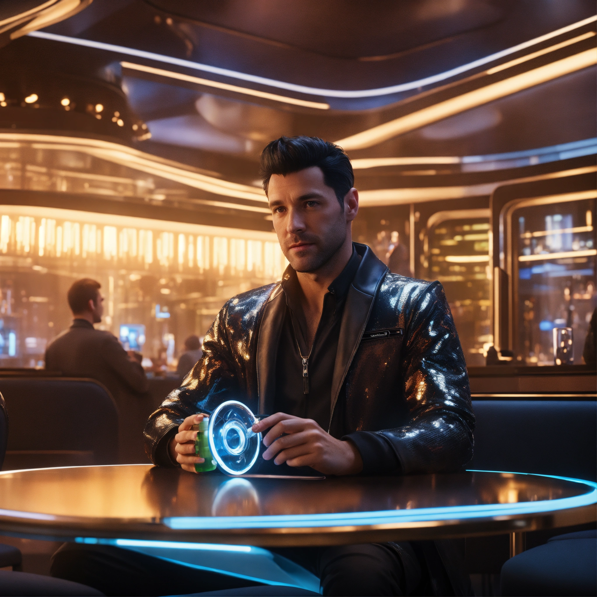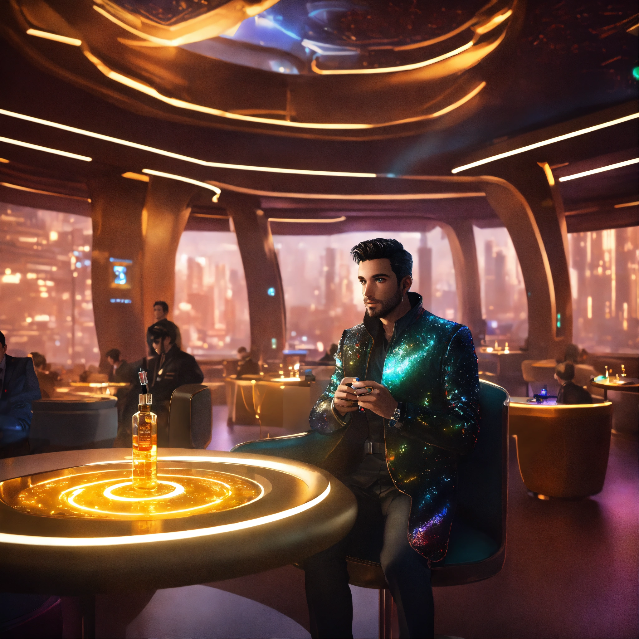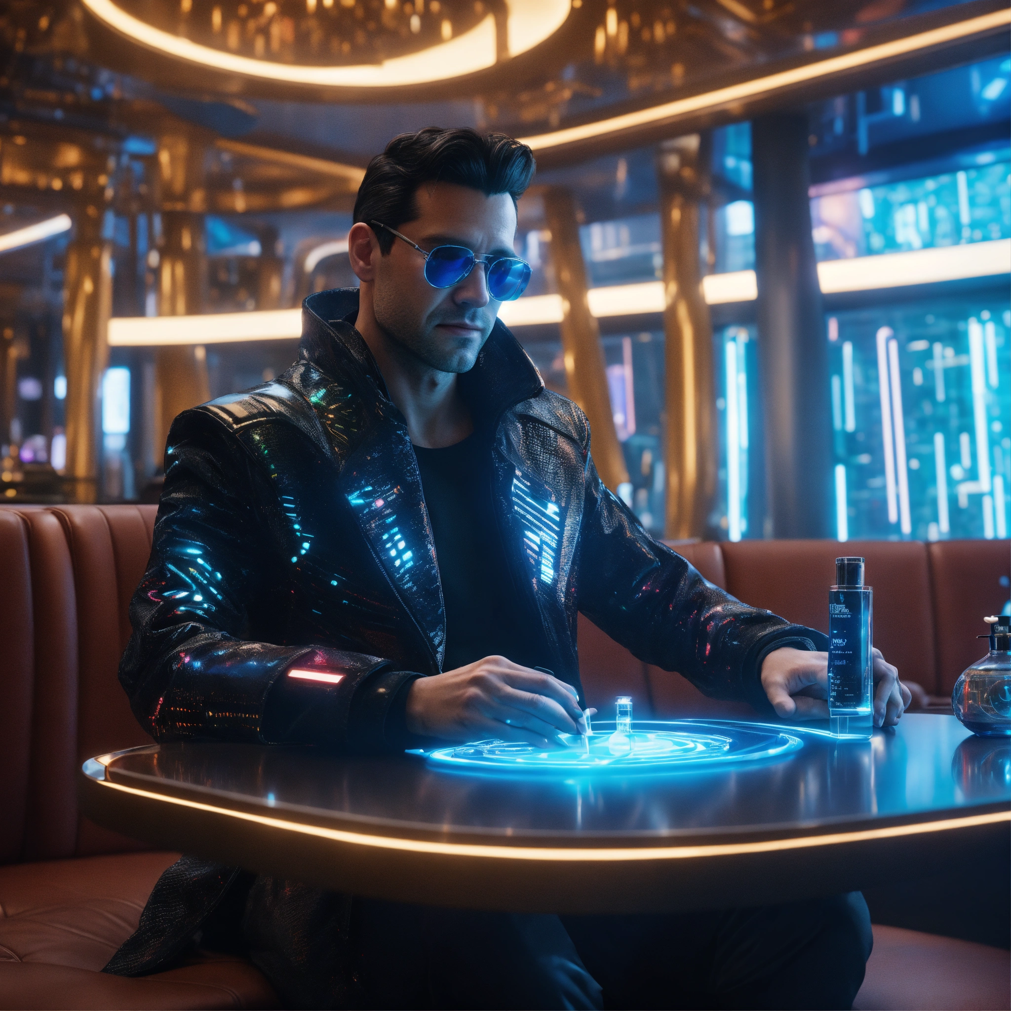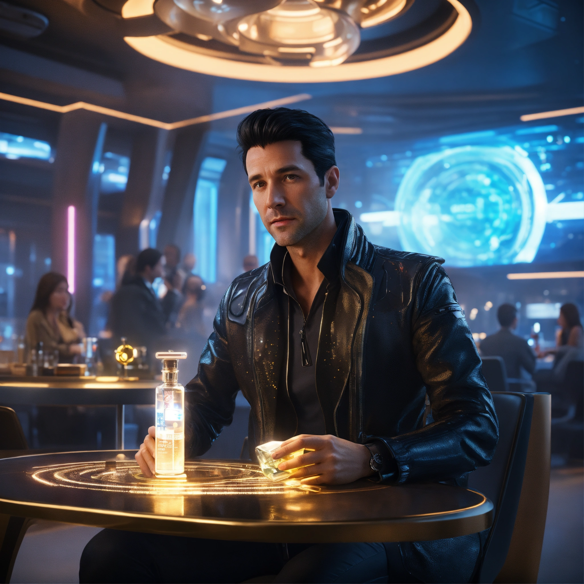 35 year old white male doctor with black hair wearing futuristic spy jacket is sitting at a table in a luxurious crowded space port lounge, holding up a tiny vial of the magical god particle solution, realistic, futuristic, sci-fi, 8k, unreal engine, pixar, zaha hadid