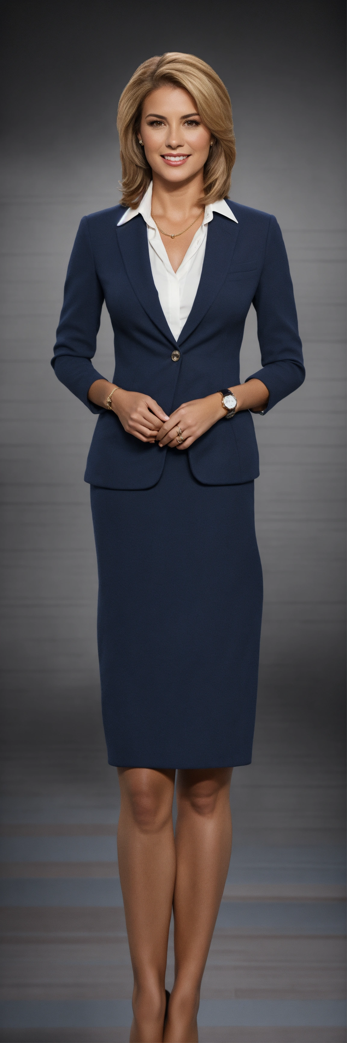Realistic female tv news anchor, shoulder-to-waist portrait, anchoring, tagged with a lapel microphone