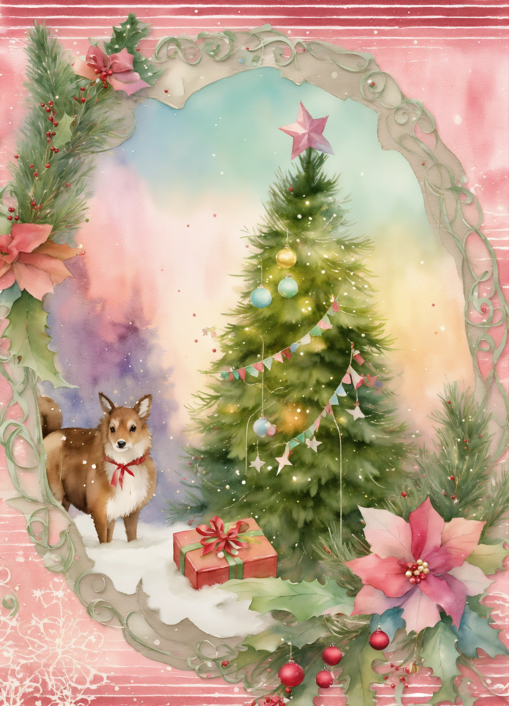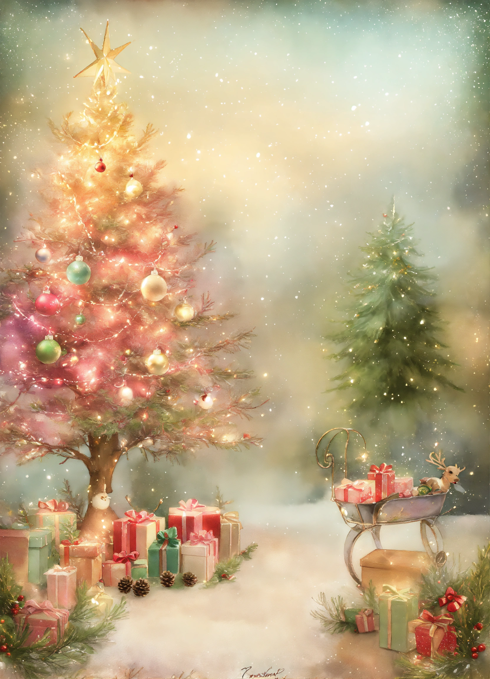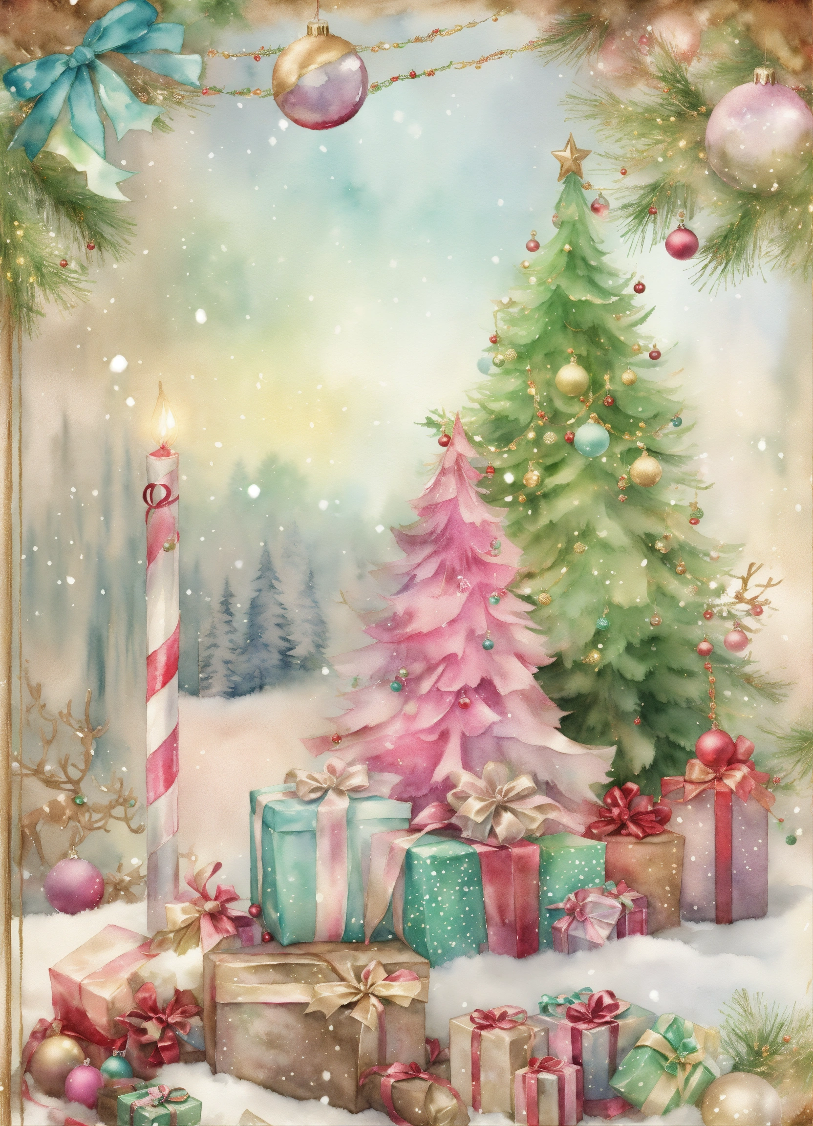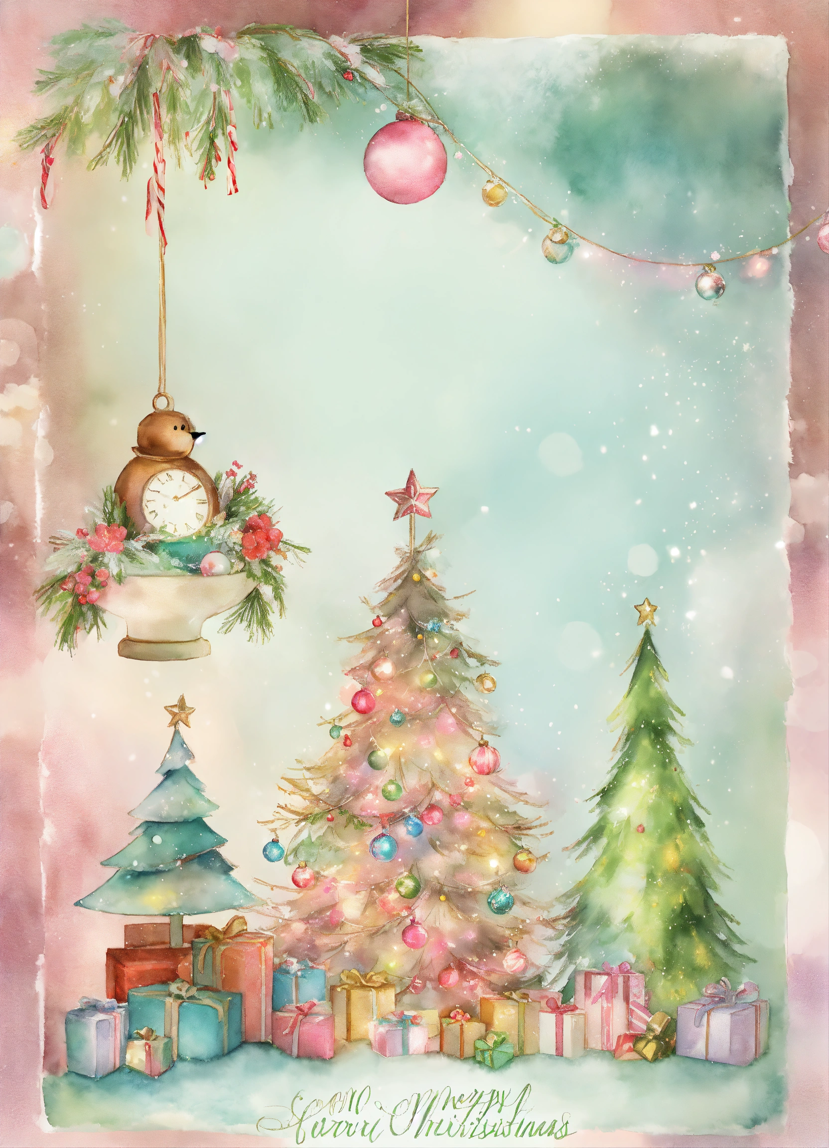 Shabby chic dreamy mist pastel junk journals "create enchanting watercolor illustrations of christmas scenes, featuring festive holiday elements and characters. tinsel shiny, metallic decorations often used to adorn christmas trees and other holiday displays. provide each element, such as ornaments, christmas trees, santa claus, reindeer, and more, as separate png images, perfect for easy cutting and use in crafting projects like card making, scrapbooking, and creating holiday-themed decorations. these digital illustrations should capture the joyful and magical spirit of christmas, offering a versatile resource for creating heartwarming and visually captivating holiday crafts." swirling magical fairytale abstract art style