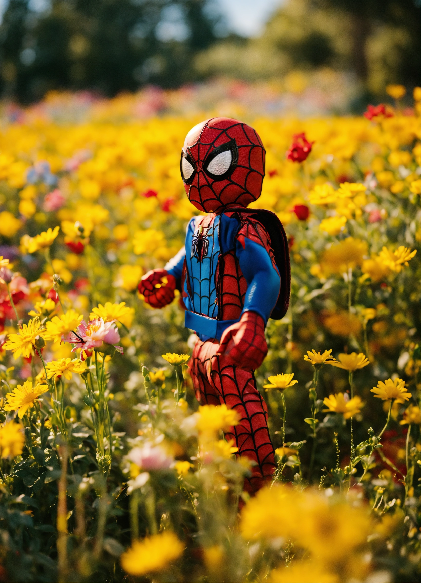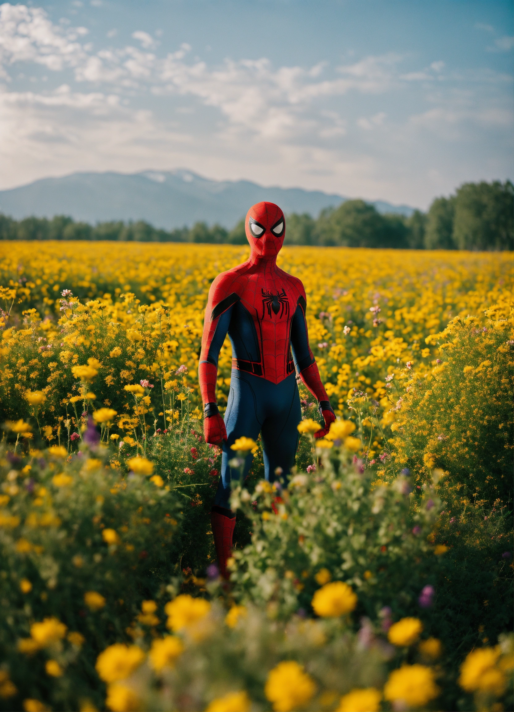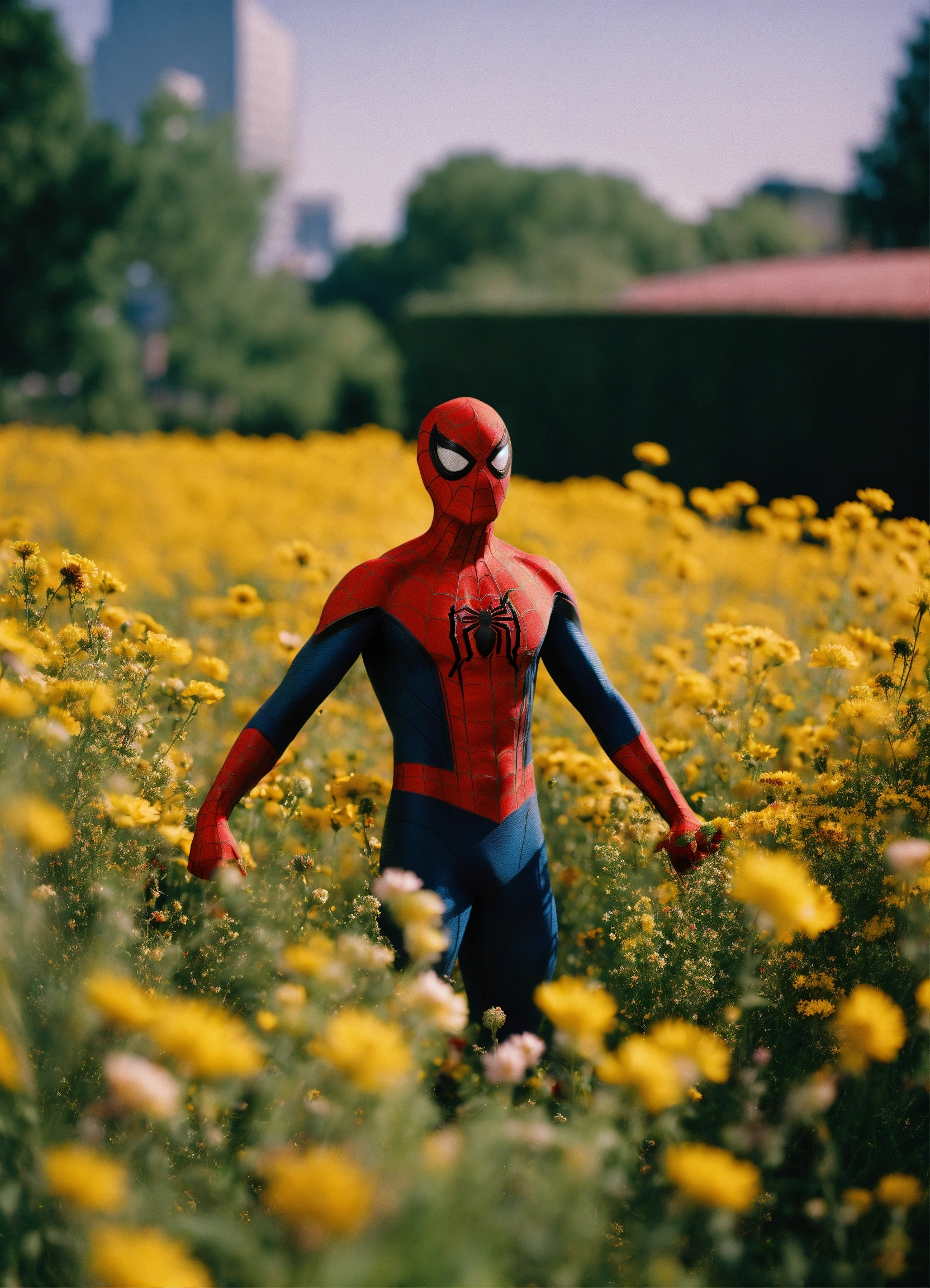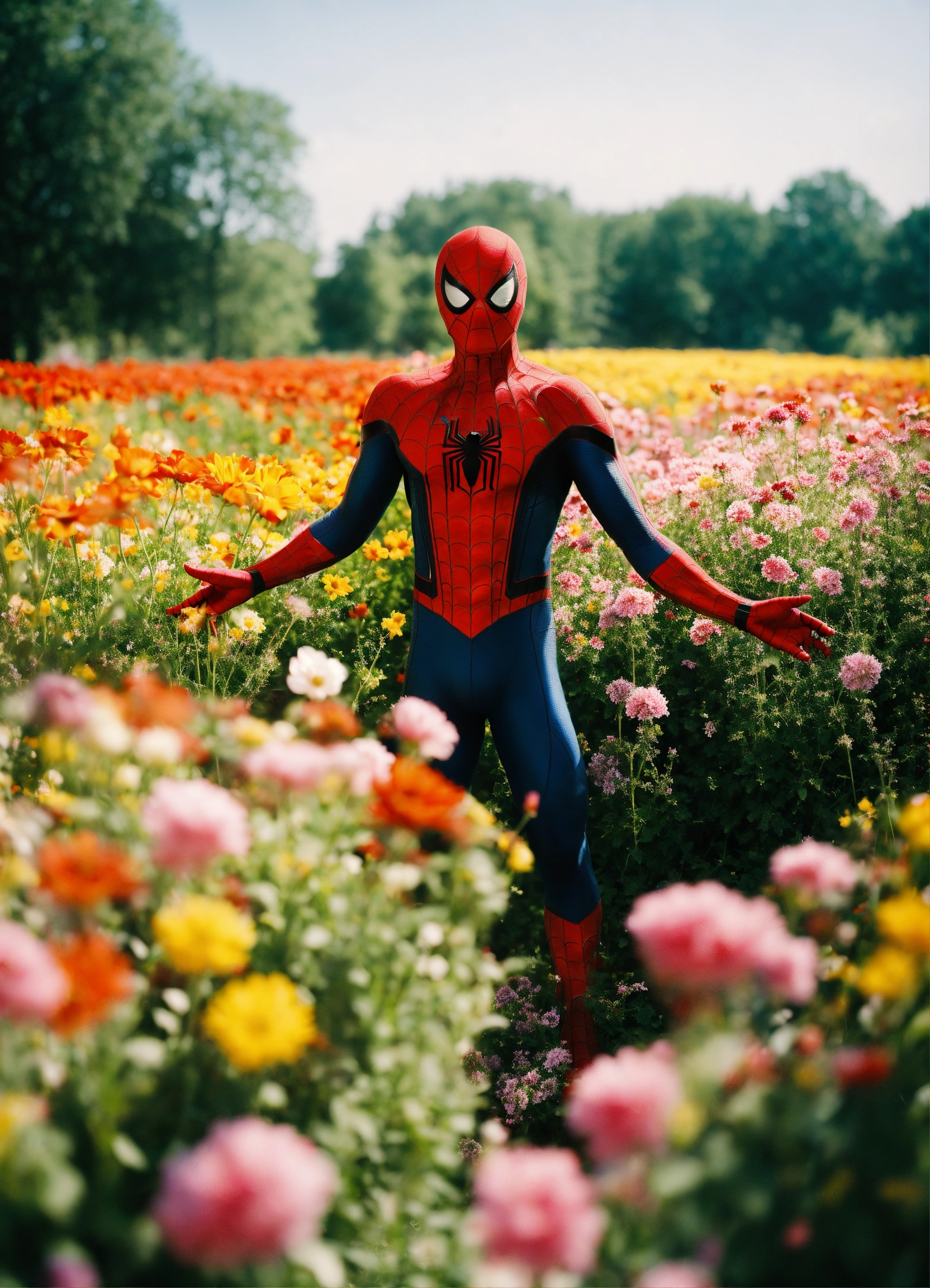 Happy spider-man standing in a beautiful field of flowers, colorful, perfect lighting, leica summicron 35mm f2.0, kodak portra 400, film grain