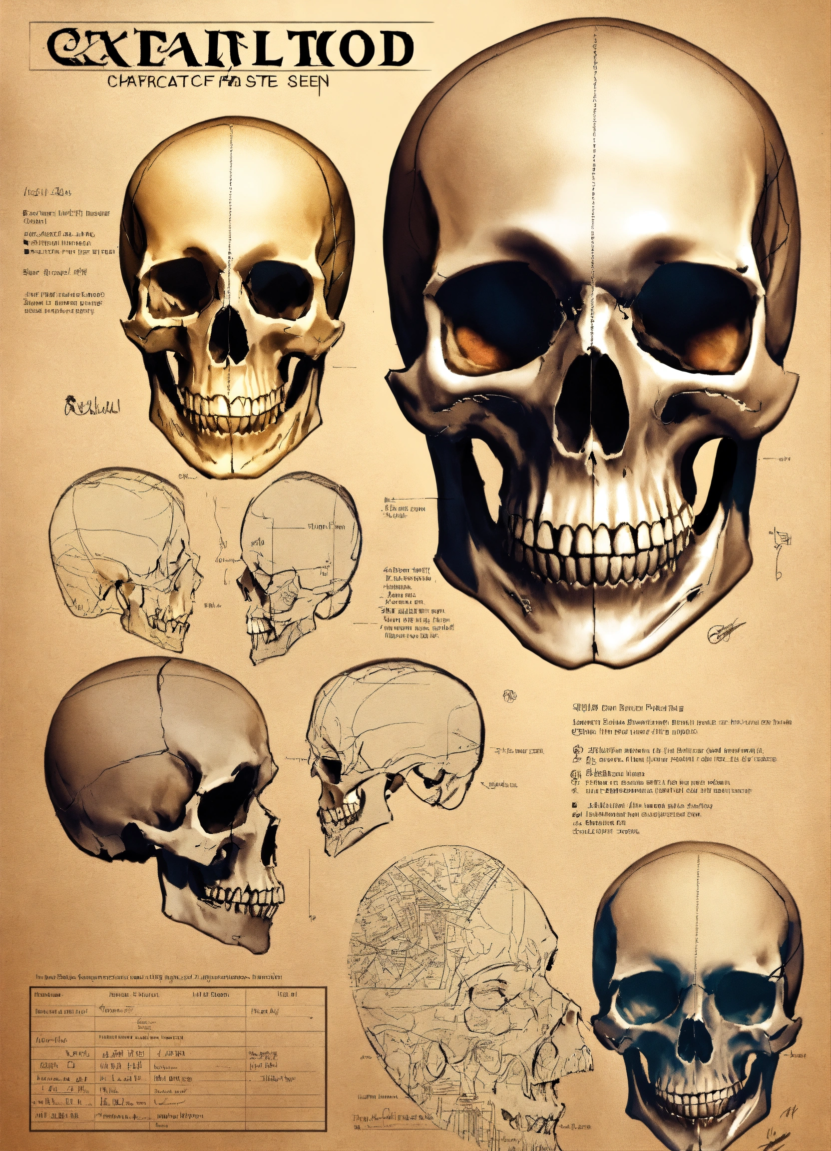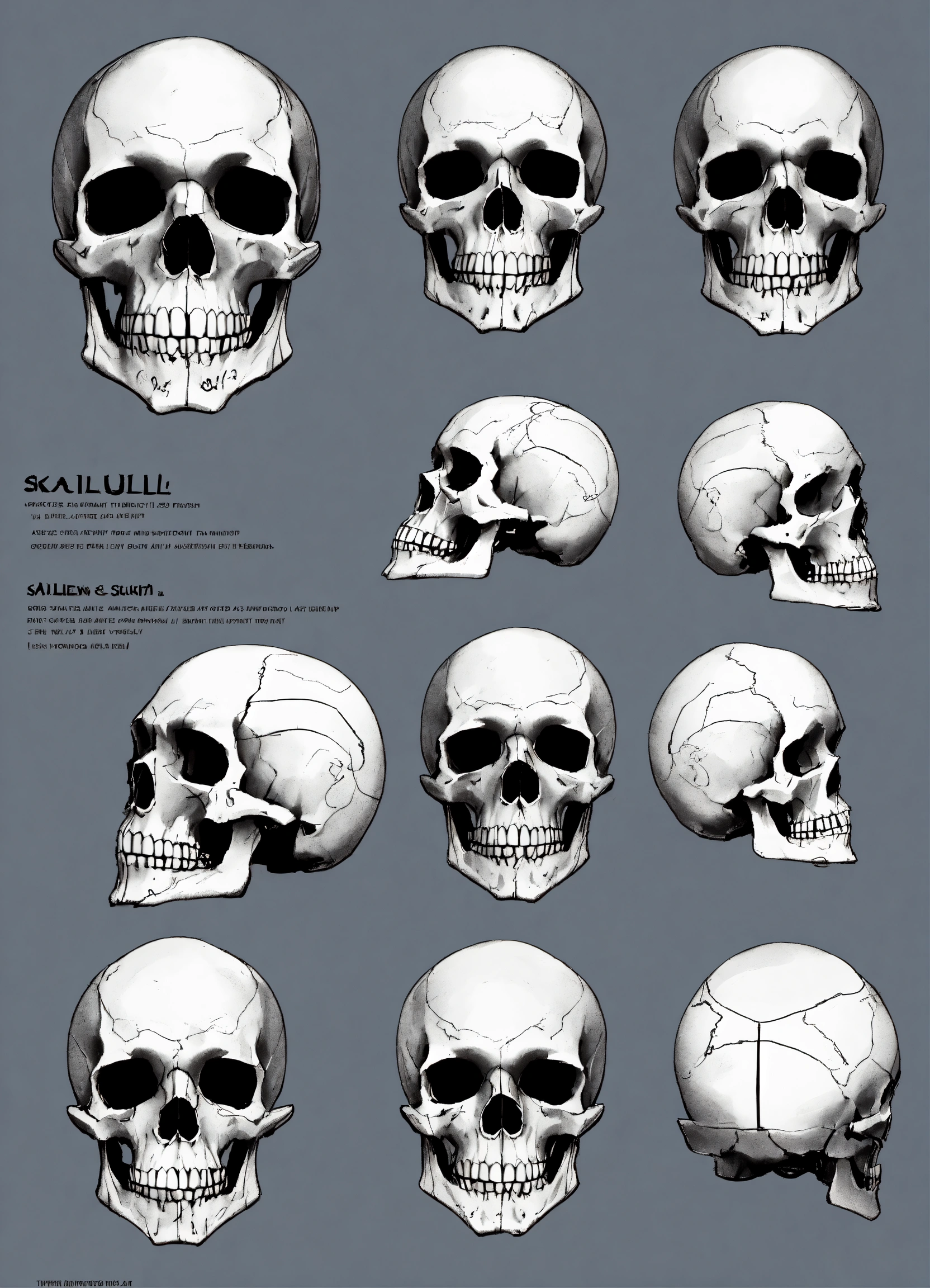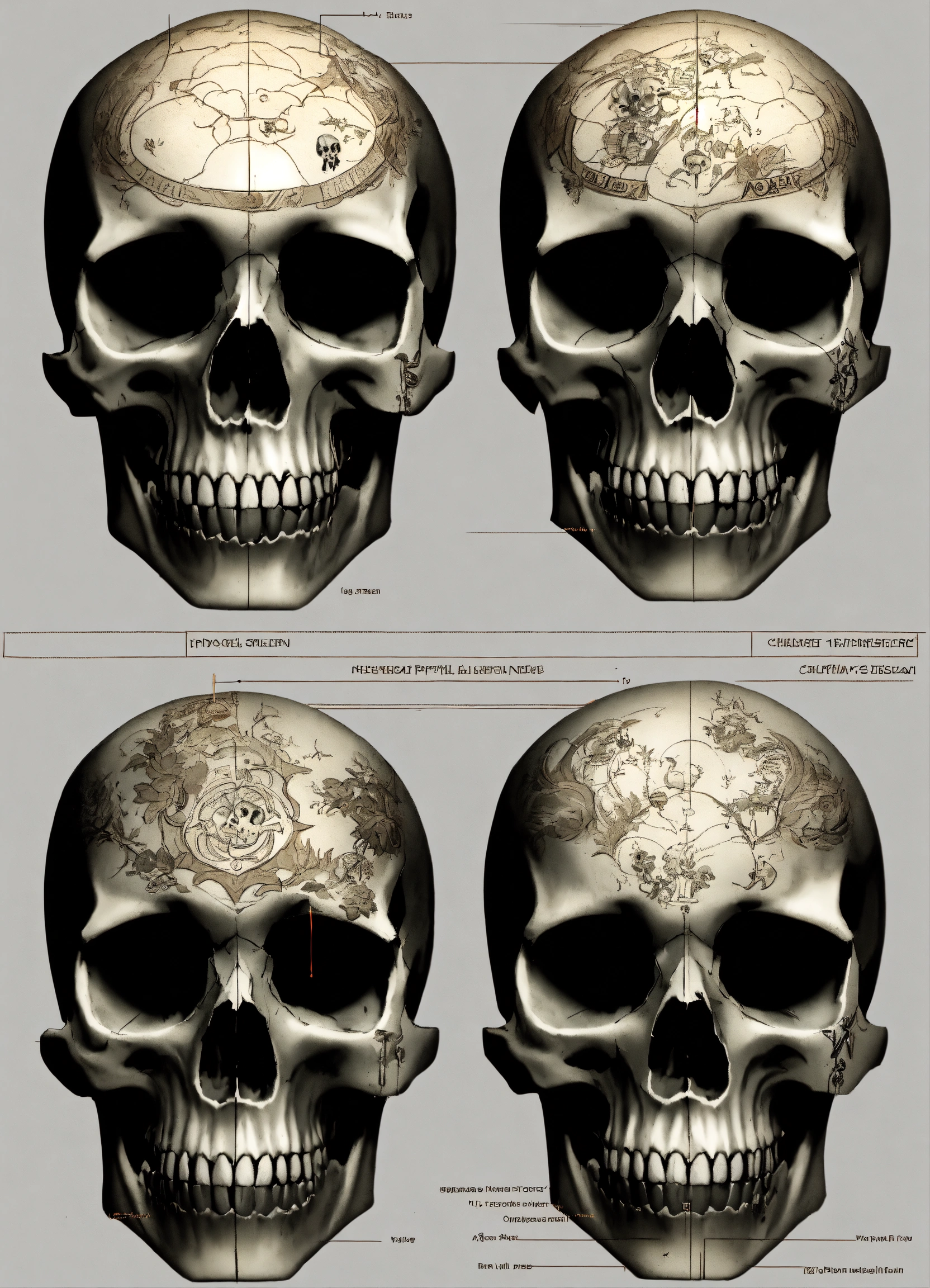 Skull tattoo, character sheet, character design, chart, reference sheet, multiple views, high detail, fine details, concept art