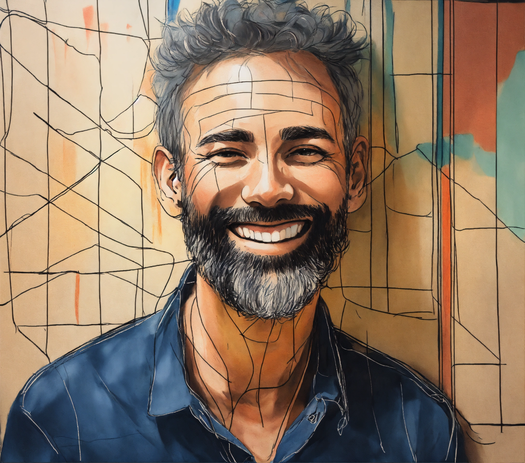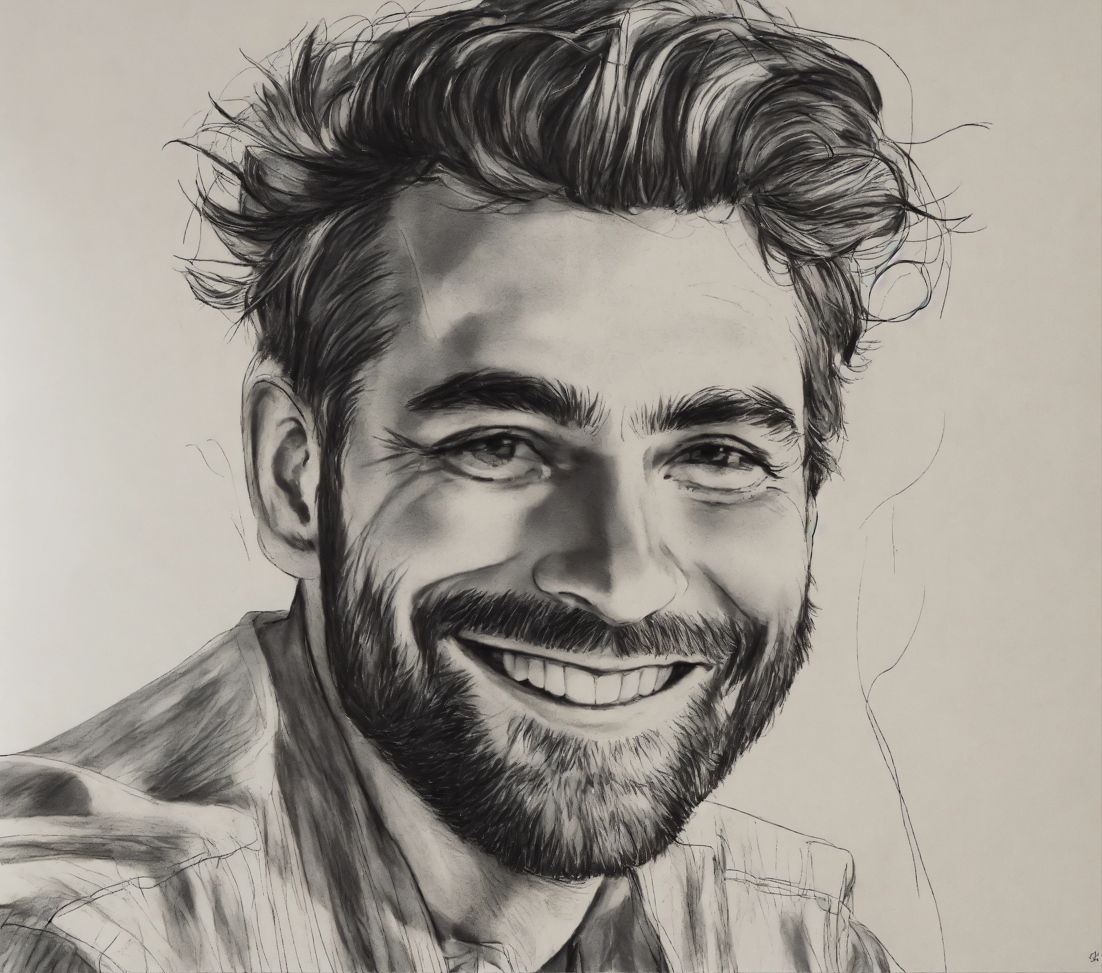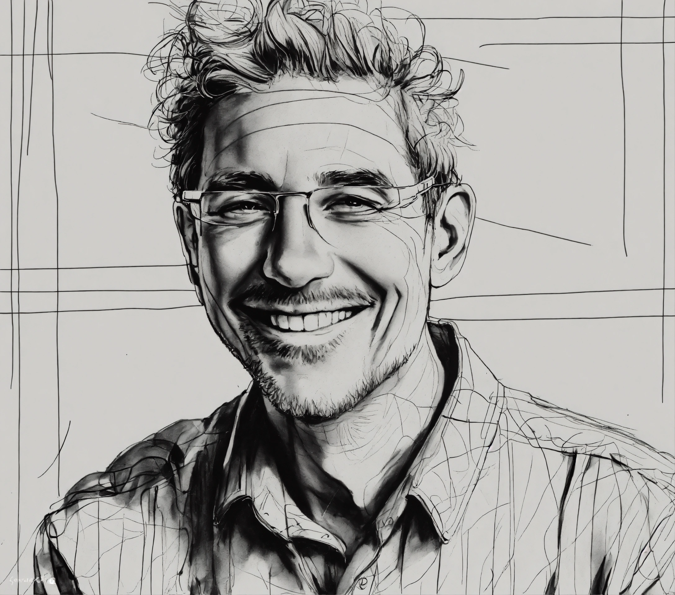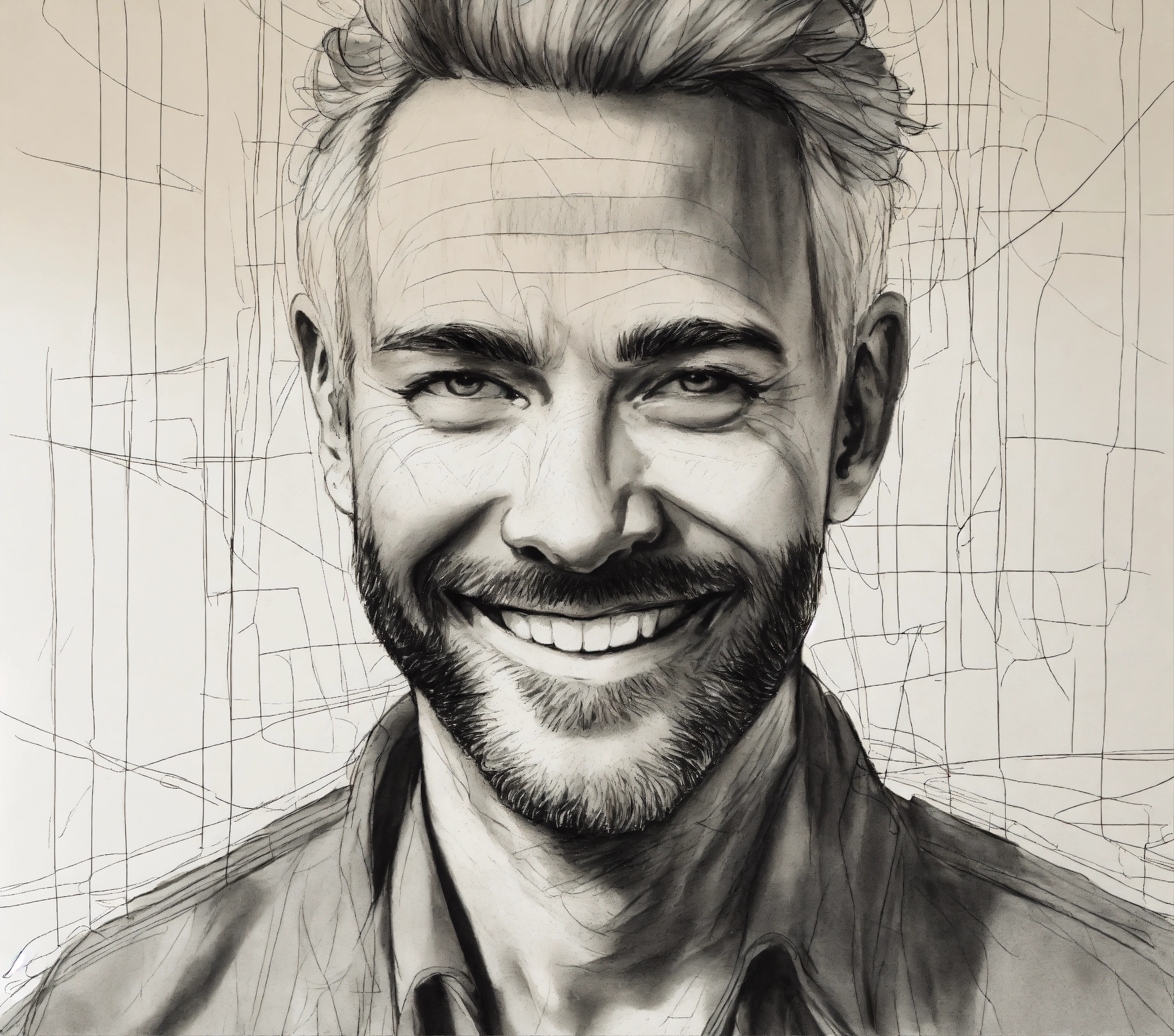 Un portrait en style "one line drawing" d'un homme souriant dans la trentaine réalisé avec un crayon