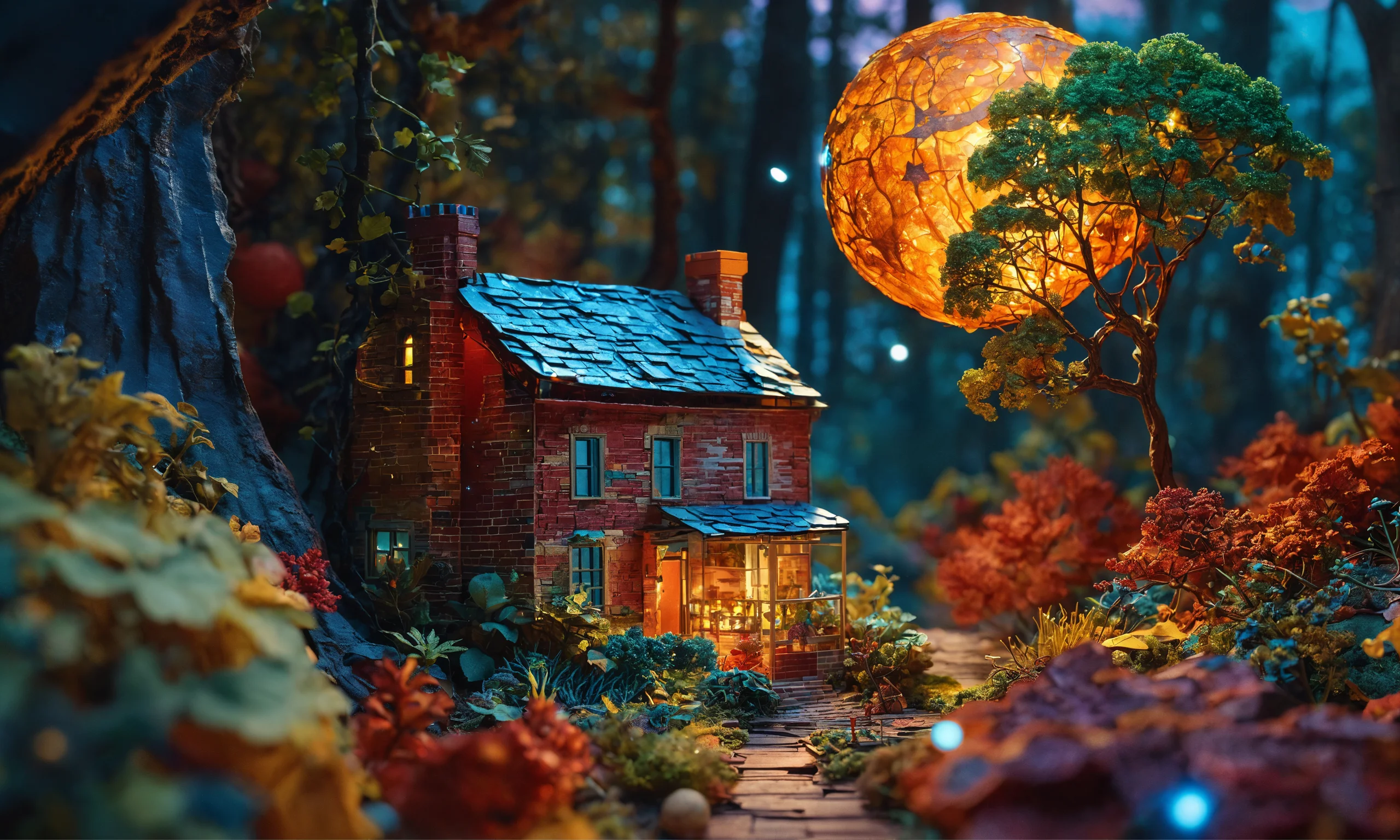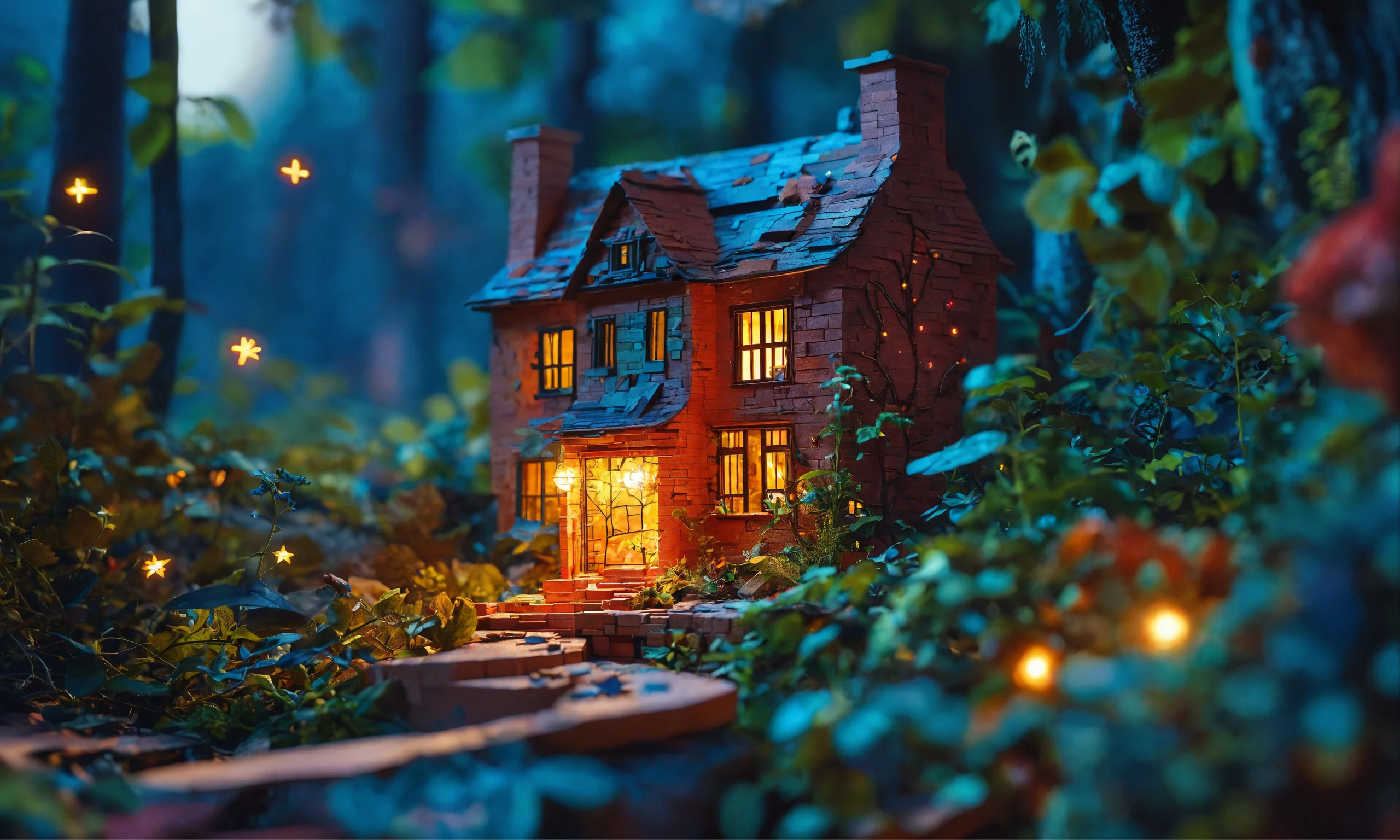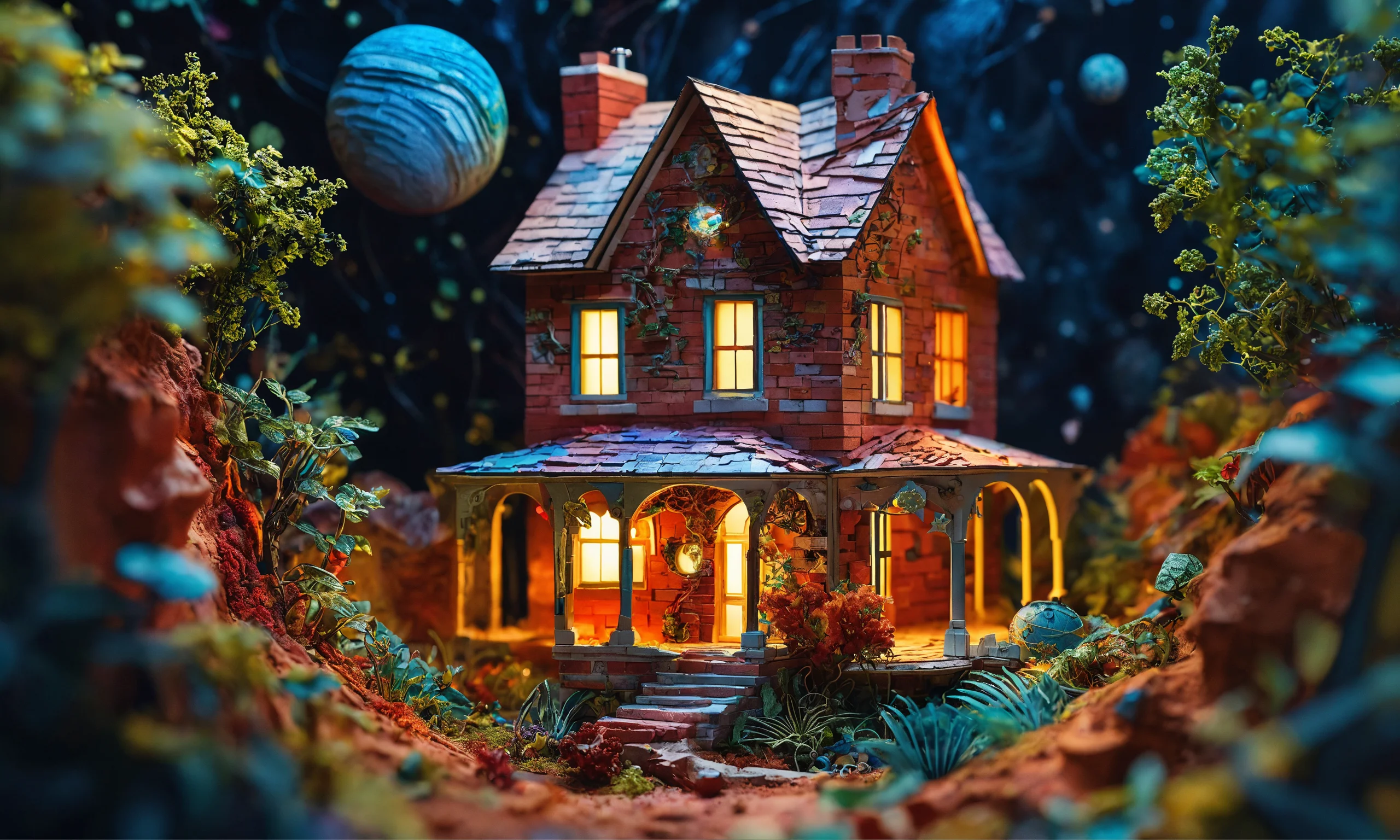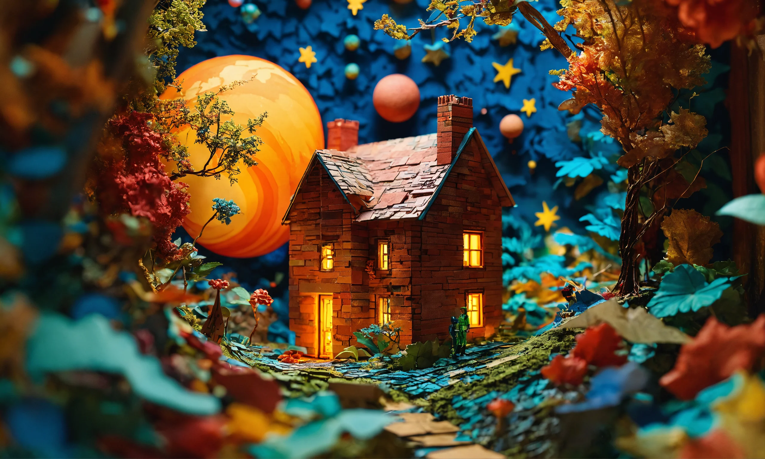 Multi-dimensional brick-cut craft, paper illustration, house in the woods, stars and planets, vine, colorful, beautiful highly detailed intricate full-body portrait photography, photorealistic 8k cinematic lighting