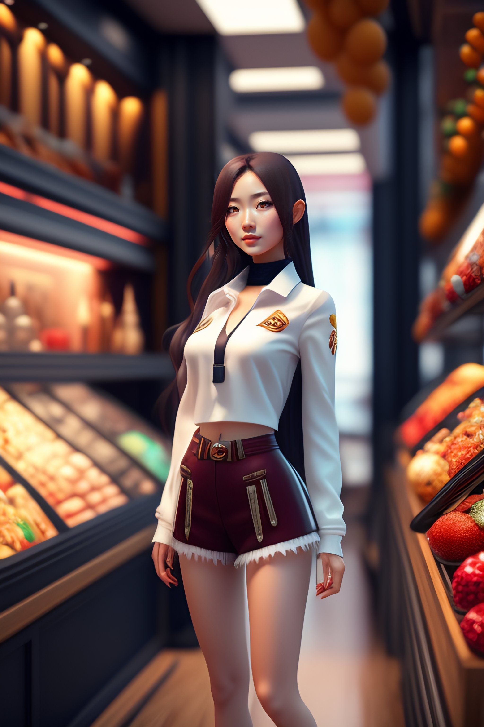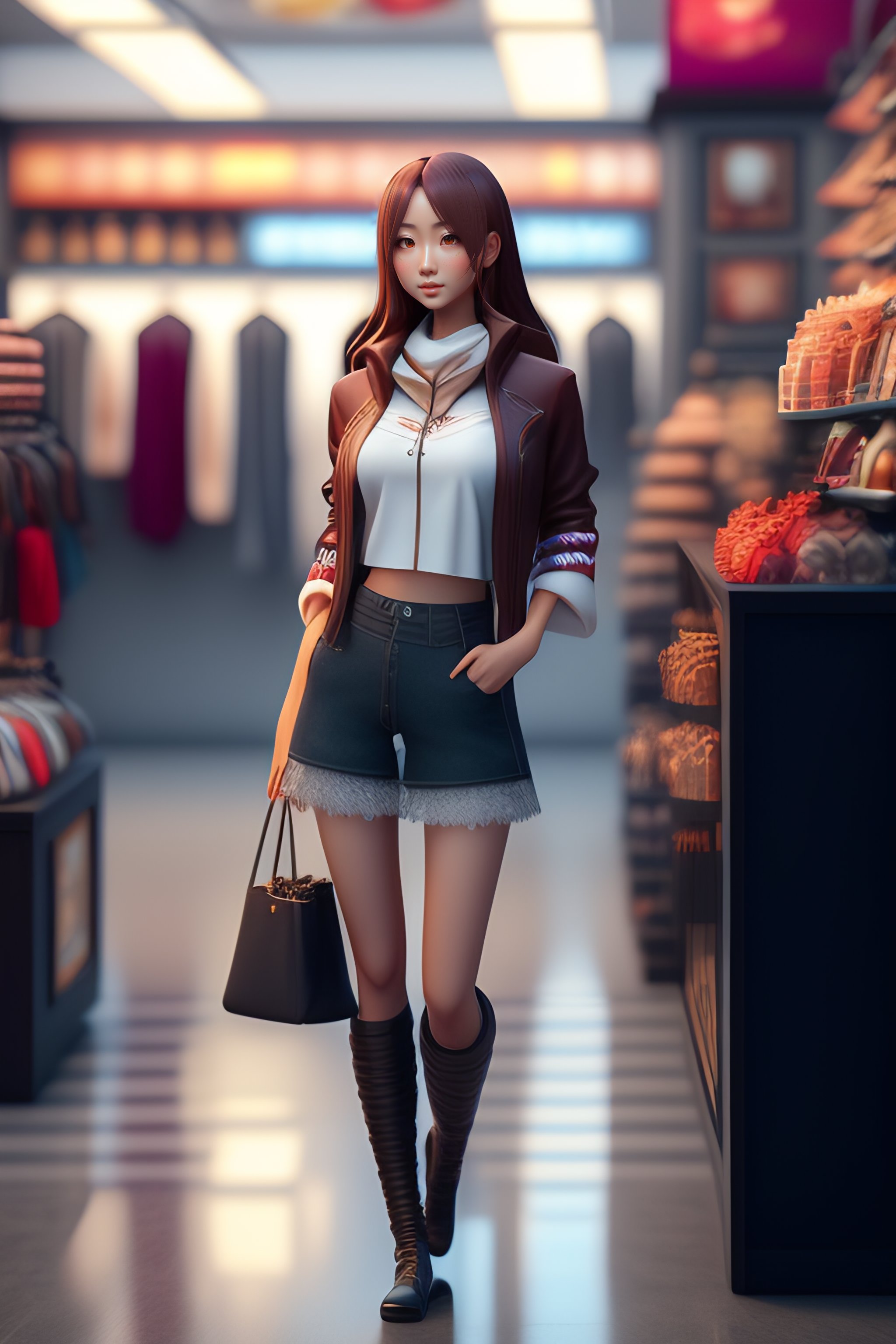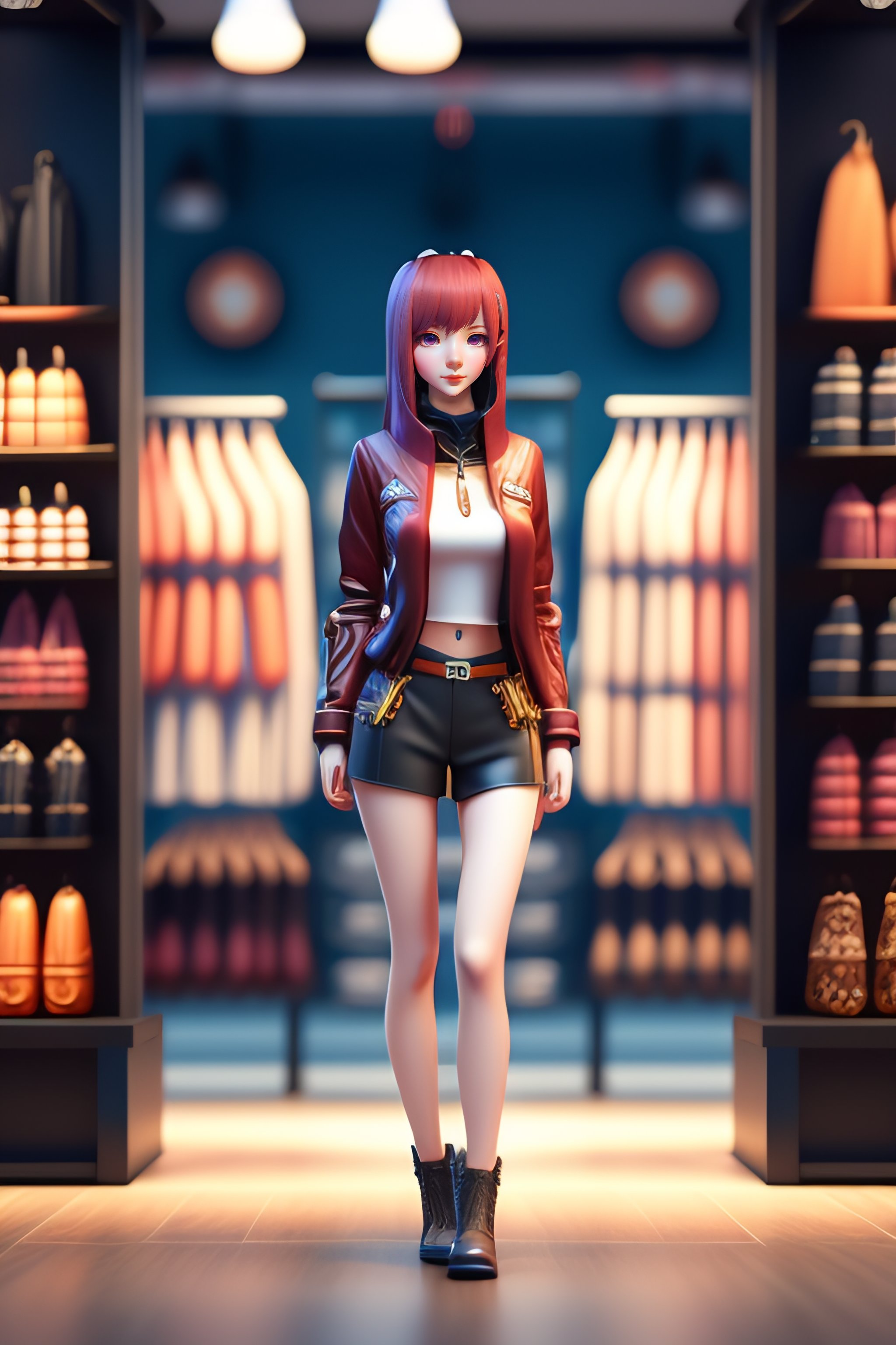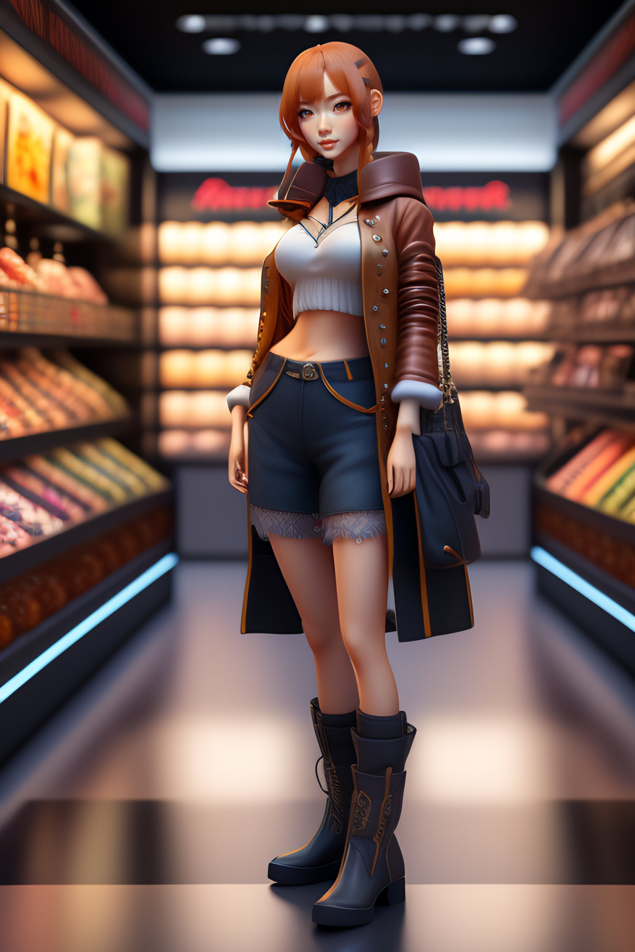 Full body anime style model girl inside a store, detailed art, 3d illustration, 8k unrealistic, detailed store products
