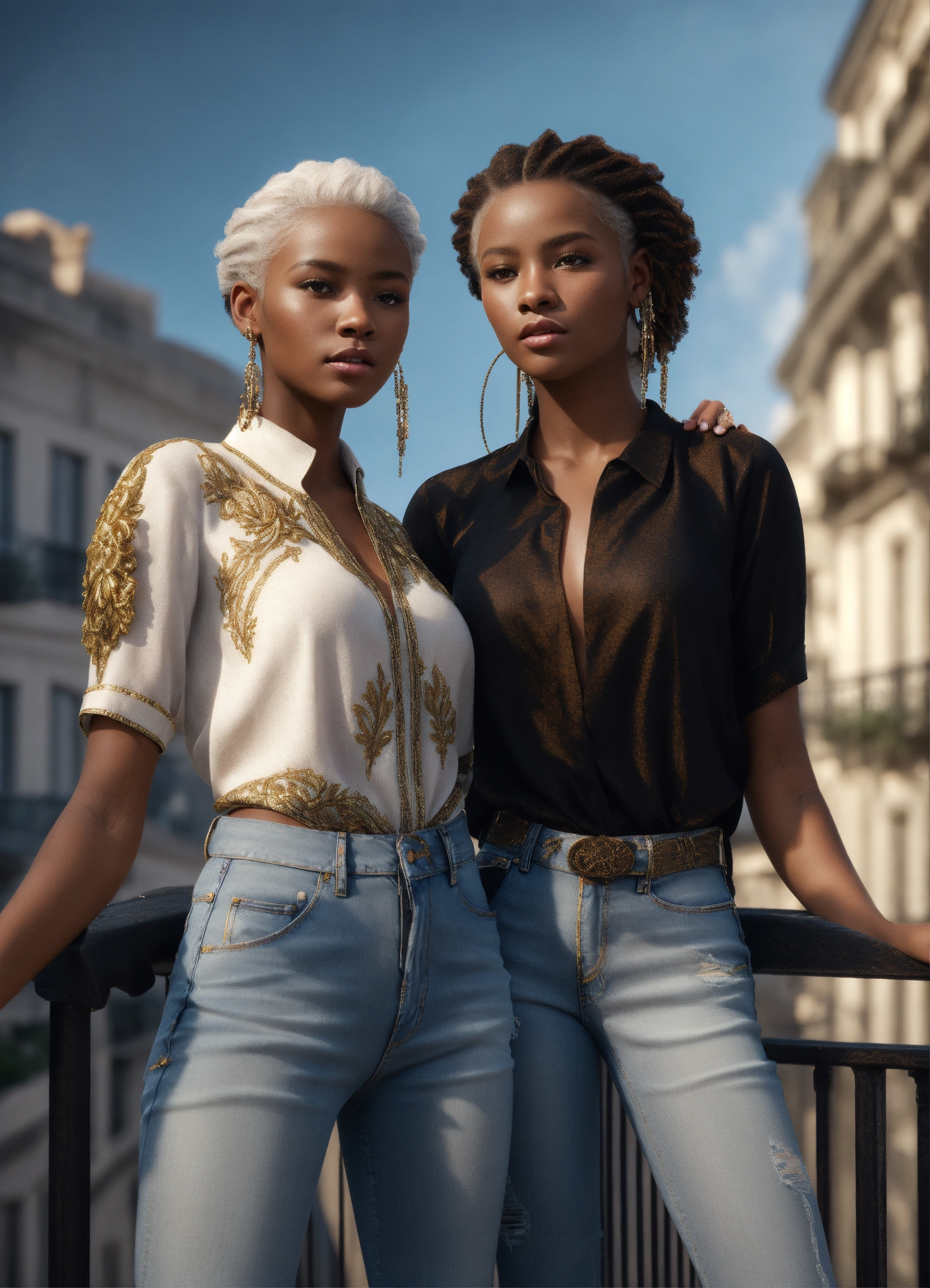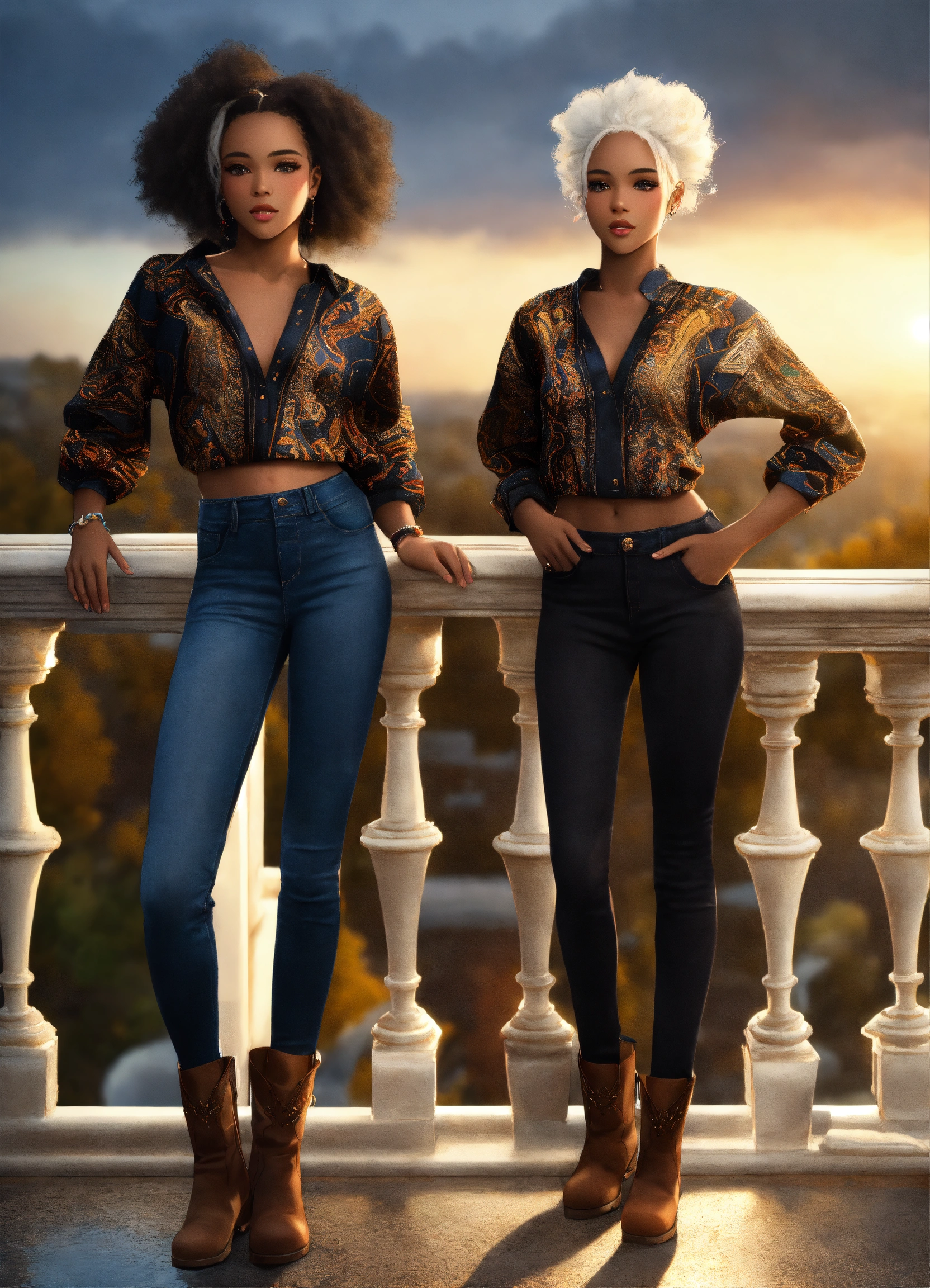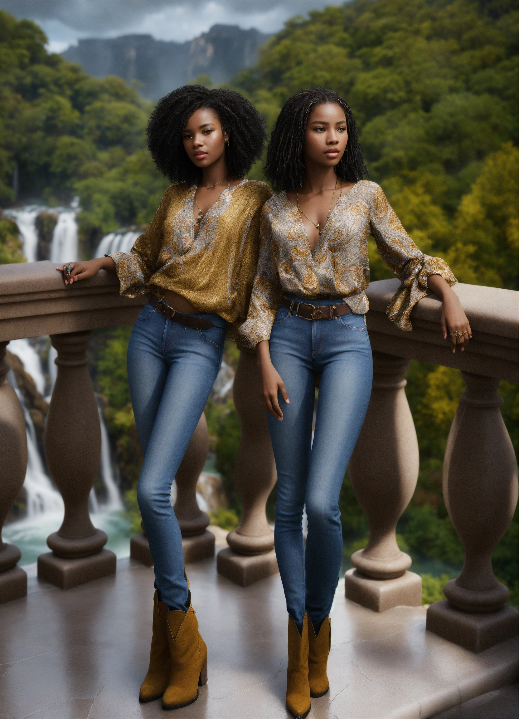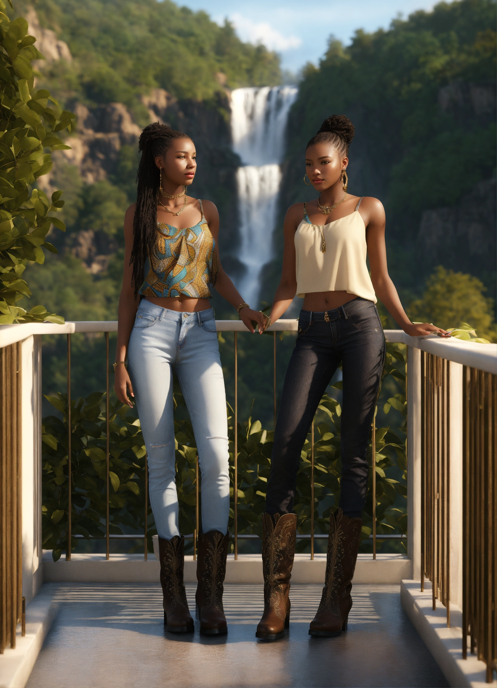 Pretty fraternal twins, twin 13-year-old, one twin white hair. african features, one twin brown-skin, black hair, in haute couture blouse, jeans, and boots. standing on upscale balcony, waterfall, regal persona. cinematic style, high detail, realistic physics, photorealistic, unreal engine, hdr, 8k