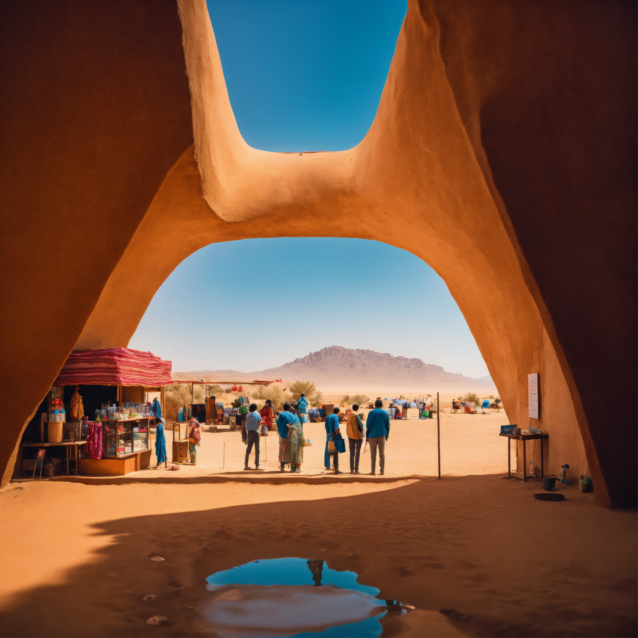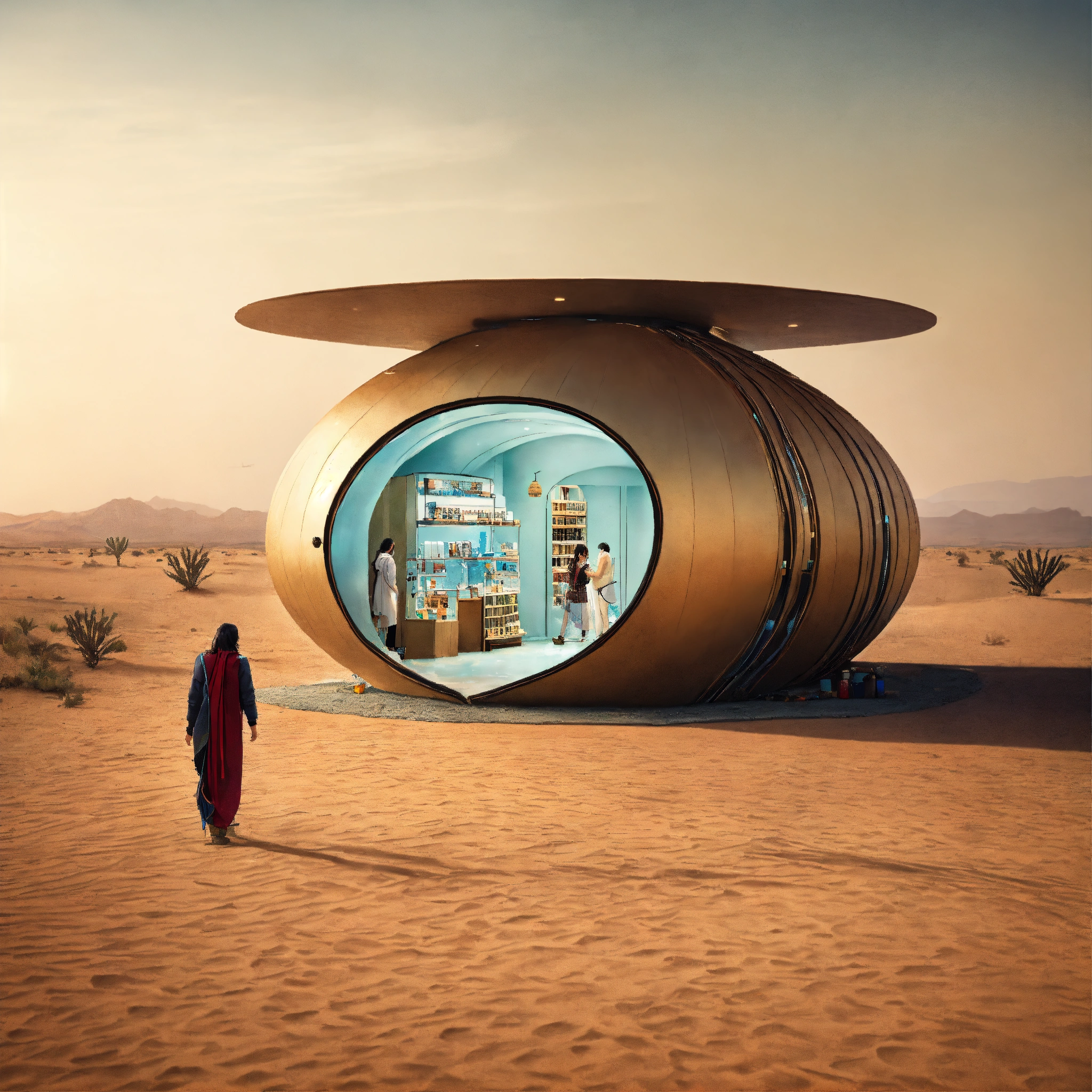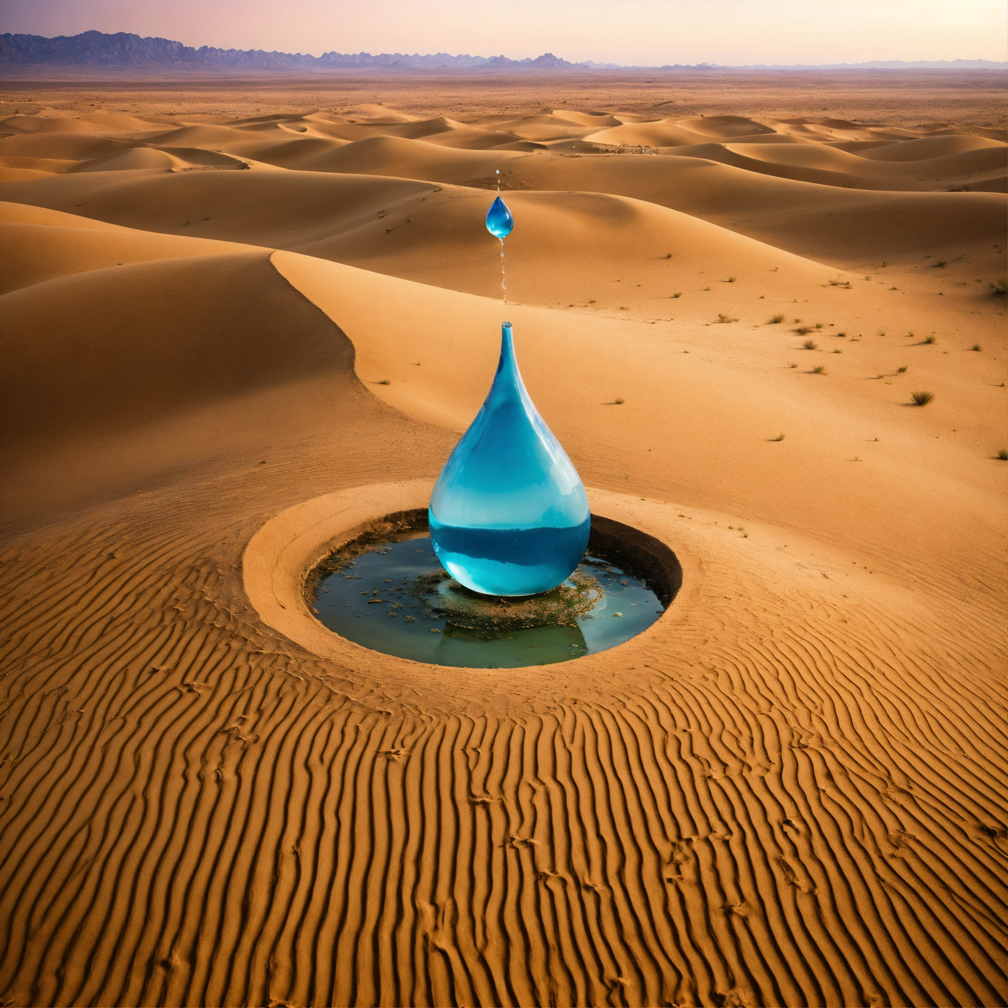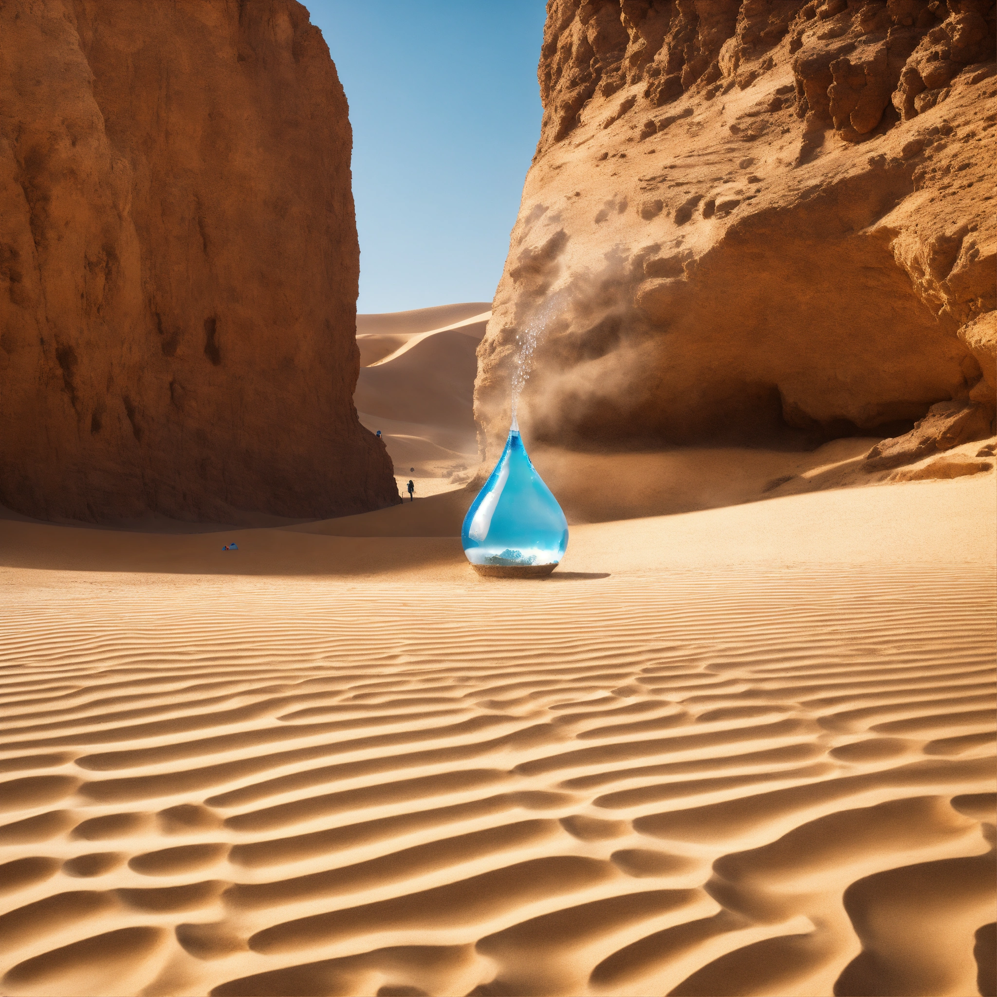 shop with water in the desert in the form of a drop of blue water, a queue of customers, a lot of water bottles (the image is deep volumetric).