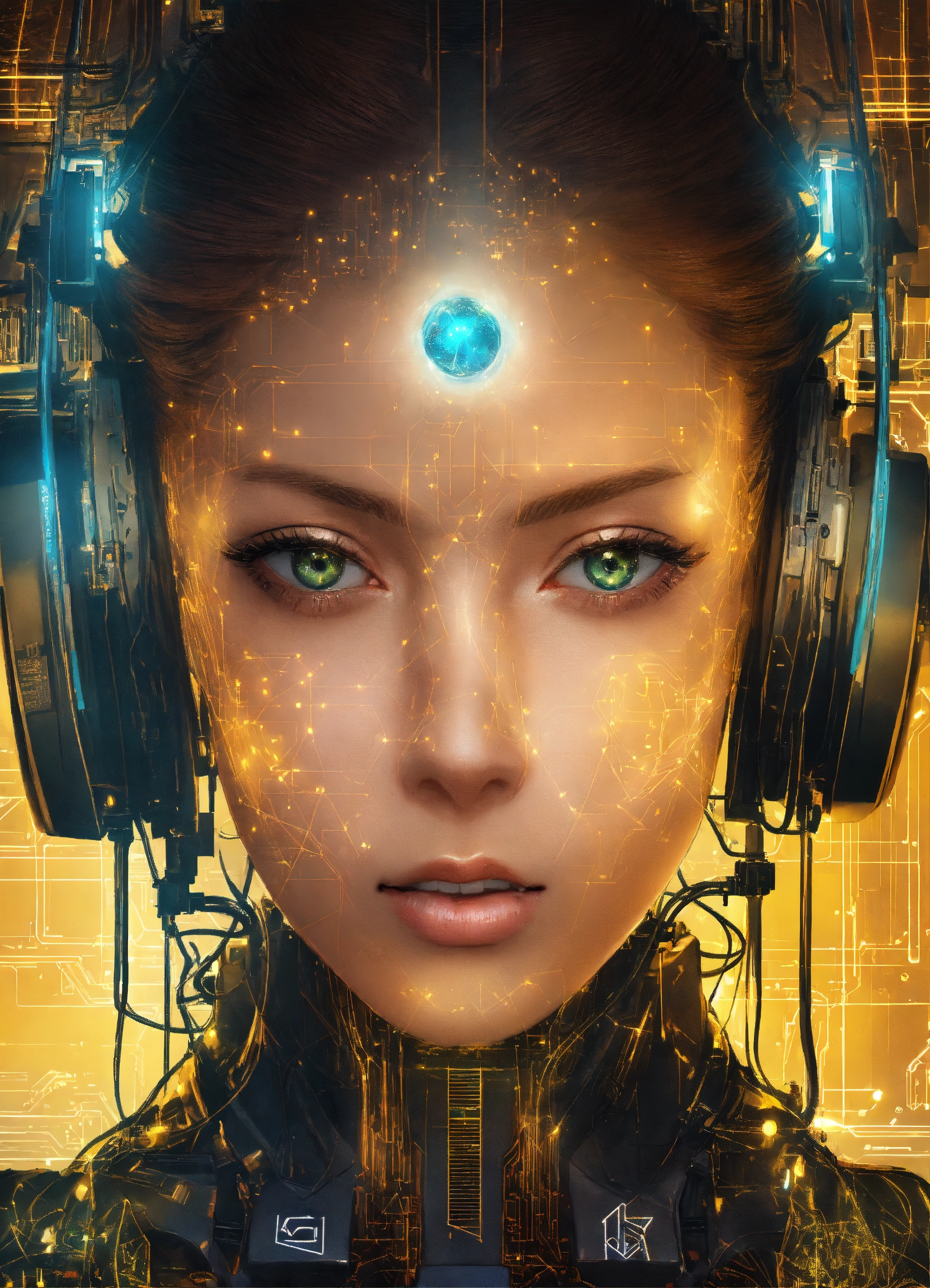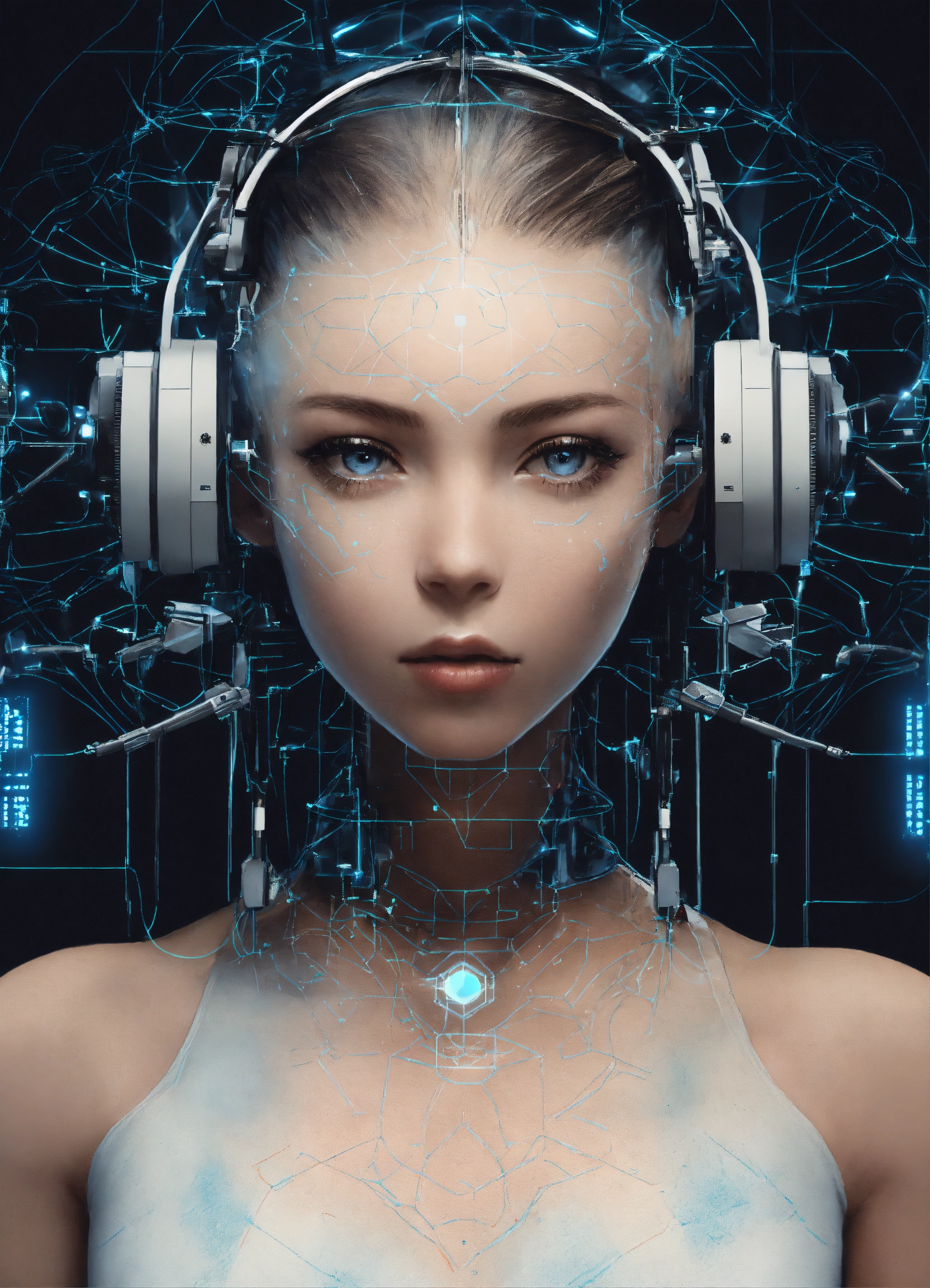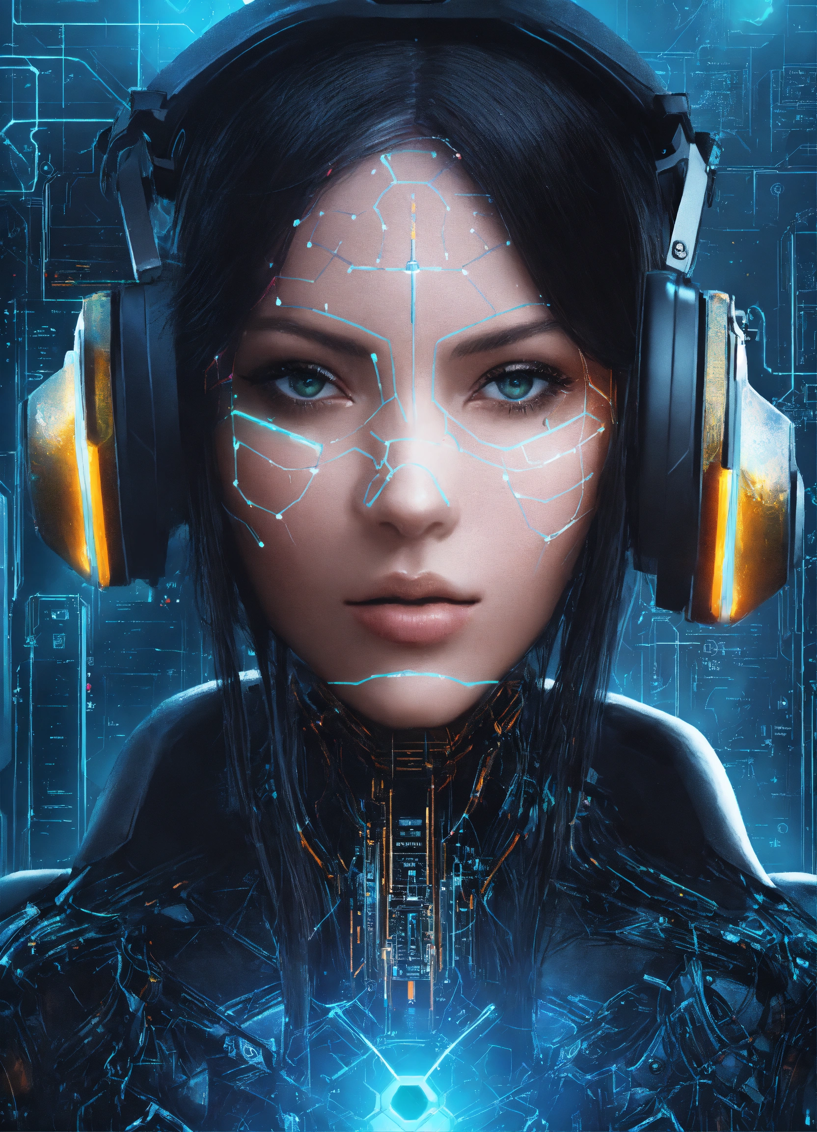 Neo sapien clothing line logo, close up of an android face girl being programmed with quantum technology sketches logo symbol
