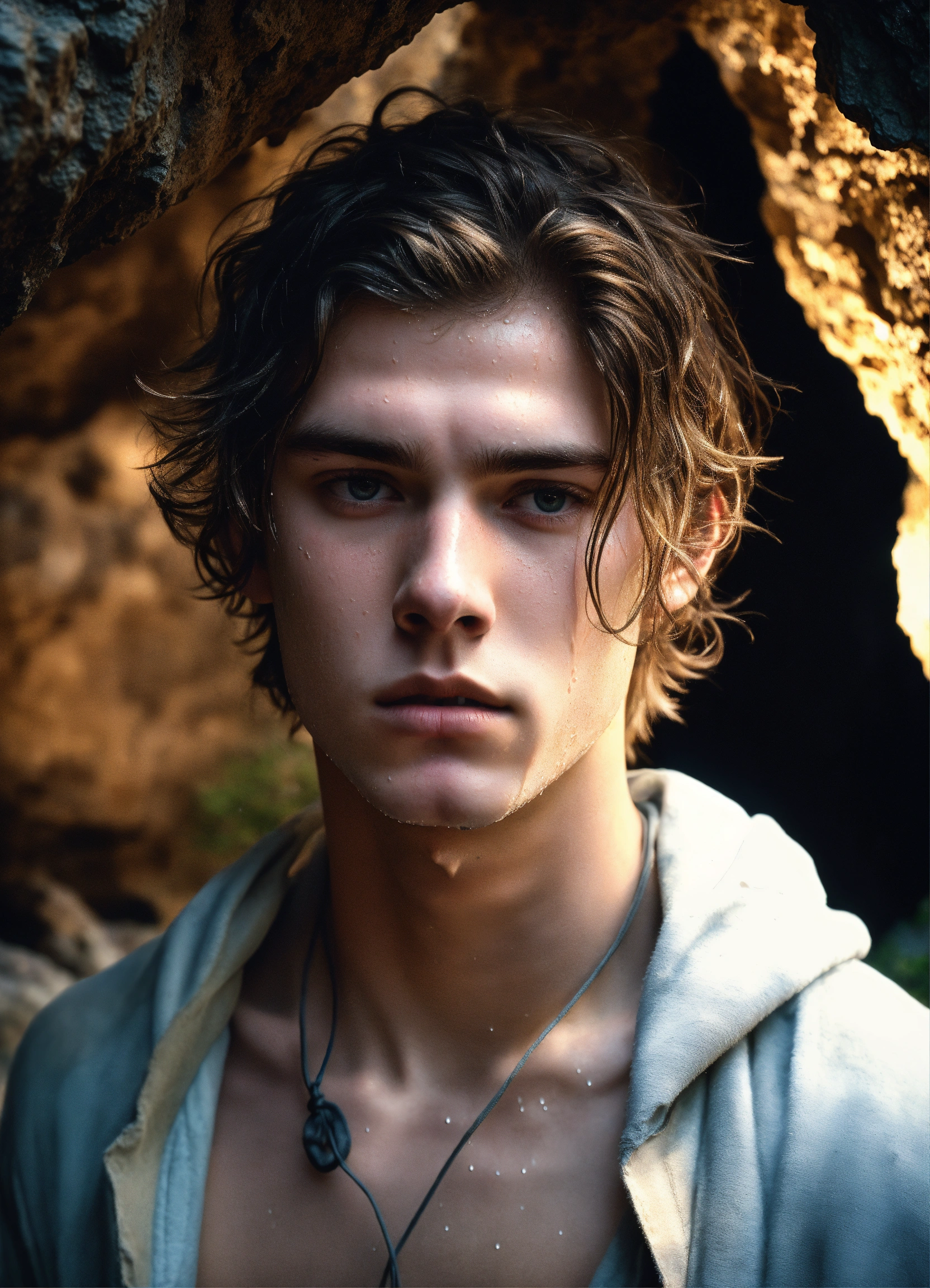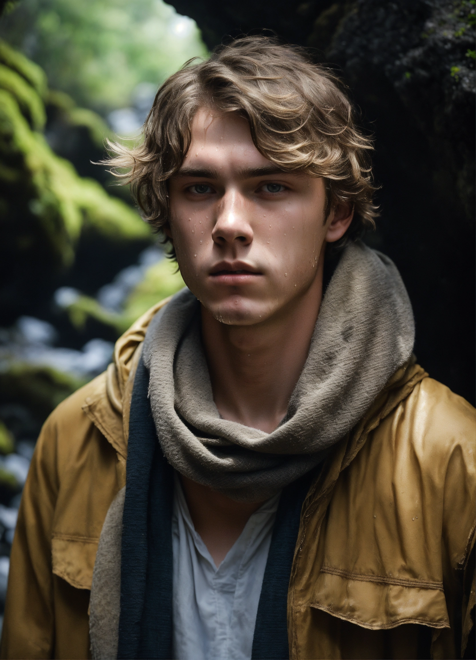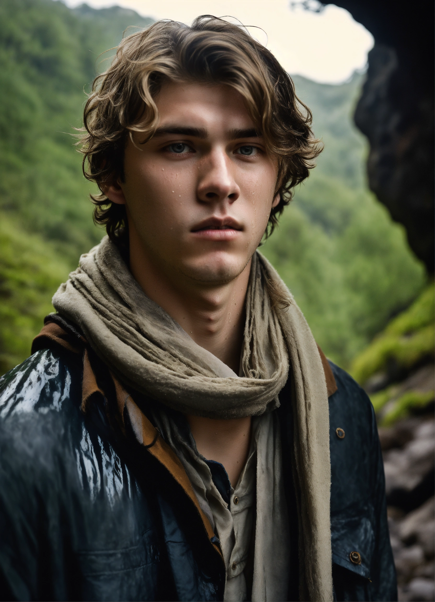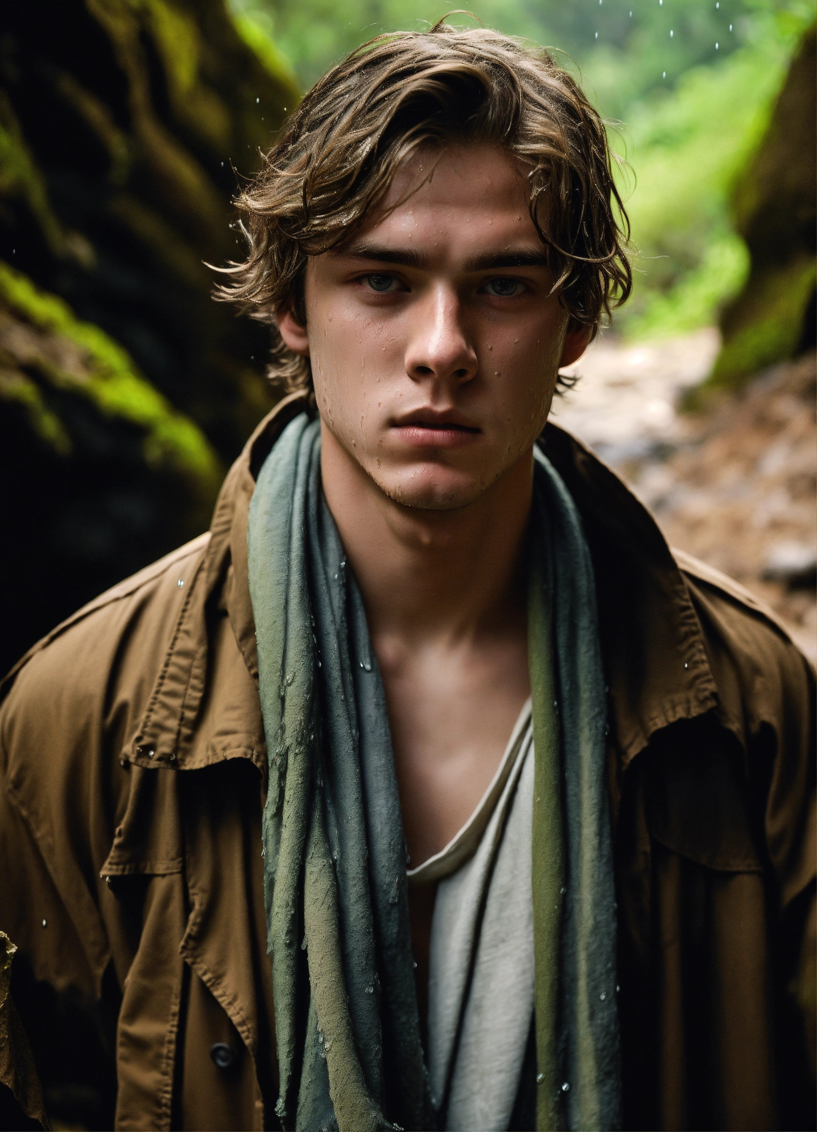 A highly realistic photograph of a white 21 years old boy, with slim wet face, thin lips, dark blonde wet hair, brown slanted eyes, messy wet hair, without facial hair, white skin, sad expression, wearing a wet scarf, the entrance of a rocky forest cave entrance in the background, hyperrealistic, hyperdetailed, 4k