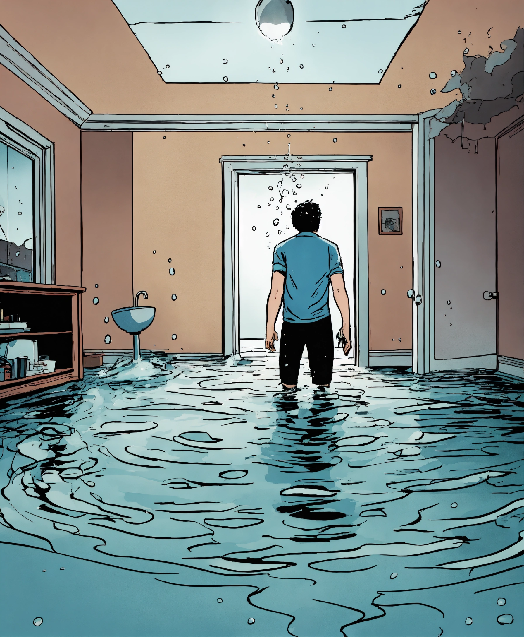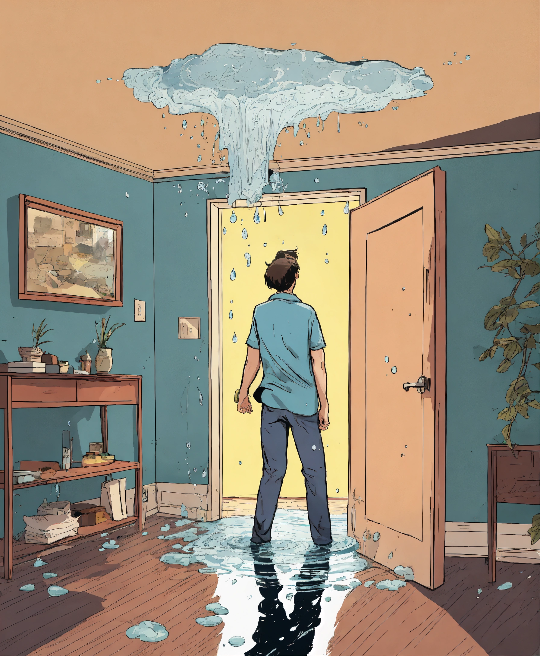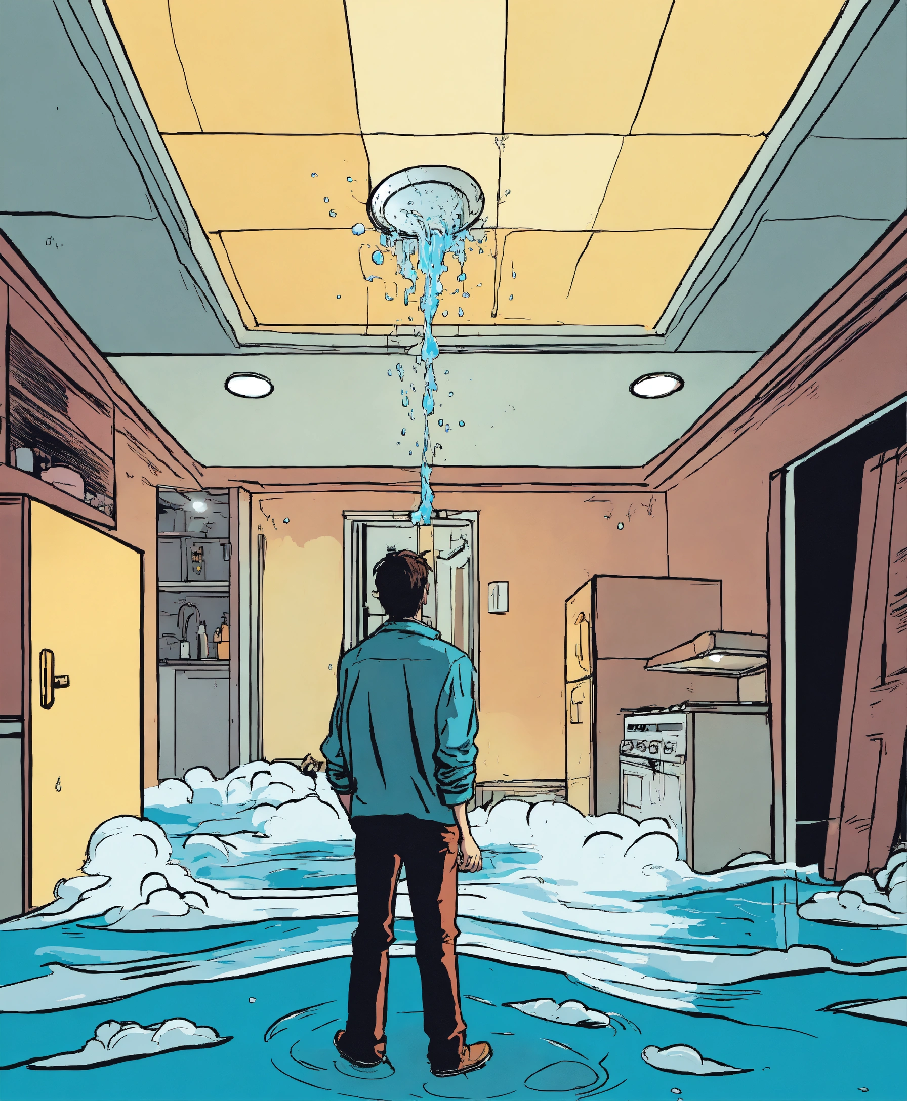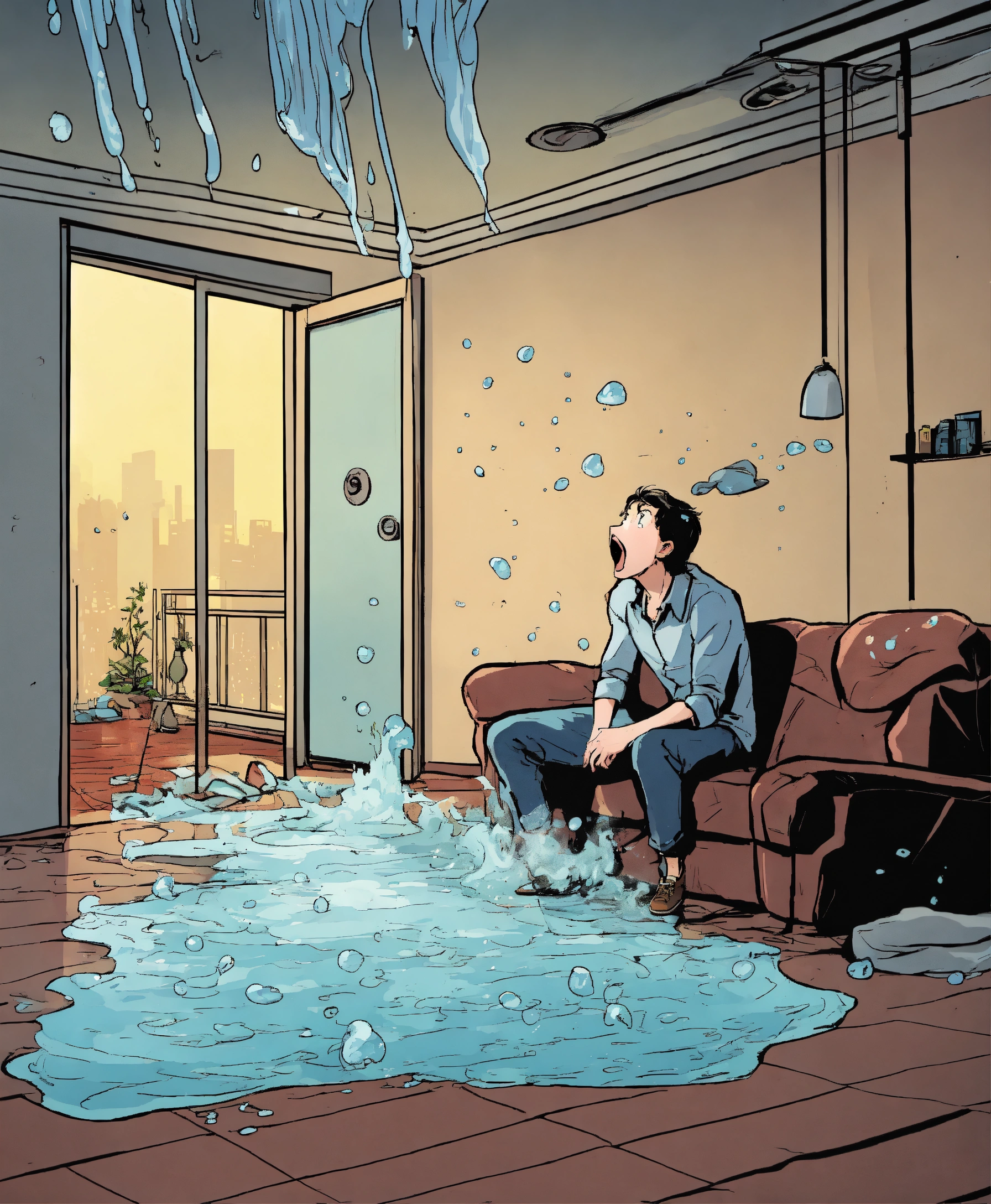 Water is coming from a ceiling inside an apartment, a person is standing inside the room in panic and looking shocked at the ceiling, comic style