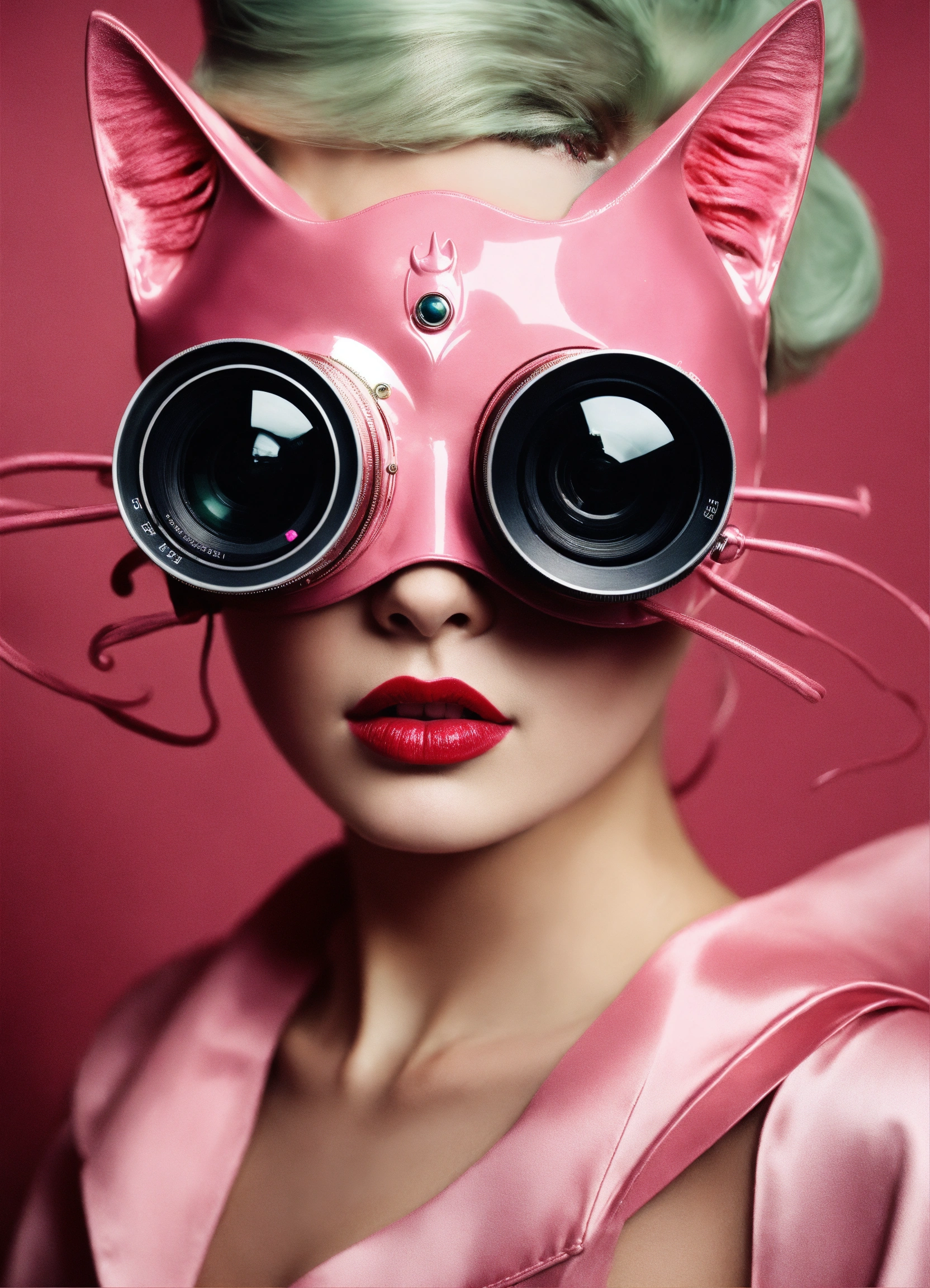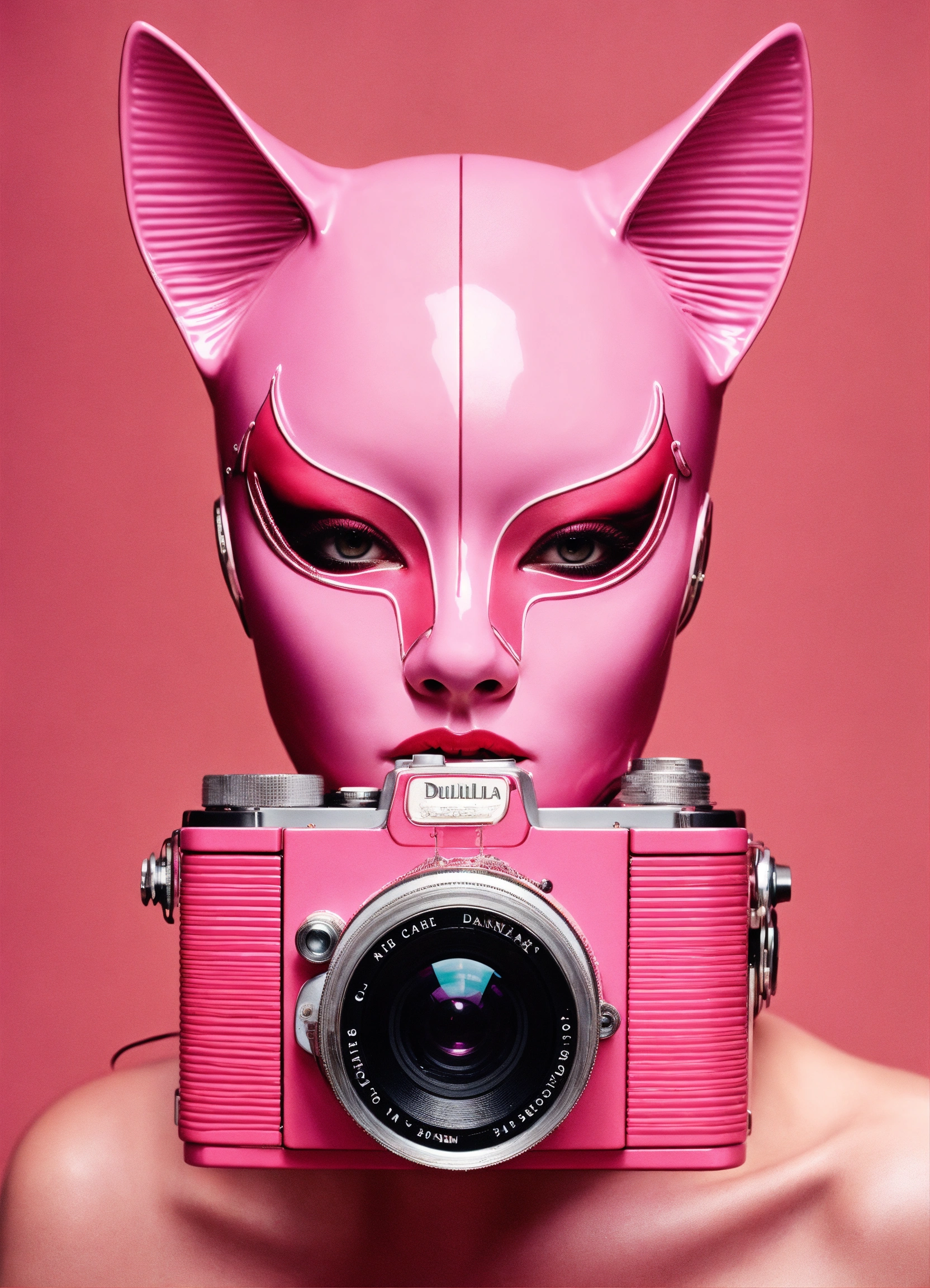 Close up portrait photography, of the vintage film camera, wearing a pink cat woman mask, 80 degree view, art by sergio lopez, natalie shau, james jean and salvador dali