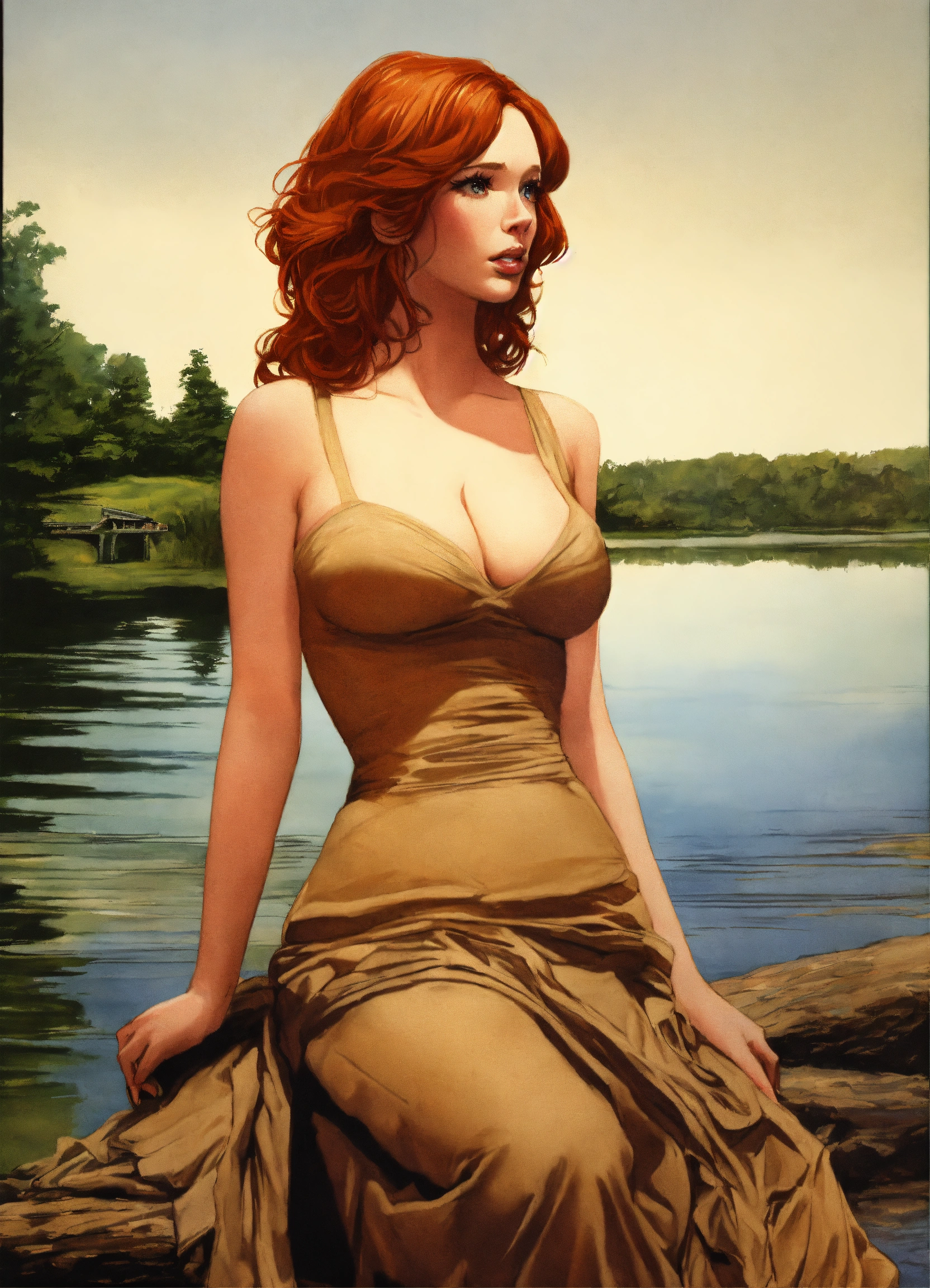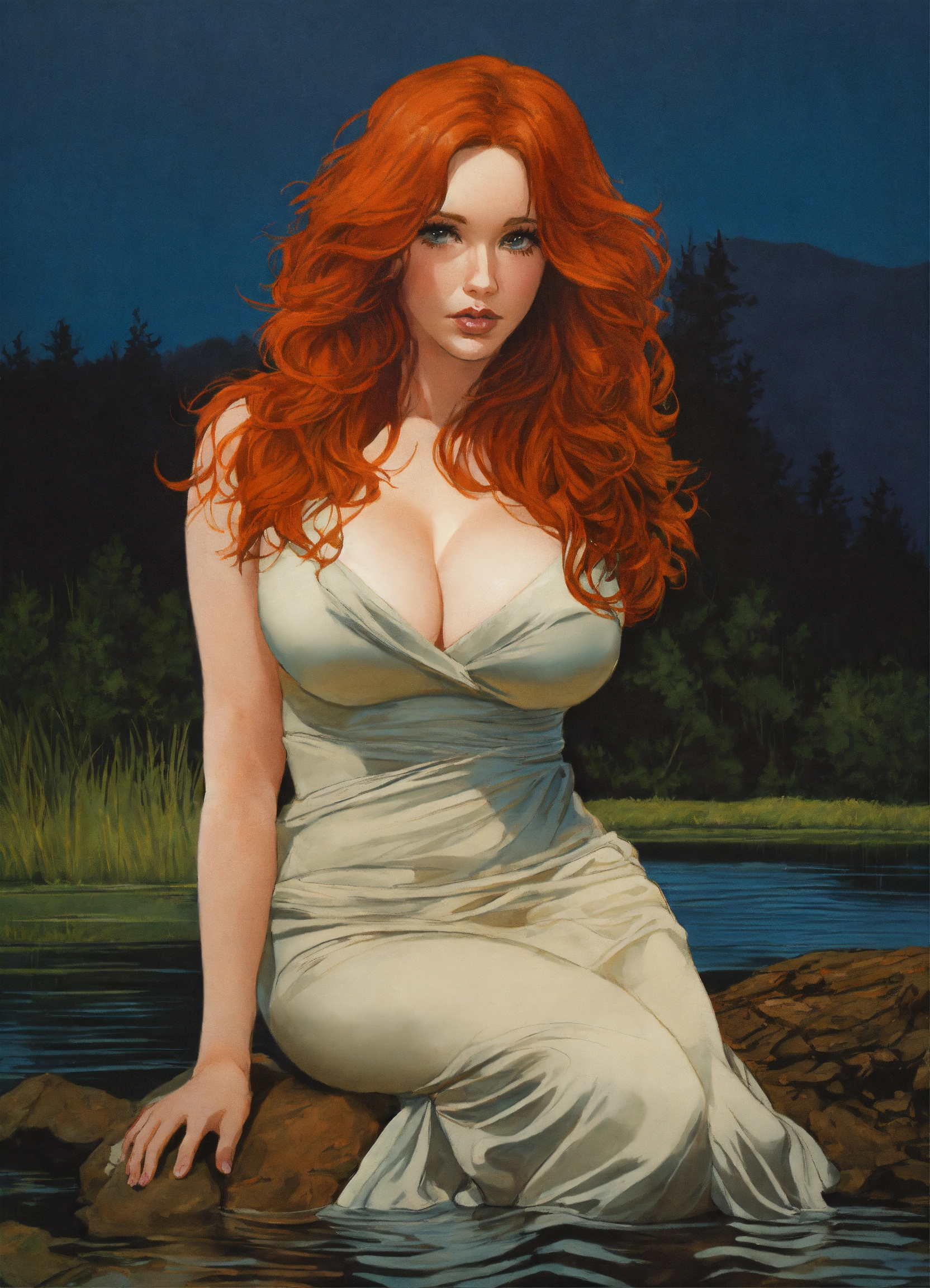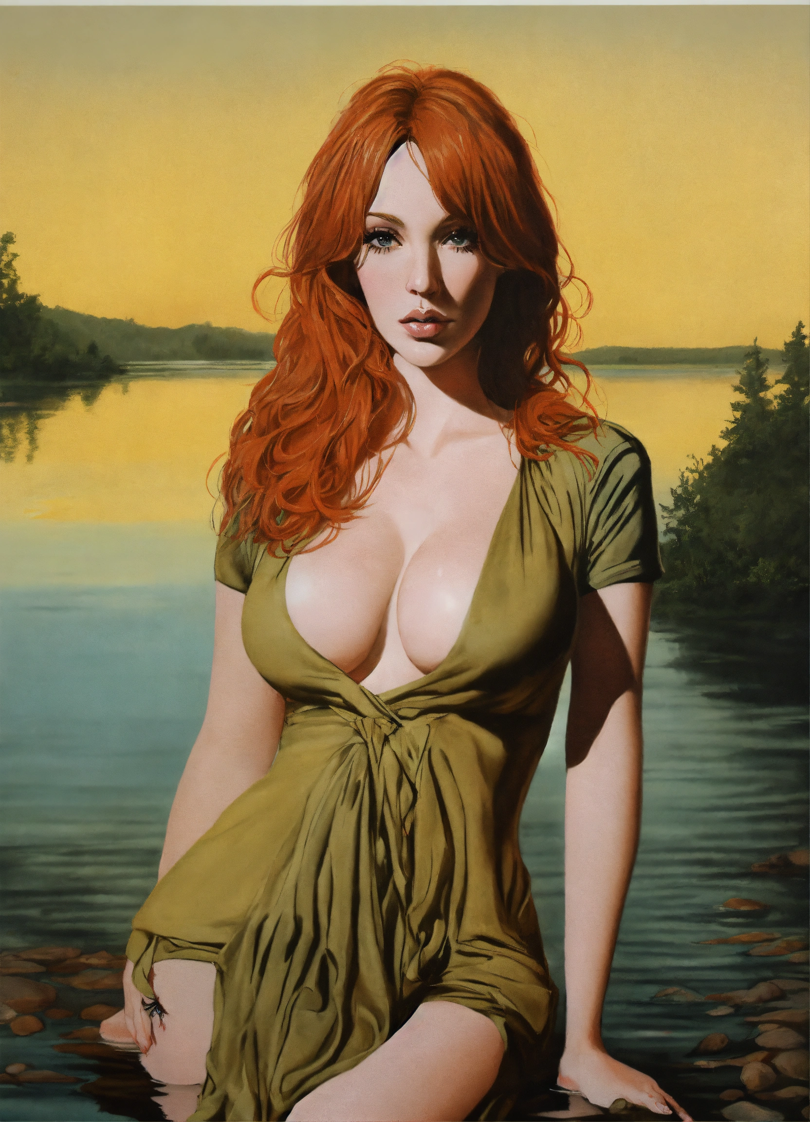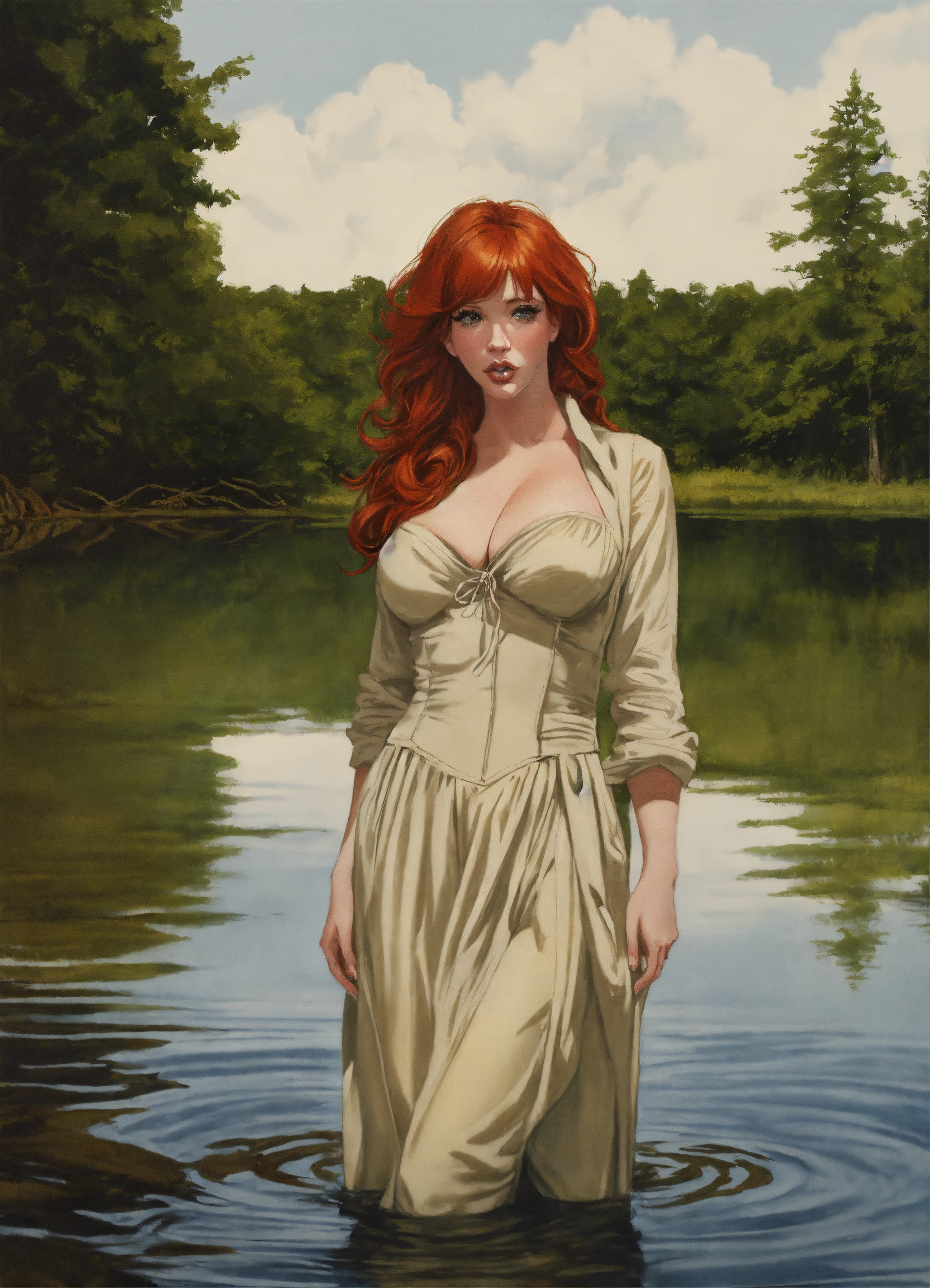 Christina hendricks as kim kardashian dressed in rags, 1970's dark fantasy book cover paper drawing of beautiful christina hendricks in lake with minimalist far perspective, style by larry elmore, barefoot, jordan grimmer, barefeet, rags
