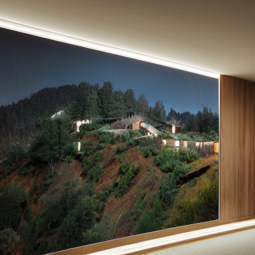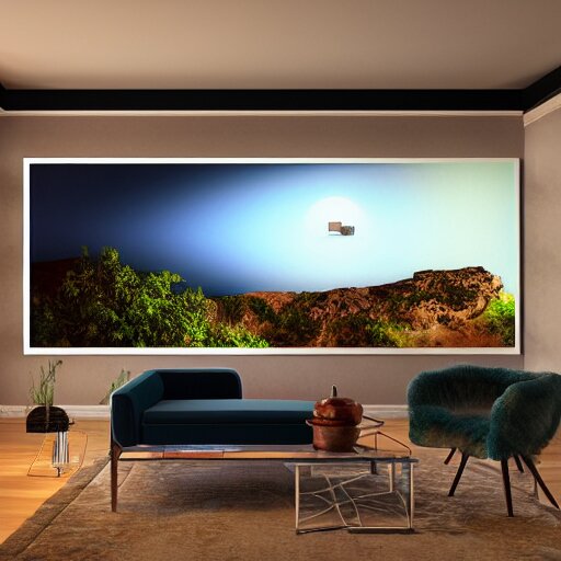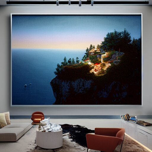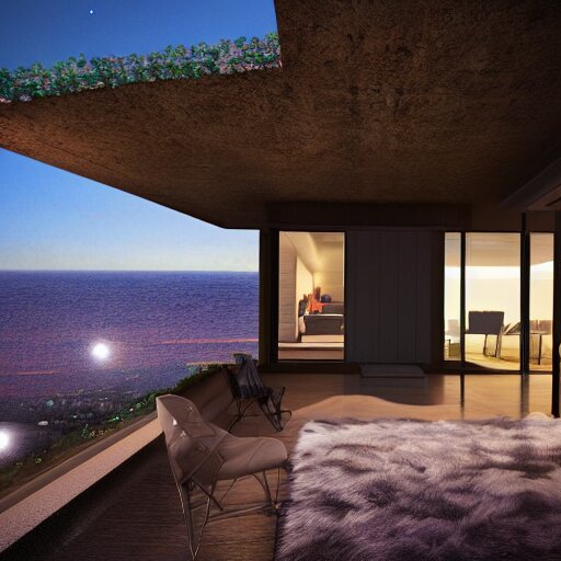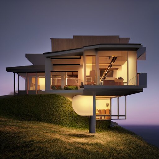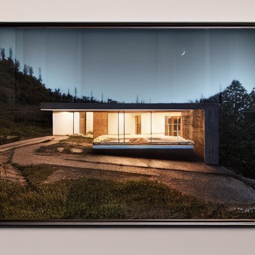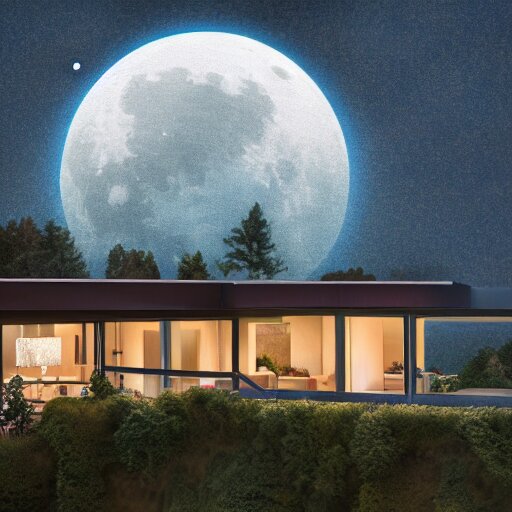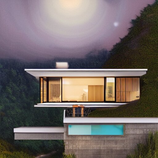 Realistic extremely detailed photo real portrait painting of a mid-century modern house on cliff, in moon light, elegant, moody vibrant colors, herman miller, octane render, 4k