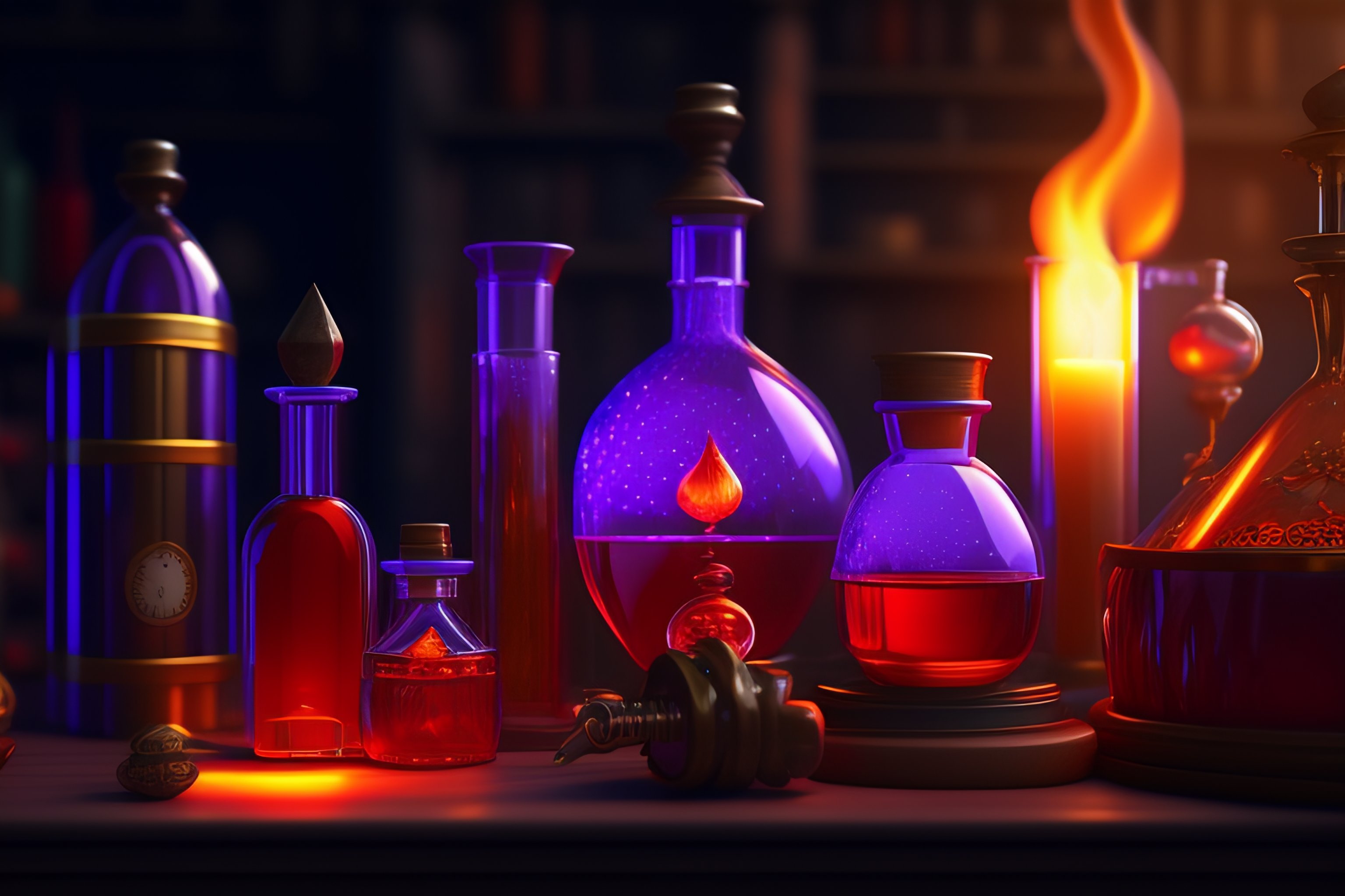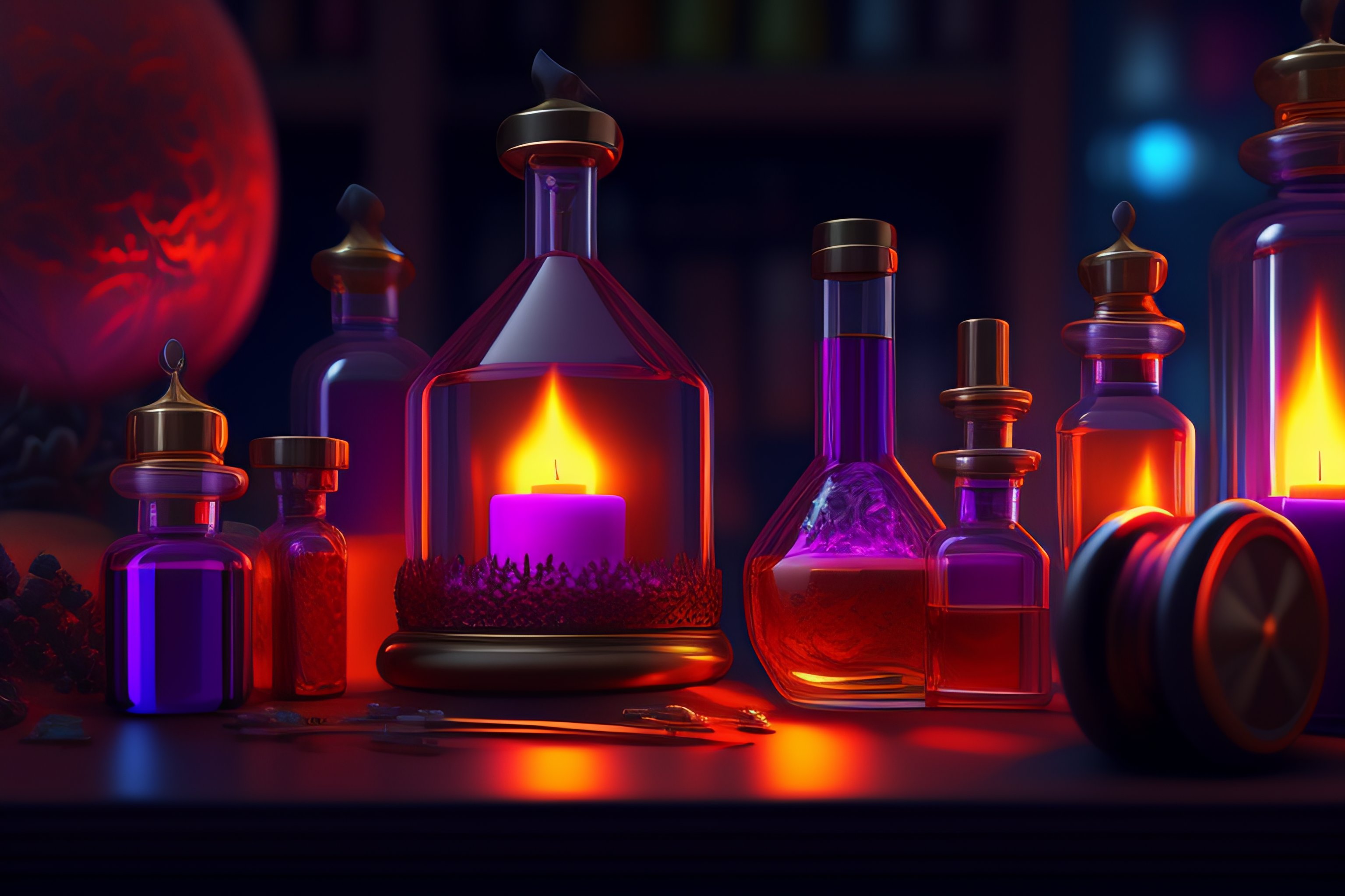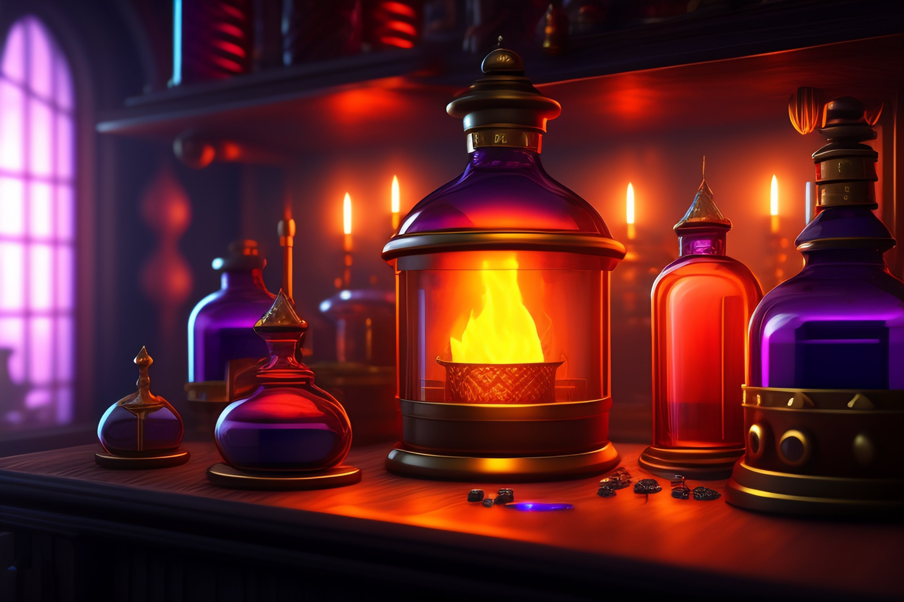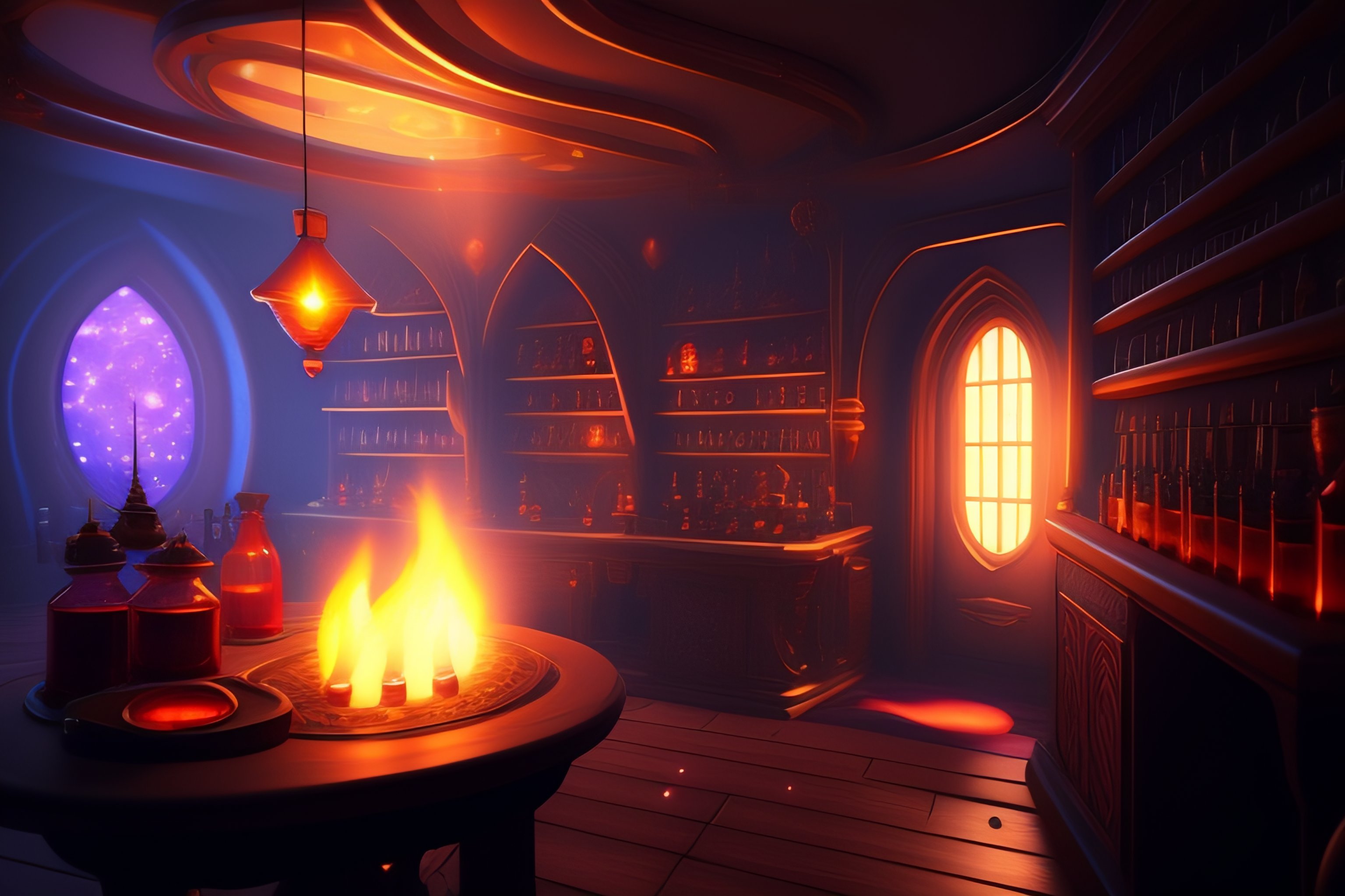 Fantasy room laboratory, a bunch of flasks, potions, vials shelves, fire, fireplace, turbulence, intricate, elegant, glow, beautiful lighting, black and purple and orange palette, dark saturated colors, highly detailed, hyperrealism, sparks, stars, digital 2d, concept art, cinematic, cinematic lighting, deviantart artstation, 8k