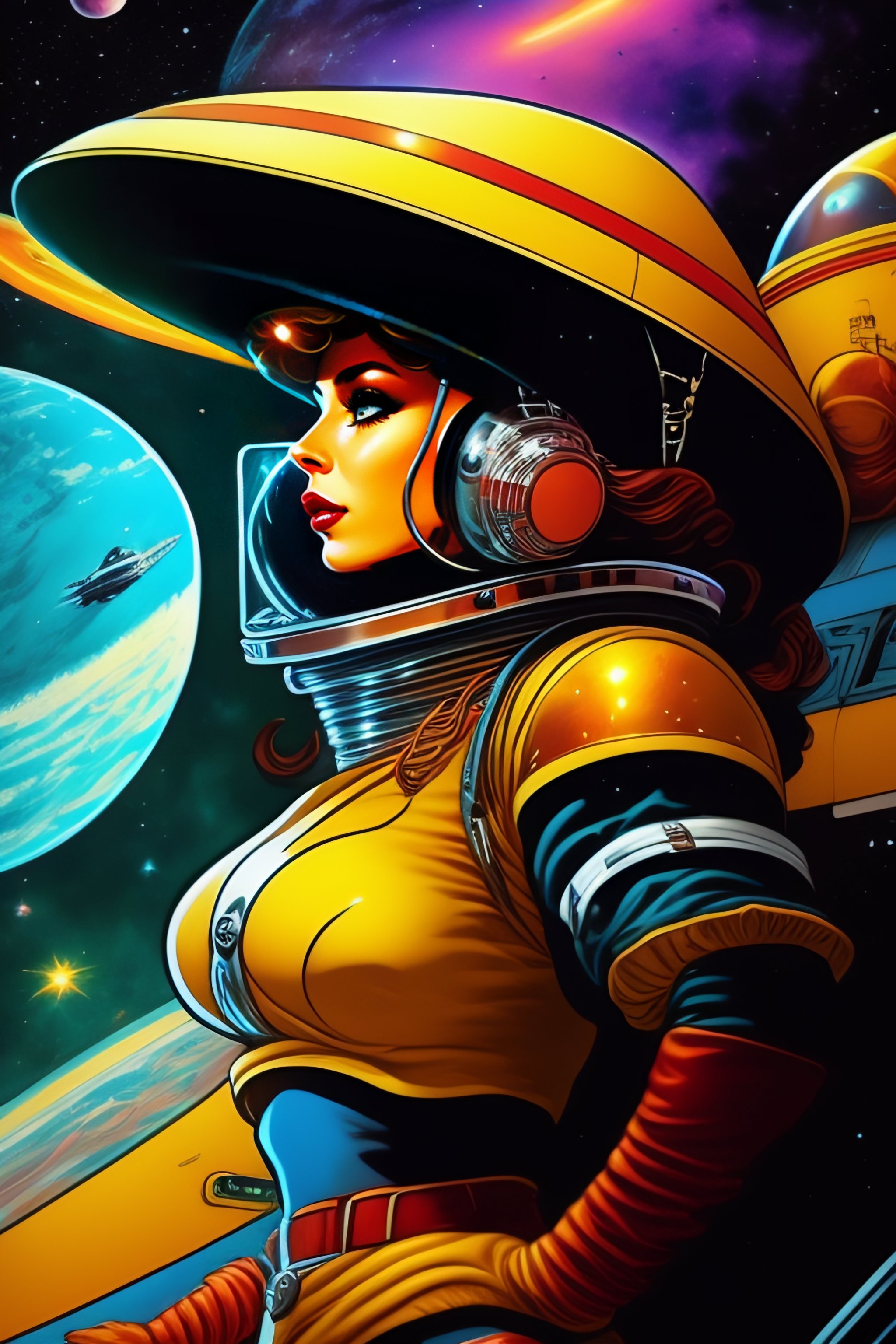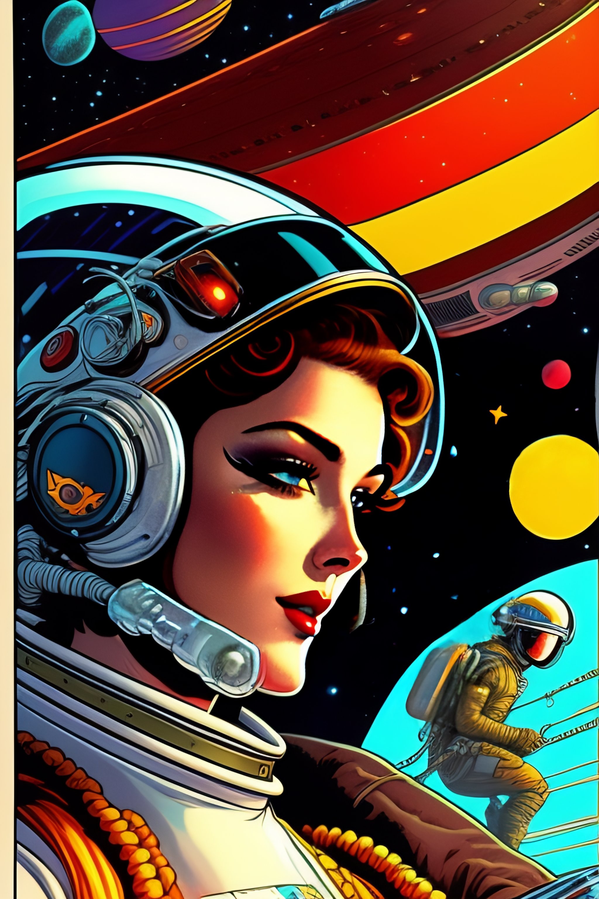 Retro space captain giving commands to the crew in spacecraft, comic art, comic book cover art, ink art, techno sci fi, stunning tiny details