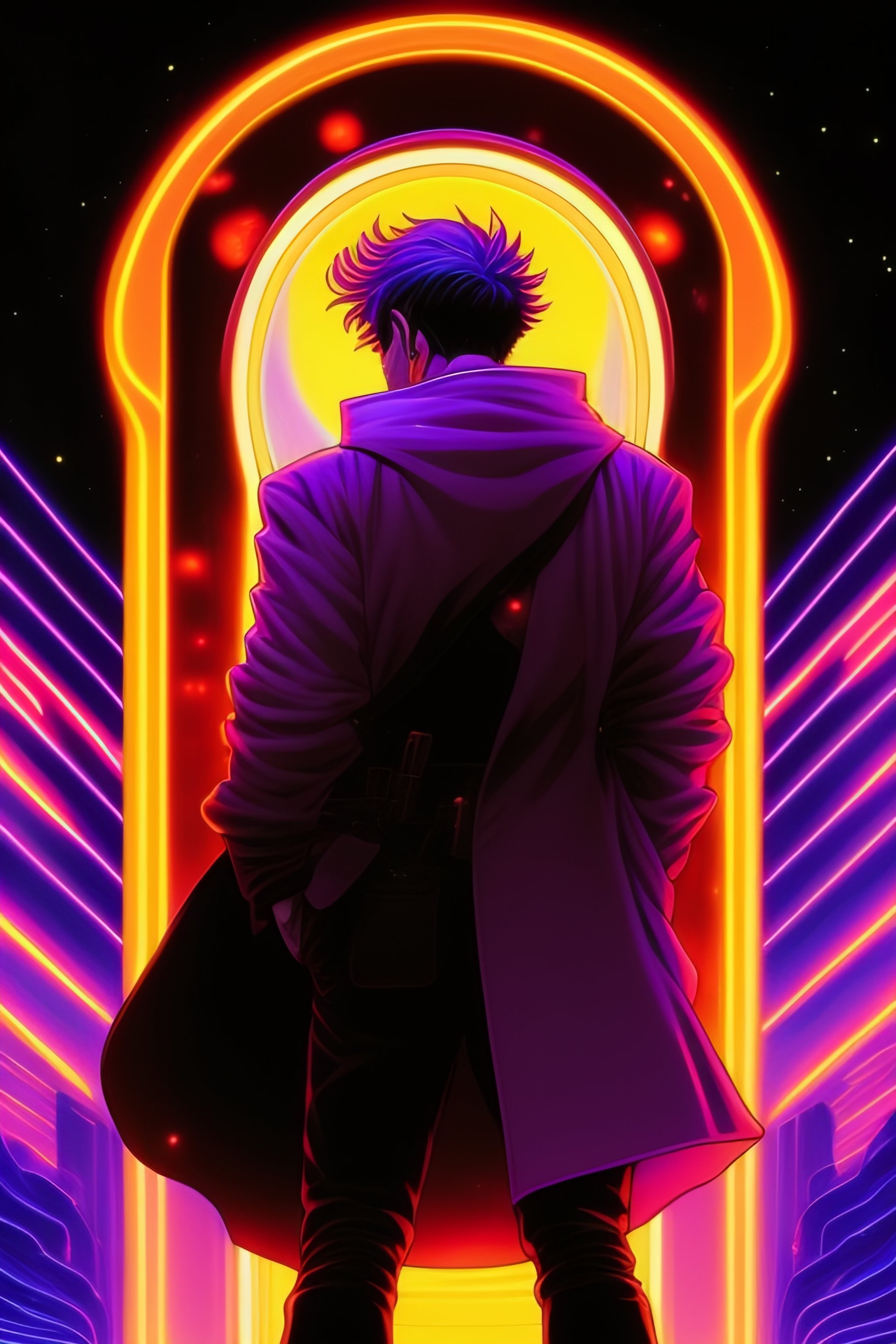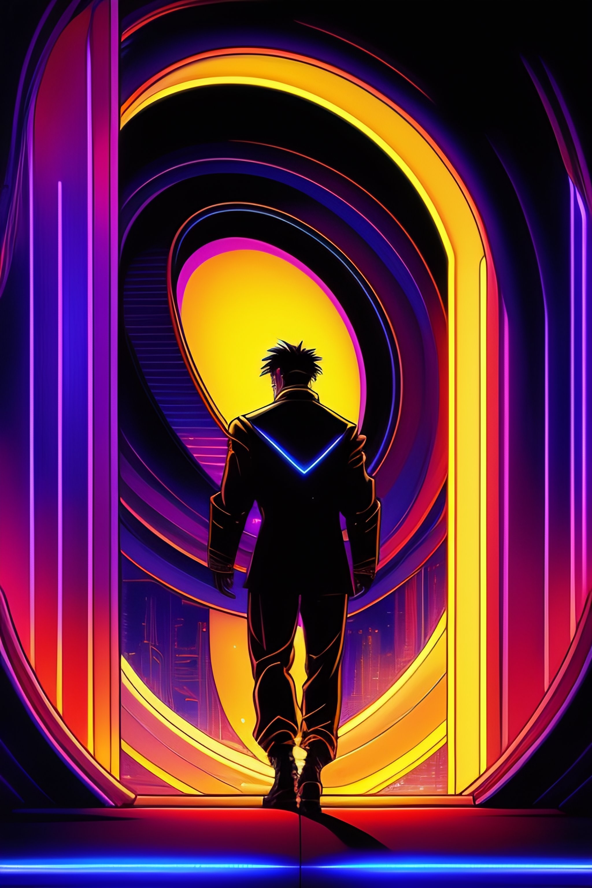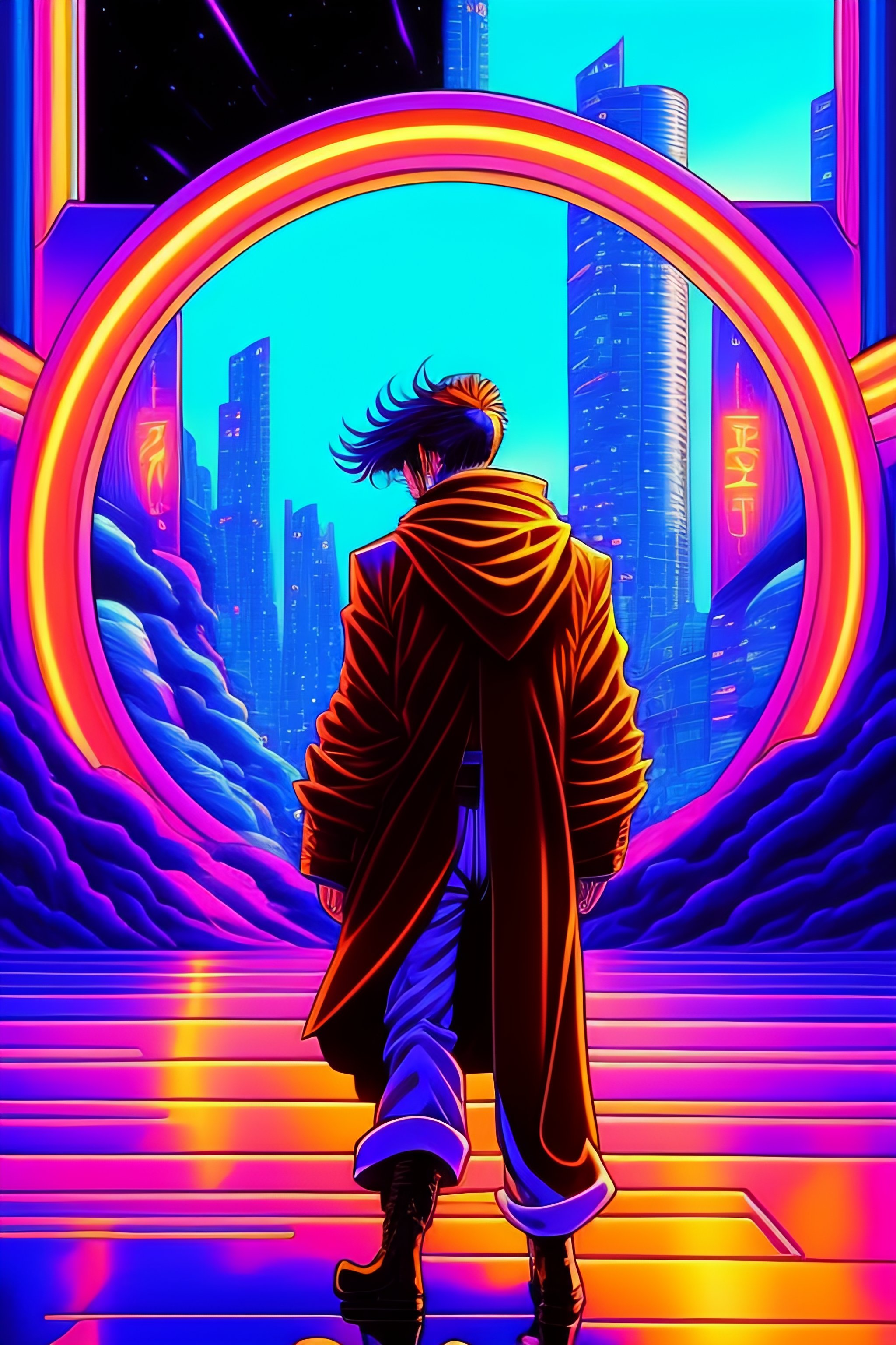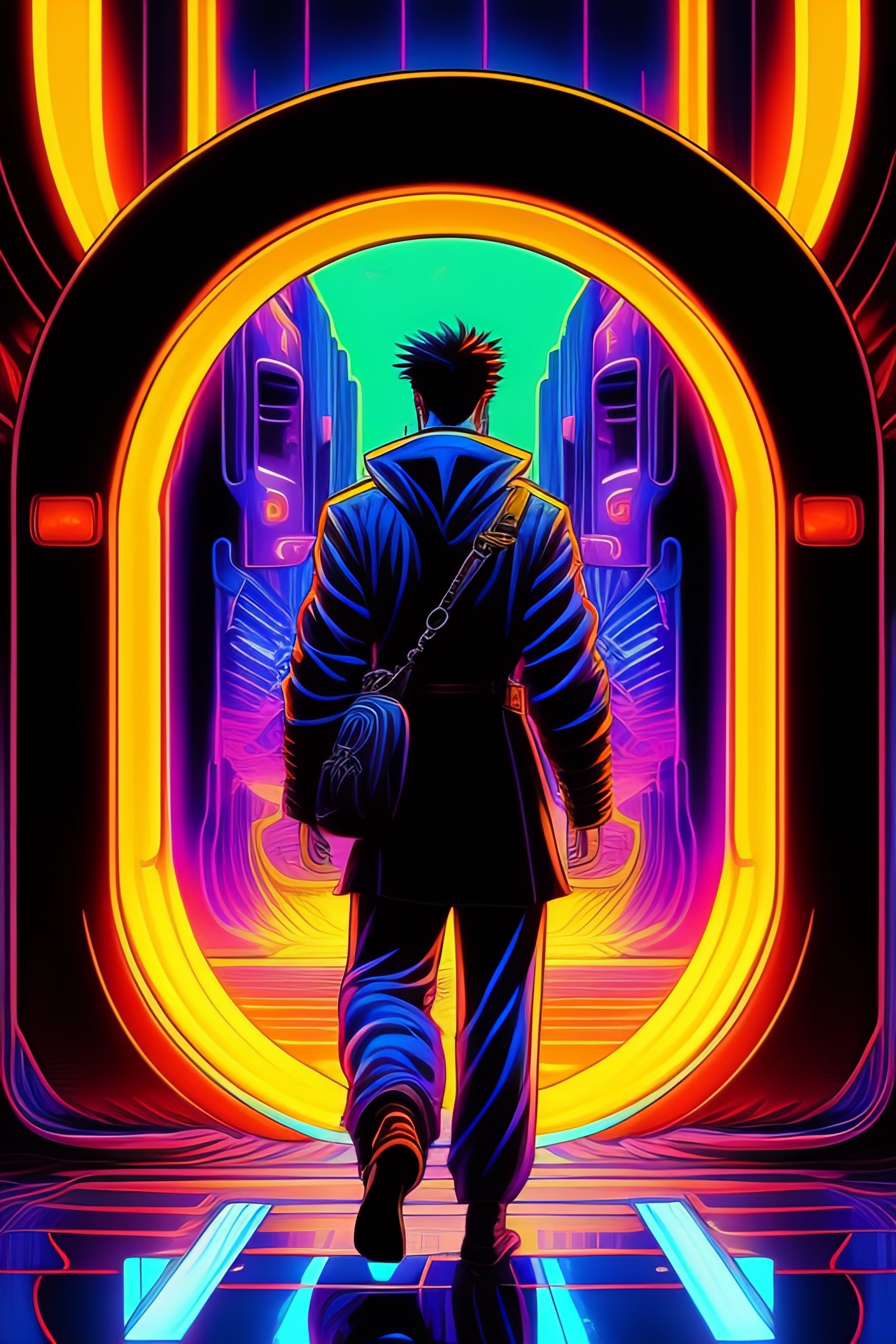 Vintage 90's anime style. man walking through a massive portal; by hajime sorayama, greg tocchini, virgil finlay, sci-fi, colors, neon lights. line art.