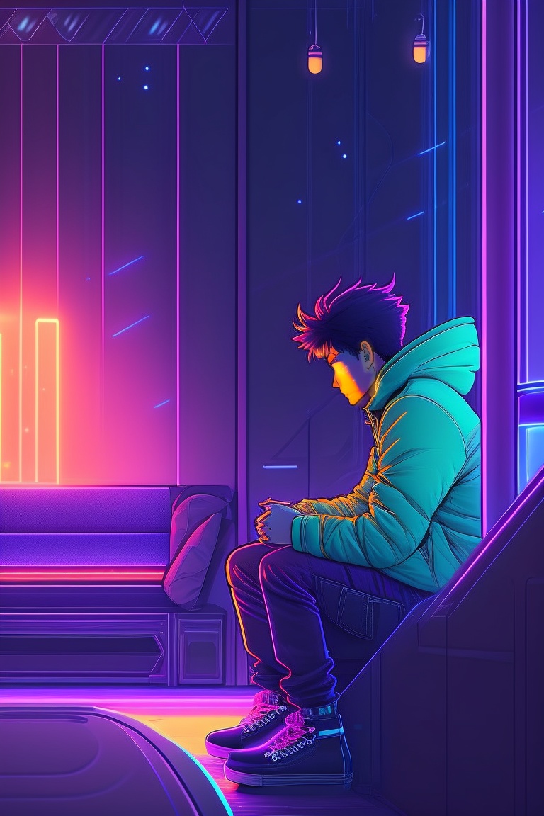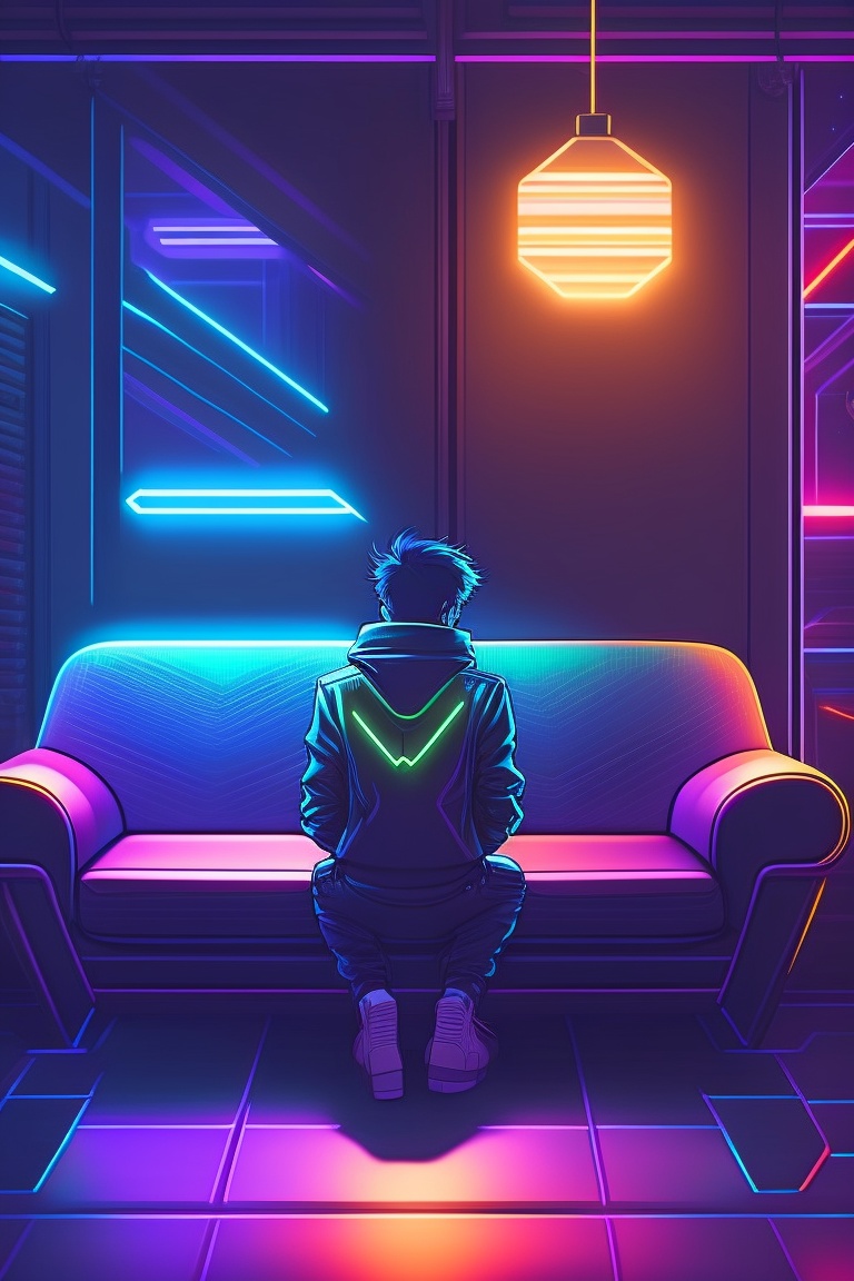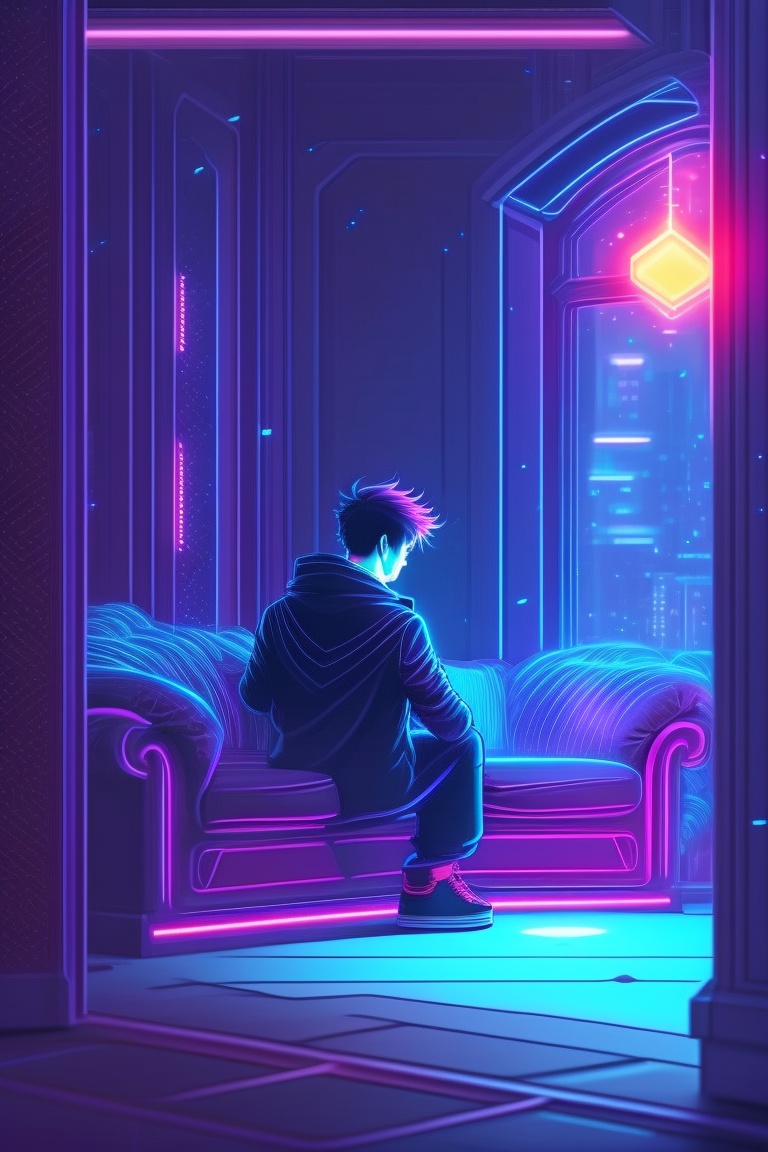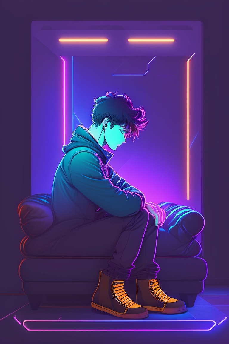 Dark room, with a young man sit on sofa, sad and depressive atmosphere, sad face, vintage 90's anime style, sci-fi, neon lights. line art.