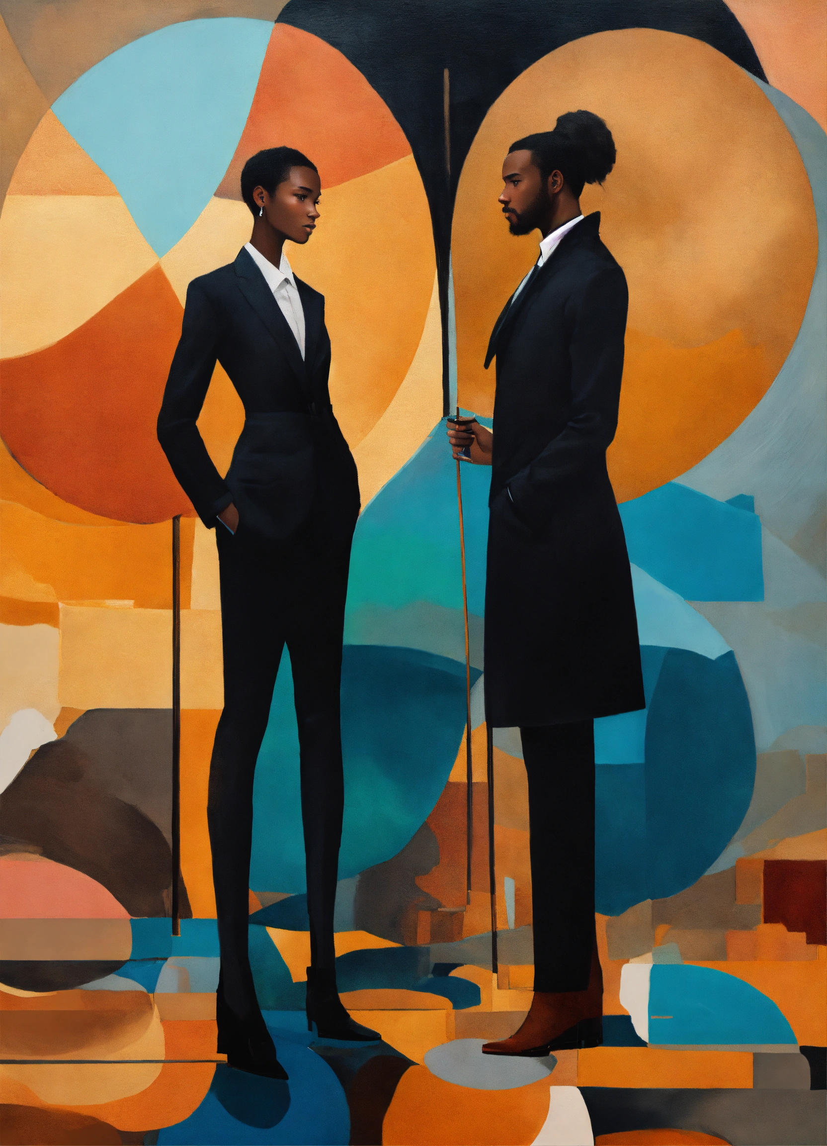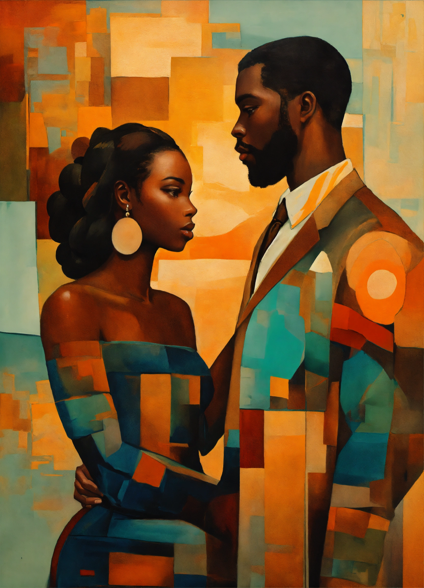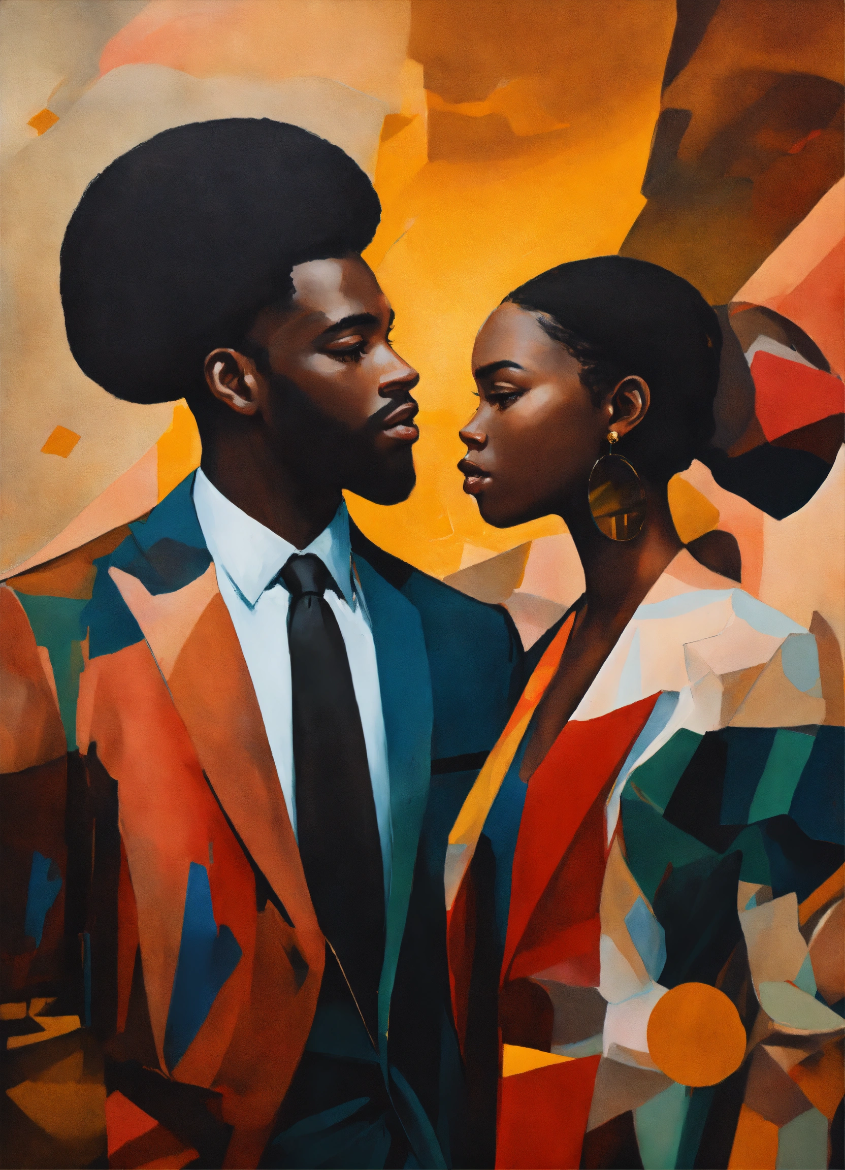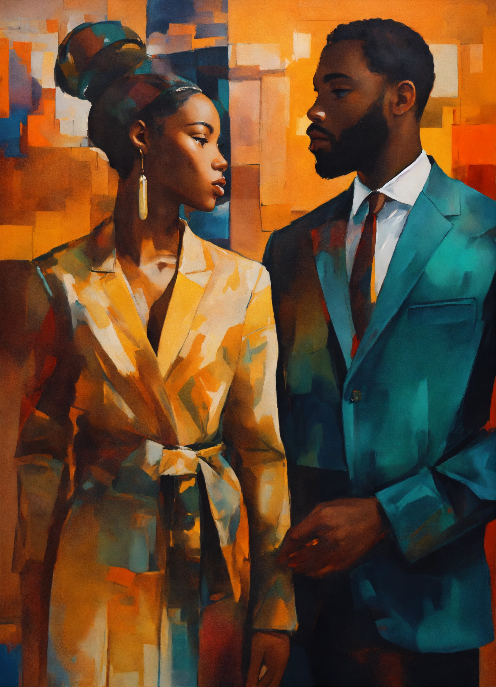 Abstract image of black man and woman in the style of a painting representing soft skills such as negotiation