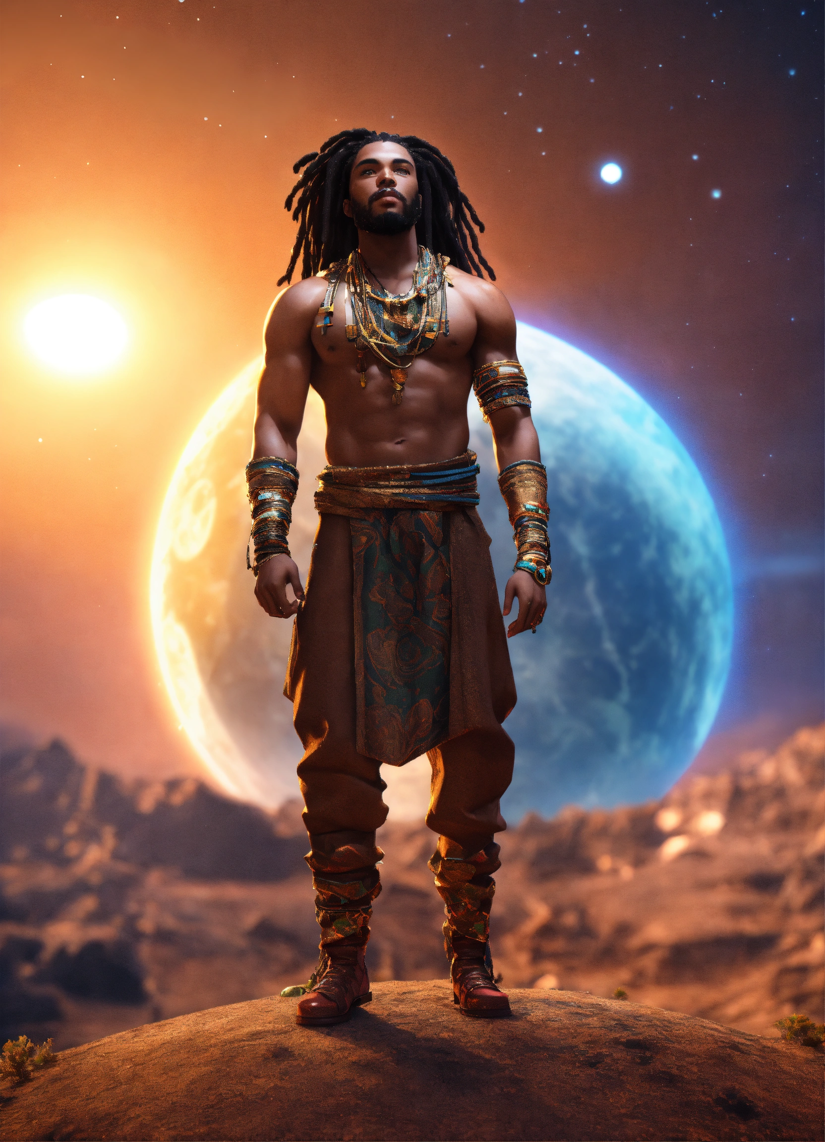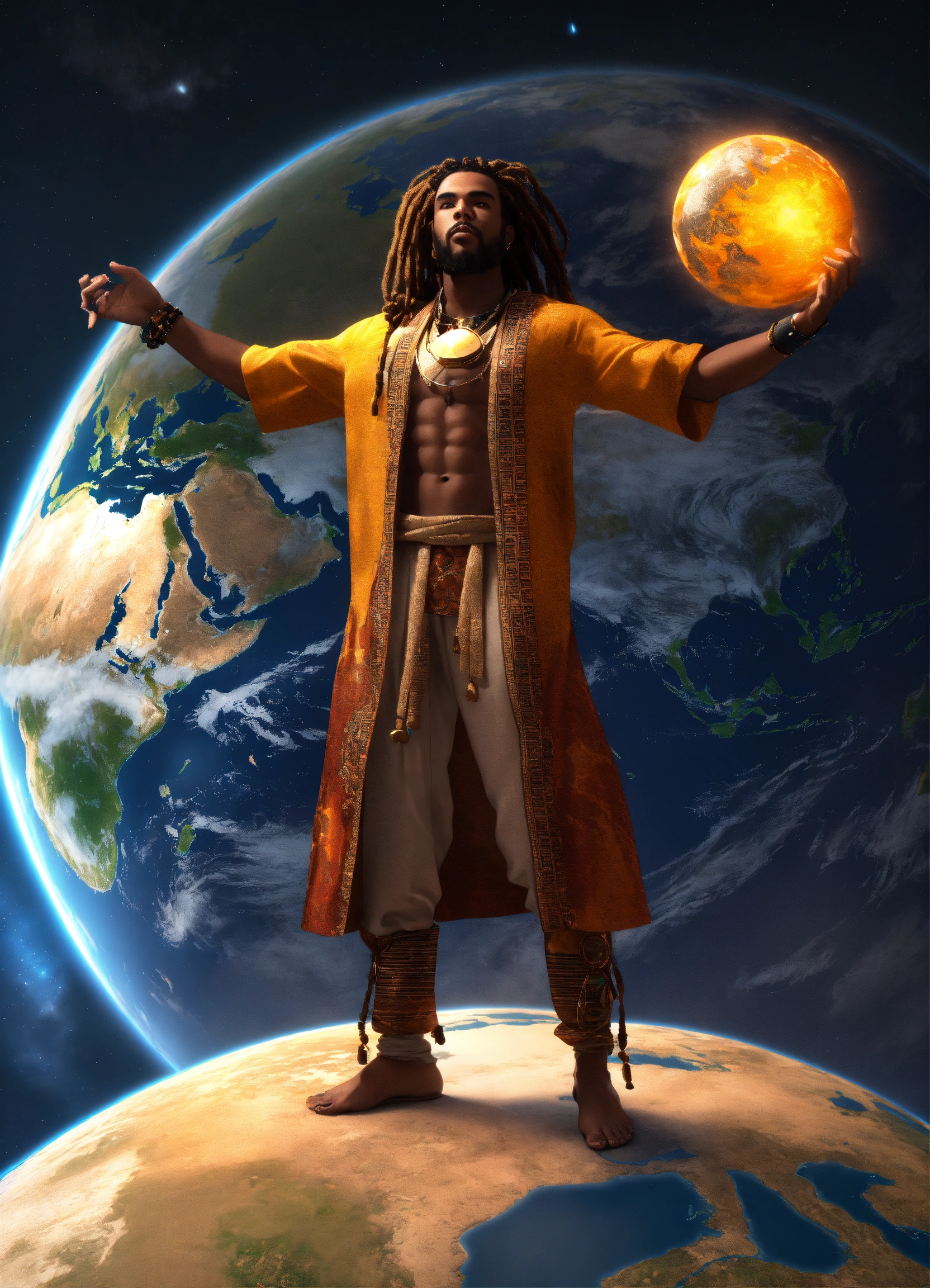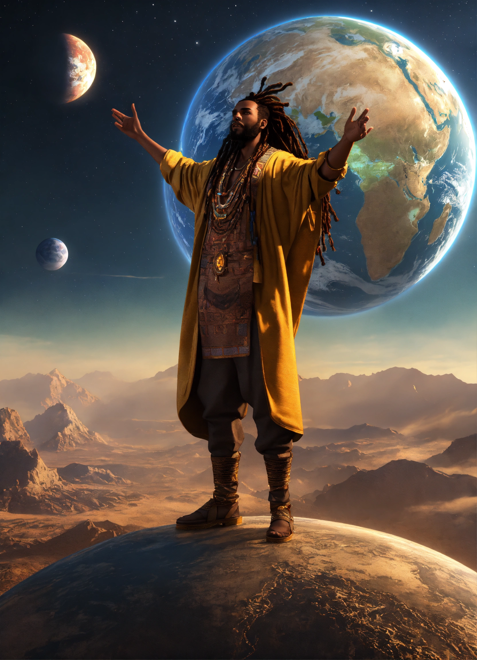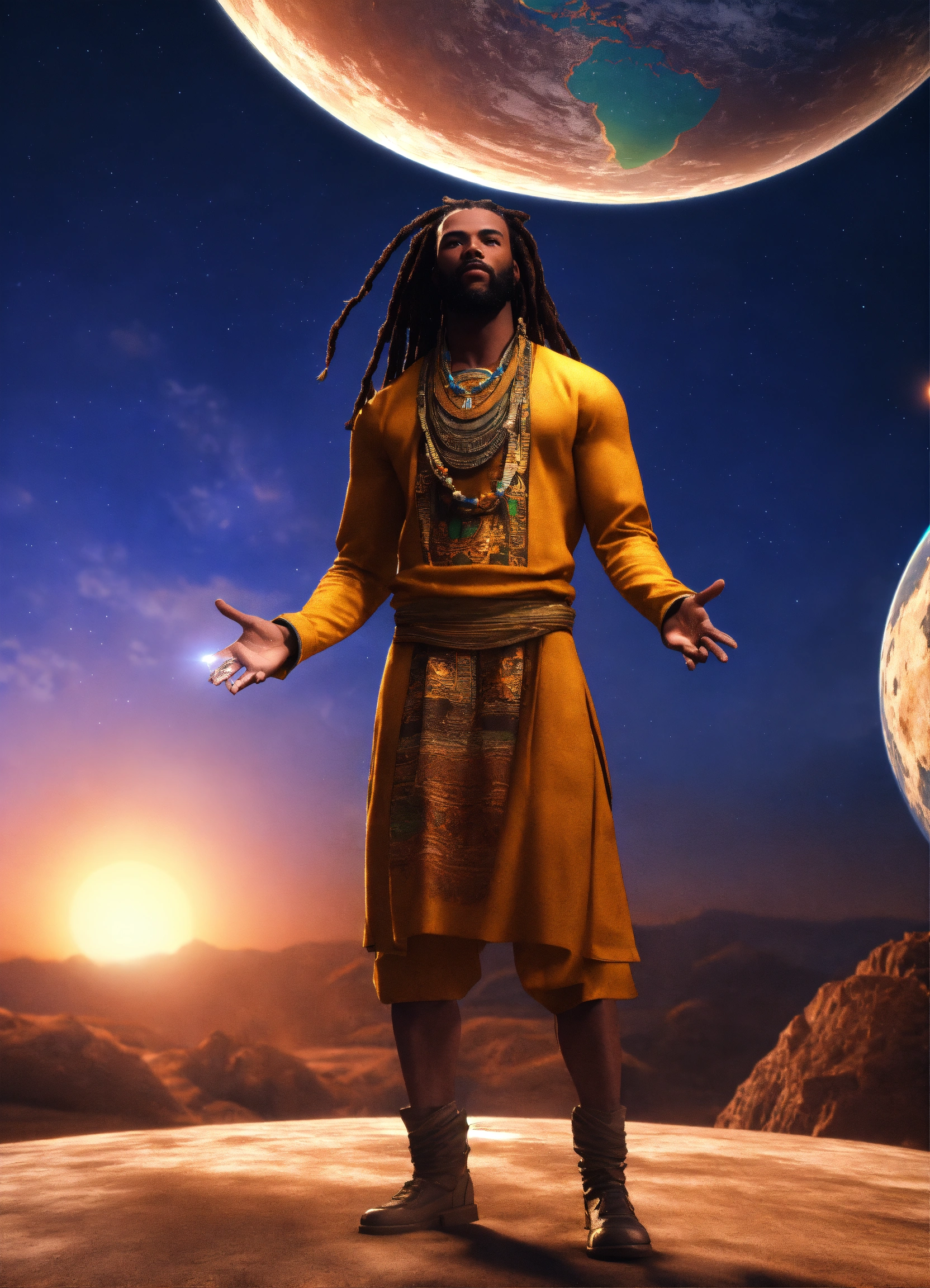 3d render of a black man with long flowing dreadlocks, 6'5" tall, well-built, body emitting luminous light, standing on top of old planet earth with a newer bigger earth in the background, full body shot, hands upraised, wearing african style clothing