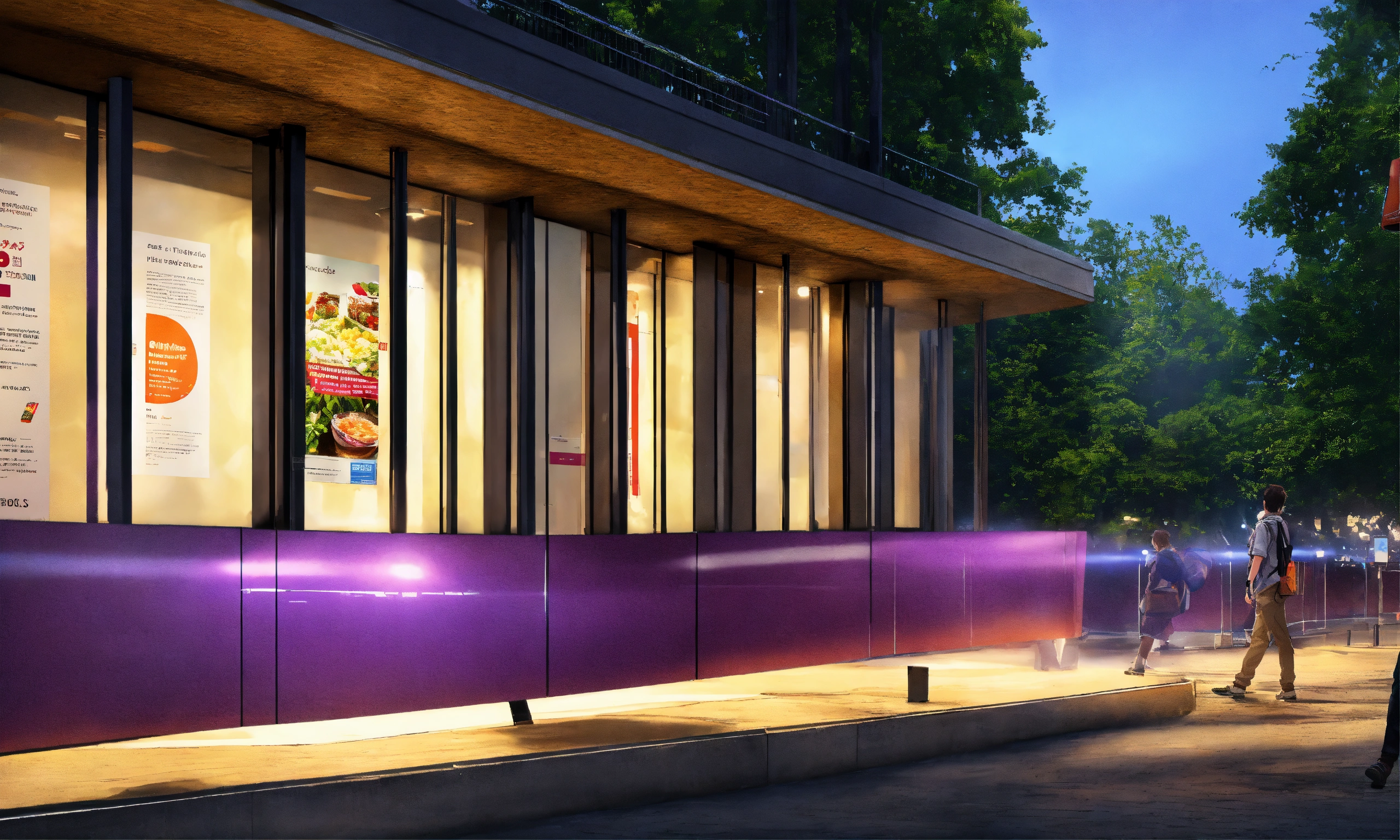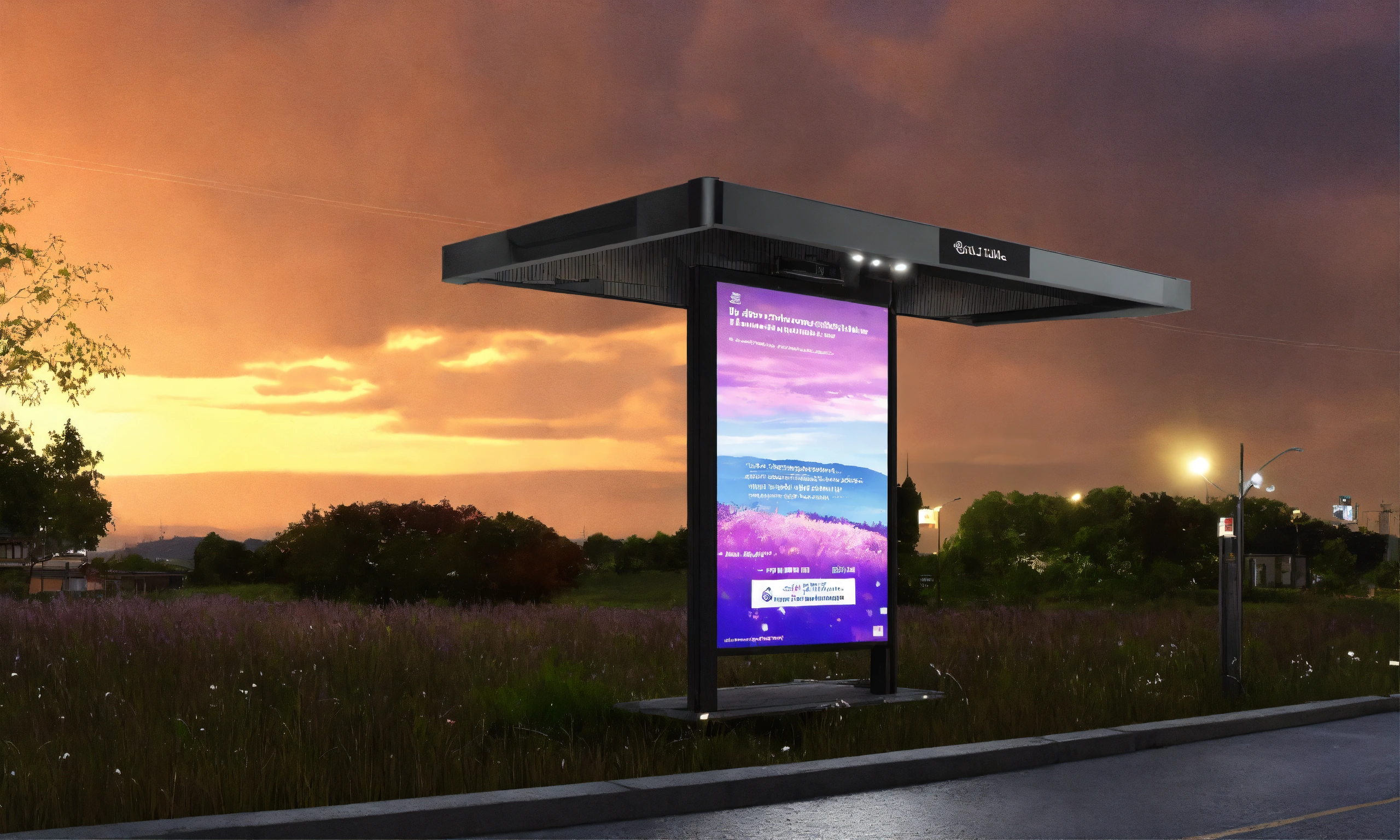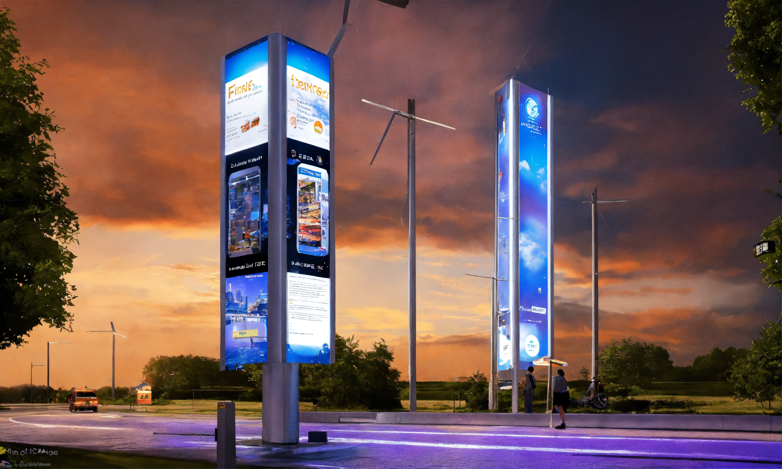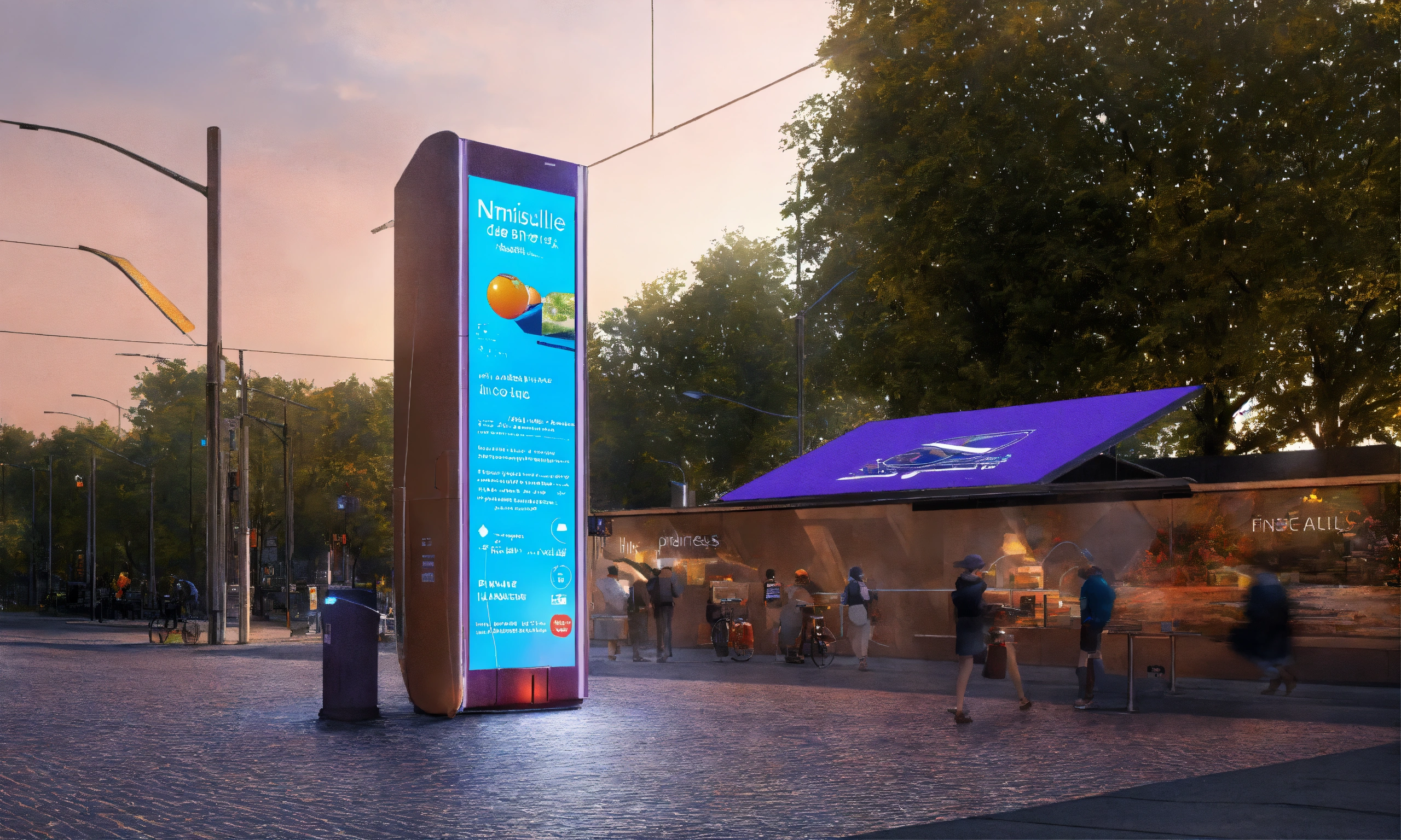 Centre-ville futuriste crépusculaire avec rues piétonnes bondées. au centre un totem disposant de panneau publicitaire numérique de 1 mètres de haut, élégant, épuré, matériaux durables montrant news, publicités, cartes, alertes. des panneaux solaires servent de toiture à ce totem, ils sont visibles sur l'image afin de mettre en avant le coté écologique. citoyens utilisant interfaces tactiles du panneau publicitaire numérique. points d'accès wi-fi, zones de charge sans fil, éclairages led au sol indiquant espaces d'activités. ciel violet-orange contrastant avec éclairage high-tech.
