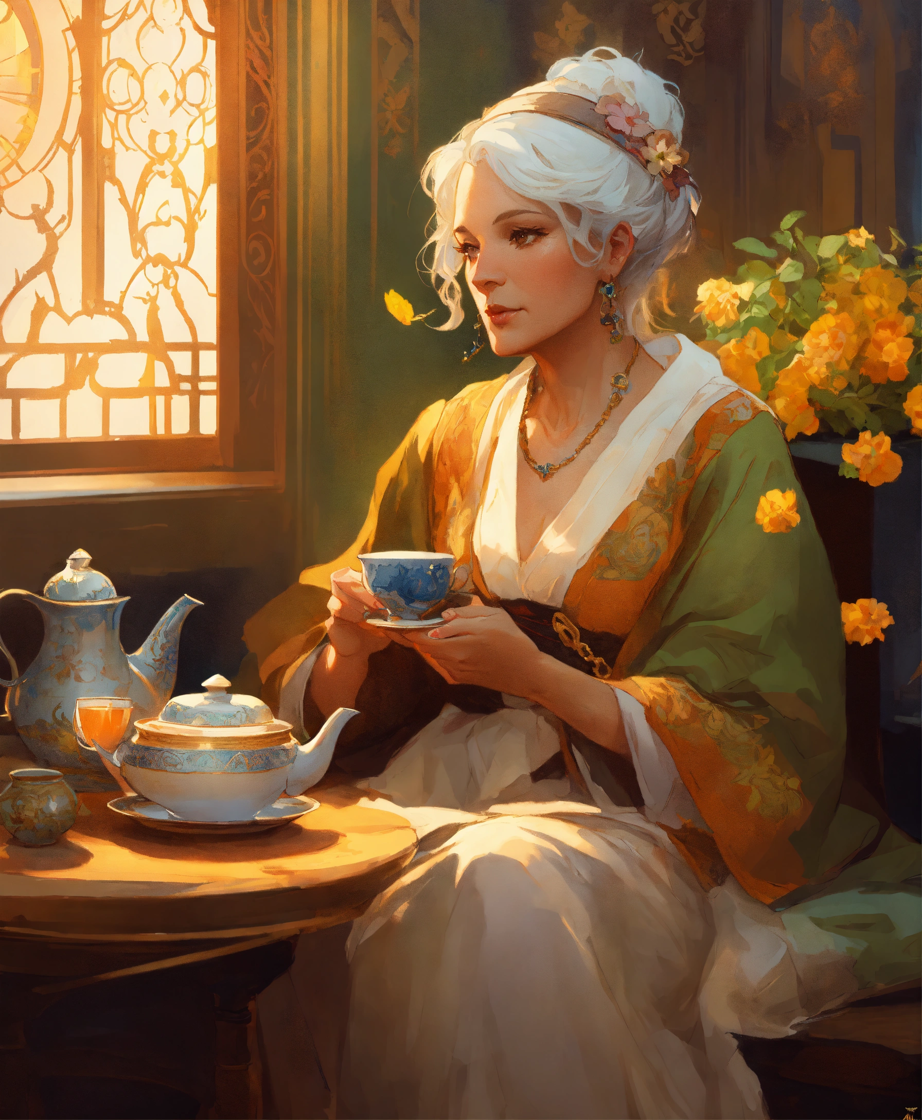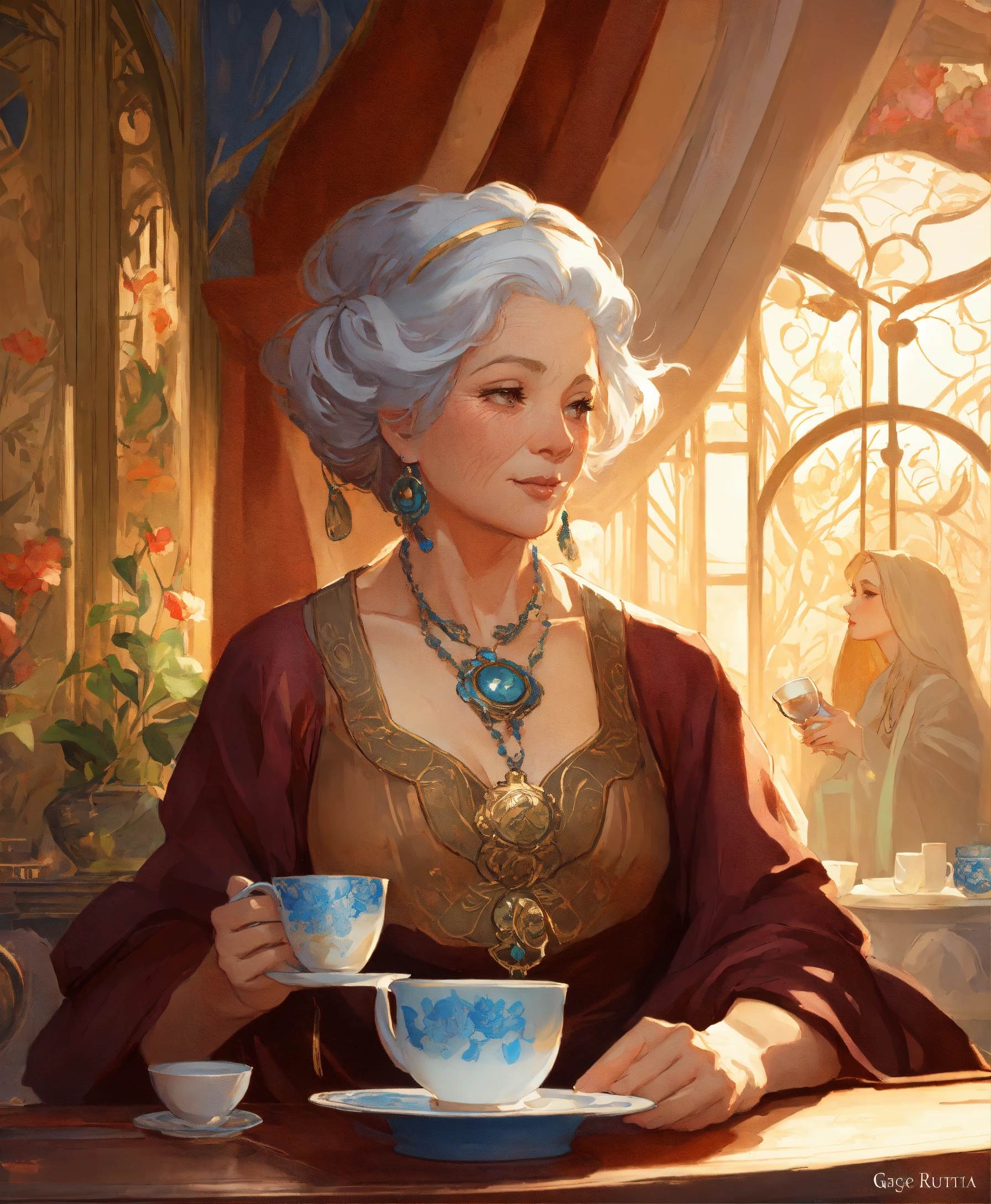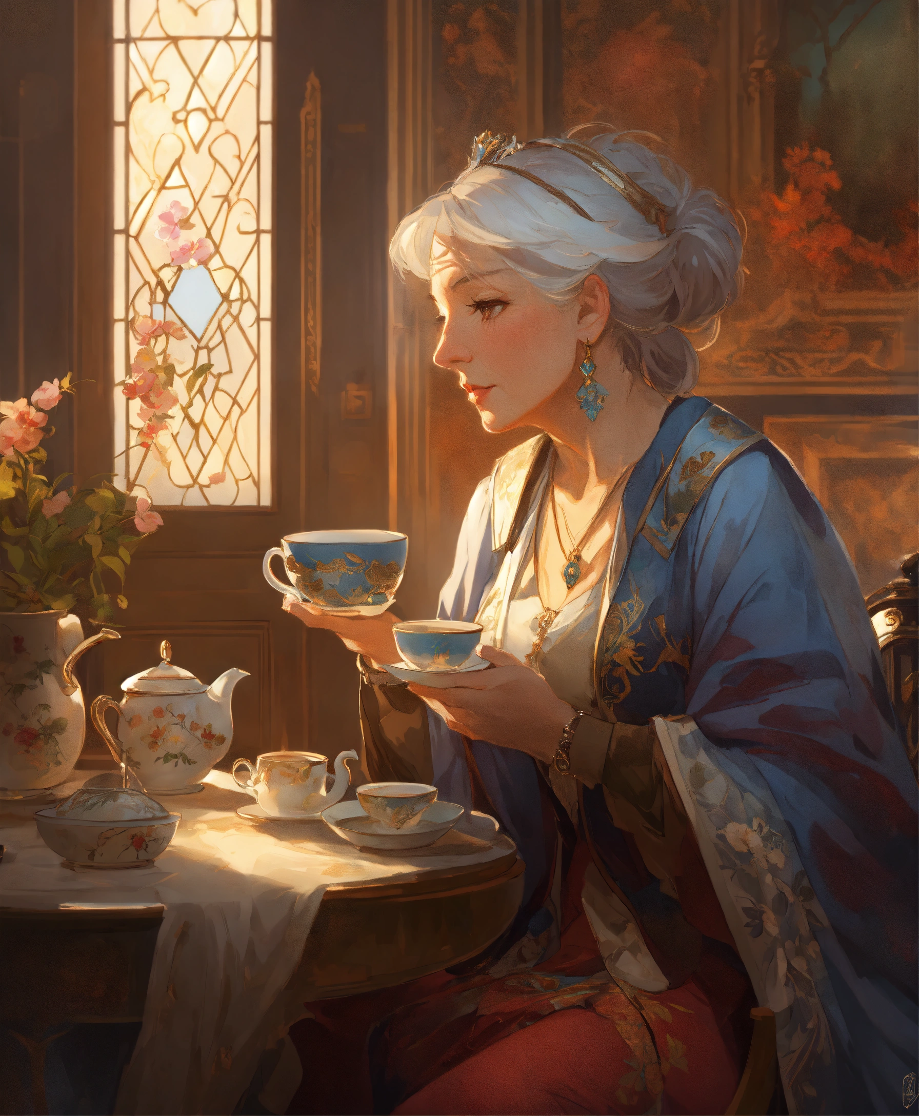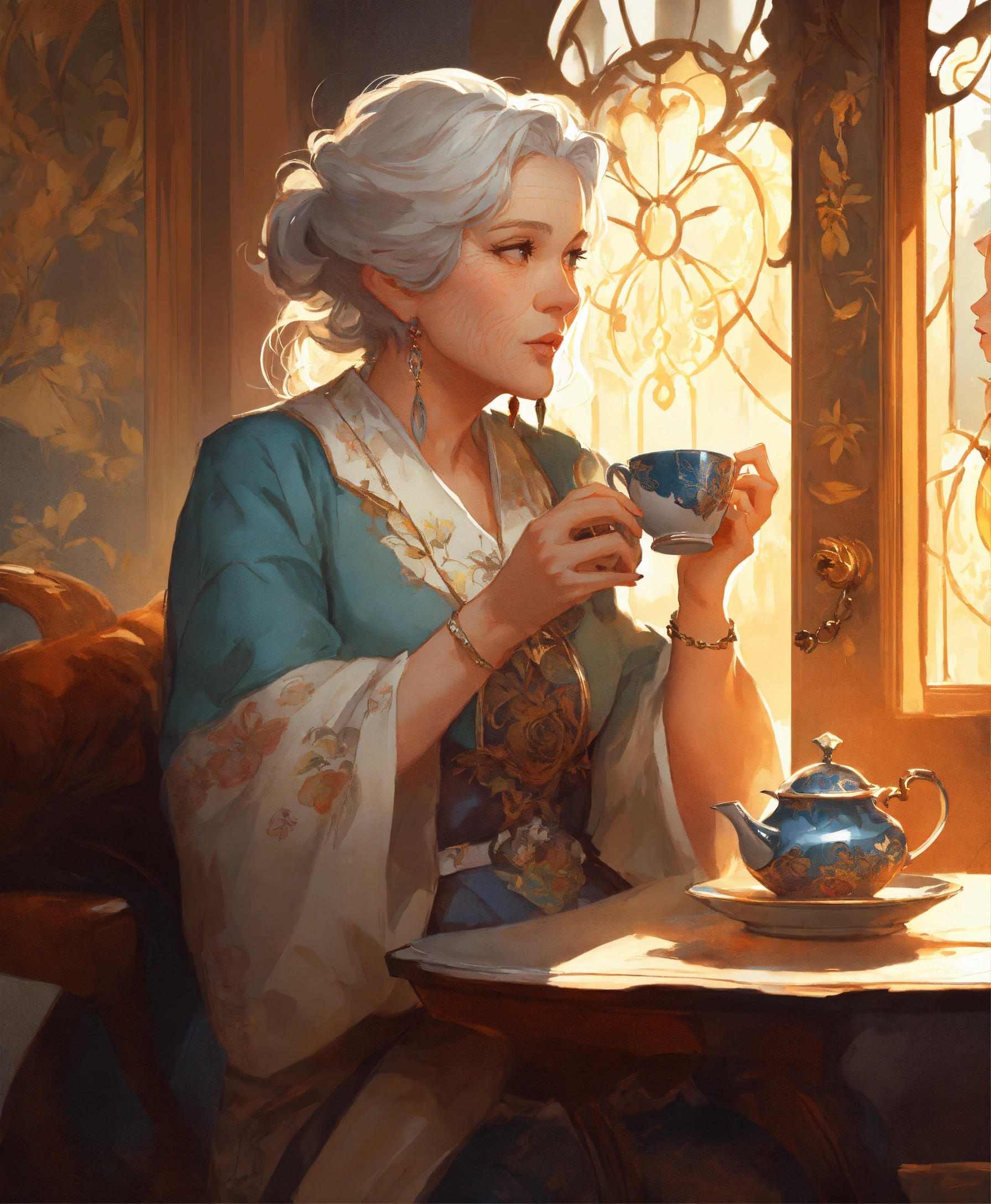 Noble old woman noble in her house drinking tea, art by artgerm and greg rutkowski and alphonse mucha and loish and wlop, artstation, illustration