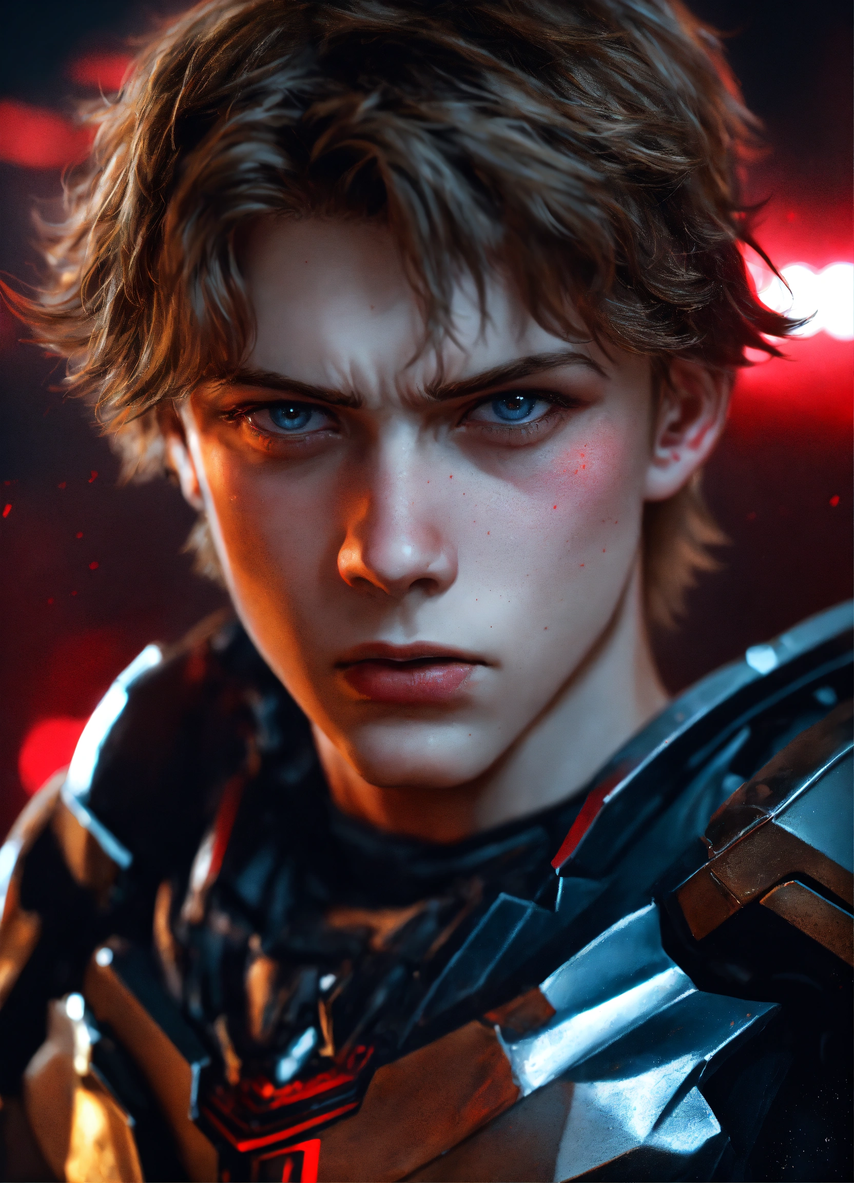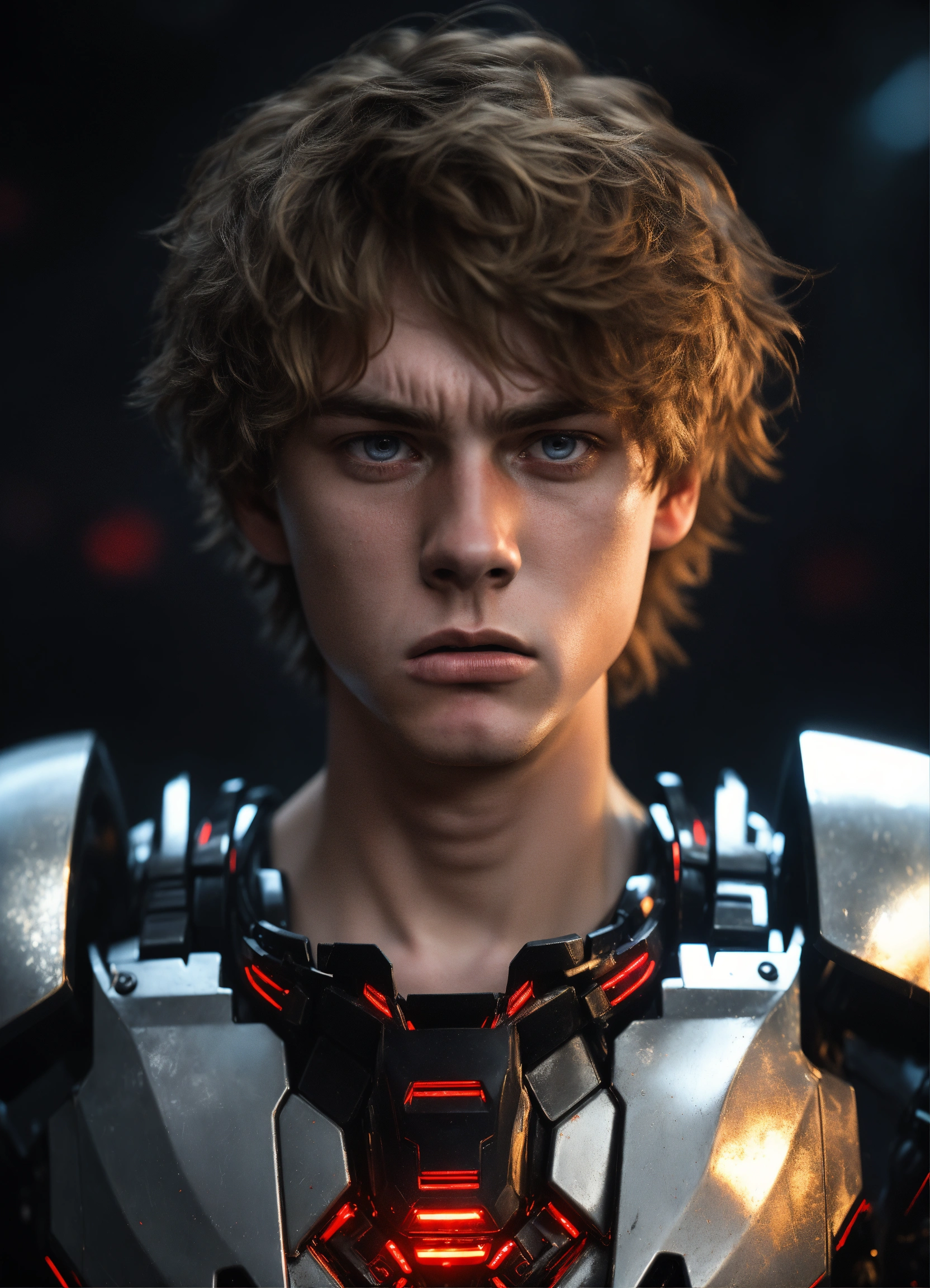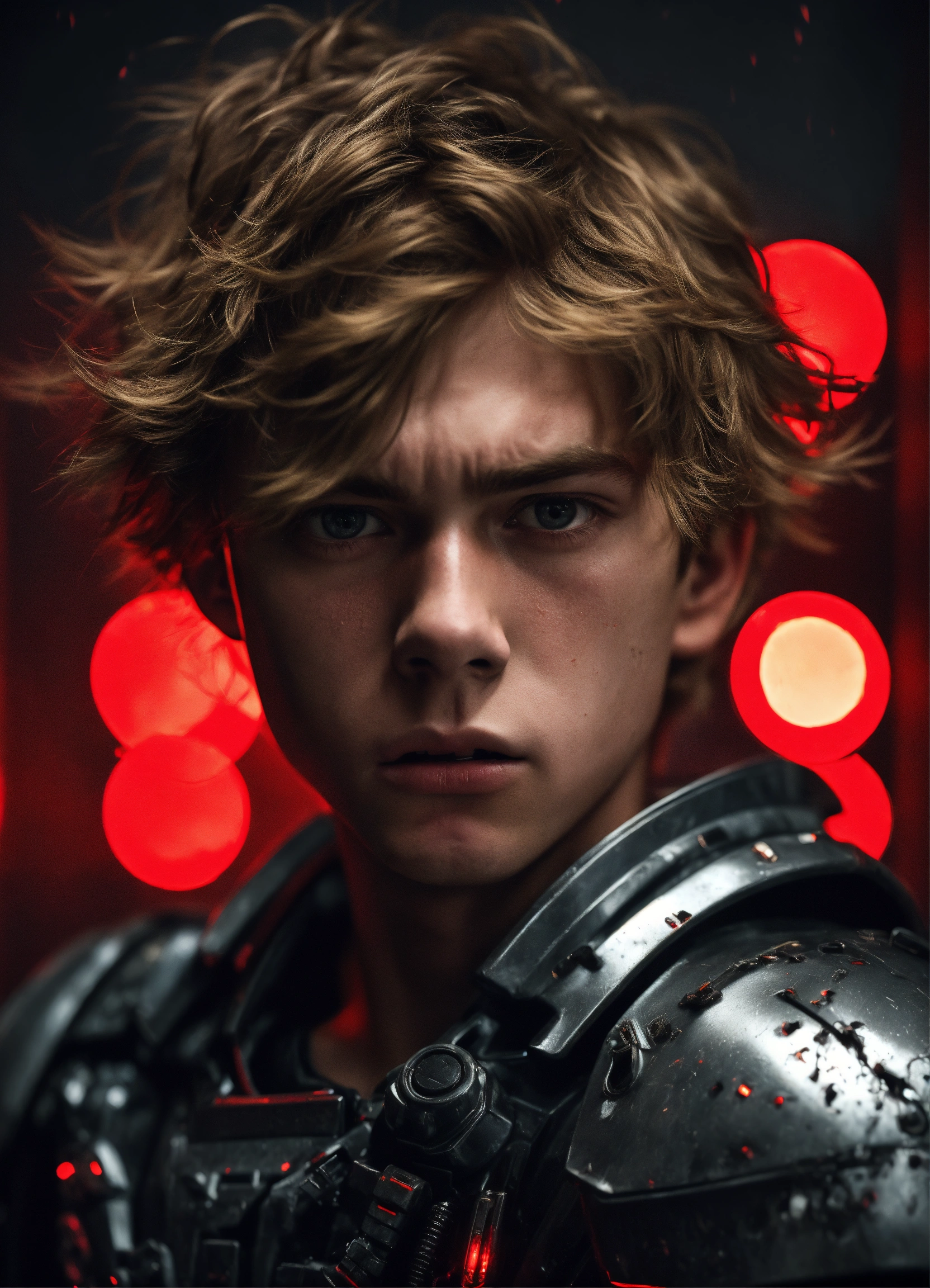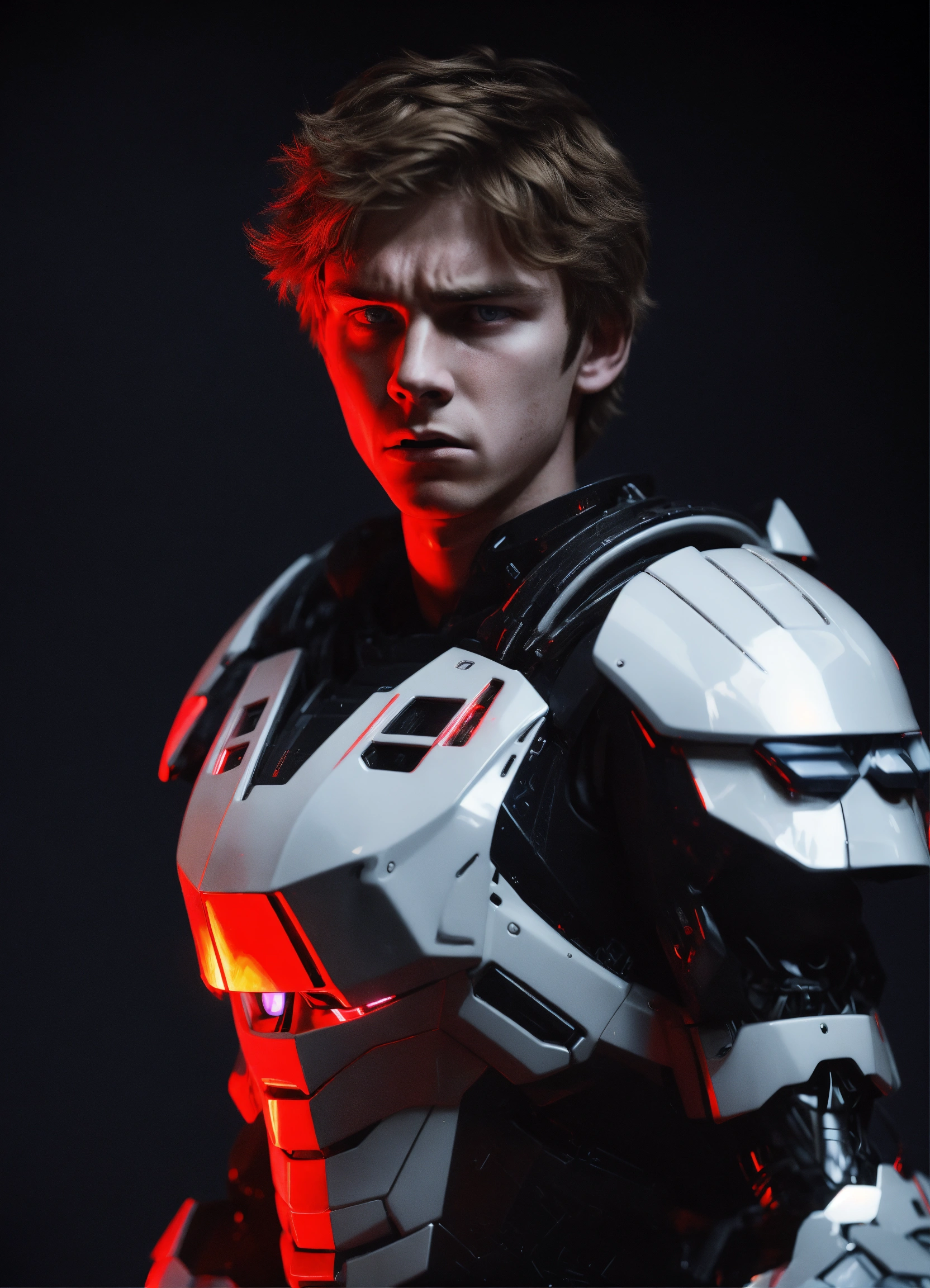 A realistic photo of a white 17-years-old boy, with a scary angry expression, brown slanted eyes, thin lips, dark blonde hair, messy hair, angry depressed expression, strong constitution, wearing a black robotic armor, with a dark background with red leds, dramatic illumination, hyperdetailed, hyperrealistic, 8 k