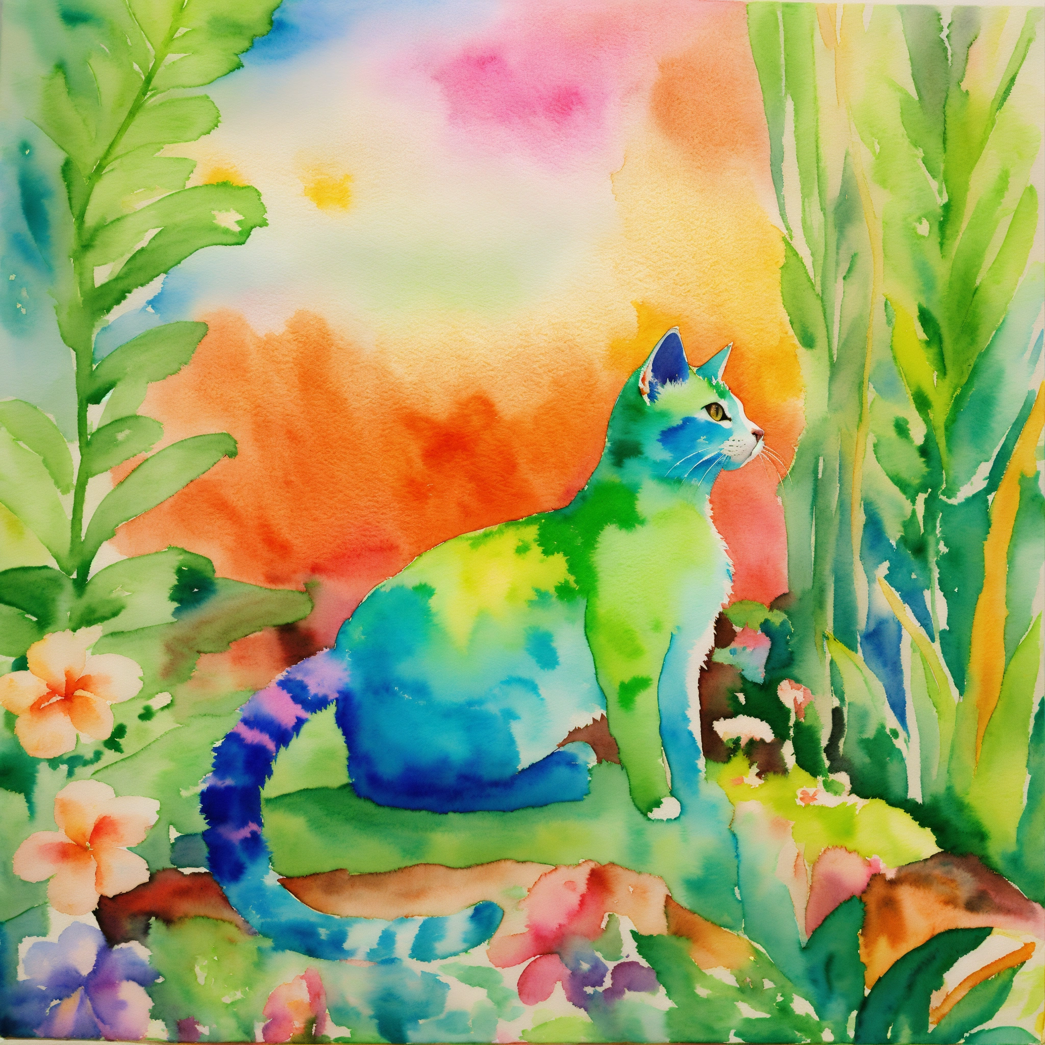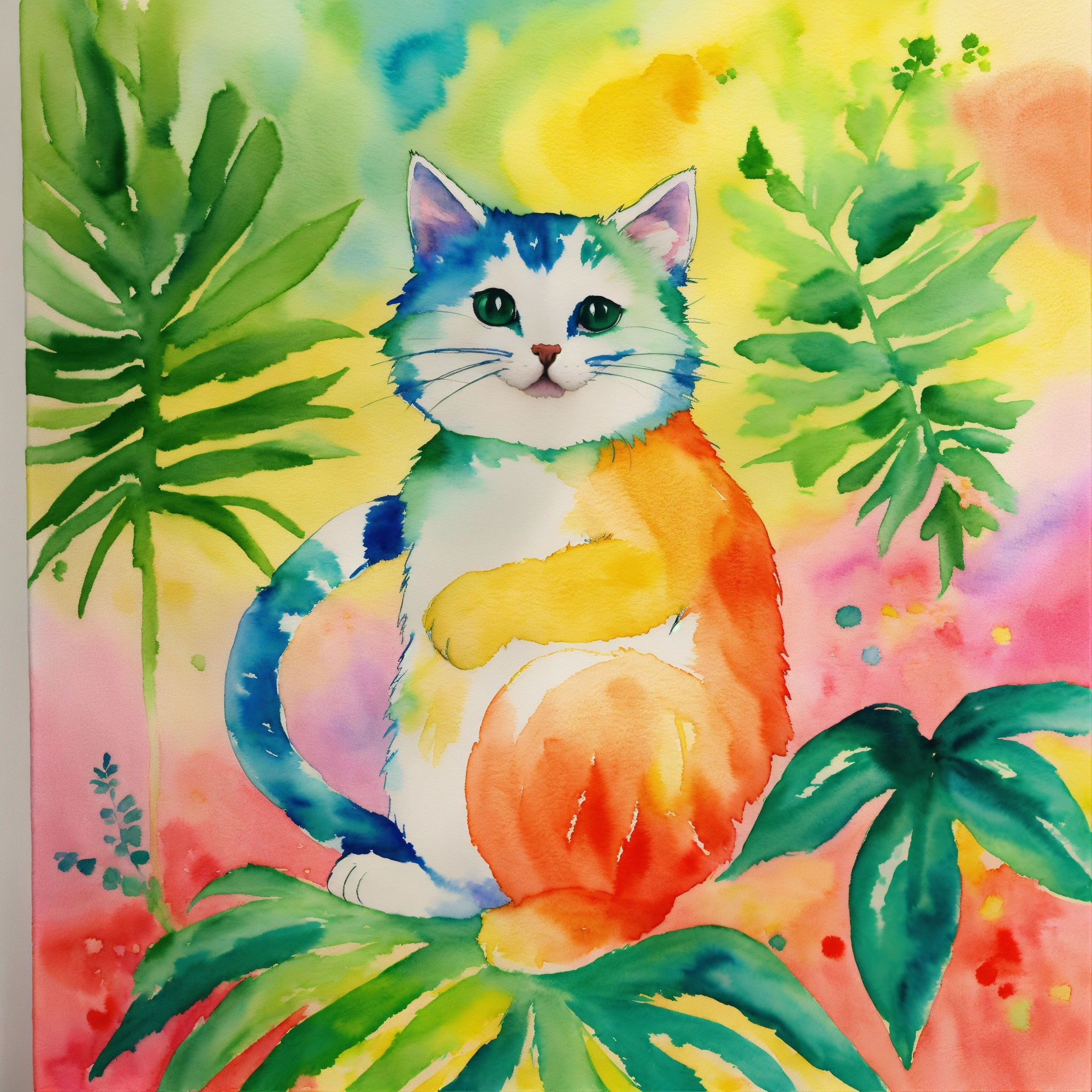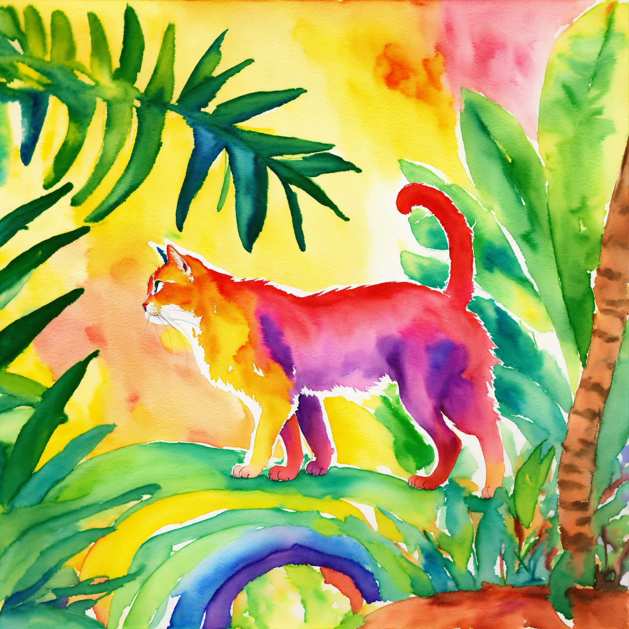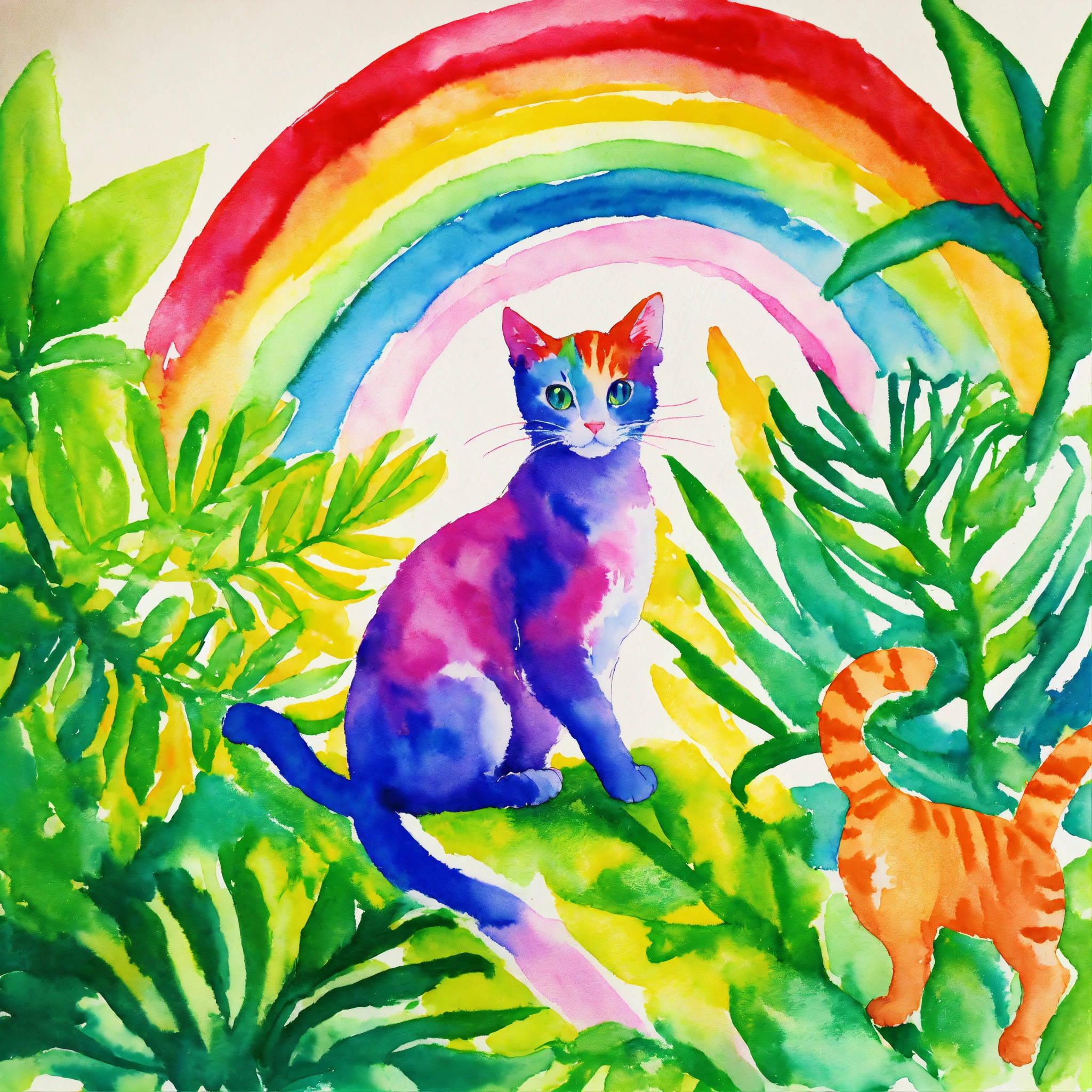 Amateur watercolor painting, high school art, basic watercolor, simple watercolor on canvas, vivid colors, bright colors, bright green, tropical rainforest, bad art, simple, vivid colors, little cat dancing on its hind legs, rainbow cat dancing around on its back legs, colorful kitten standing up and dancing