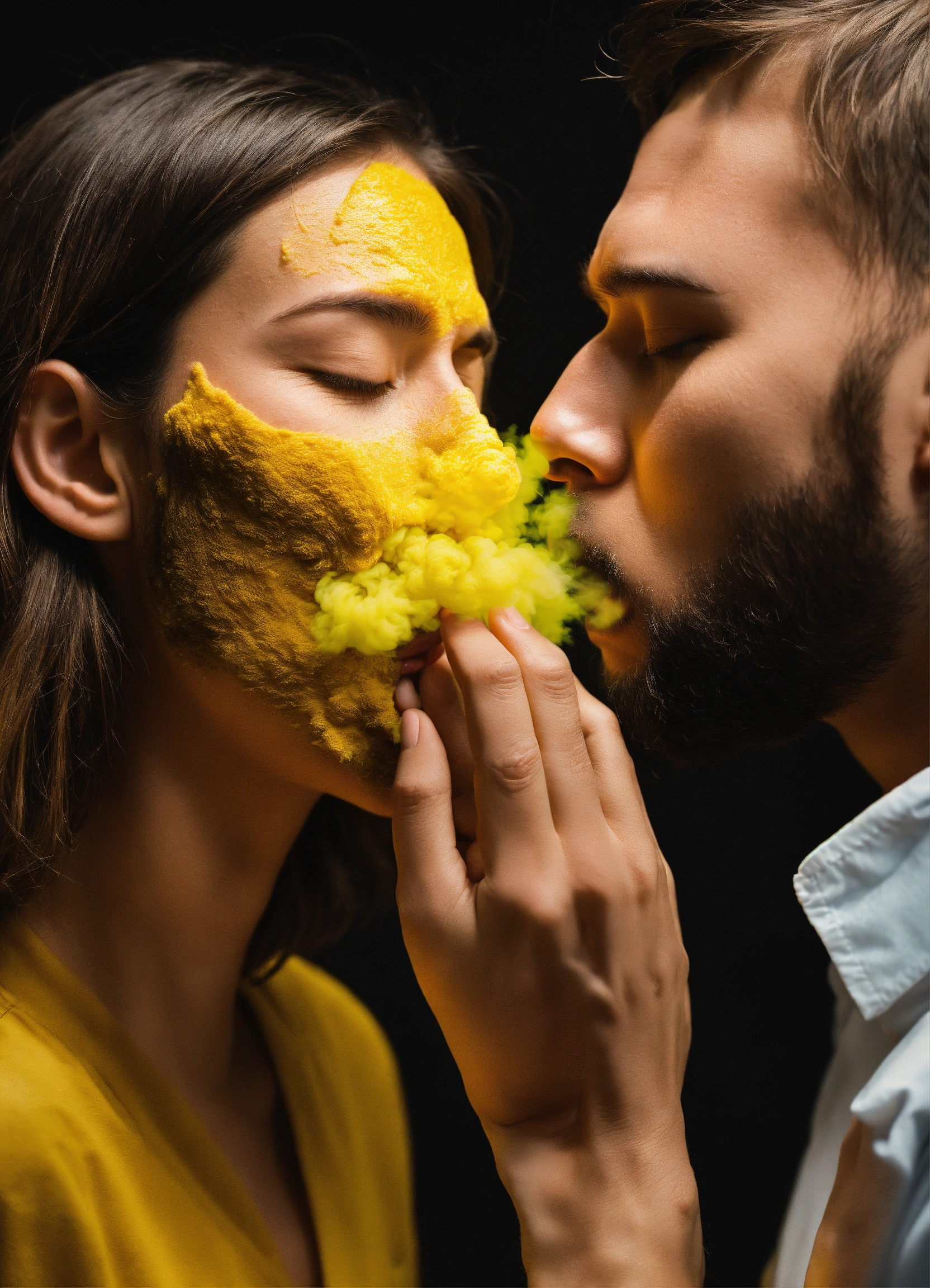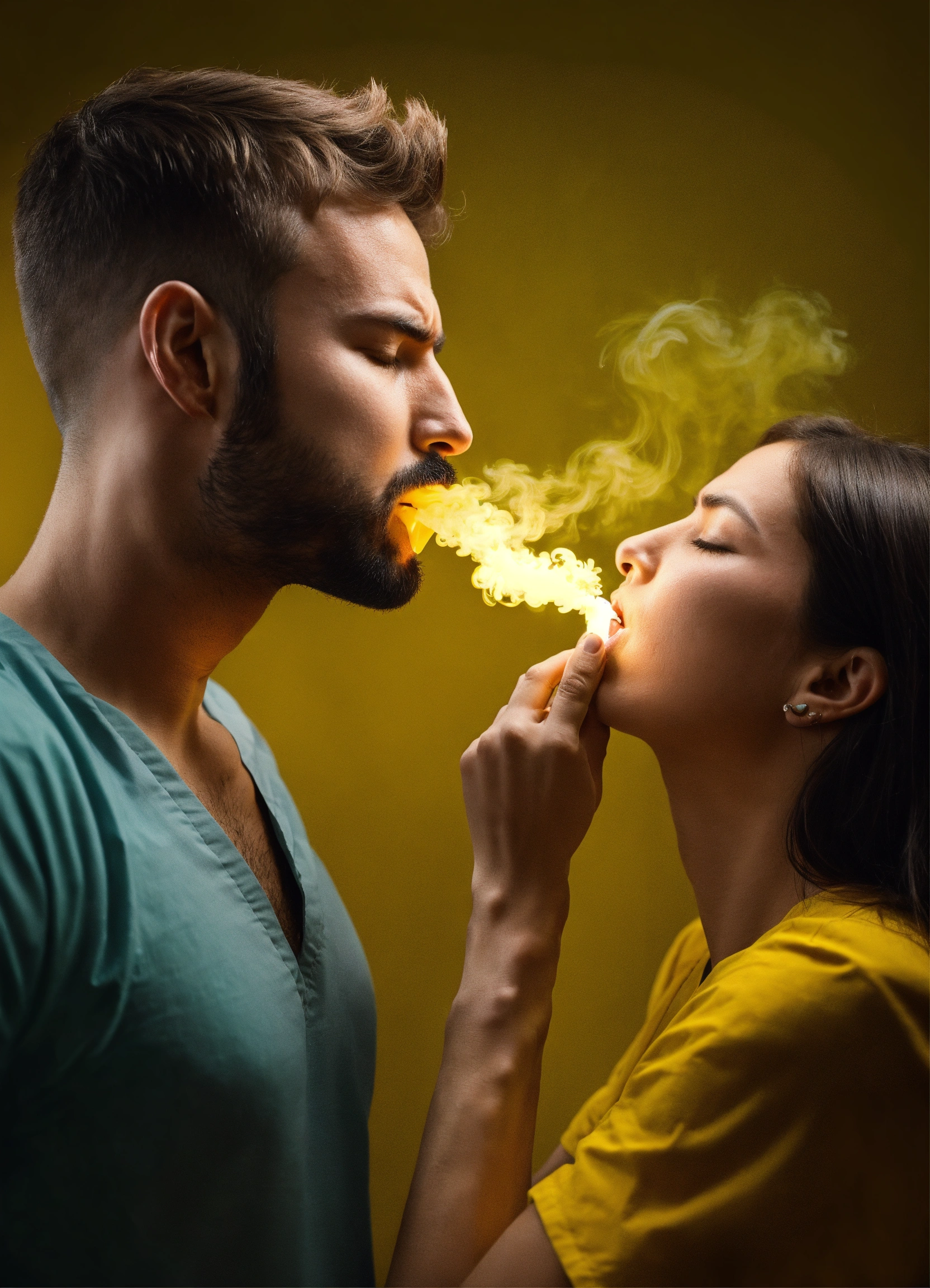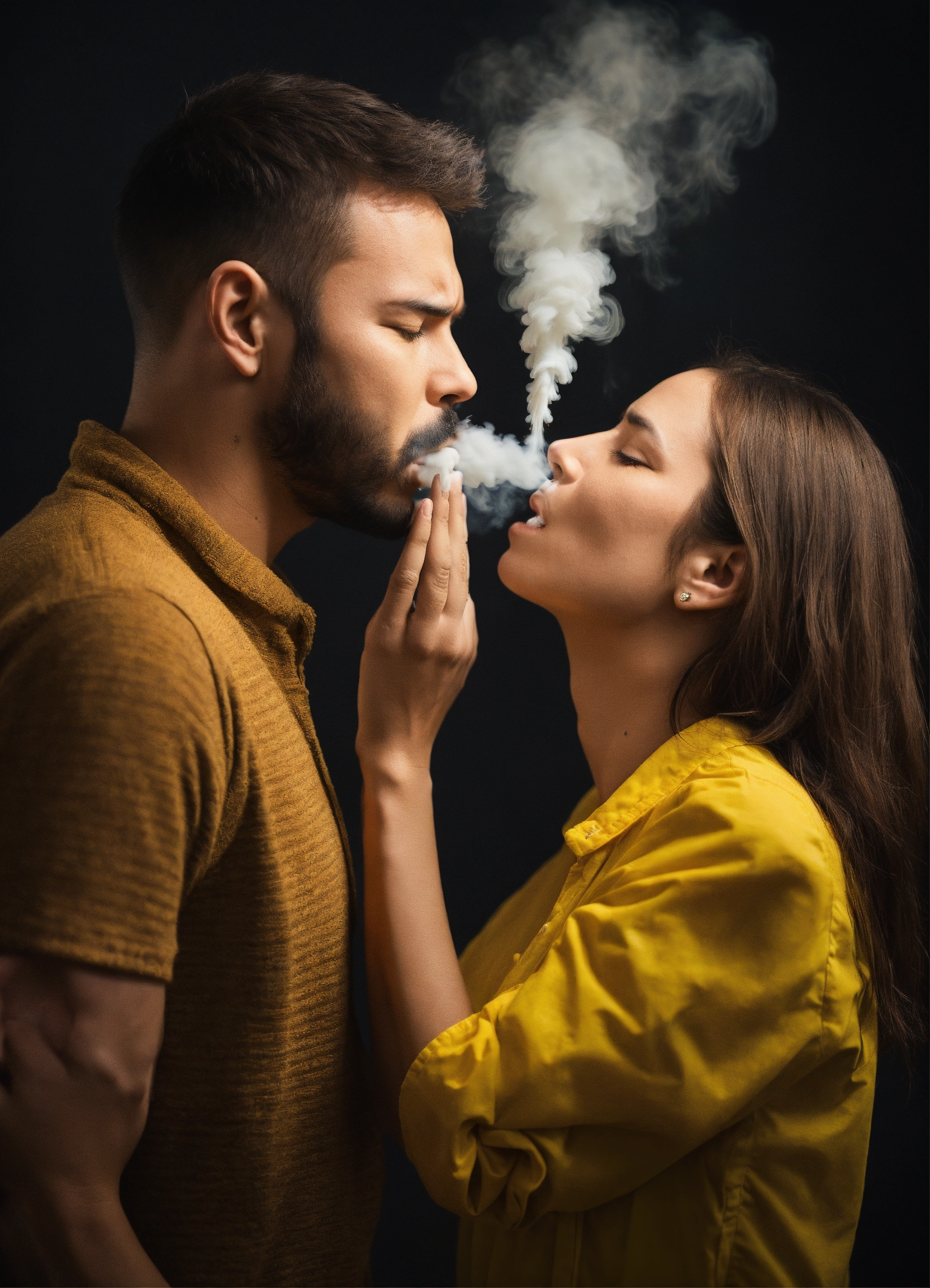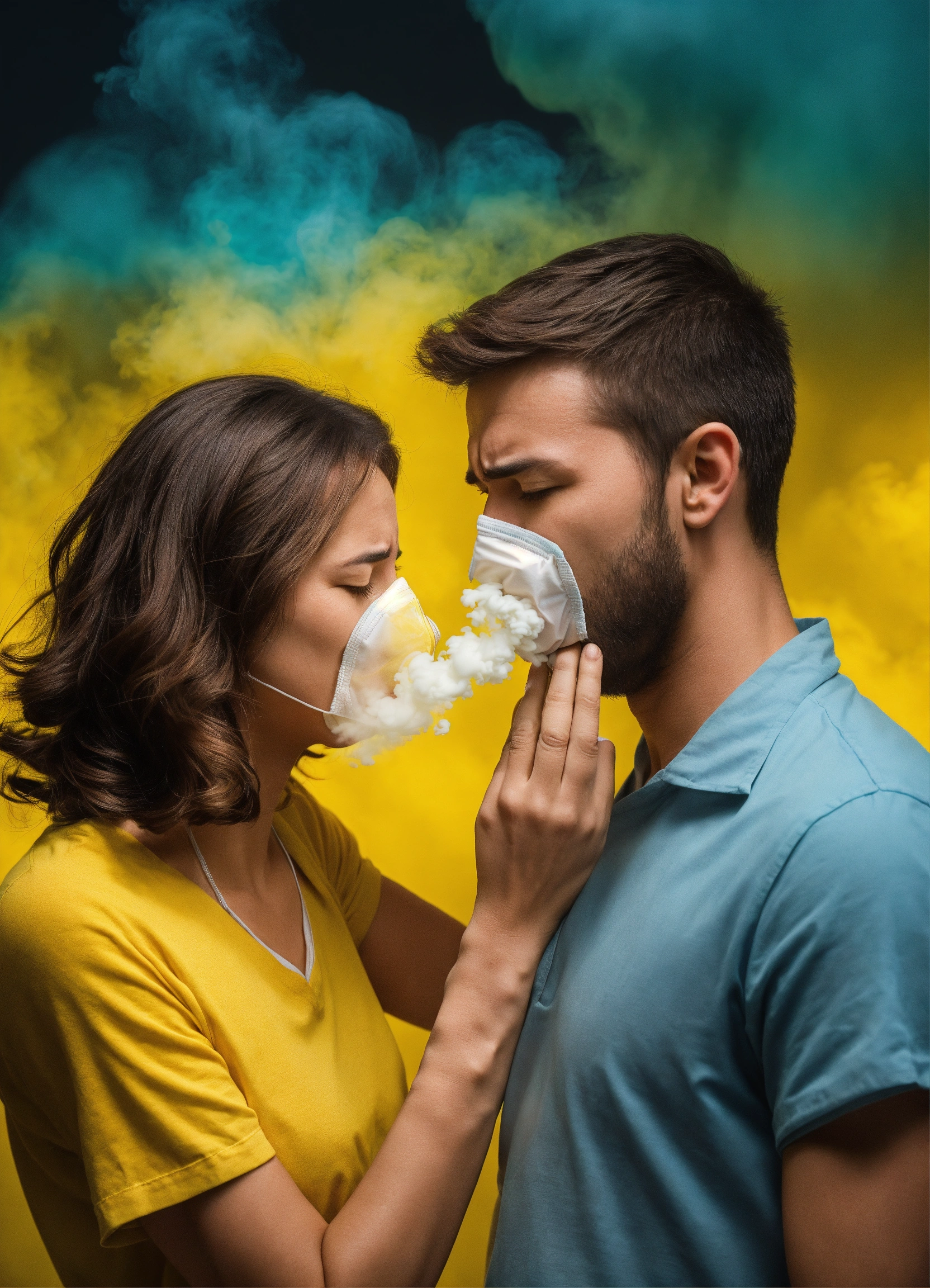 A realistic photo of a man exhaling yellow foul vapor from his mouth, and a woman covering her nose with her hands against the foul odor and looking questioningly. medical theme of bad breath odor.