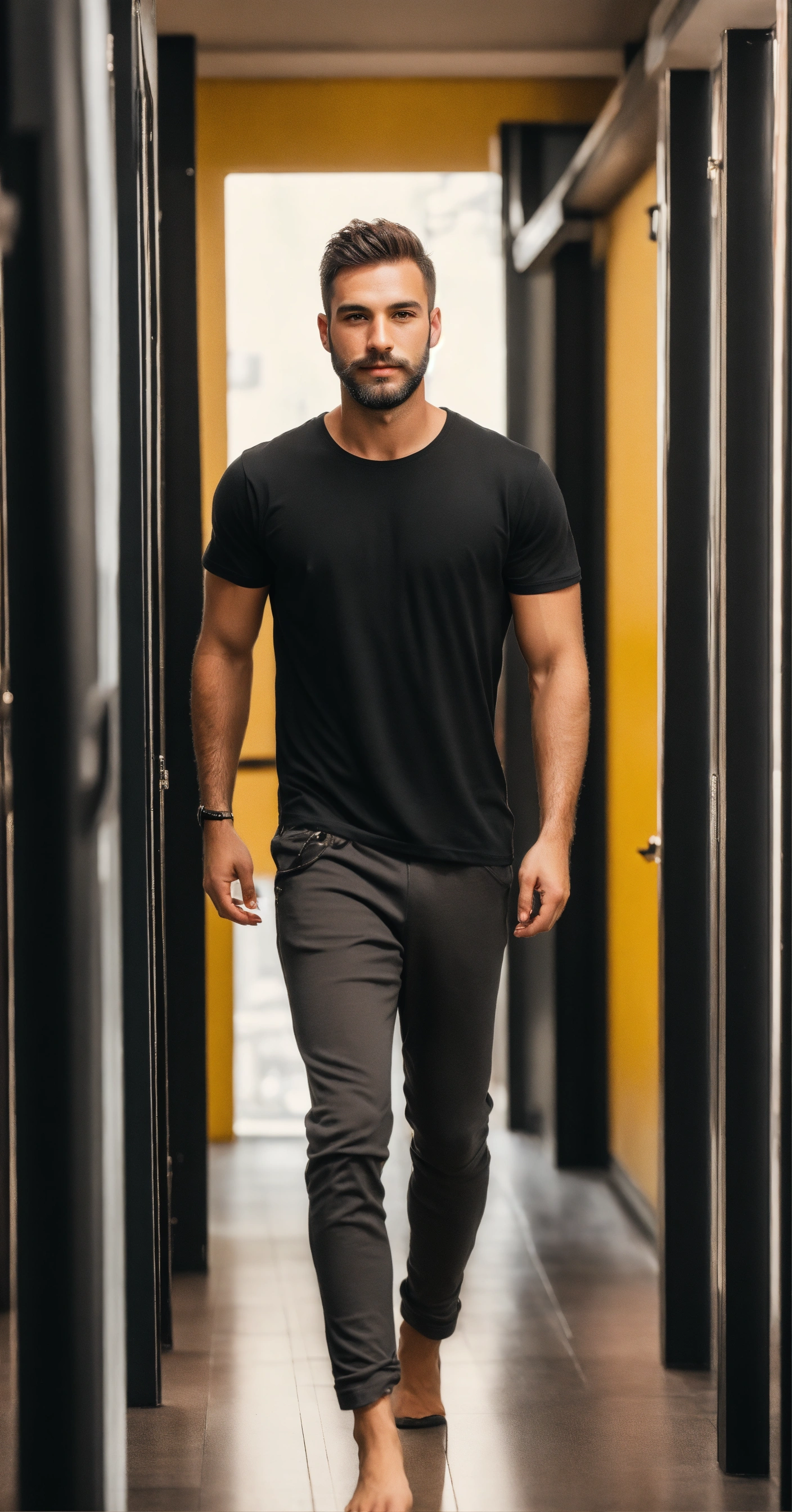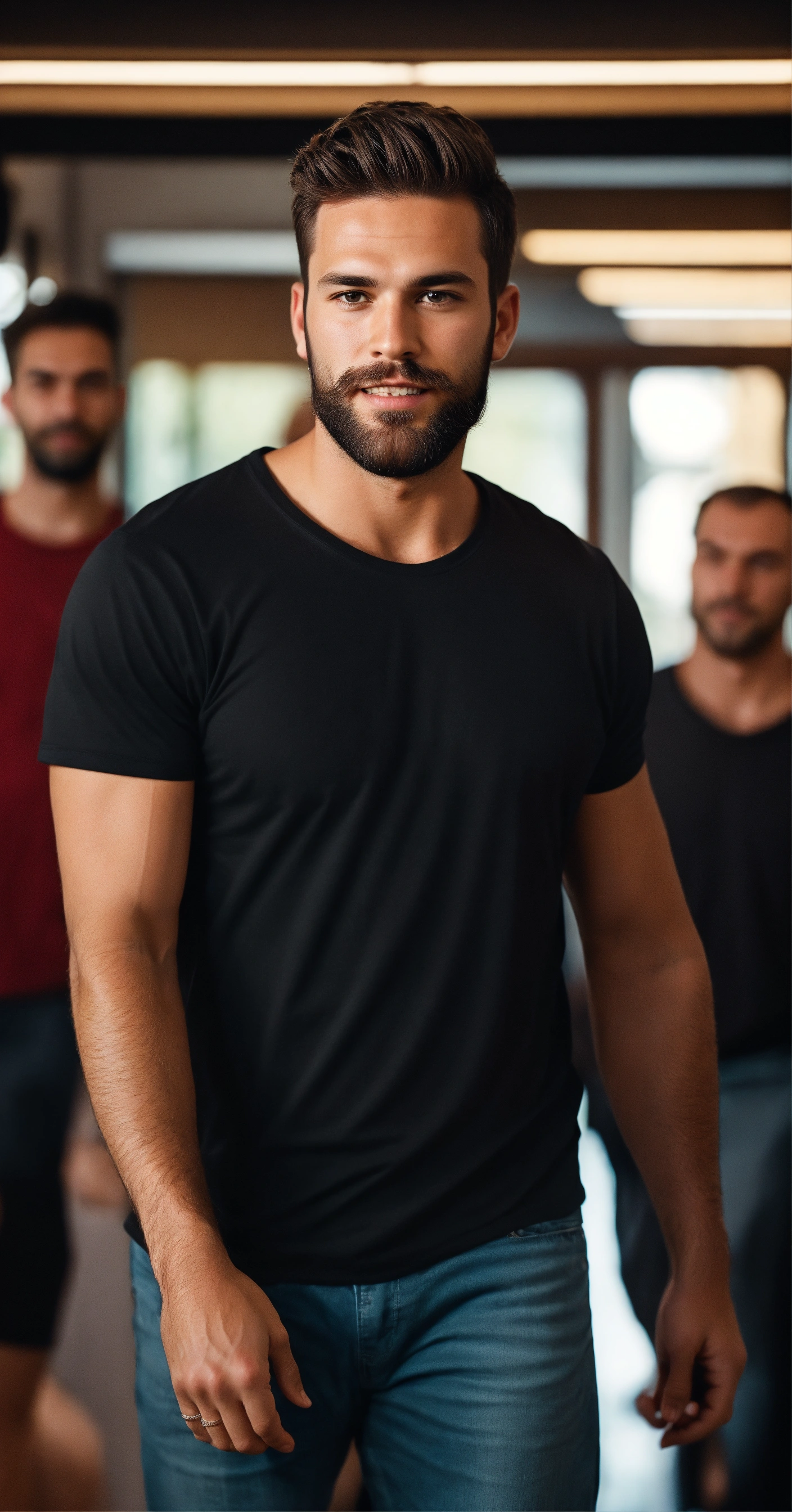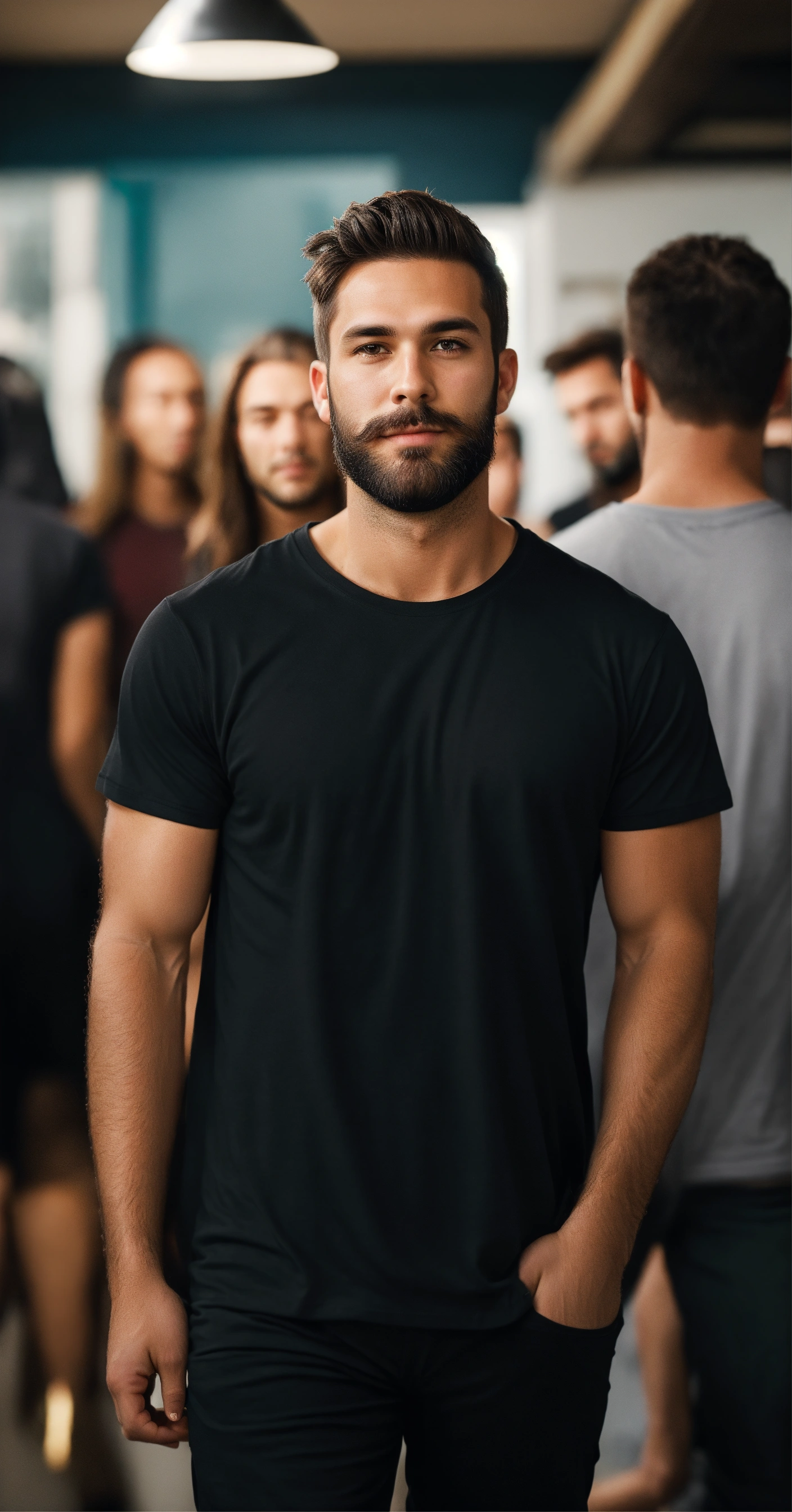Confident man with a nice stubble beard and wearing a black t shirt walking into a room full of people as they all turn to look at him