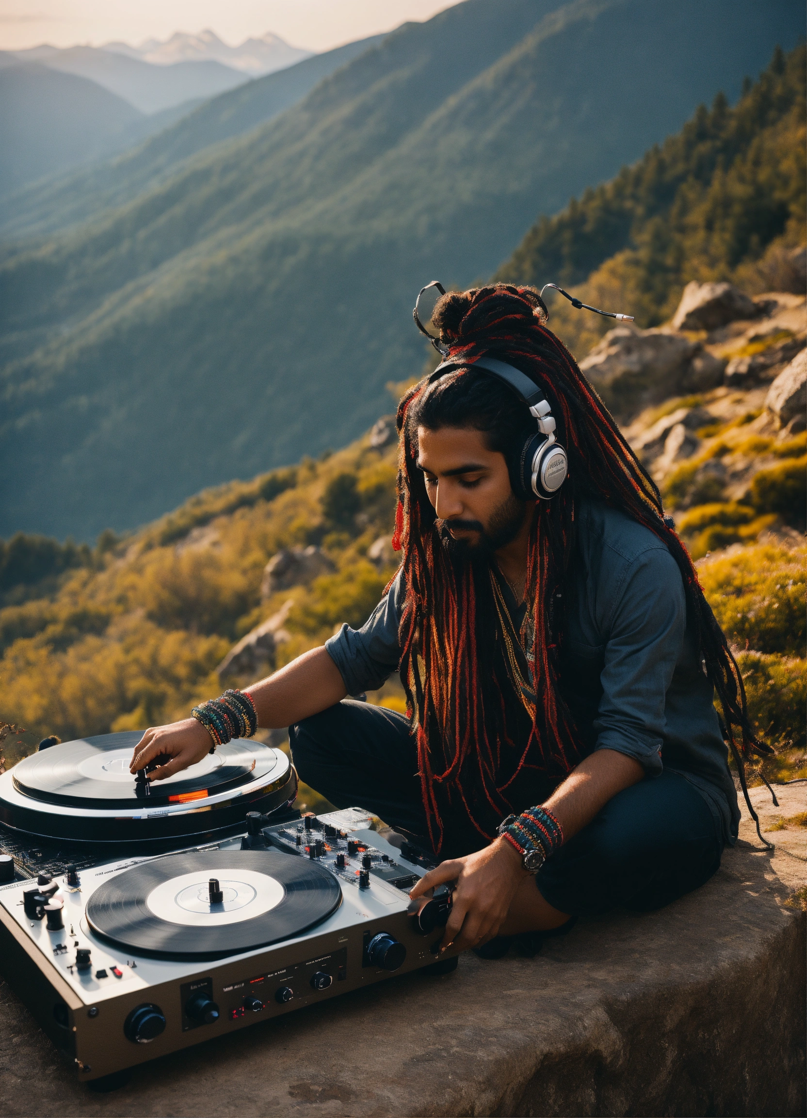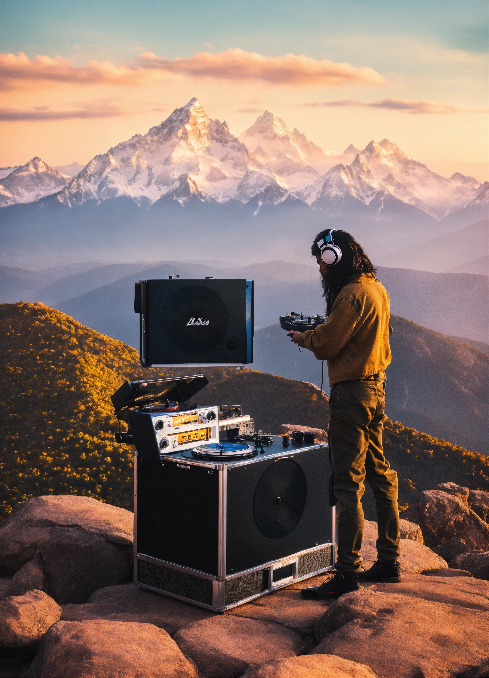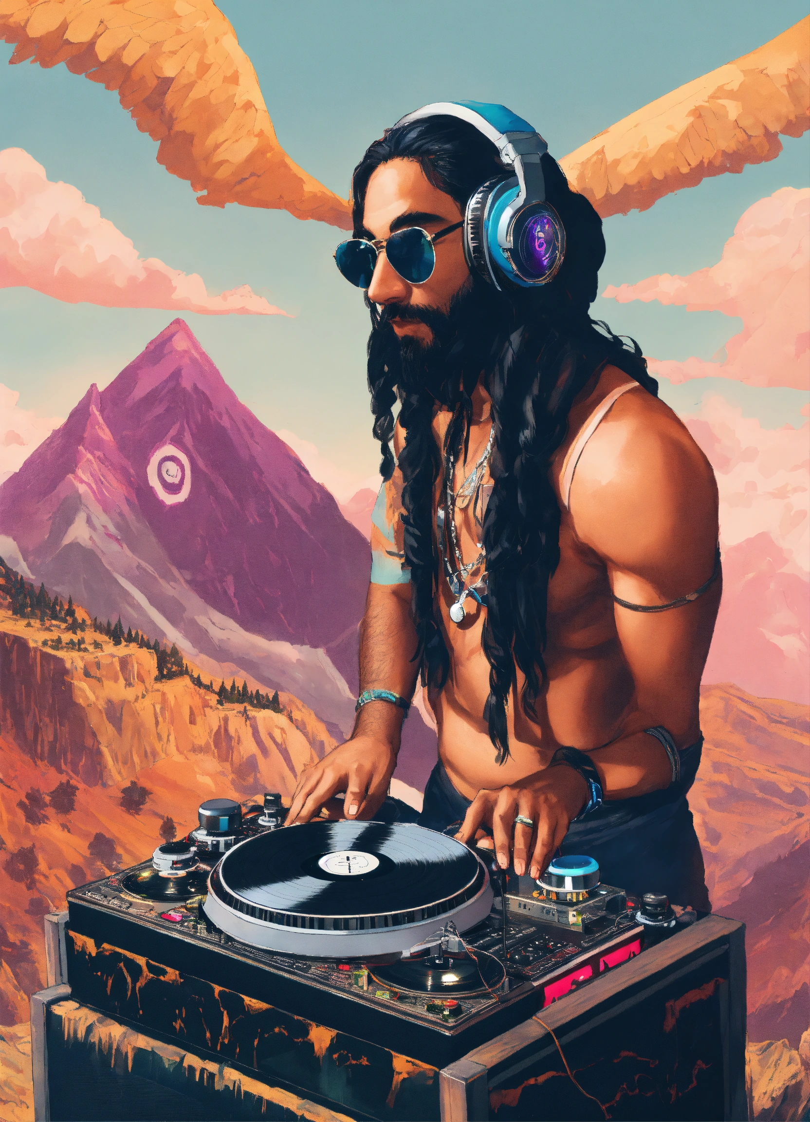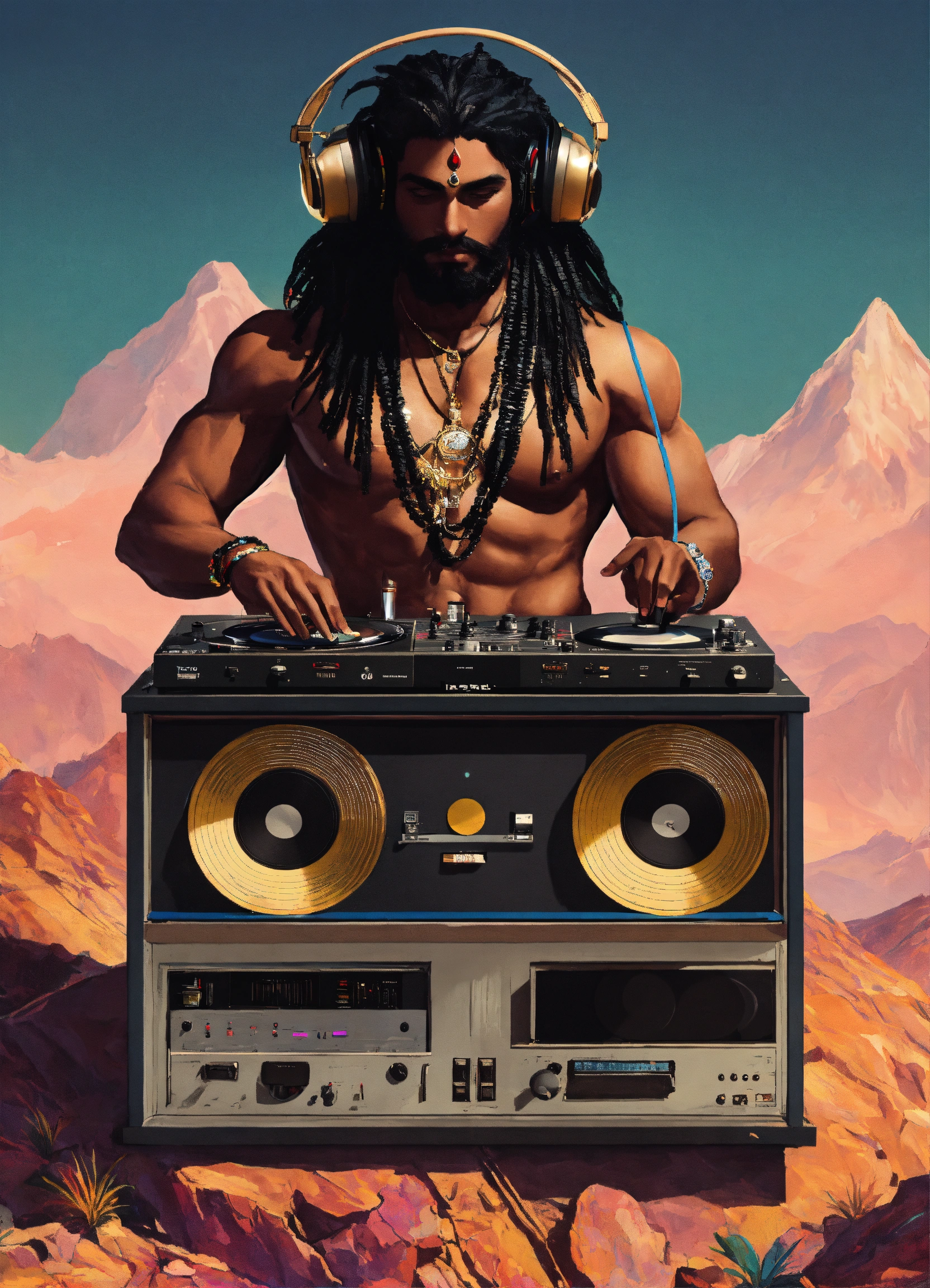 Shiva playing a vinyl player on a mountaintop with a dj turntable, and massive sound system speakers.