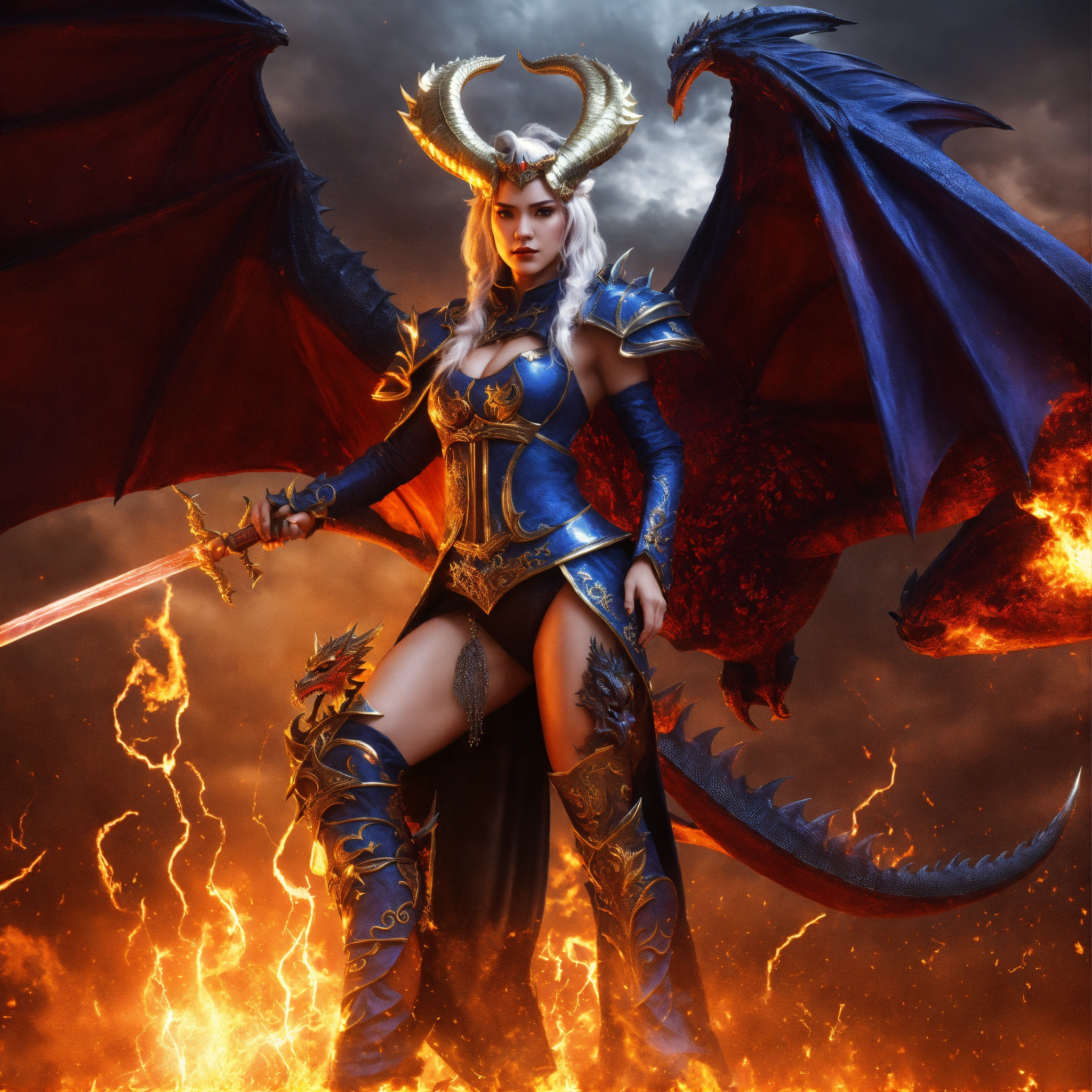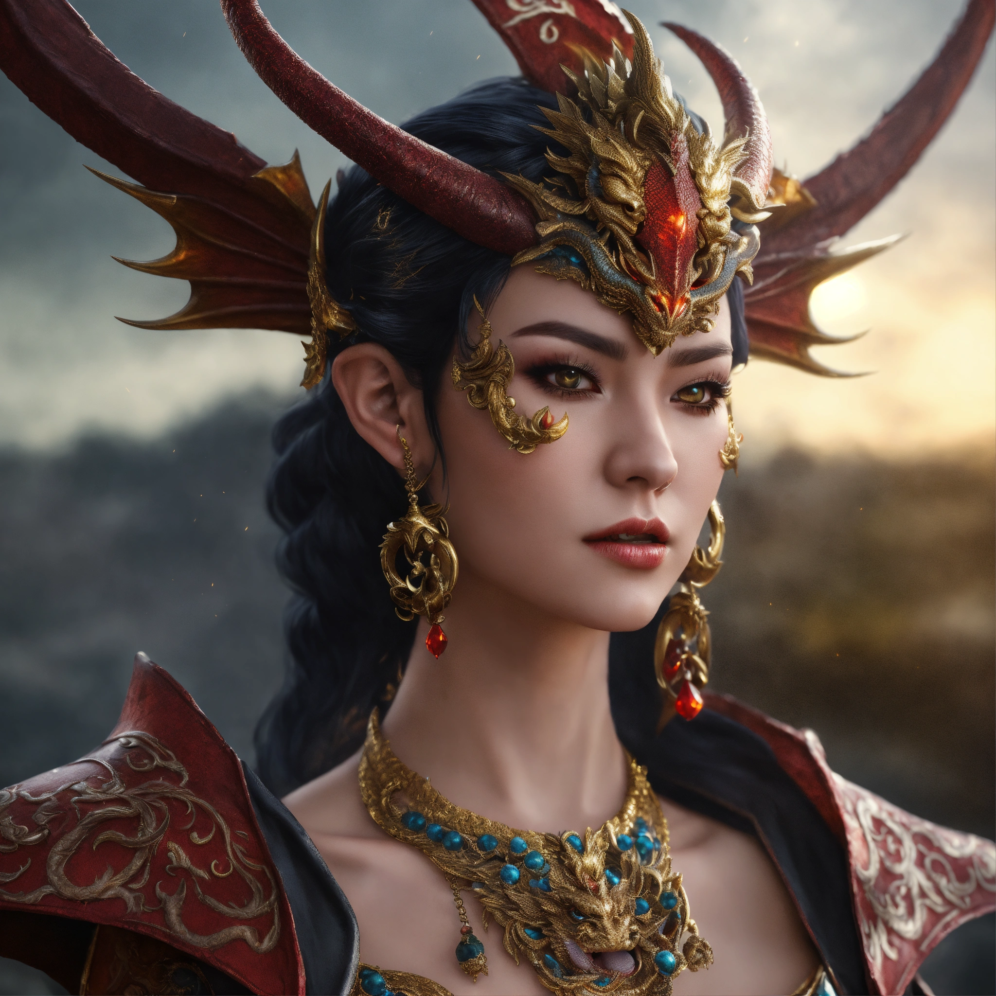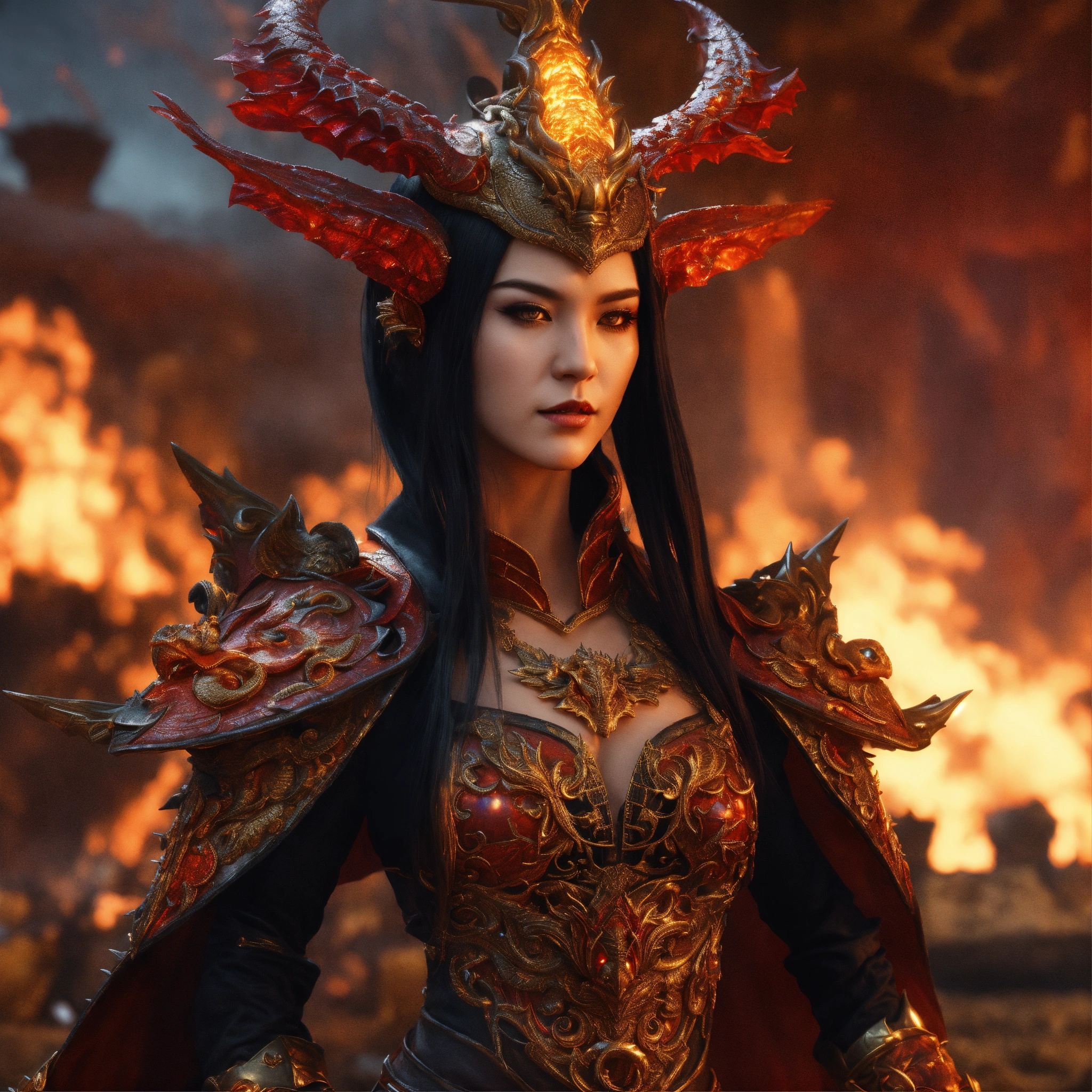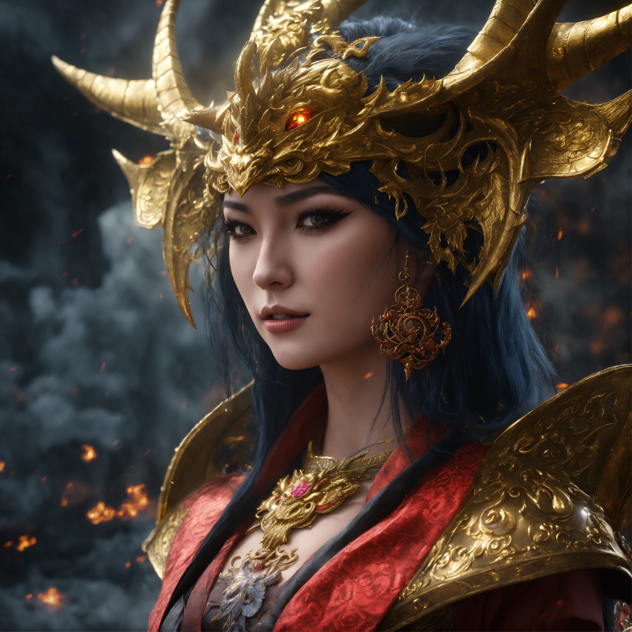 Antagonist young malevolent empress age 24 with short horns and elaborate costume, backgrounds like hell, dragon effects, 3d, 32k, photorealistic and details, storm effective.