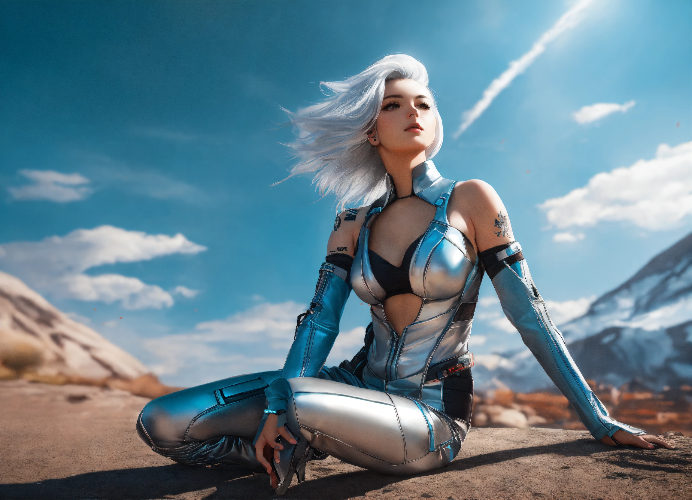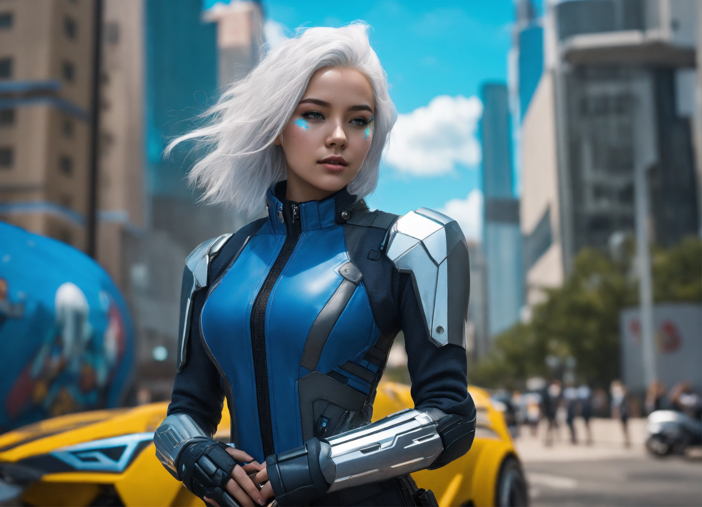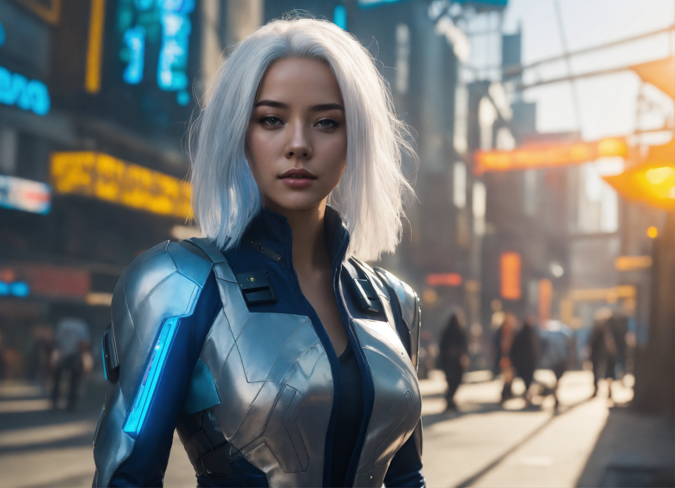 Full body high detailed photo realistic natural photo cyberpunk dream girl, futuristic, sunny weather. x-men white hair silver blue