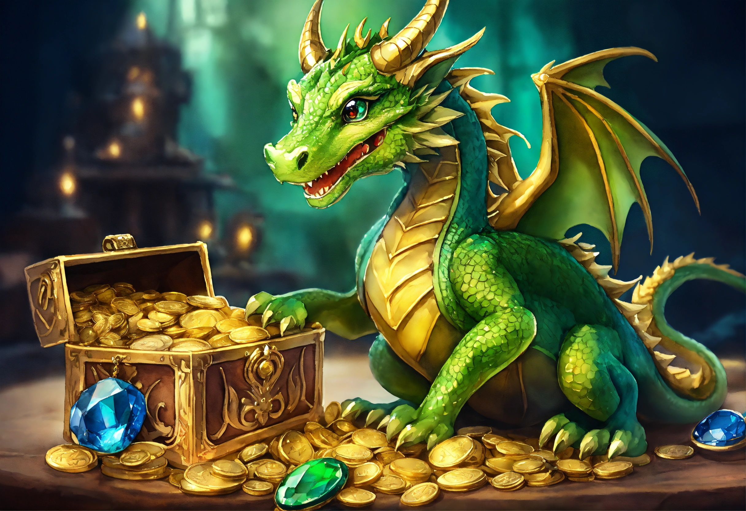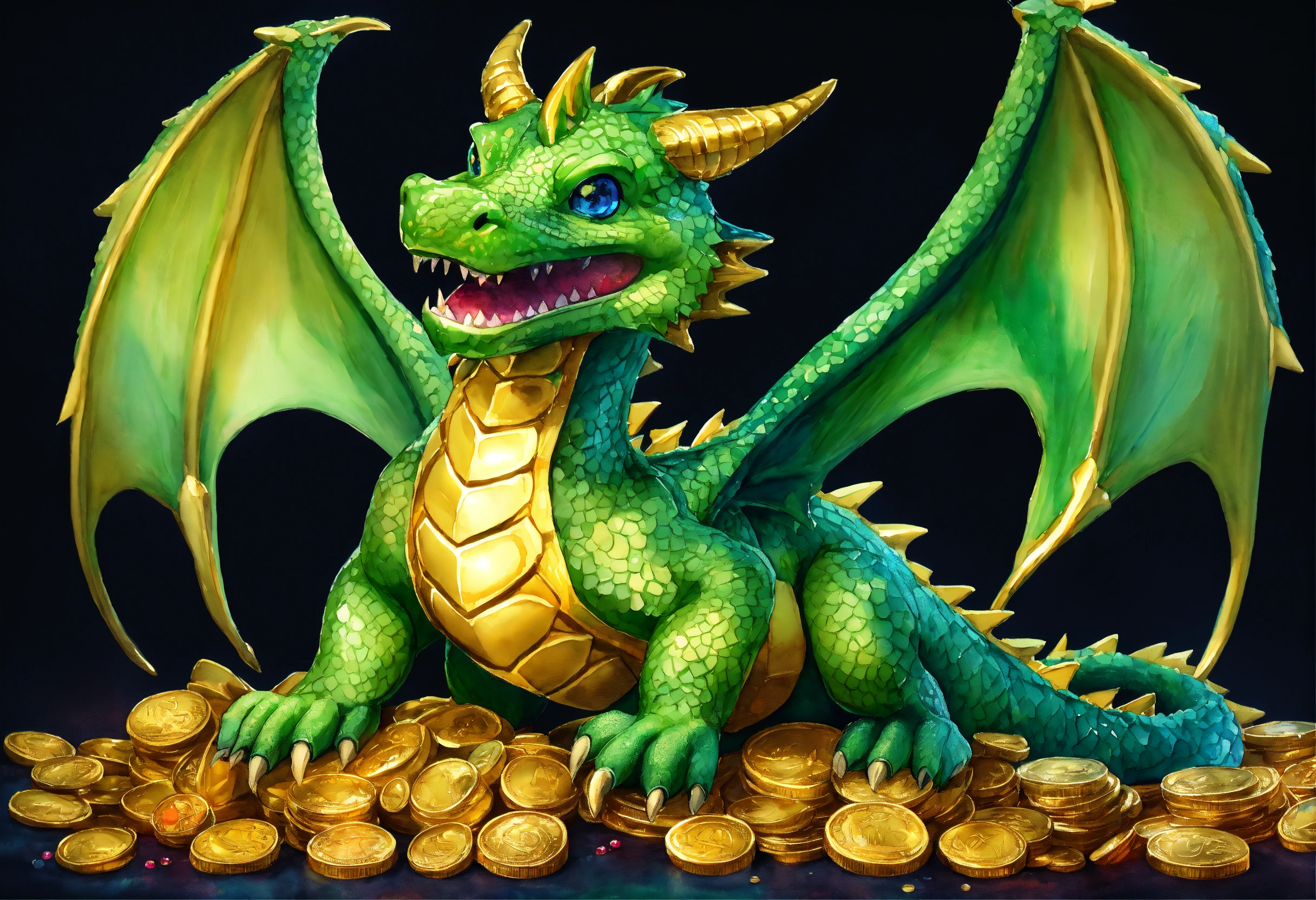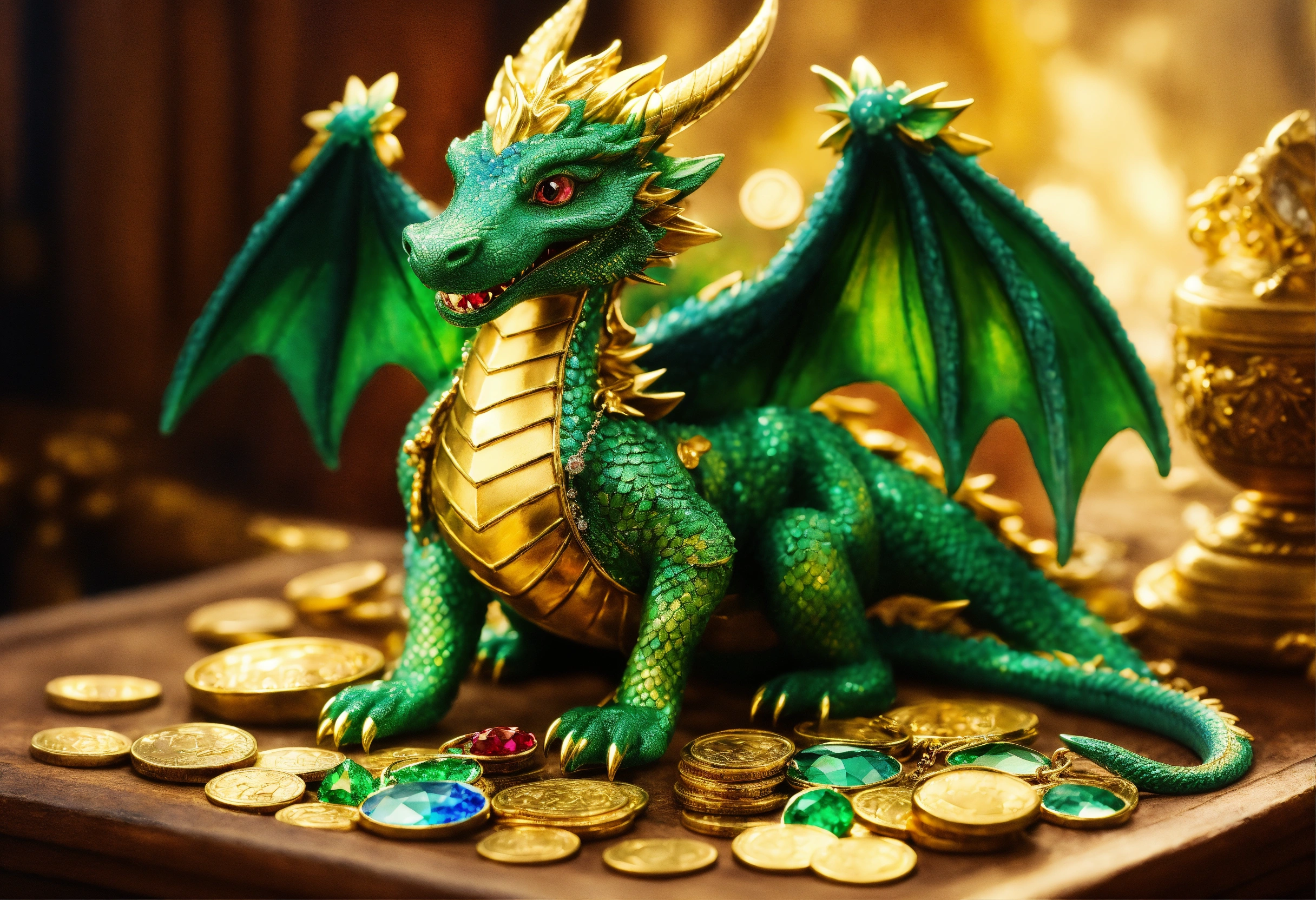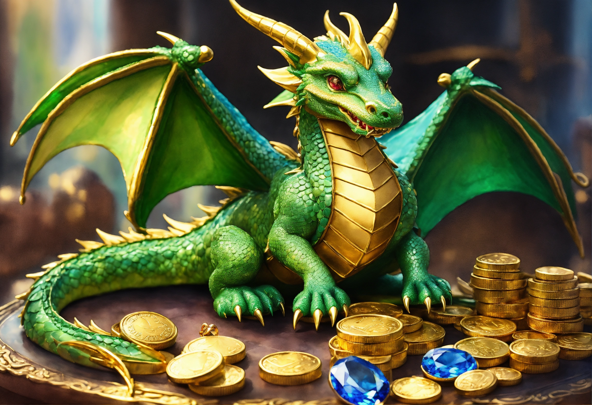Cute, adorable, pretty smiling green and gold dragon with round neck pendant, sits on a treasure trove of emeralds, gold coins, aquamarines, diamonds, rubies, sapphires, antique rings and necklaces, photorealistic drawing, watercolor painting, high detail, vivid colors, rich colors