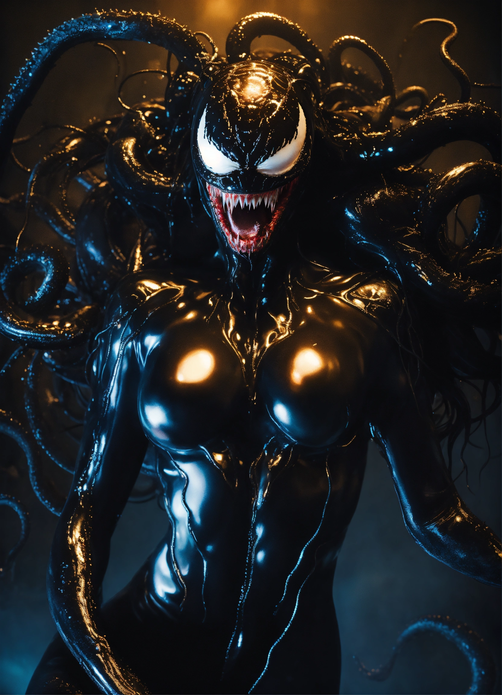 An ultrarealistic full body photograph of woman venom symbiote, laying in dark black liquid with tentacles, long hair, evil smile, evil glowing eyes, venom symbiote on skin, venom symbiote, 8k