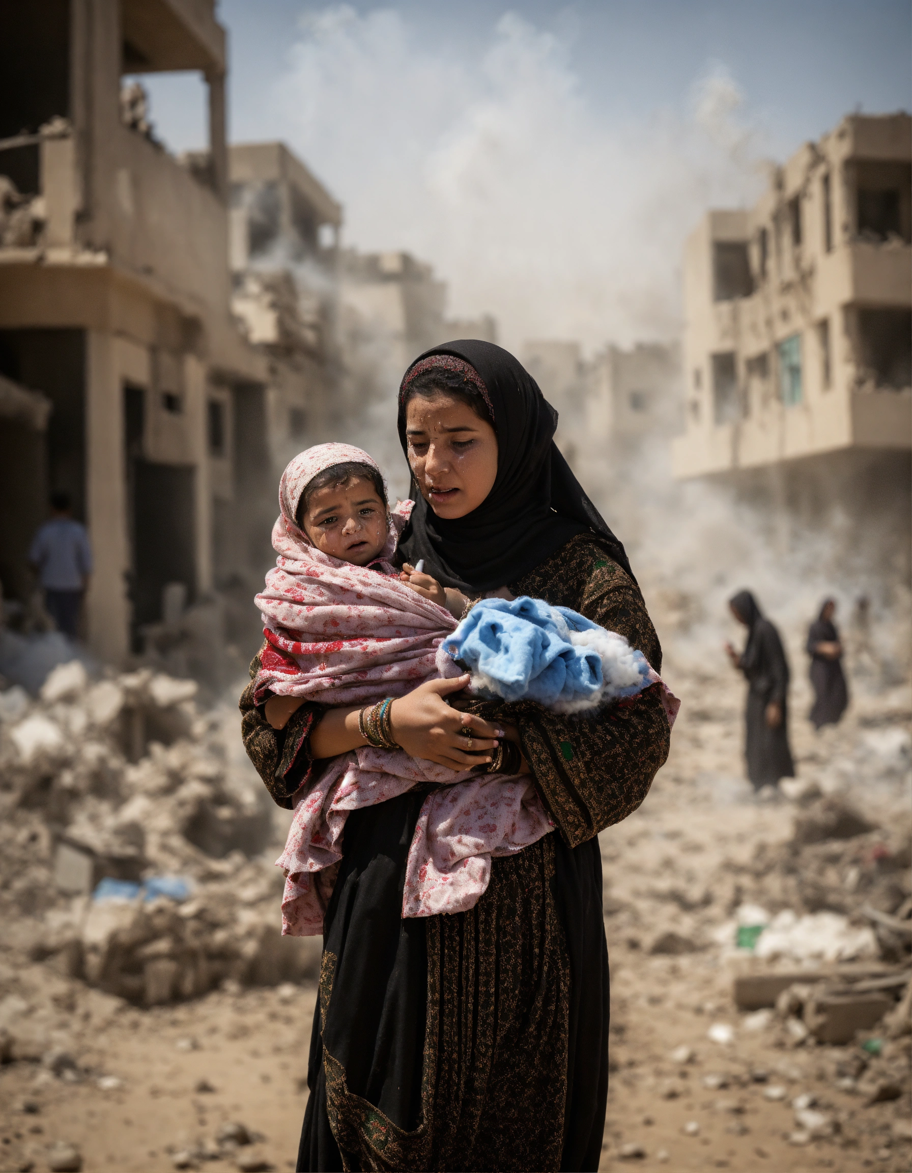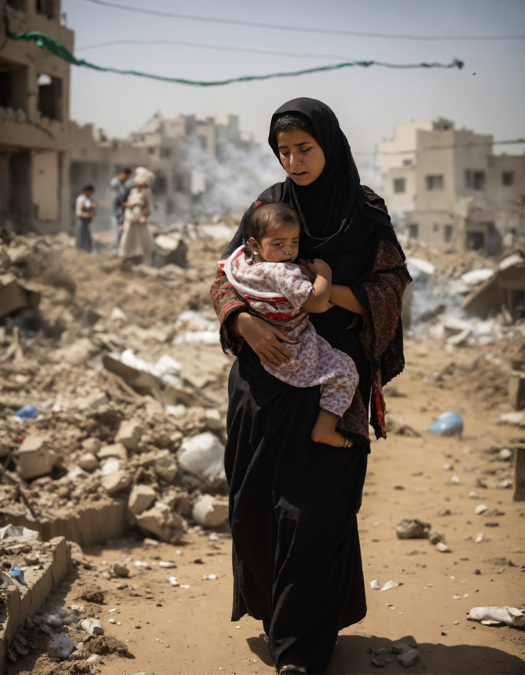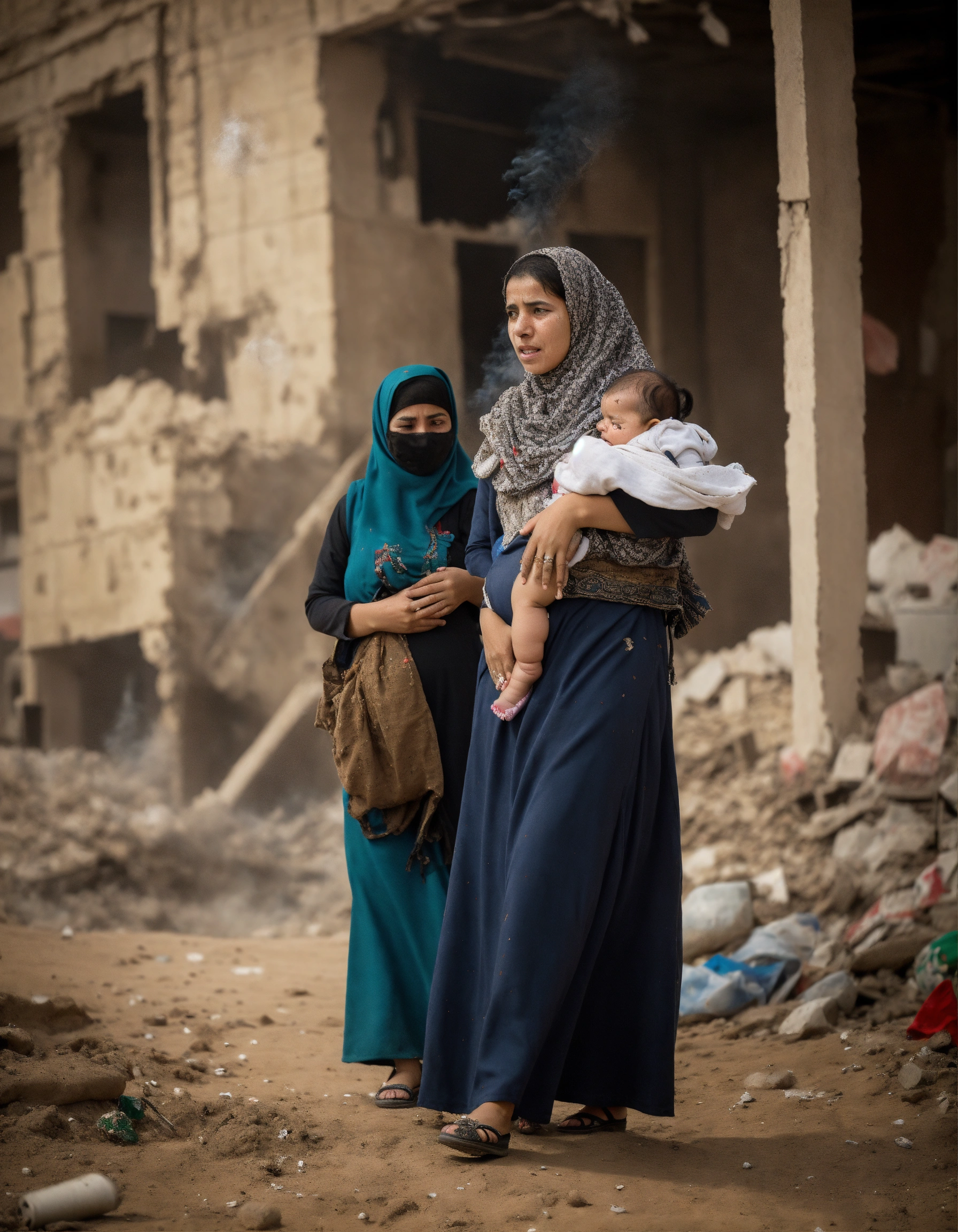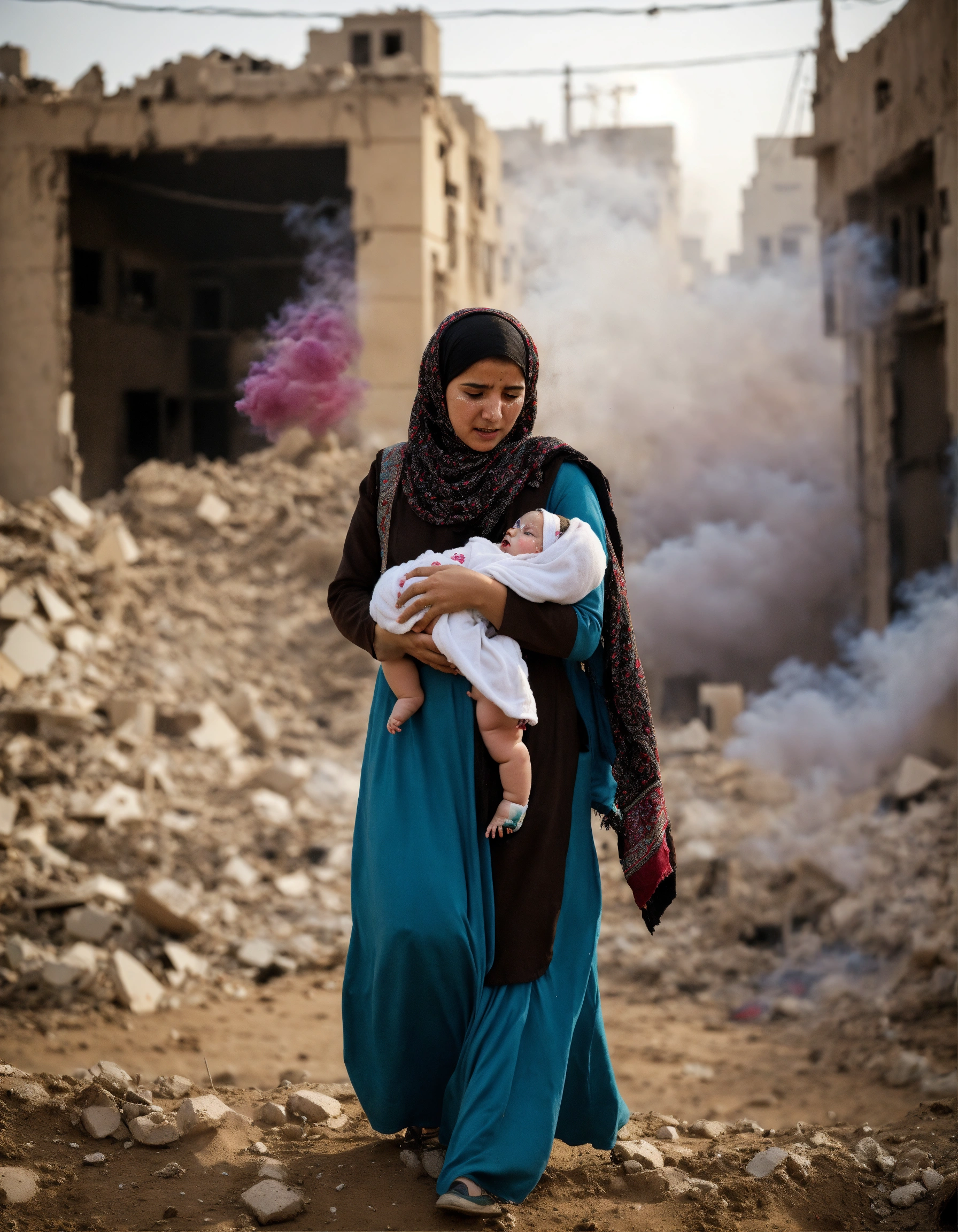 Gaza, women, wearing traditional paletinian dress with dirt, carrying a crying baby, in background ruined buildings, smoke after bombs. use a canon eos 5d mark iv dslr camera with an ef 50mm f/1.8 stm lens for a high-resolution, detailed image. --ar 916 --v 5.2