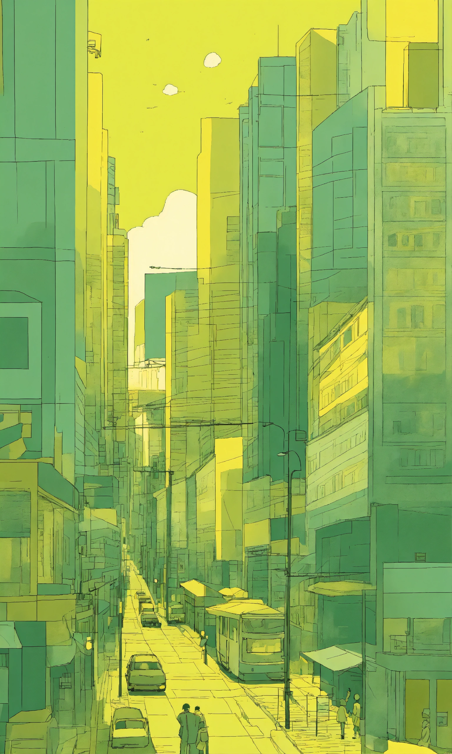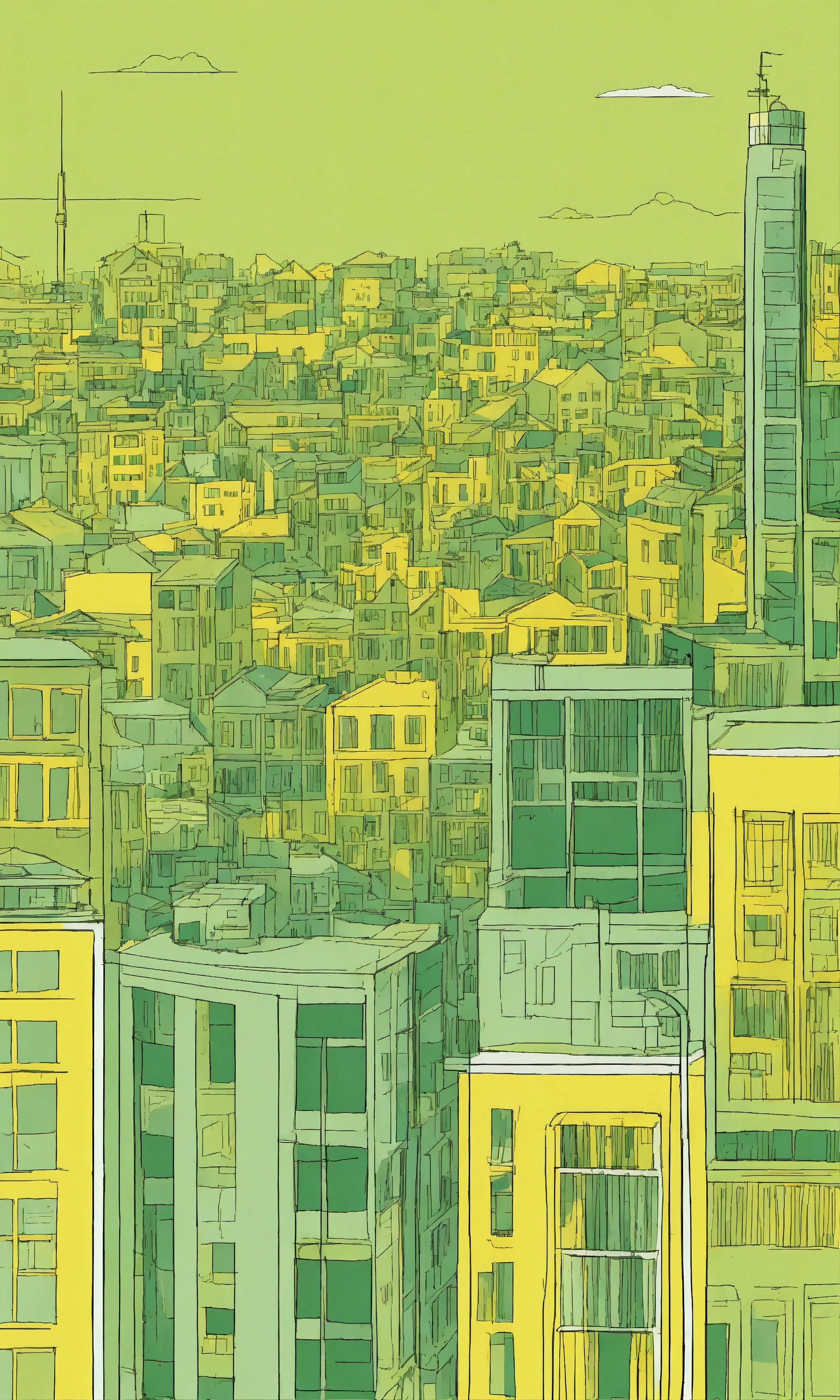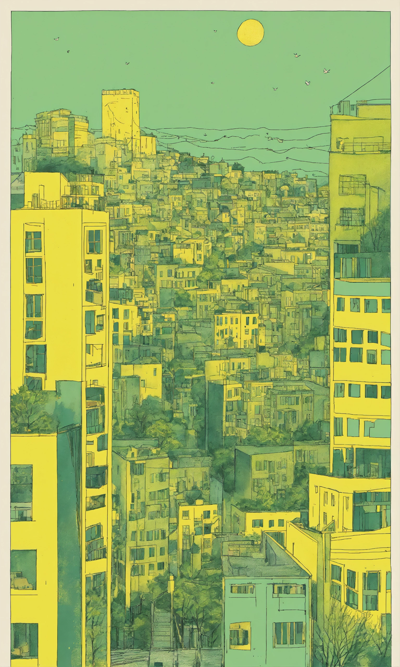City drawing that could be used for a greetings card risograph muted green and yellow colours