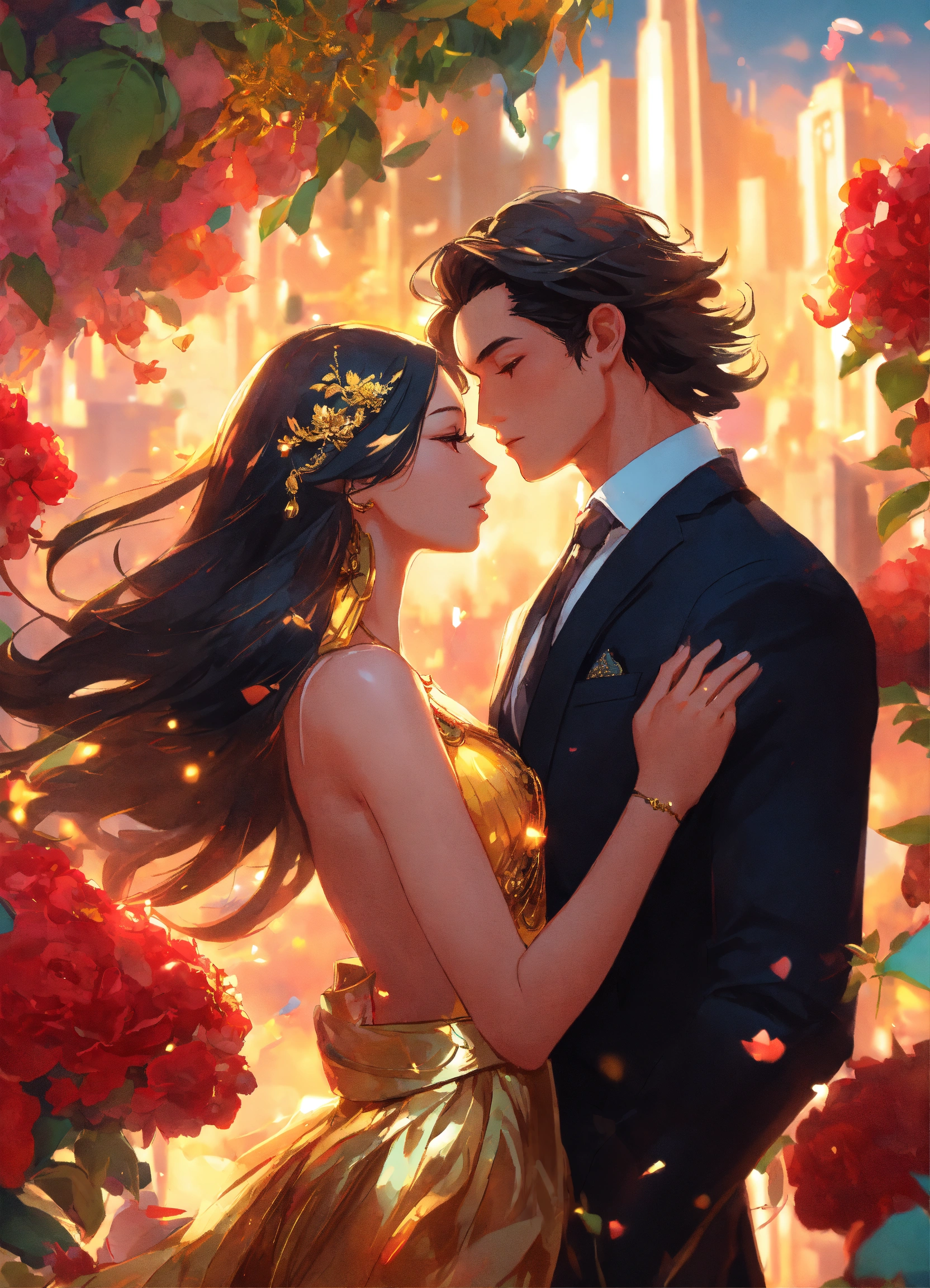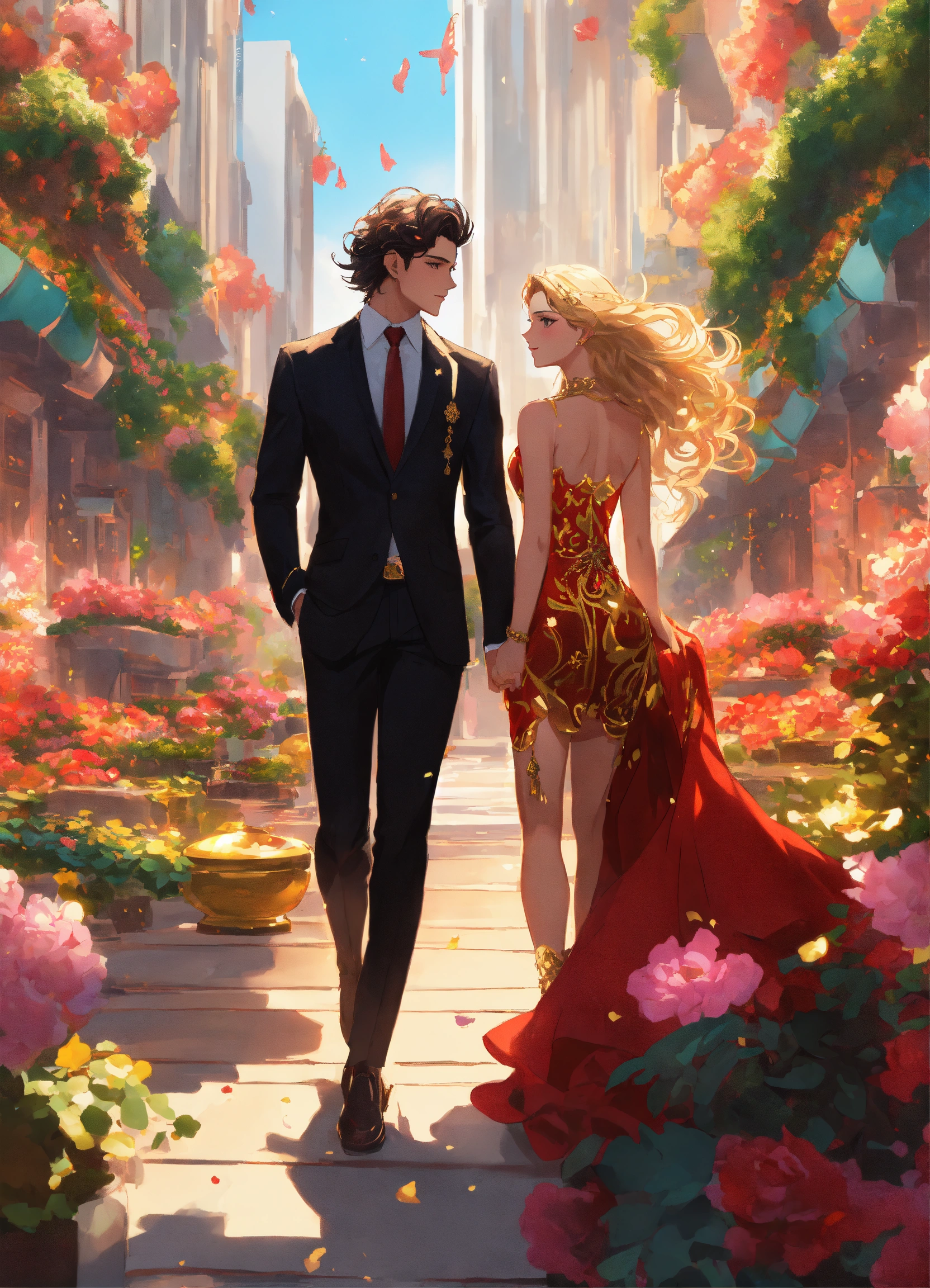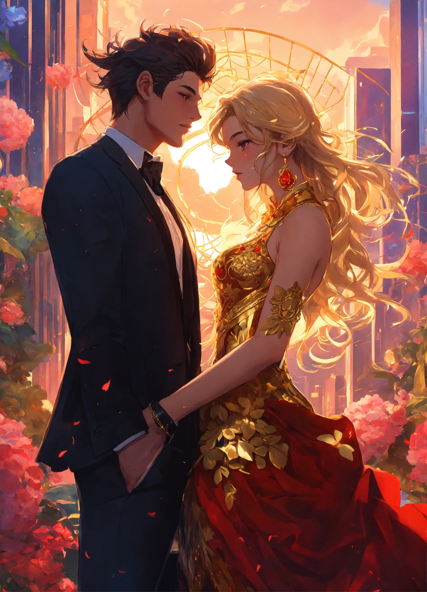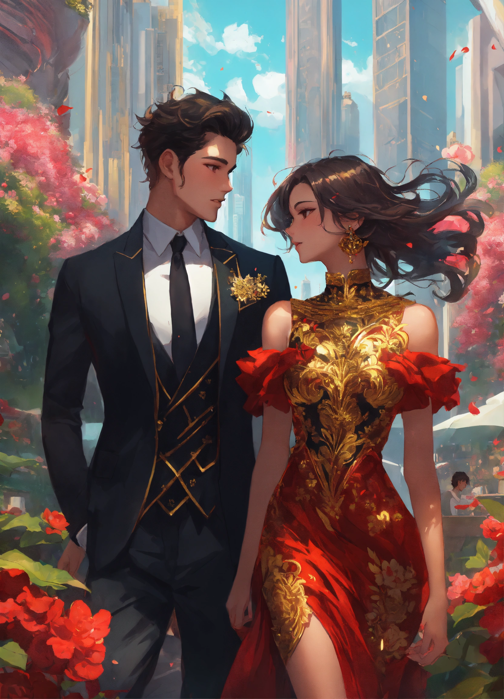 Illustration of beautiful city of towering skyscrapers, islands, vibrant colors, fair skin, the young man wears a intricate black suit with gold ornaments, has wavy black tousled hair, the golden haired woman wears a red intricate dress with gold adornments that shows legs, maximalist, 8k photo, animestyle, by artgerm, by rossdraws, trending on artstation, garden, windy, flowers, circular perspective, romantic, facing each other