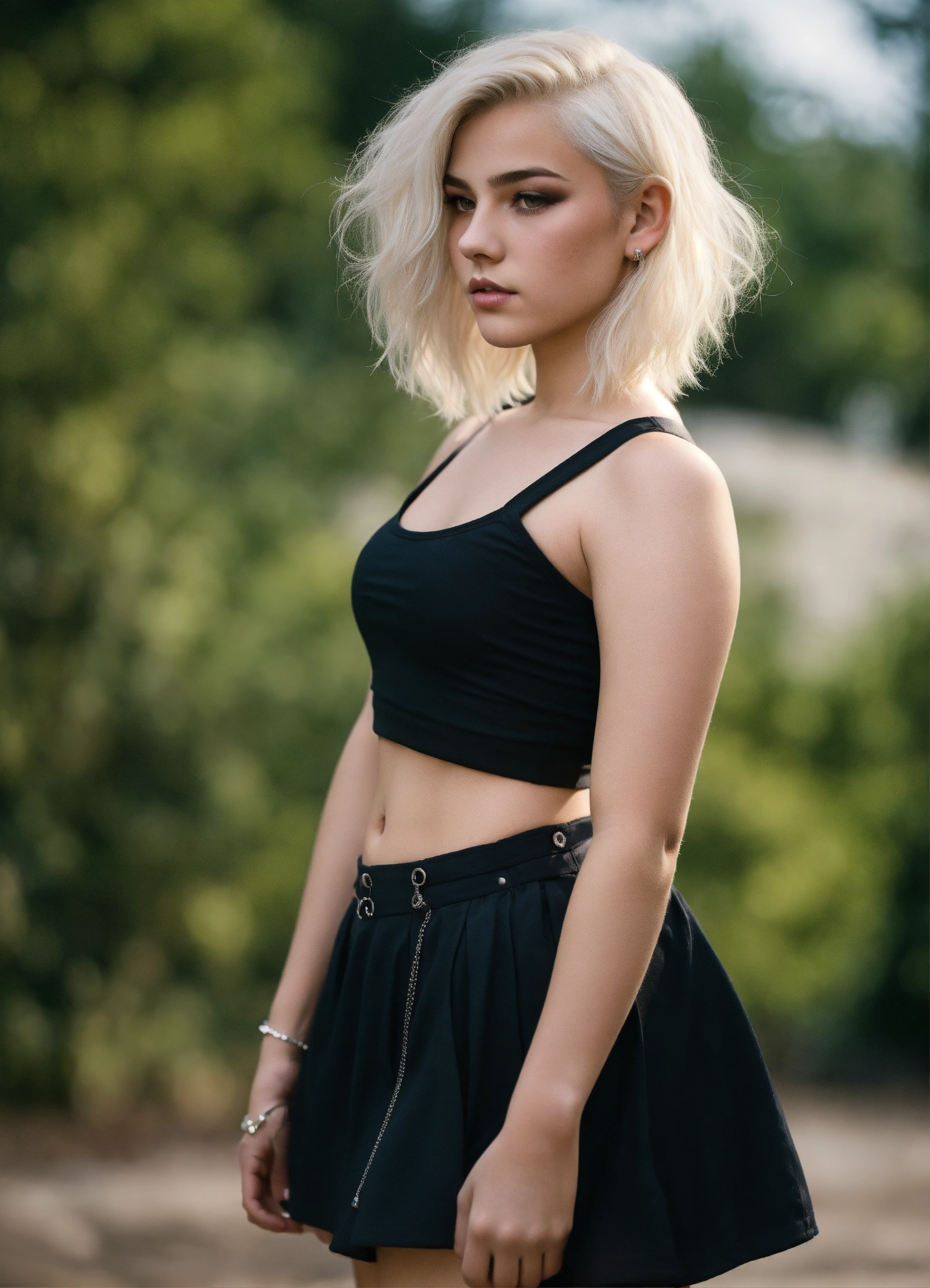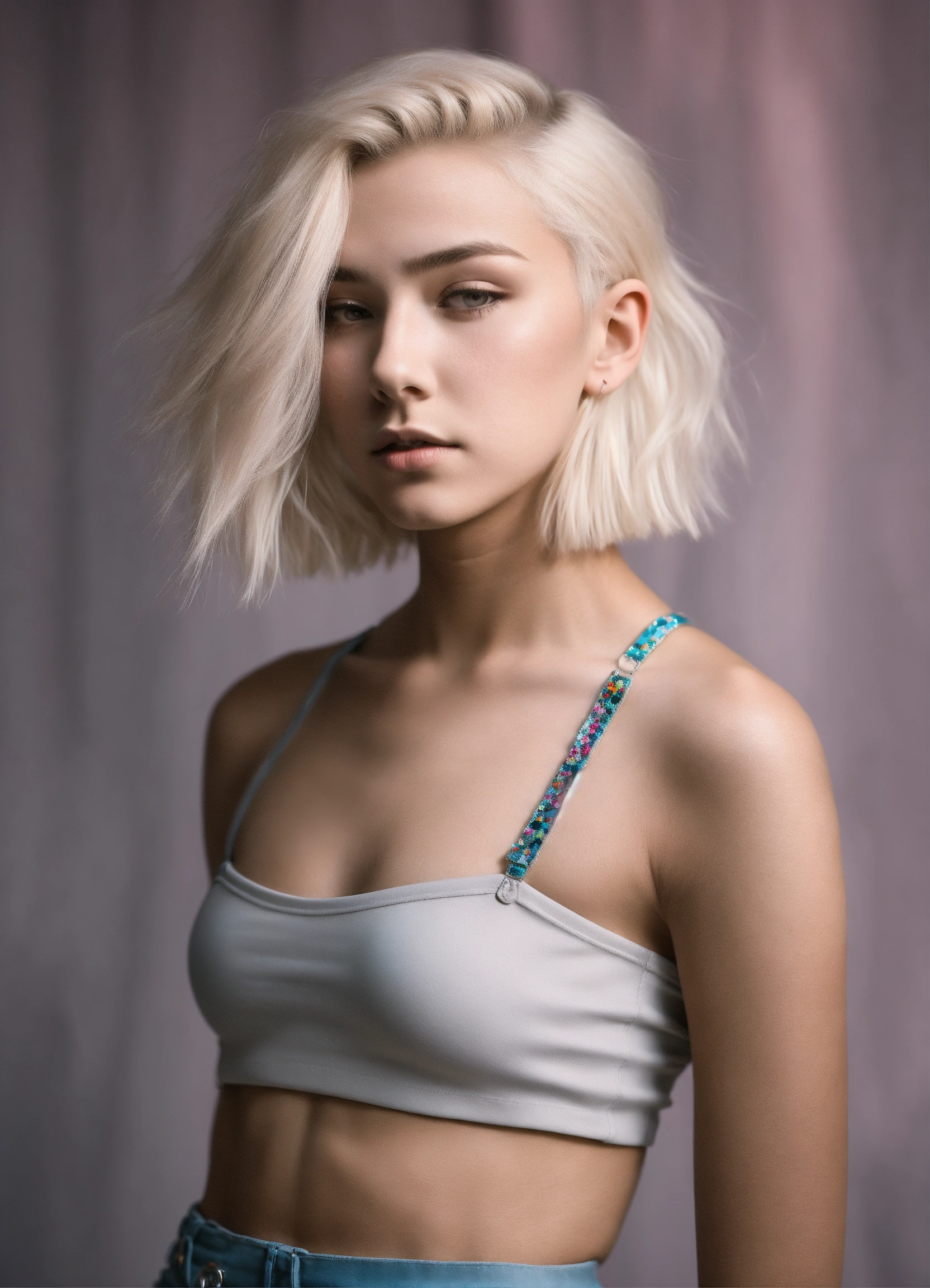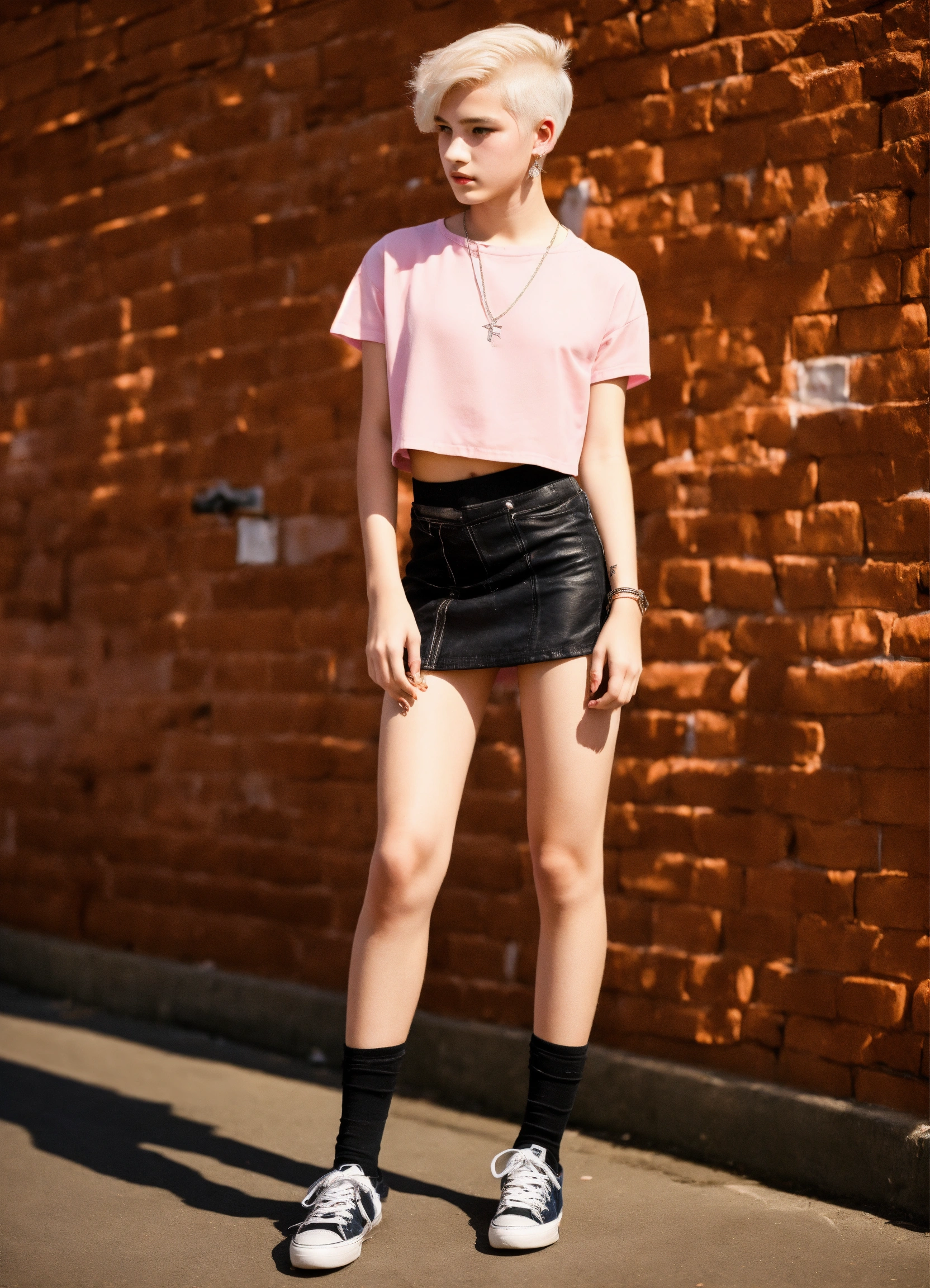 A slender genderqueer 15-year-old boy donning a crop top and miniskirt, feminine features, curvacious silhouette, graceful posture, makeup, platinum blonde hair