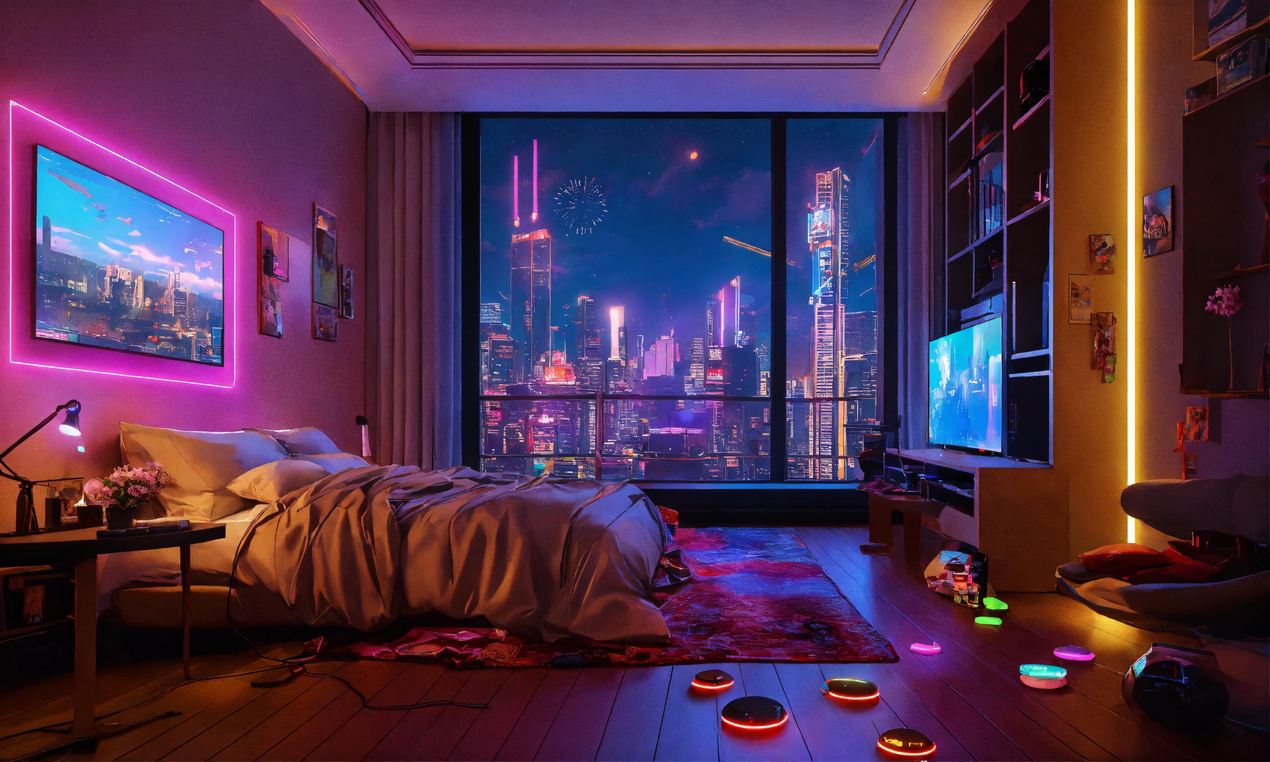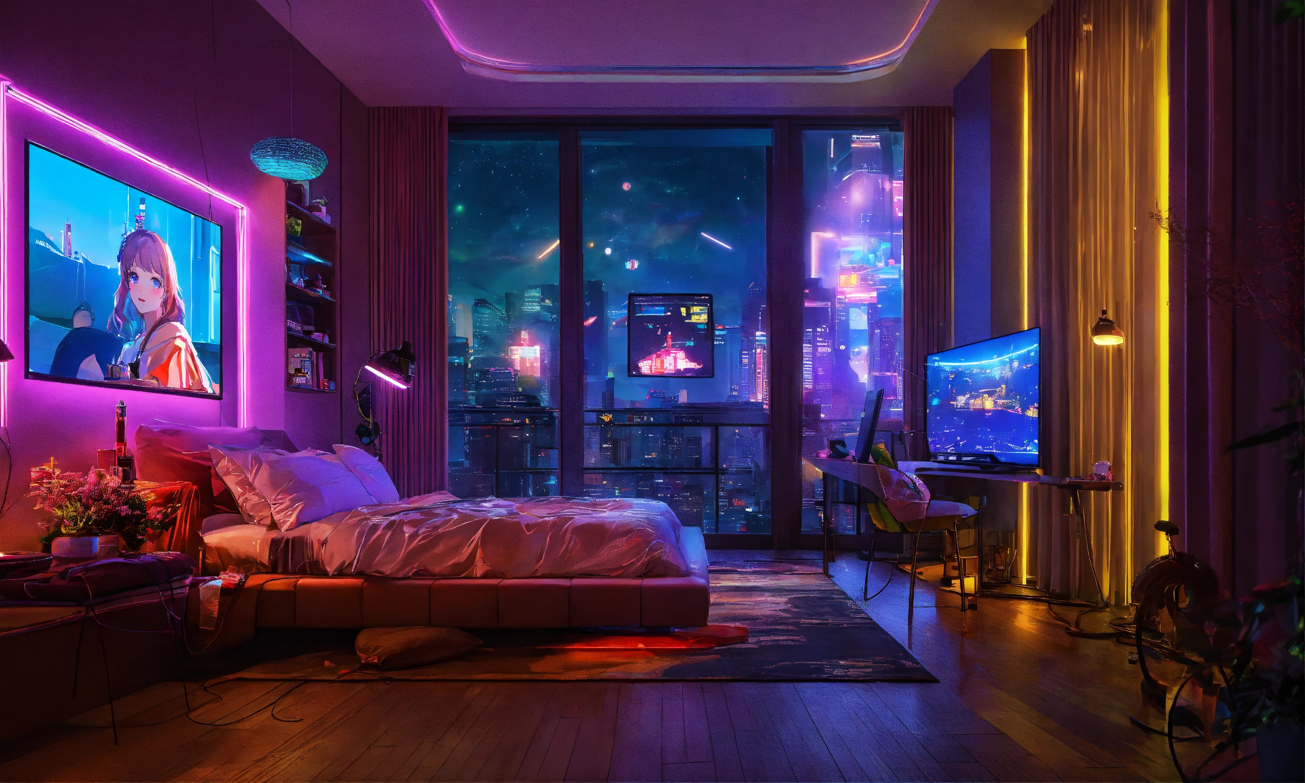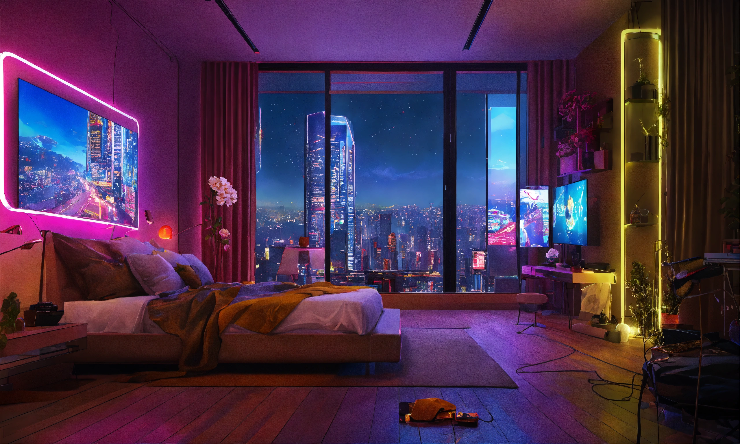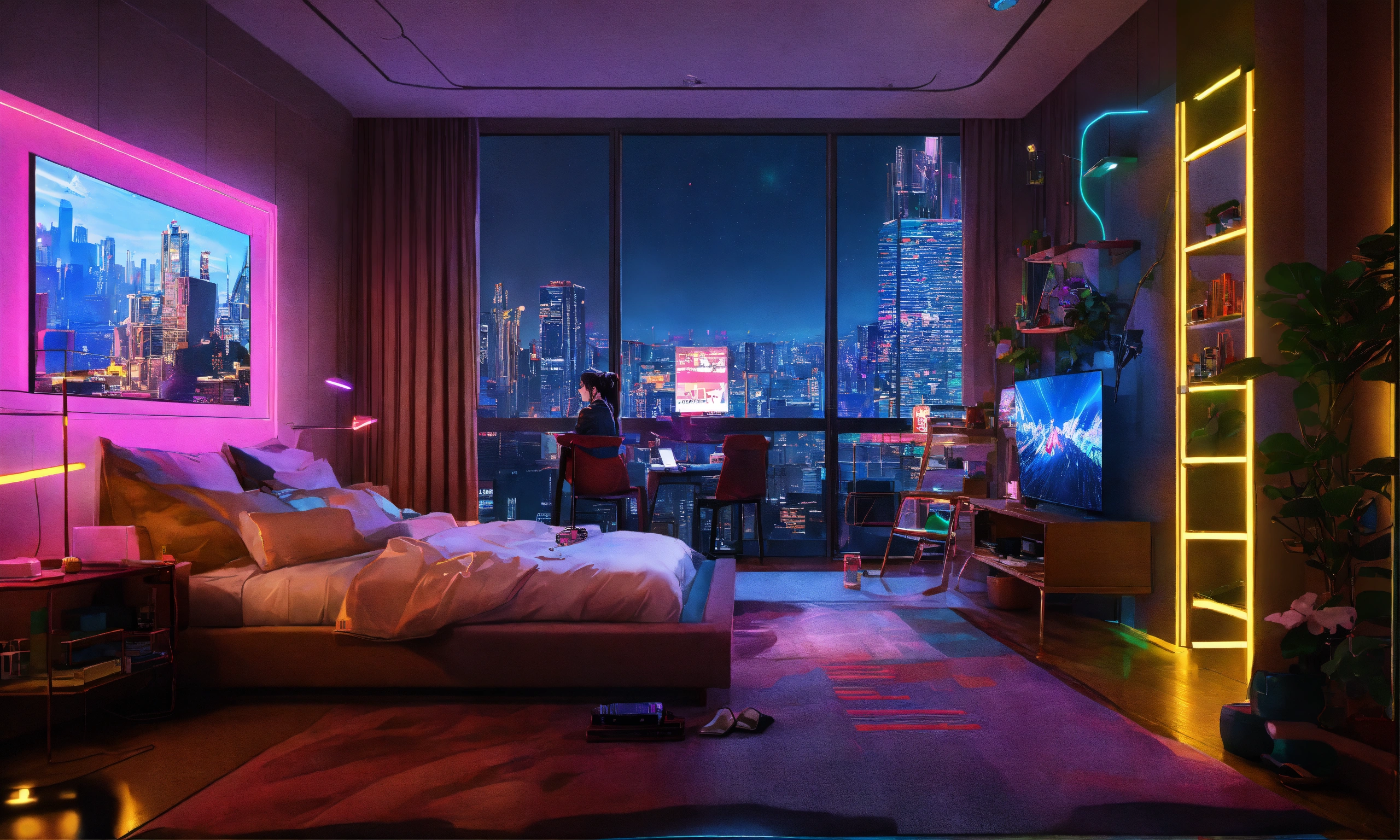 A beauty is playing games on ps5 in her bed room。 neon lights from the tall buildings lit up the night sky from the huge floor-to-ceiling windows