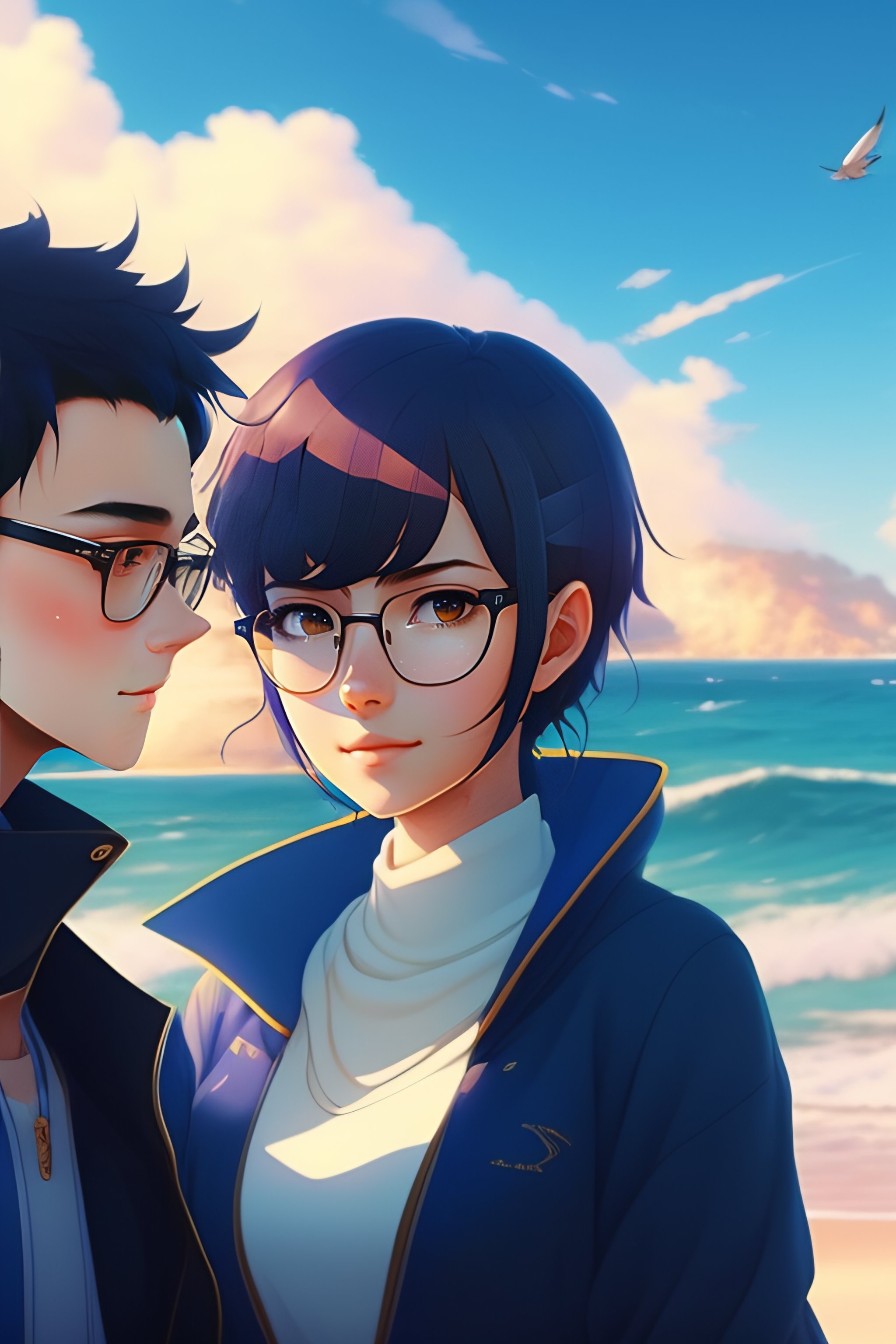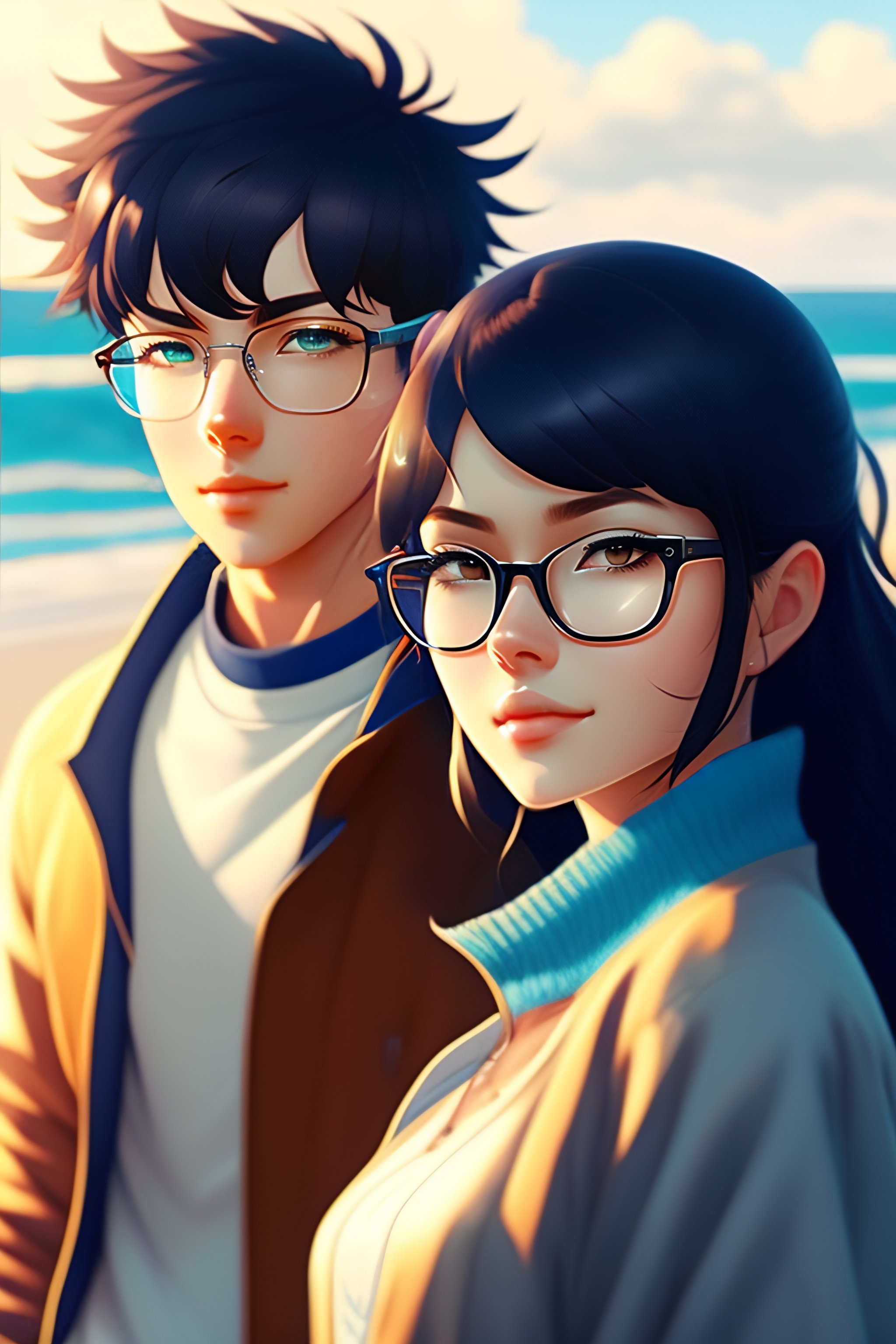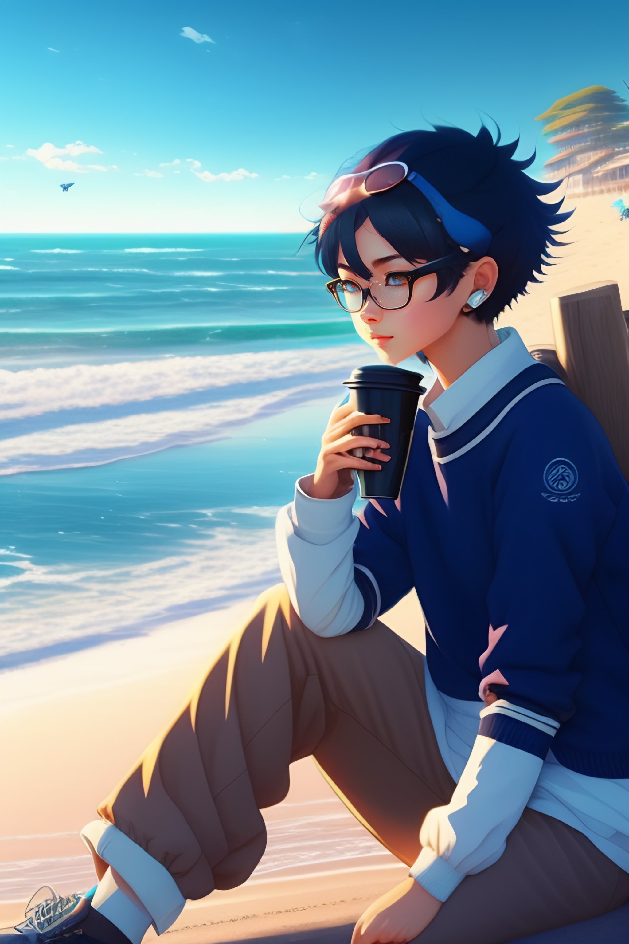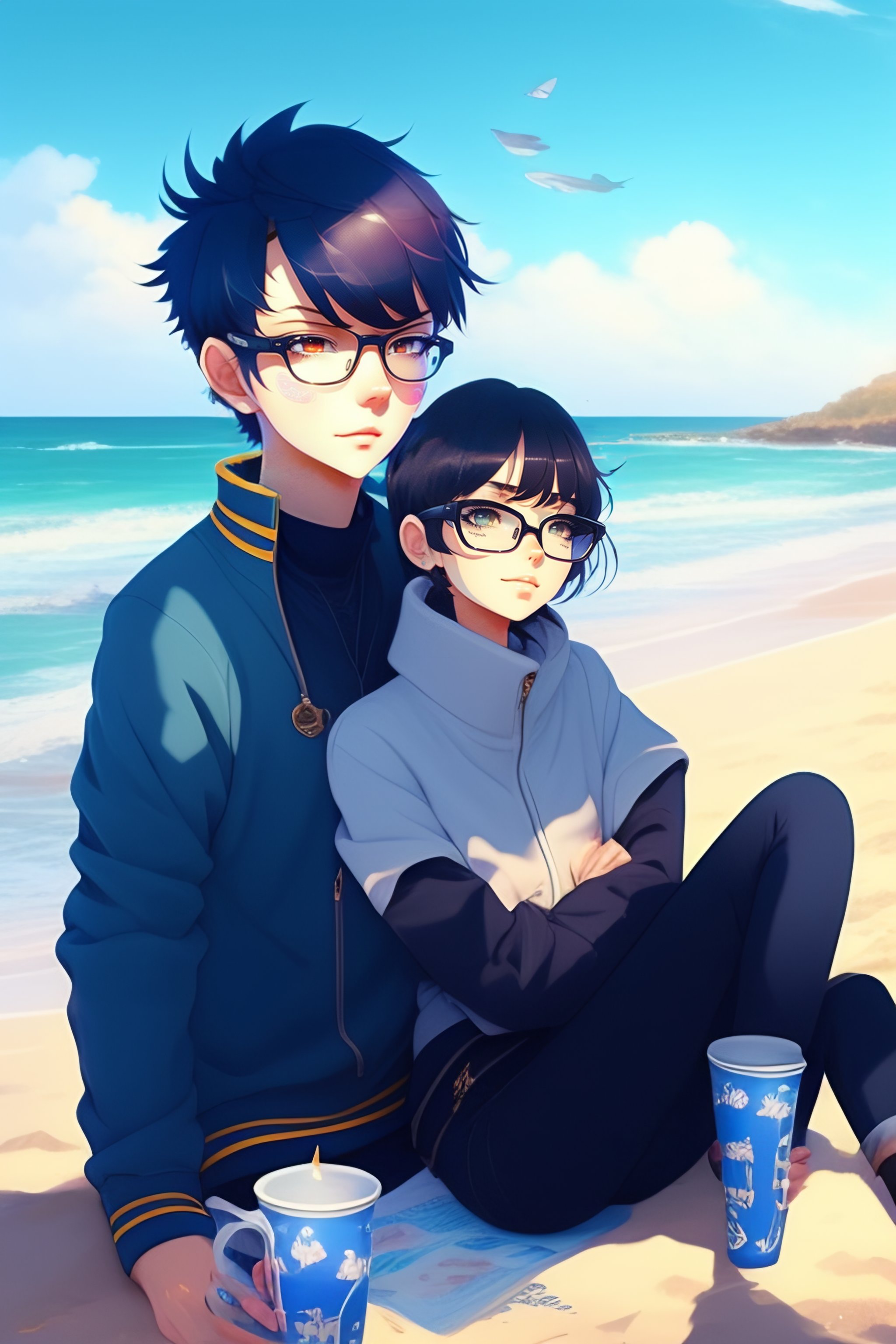 Cute girl and boy in blue sweater black hair black wayfarer glasses sitting on beach side drinking coffee with sunny background by greg rutkowski makoto shinkai kyoto animation key art feminine mid shot