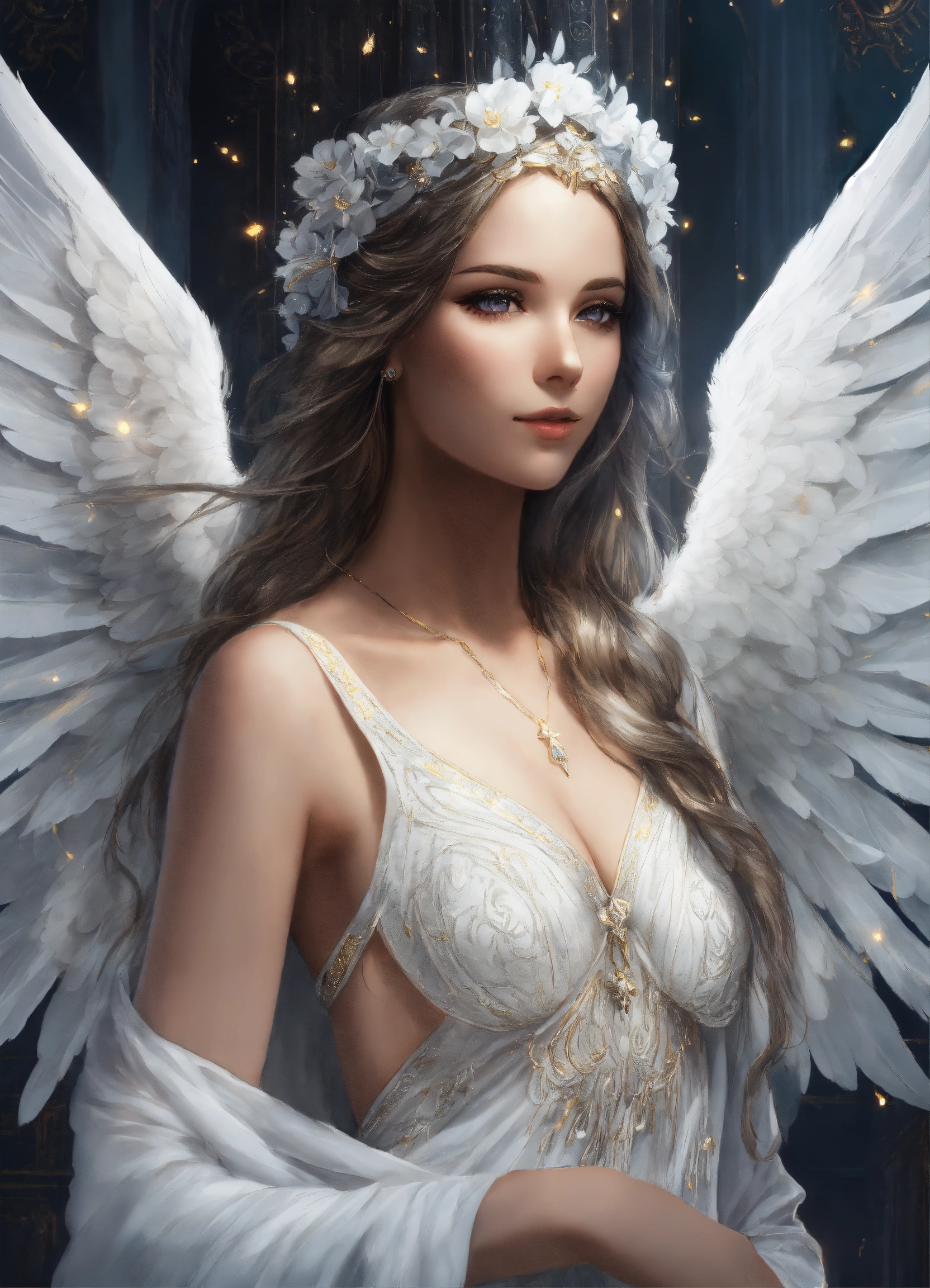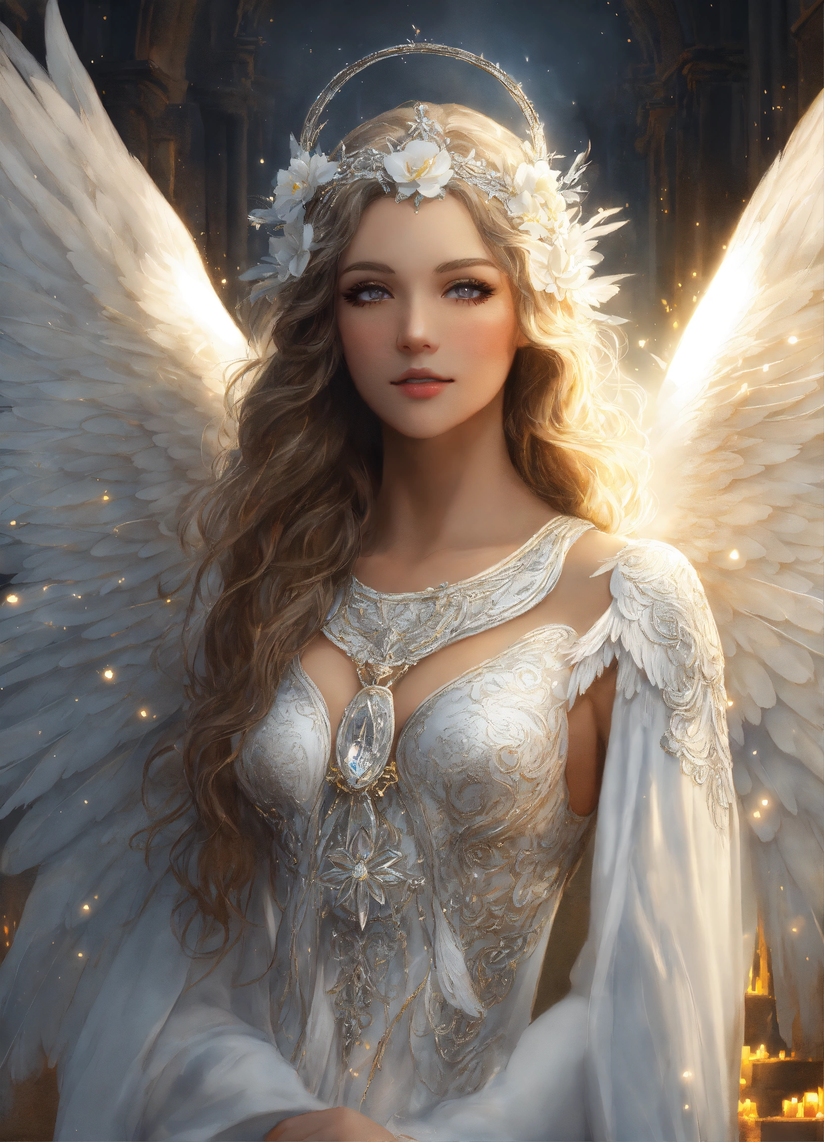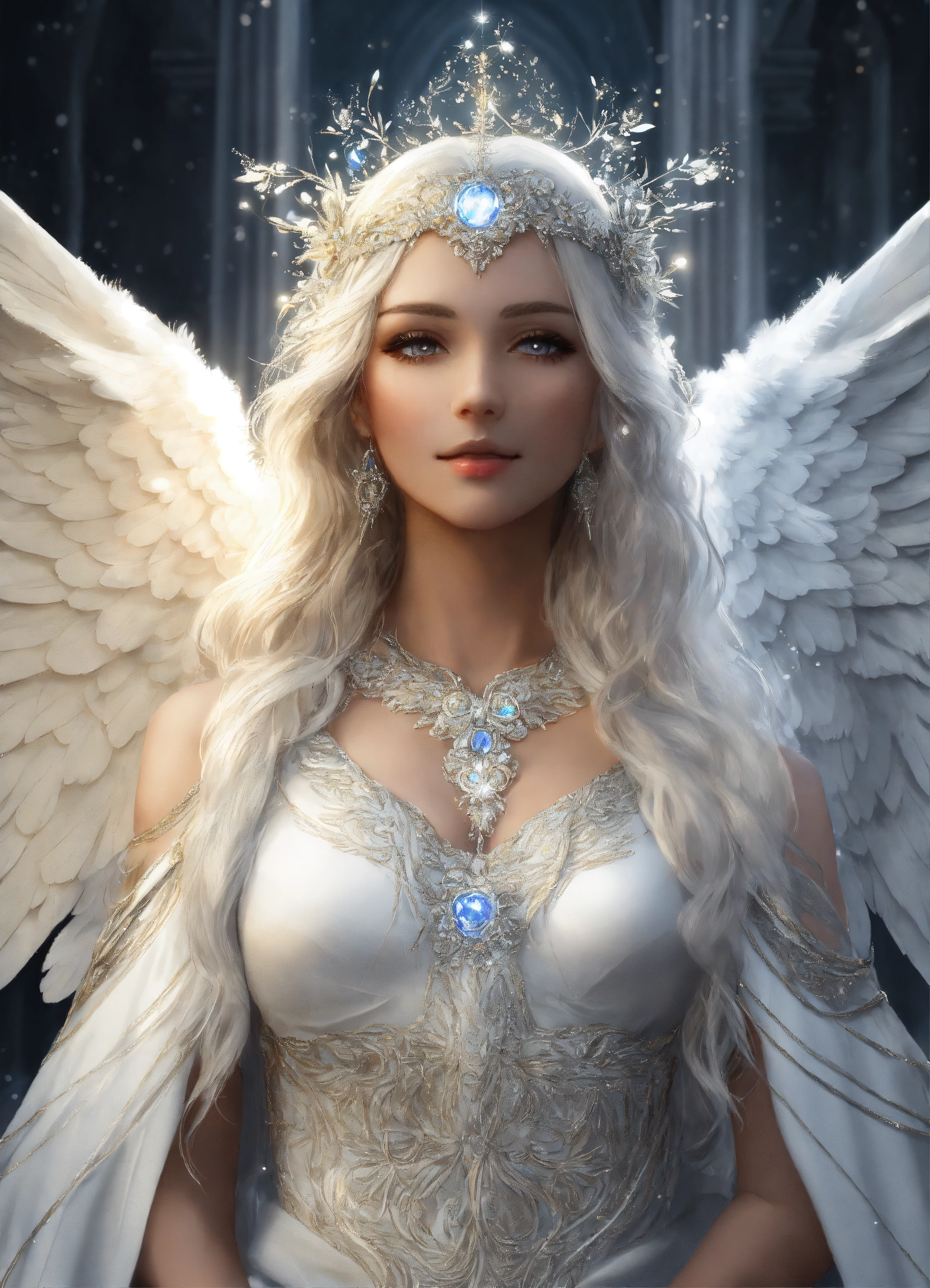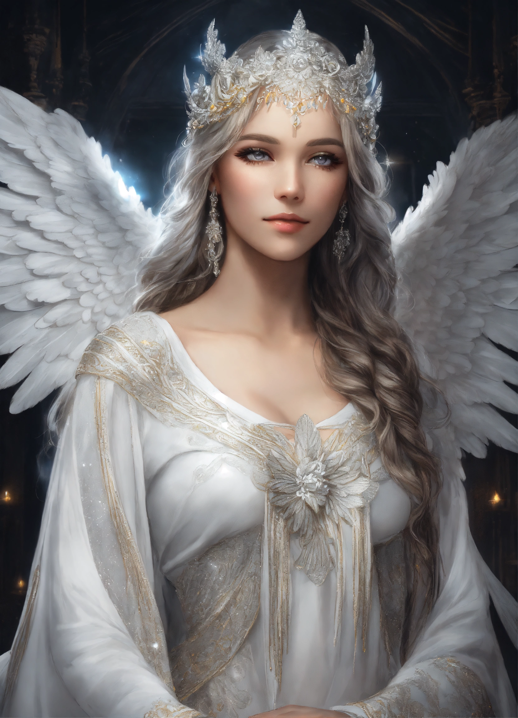 Very detailed realistic drawing, hyper-detailed cinematographic drawing, beautiful and perfect angel priestess woman with white angel wings and detailed and defined luminous flashes, full and large angel wings, beautiful and divine angel priestess with large and uniform wings, beautiful and detailed face, very light gray eyes with a deep and penetrating look, detailed white skin, long hair of very defined luminous neon white color and decoration in her hair with white crystals, white eyebrows and defined white eyelashes, angel with a slight smile, celestial white priestess tunic-type dress with many silver details, in her hands she has a white flower, masterpiece, realism, hd, high quality, high resolution, 8k