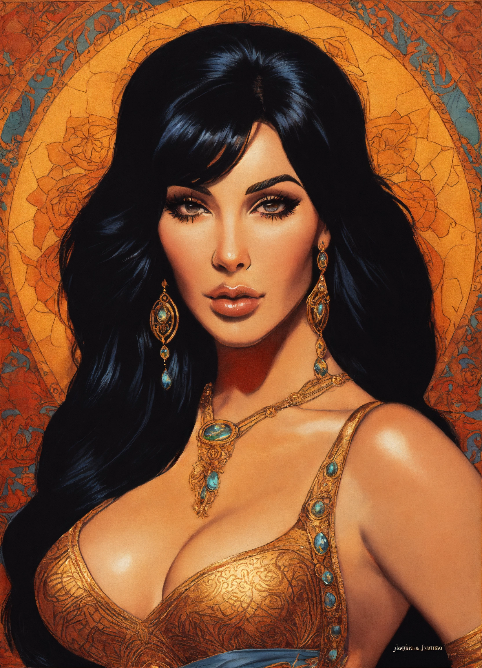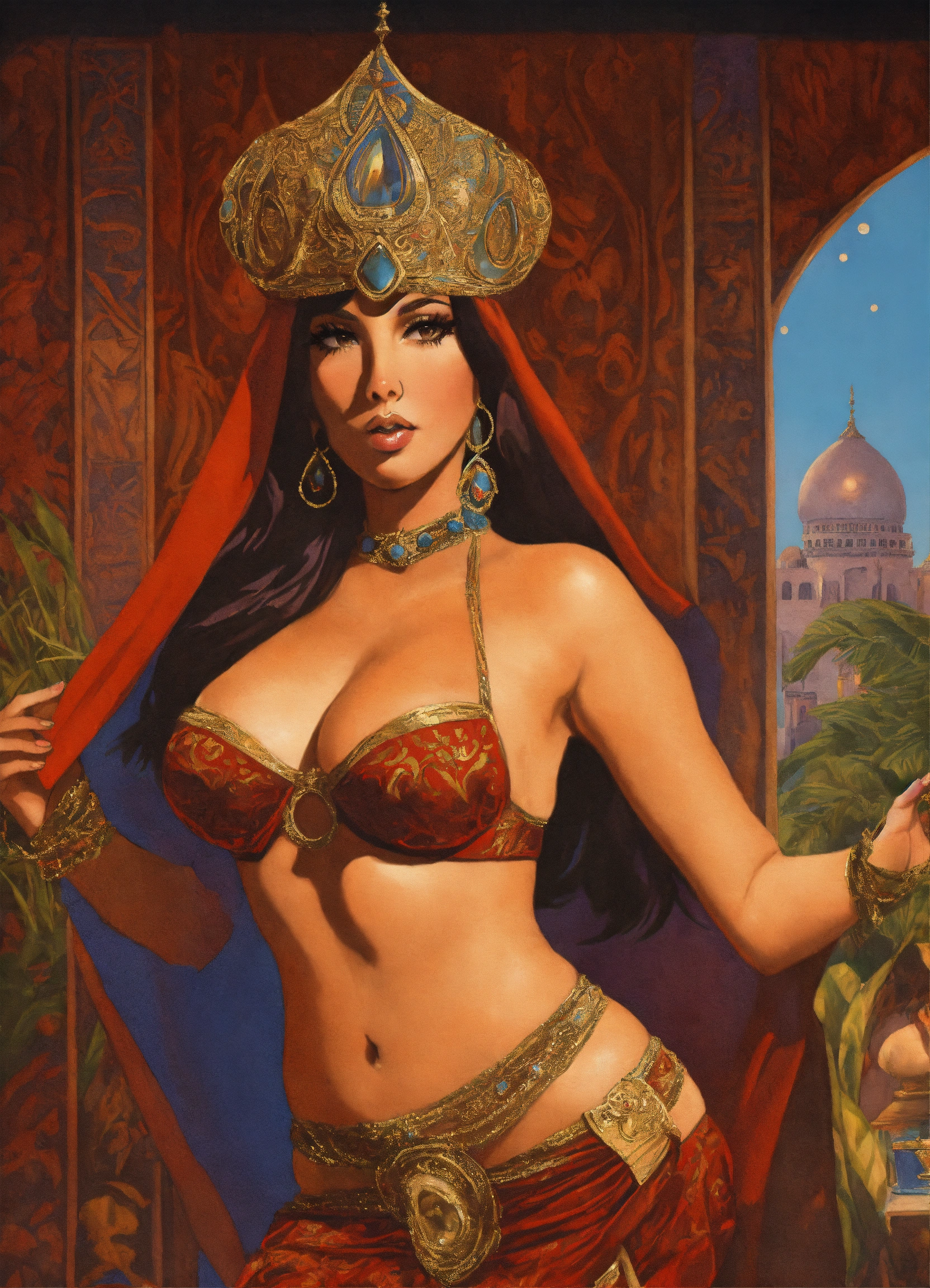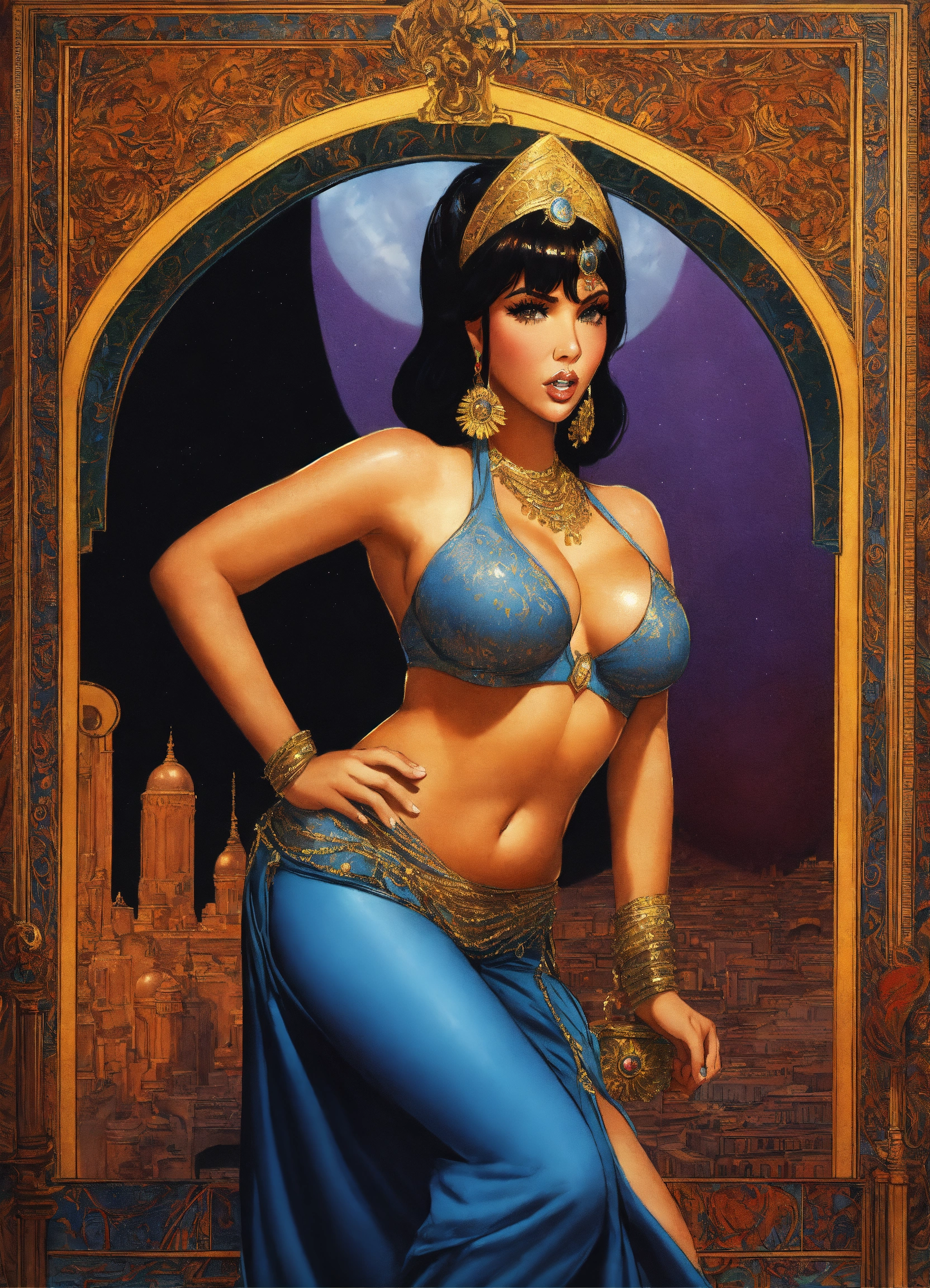 Kim kardashian dressed as genie, 1960's fantasy book cover paper drawing of beautiful christina hendricks as belly dancer with minimalist far perspective, style by larry elmore, by jordan grimmer, barefoot, jordan grimmer, barefeet, gigantomastia
