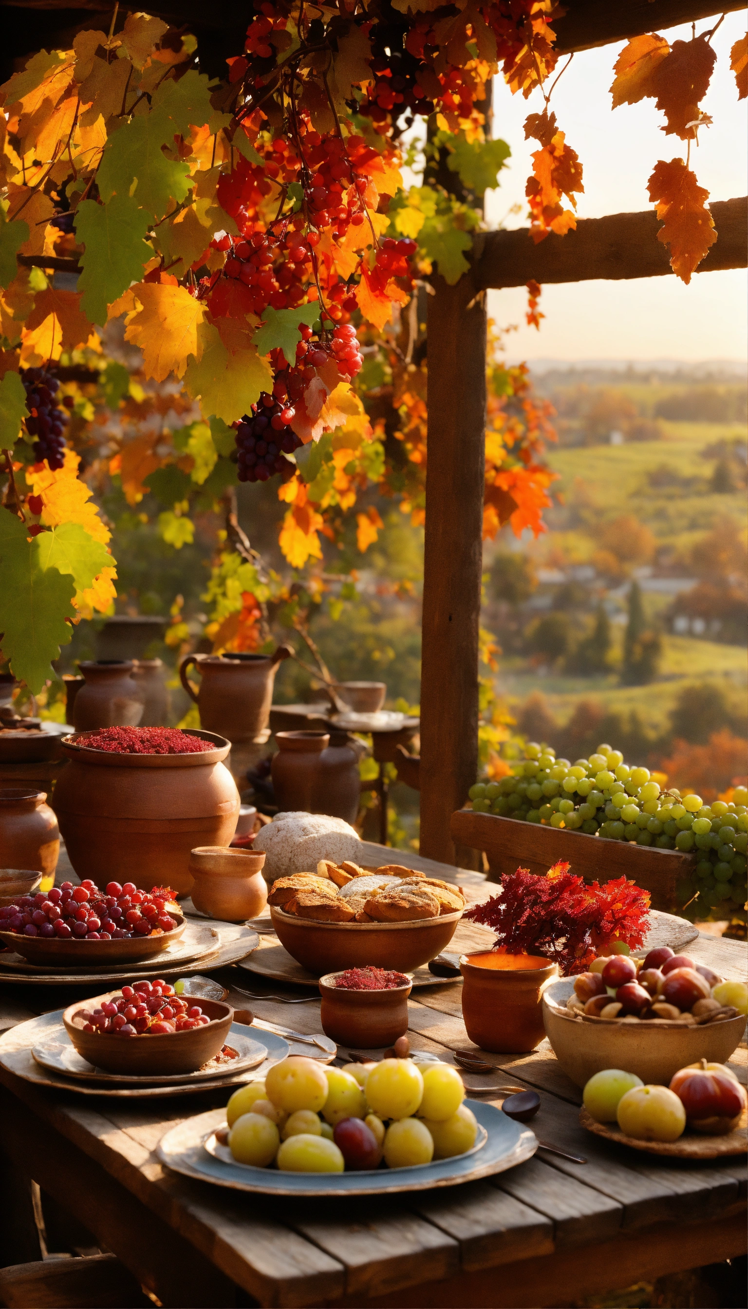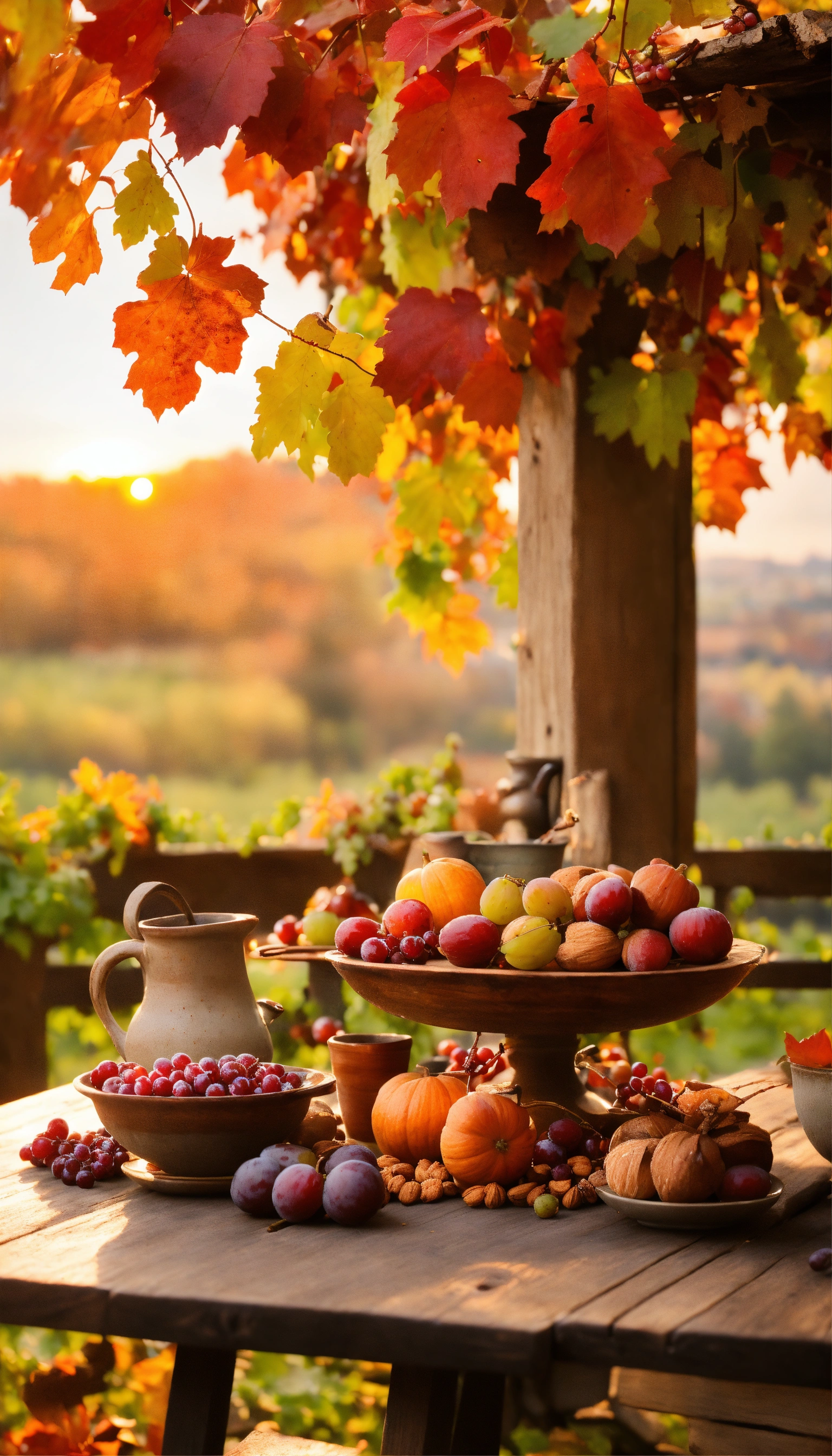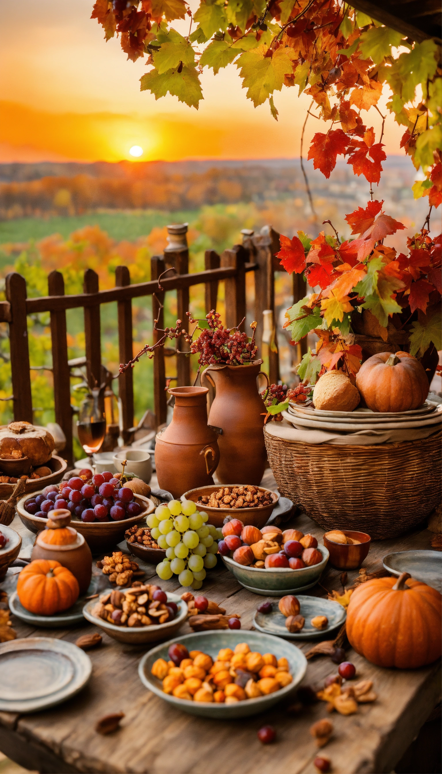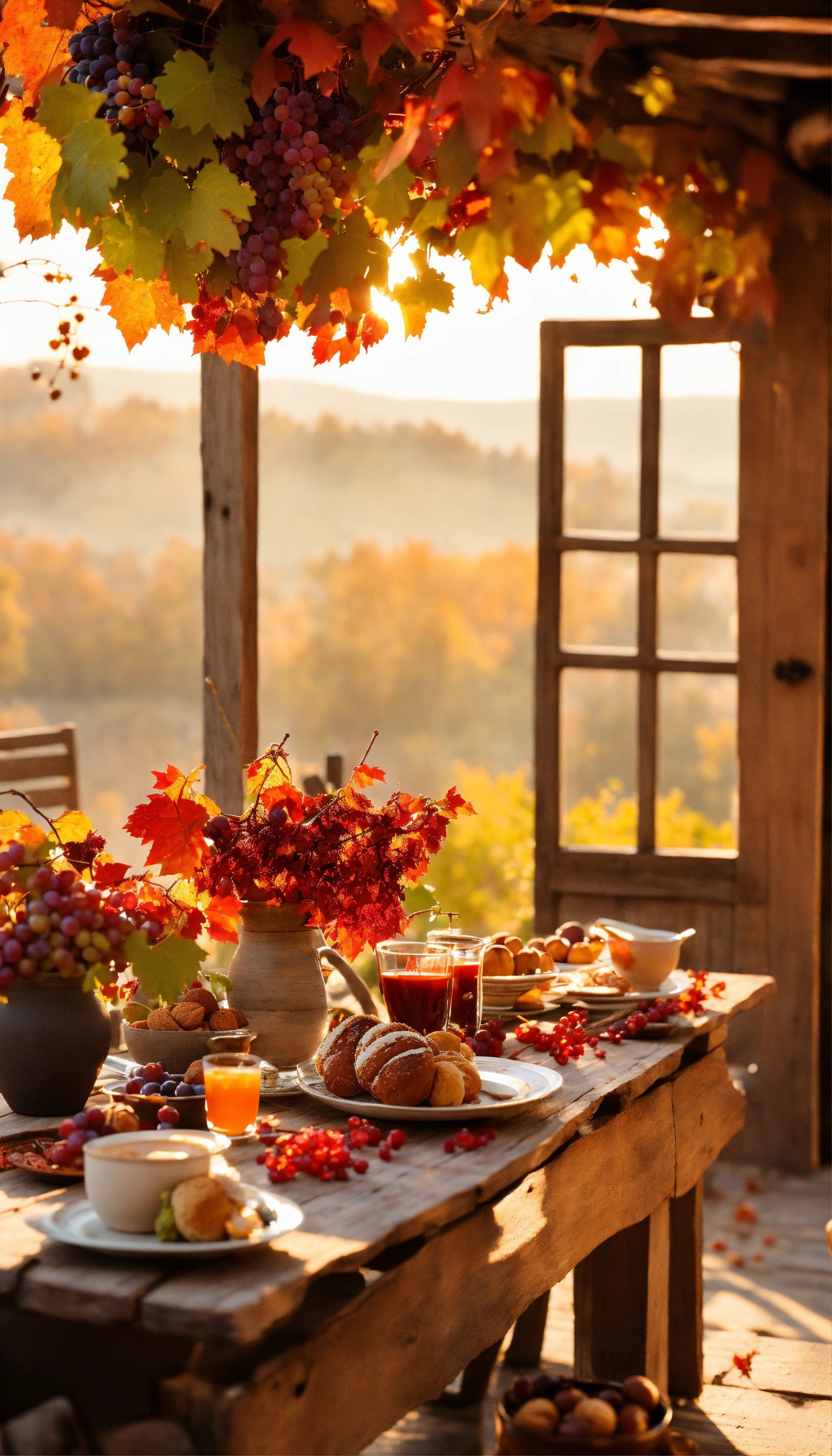 View to a rustic terrace filled with pots with autumn flowers and a vine full of red leaves and bunches of grapes. in the foreground a wooden table with a copious breakfast, coffee, bowls, vases and plates with fruits, nuts, chestnuts, hazelnuts, breads and buns. in the background you can see a sunrise with a soft light