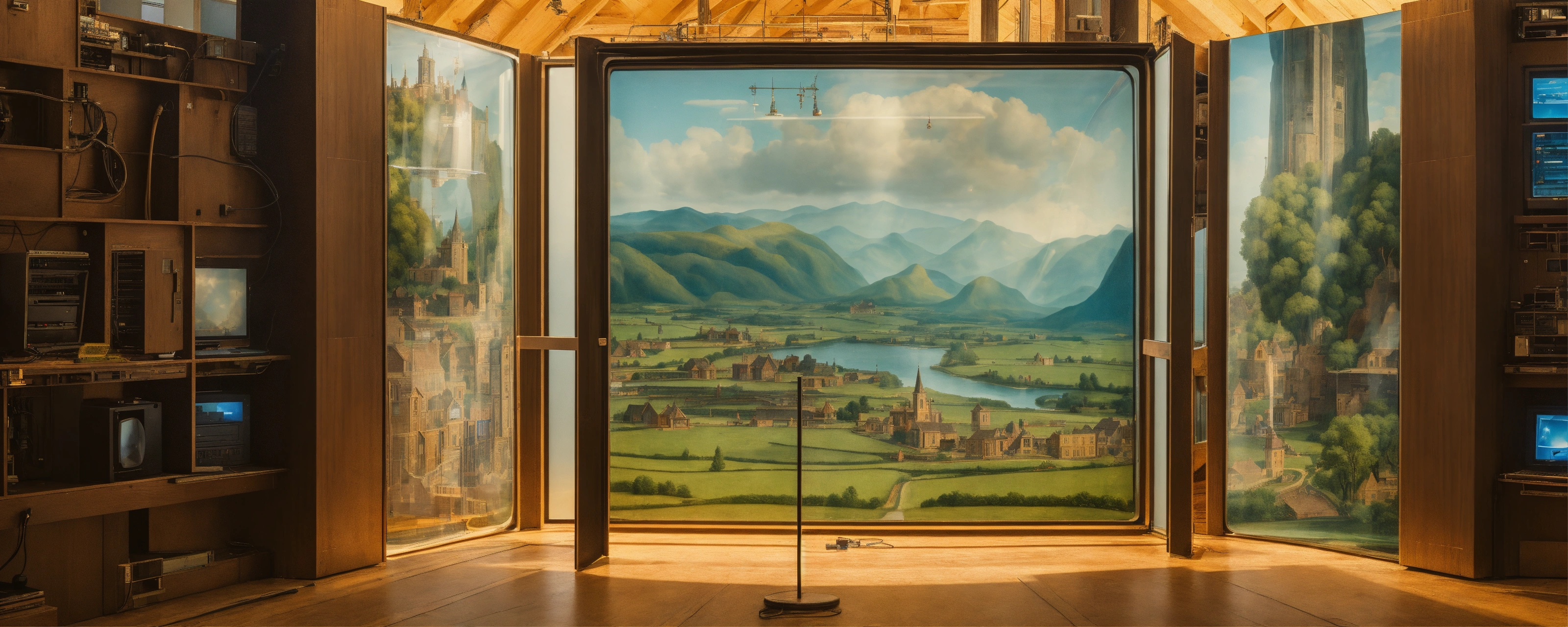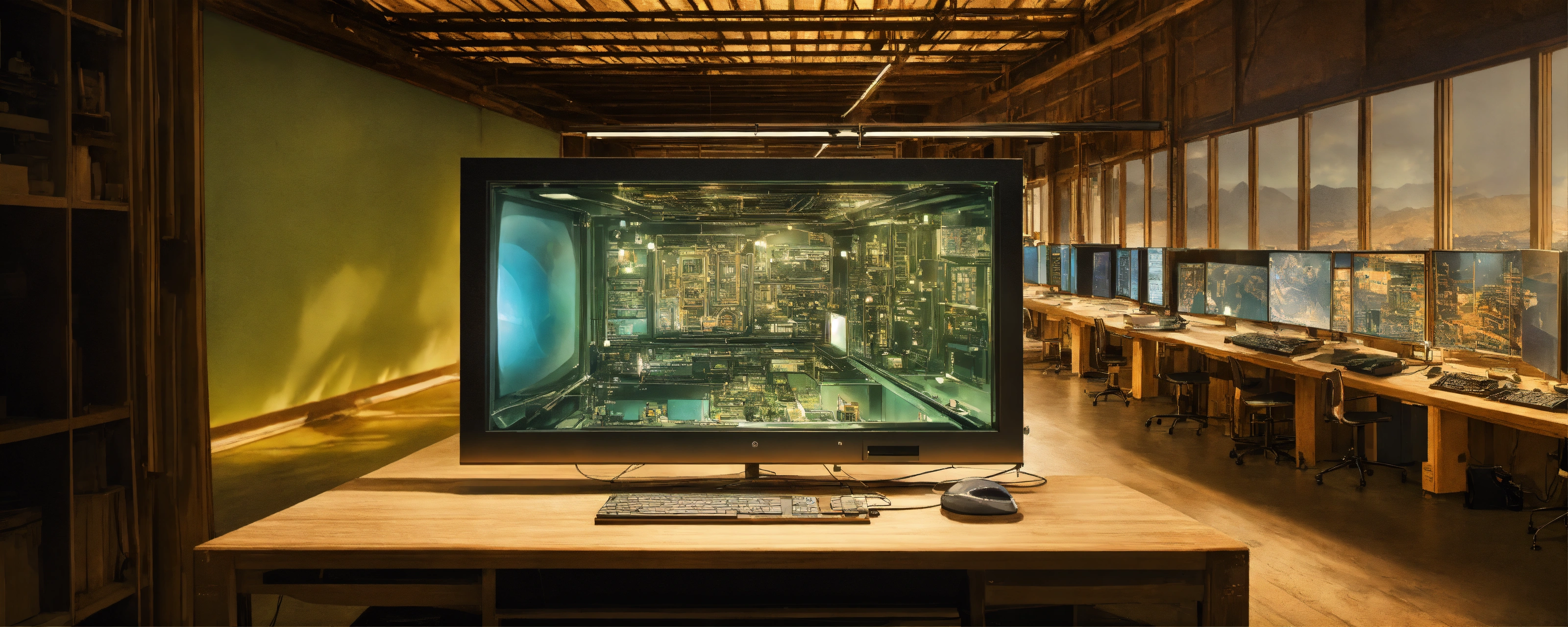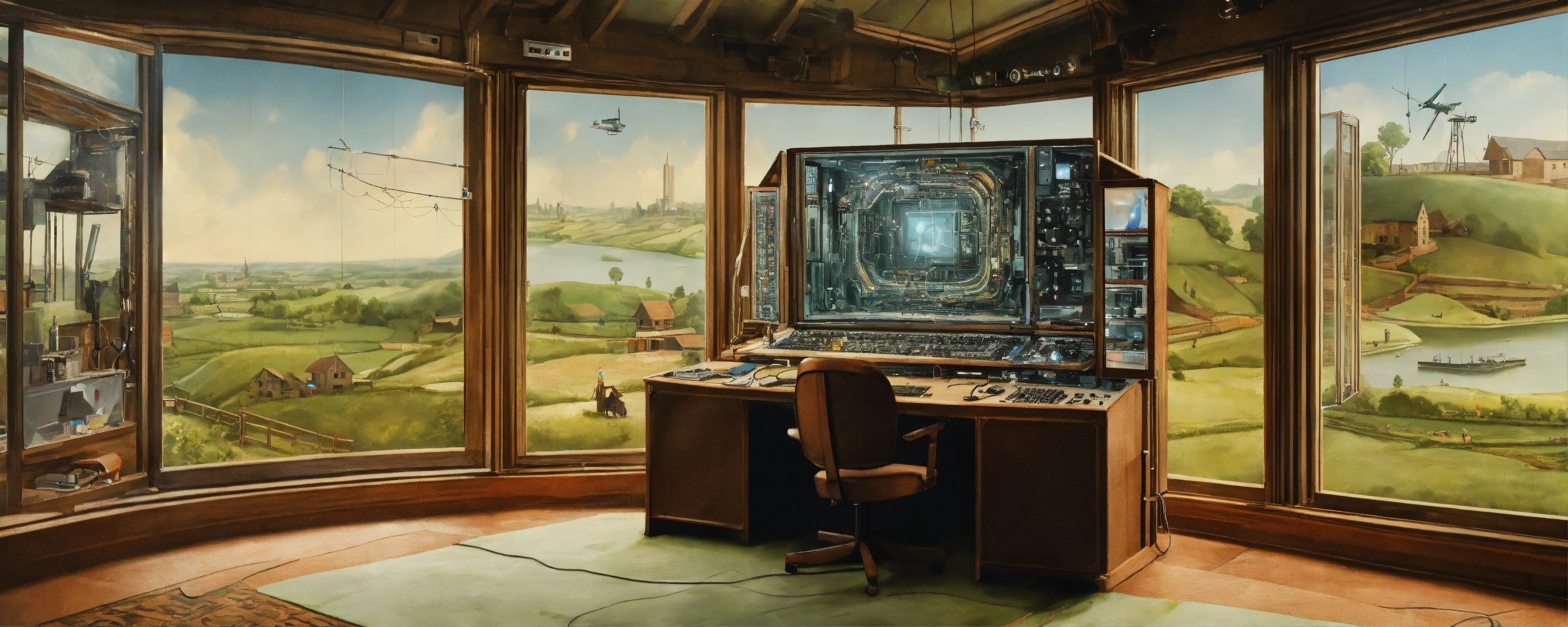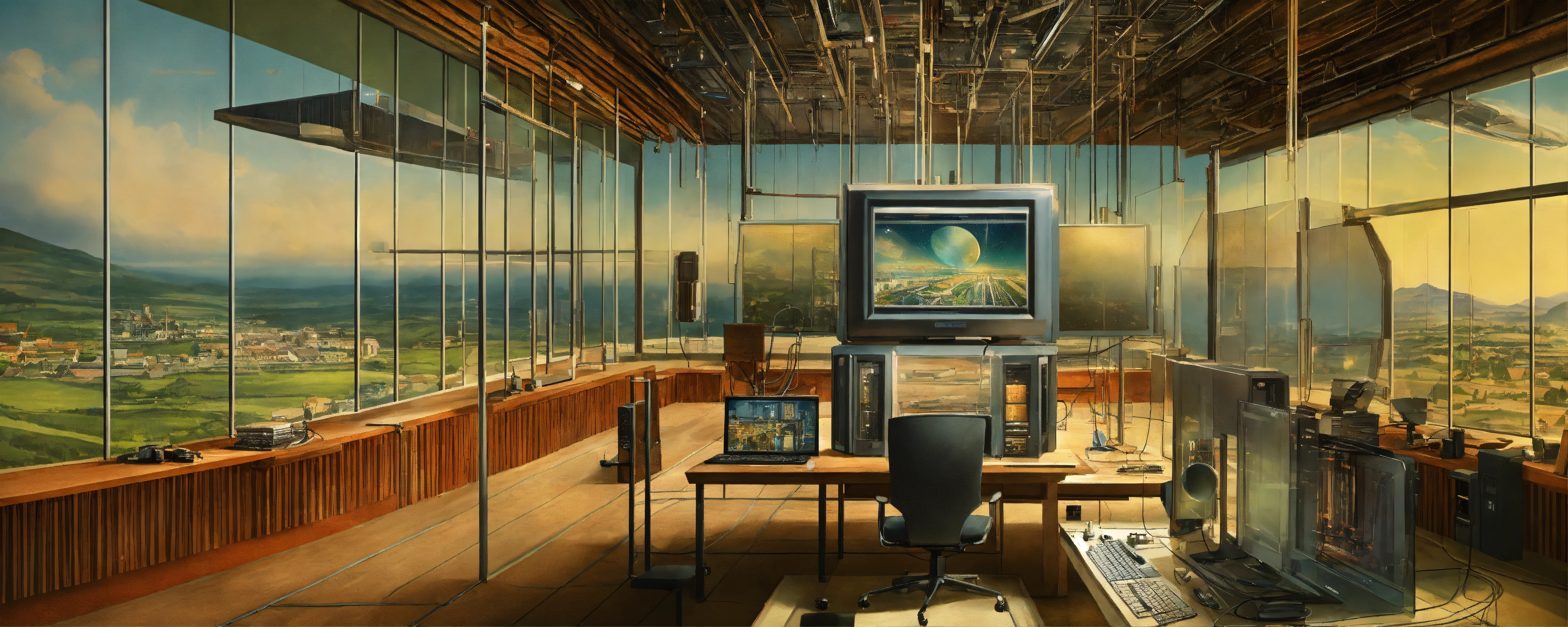A photorealistic close-up view from inside a giant transparent computer, envision we see within a glass computer, observing the inner workings of the computer. there is a village inside the computer. avoid showing the exterior, focus solely on the concealed inner part. crafted by hieronymus bosch and rene magritte, this image is highly detailed, boasting an exceptionally high resolution, and it offers a surrealistic depiction of the construction of the computer
