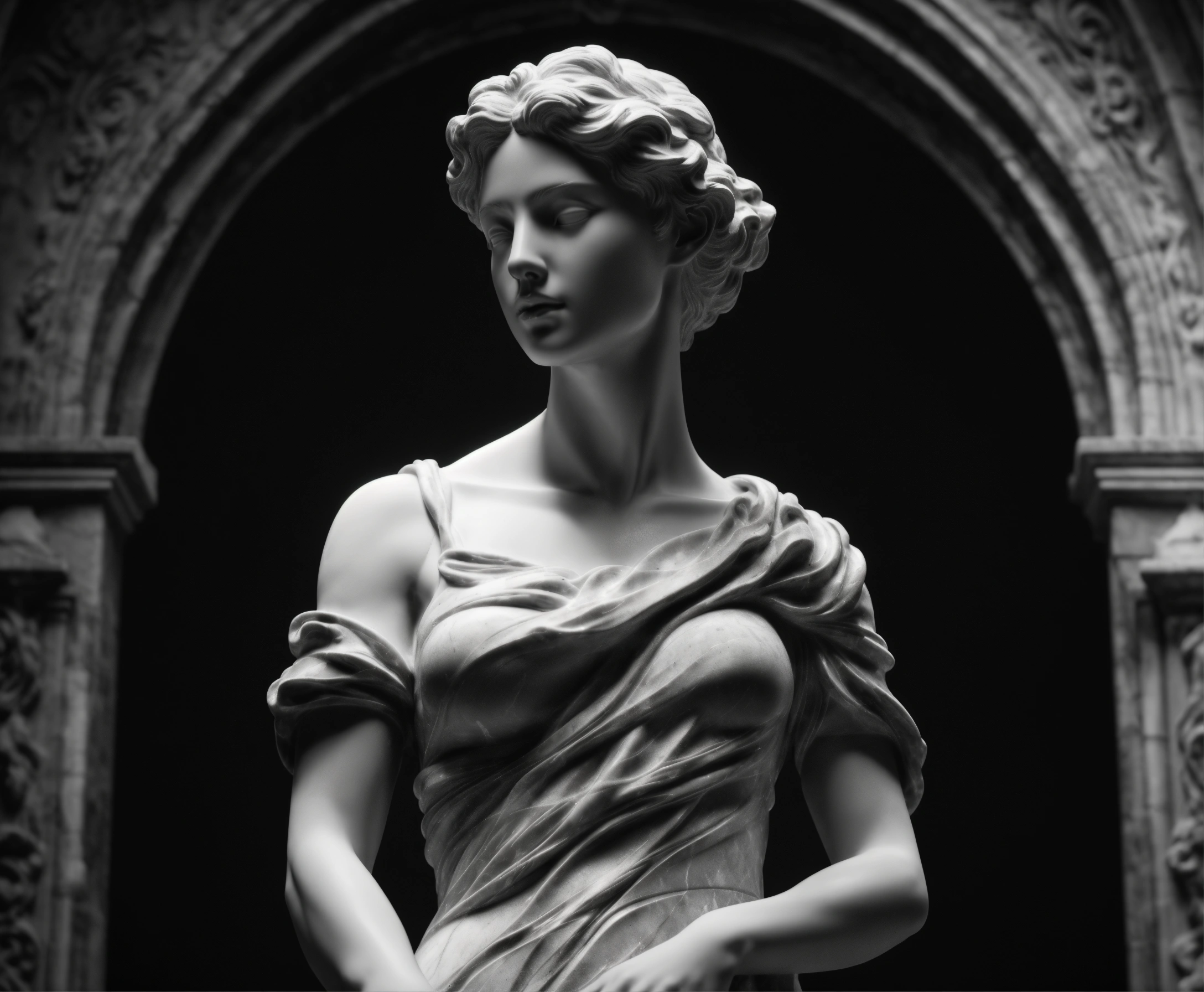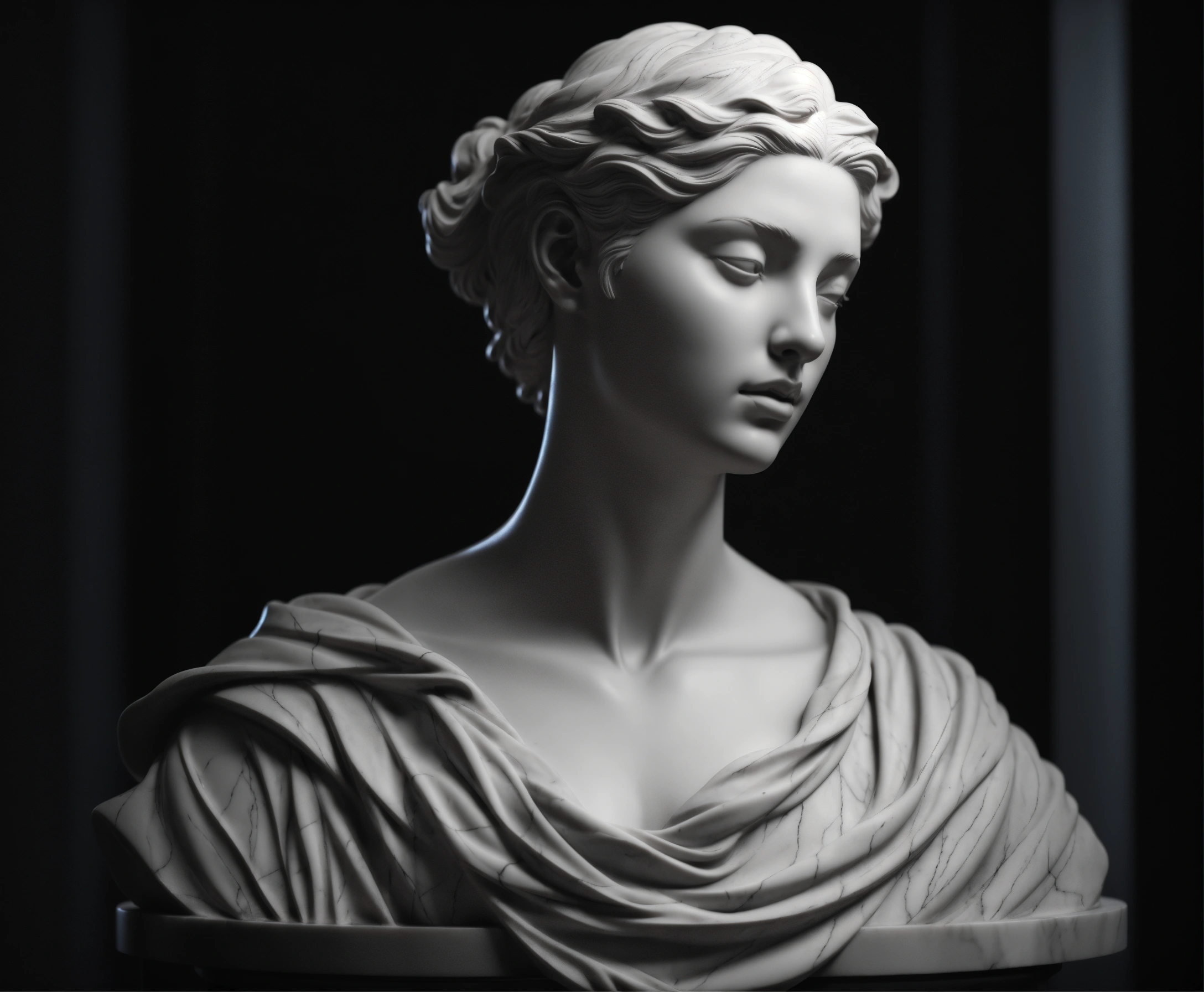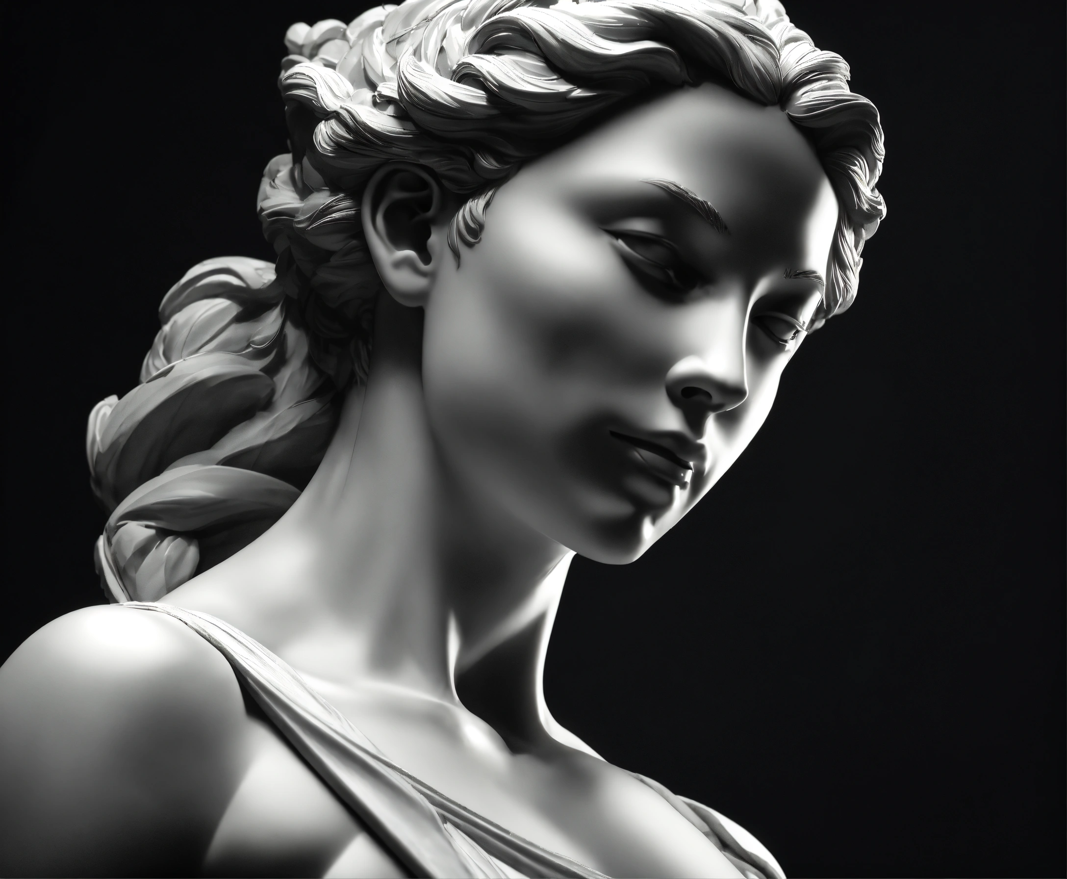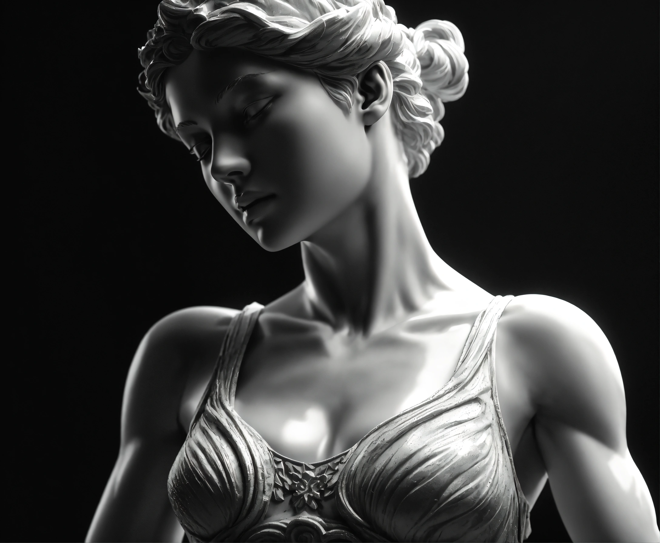 Michelangelo sculpture of half body athletics woman in black and white marble, beautiful girl, wonder model, full character art in blender 3d using volumetric lights loop renderer in dark divine ambient setting, 4k, sharp, wlop, vray, black background