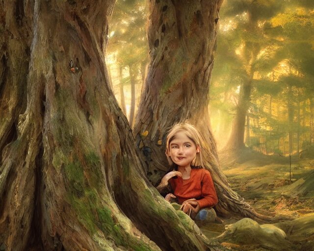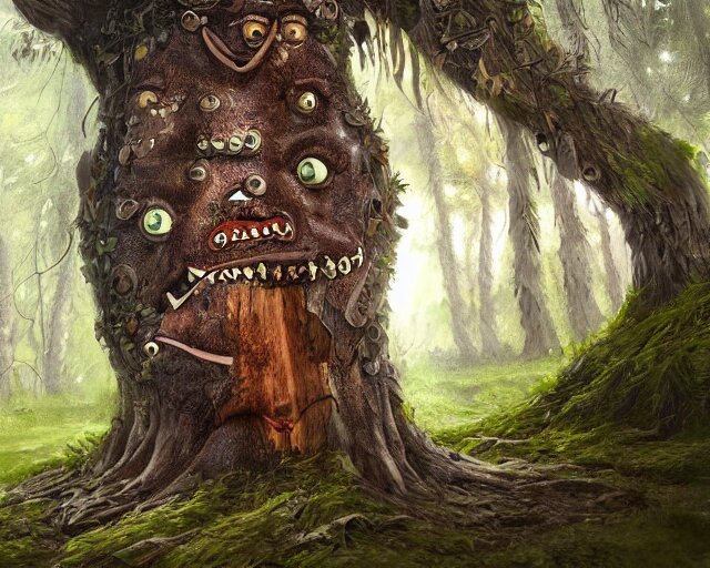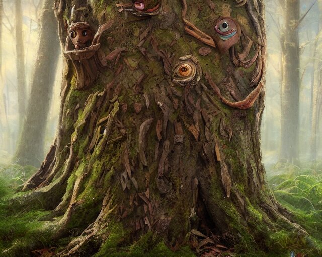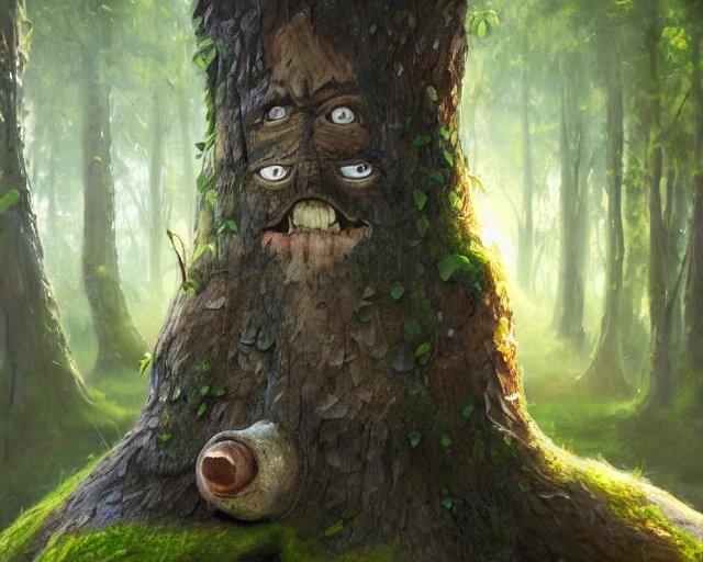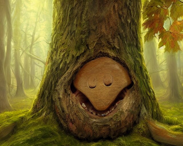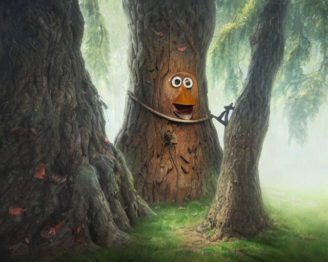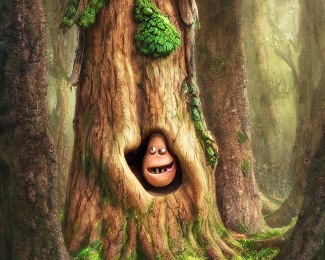 A talking tree, a smiling face in the bark, nose made of wood, mouth in the bark, fantasy concept art, oil painting, hyperrealistic, highly detailed, artstation, cgsociety, in the forest