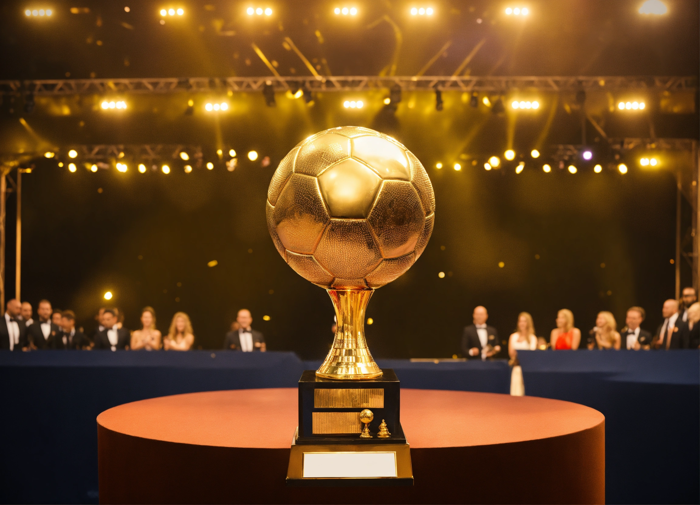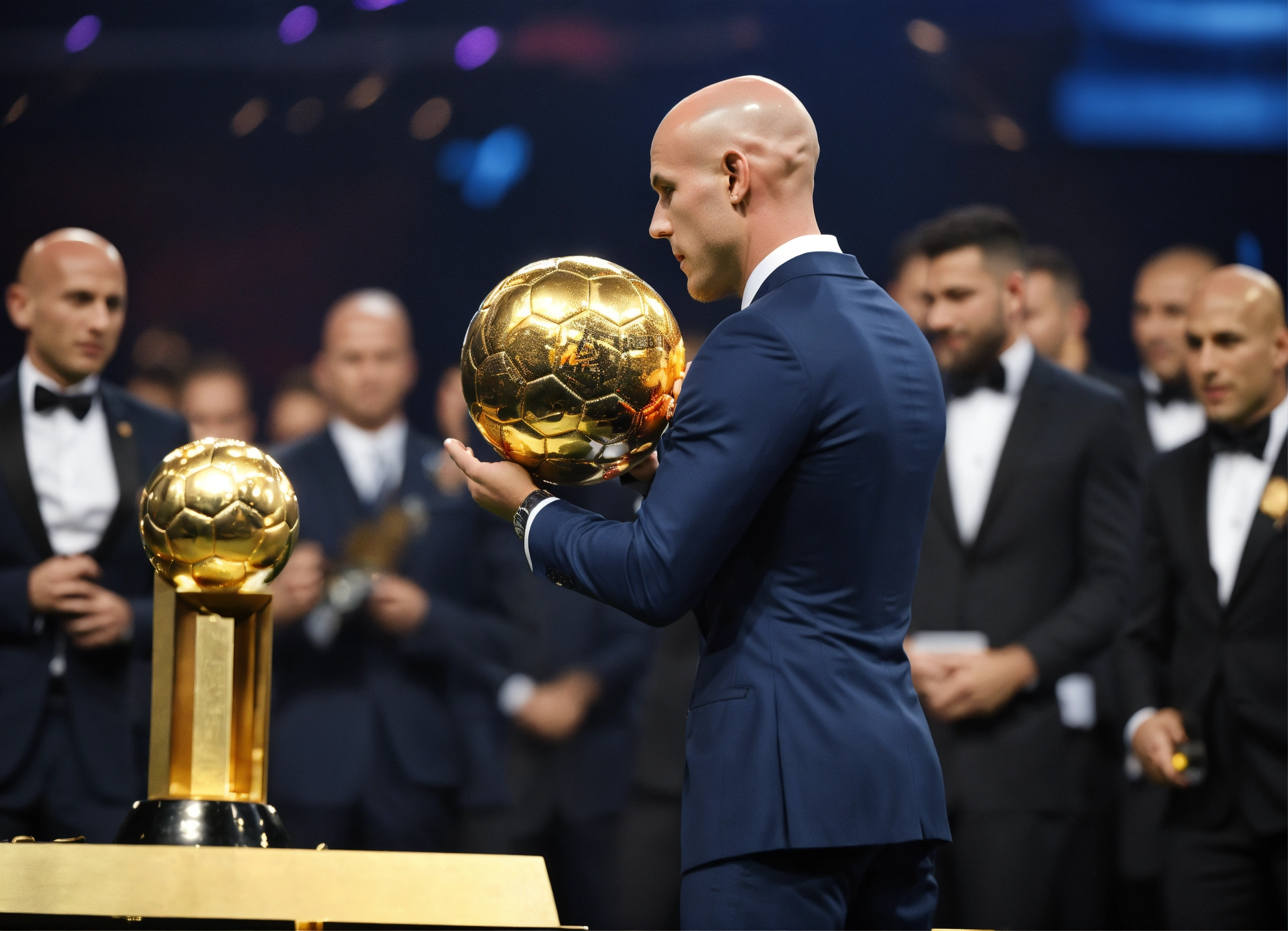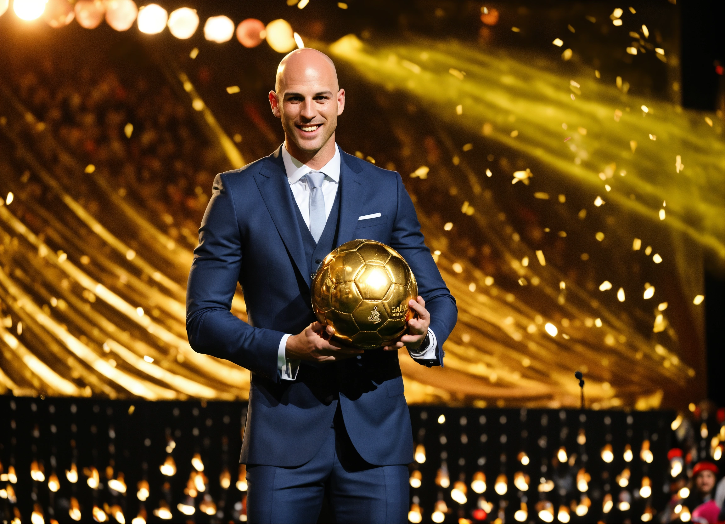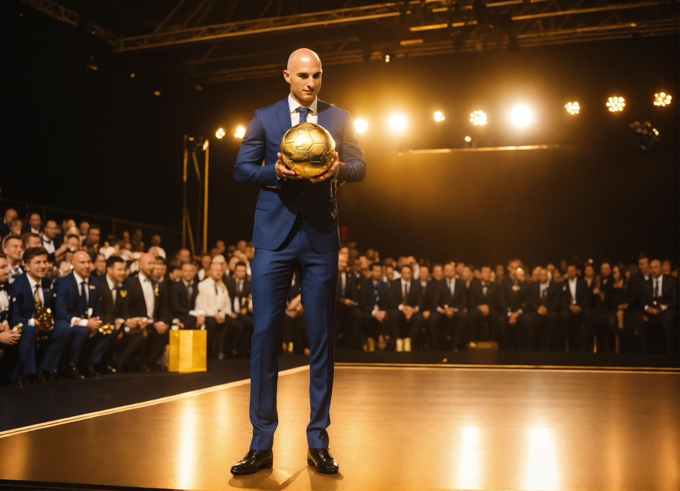 Awarding the golden ball to the best football player, on stage, half of the body is visible, a man in a suit, bald head