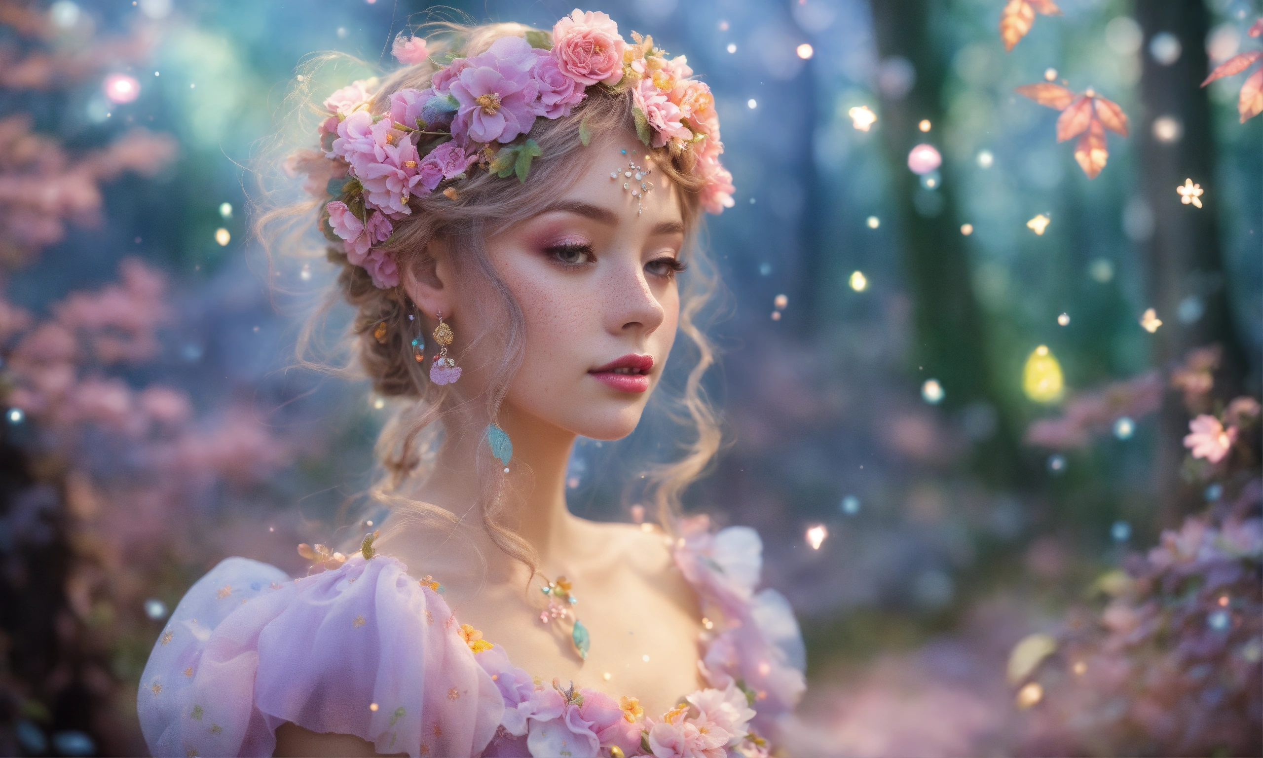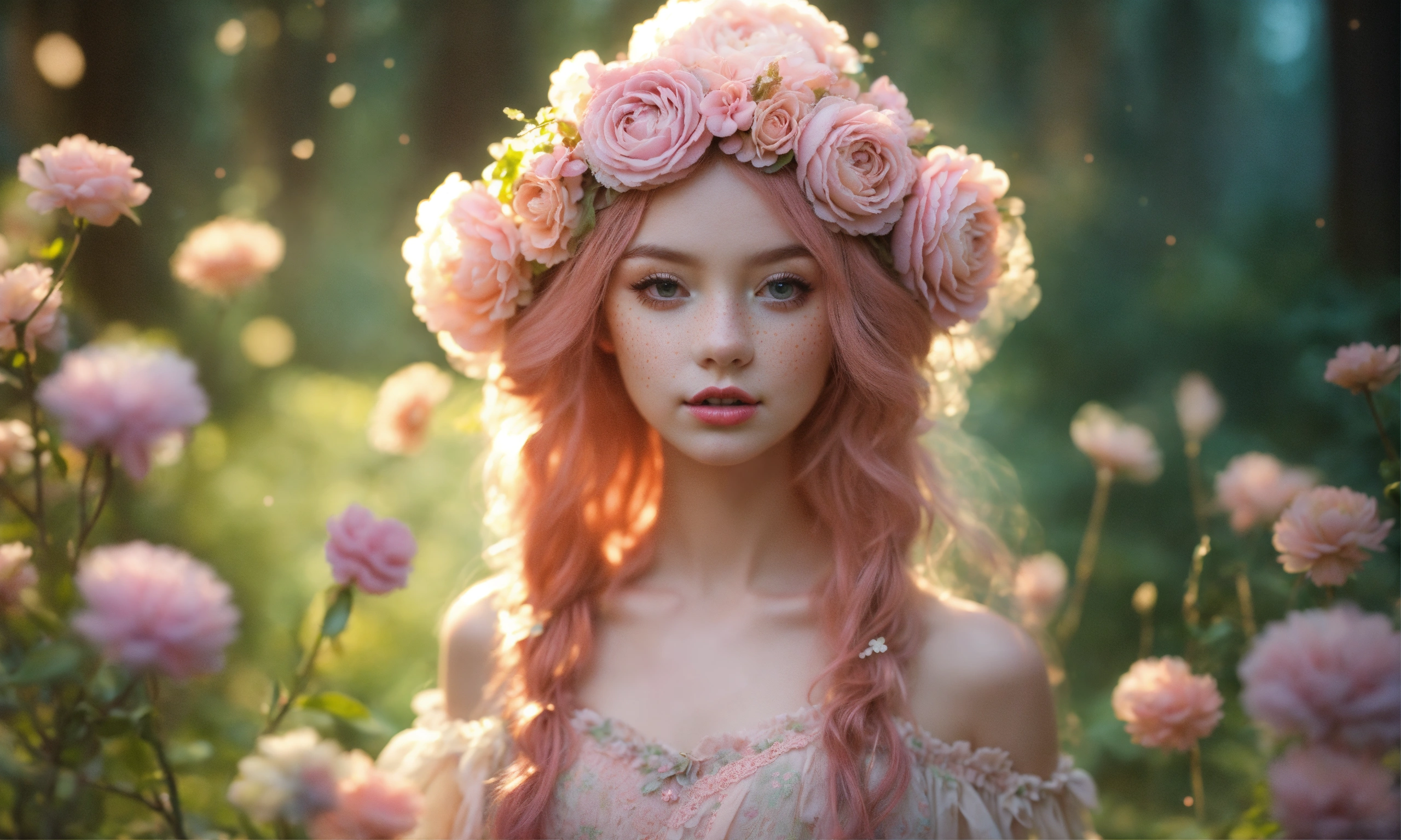 Shabby chic dreamy glowums pastel woodland freckled fairygirl swirling magical fairytale realistic style, 8k