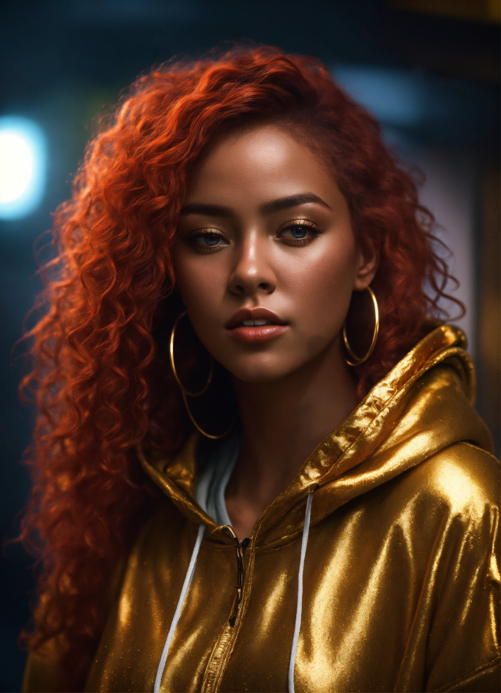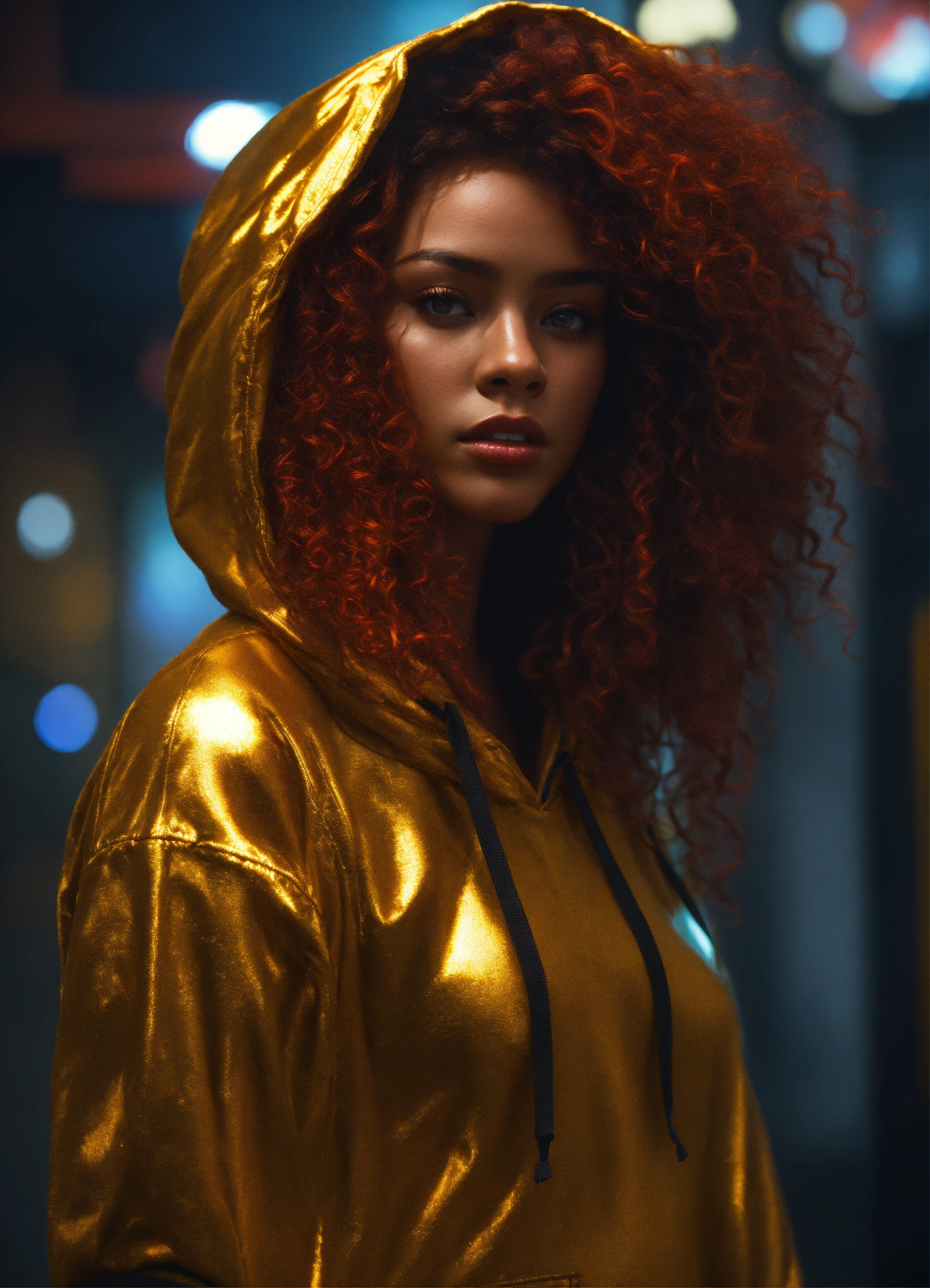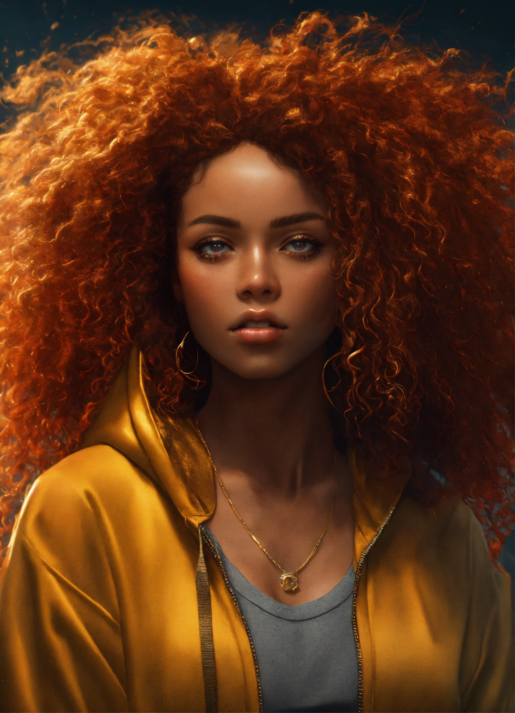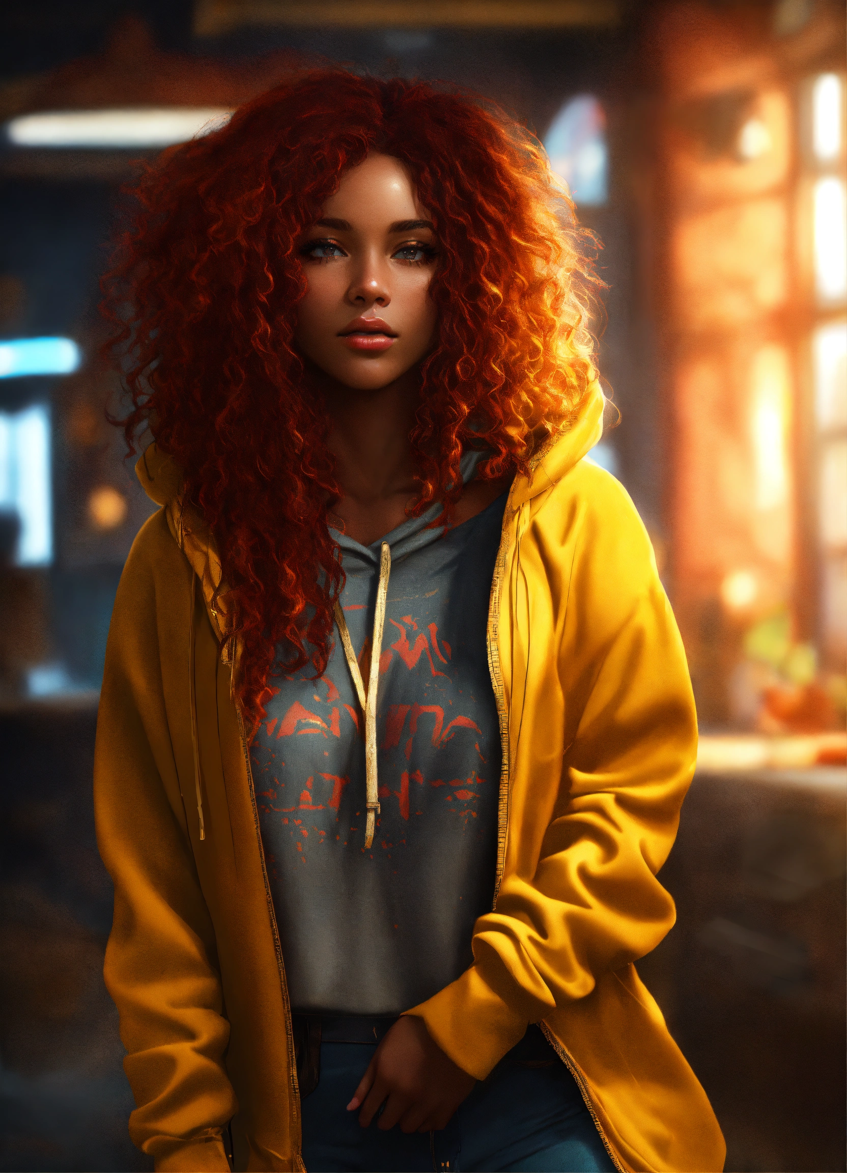 Pretty black woman, long messy curly red hair, wearing gold hoodie, full length model pose, photorealistic, highly detailed, digital painting, concept art, smooth, trending on artstation, cgsociety, 8k, depth of field, octane render, unreal engine, global illumination, cinematic, radiant light, elegant, intricate, epic composition, hypermaximalist, vibrant colors, perfect, stunning, extremely hyperdetailed, high resolution, award - winning photo, cinematic lighting, masterpiece, hdr