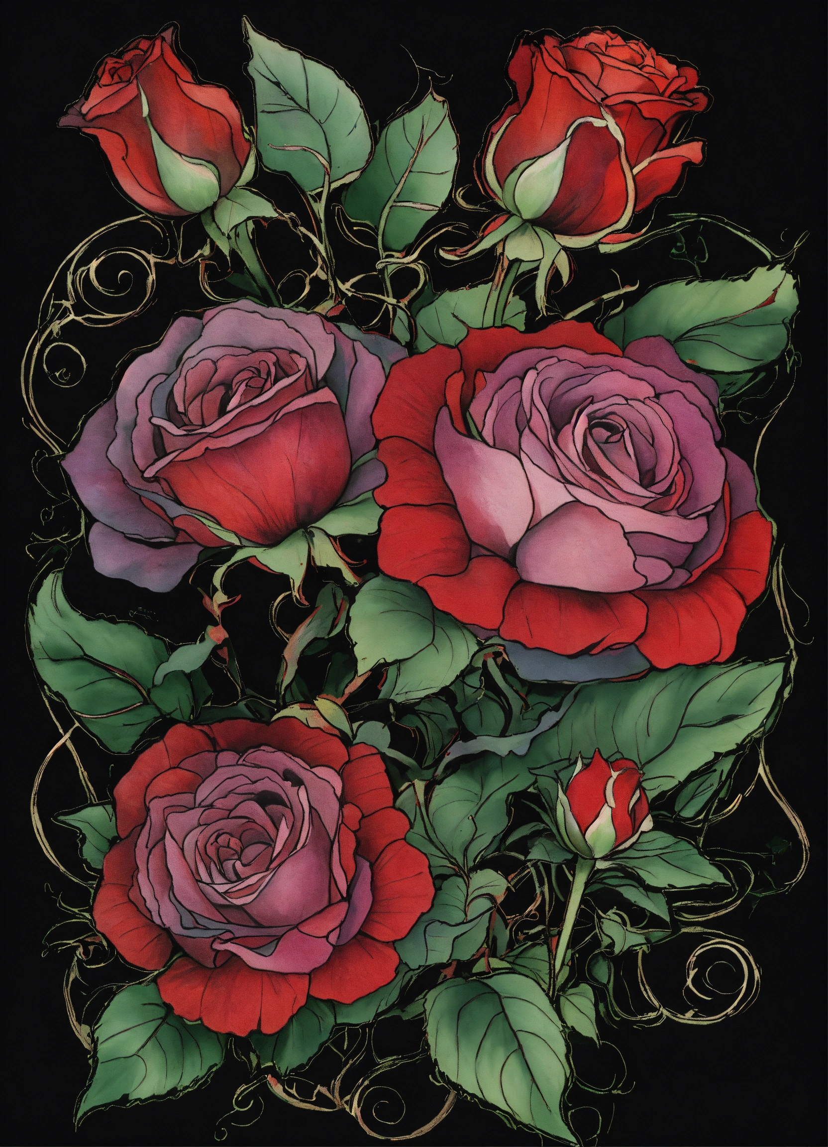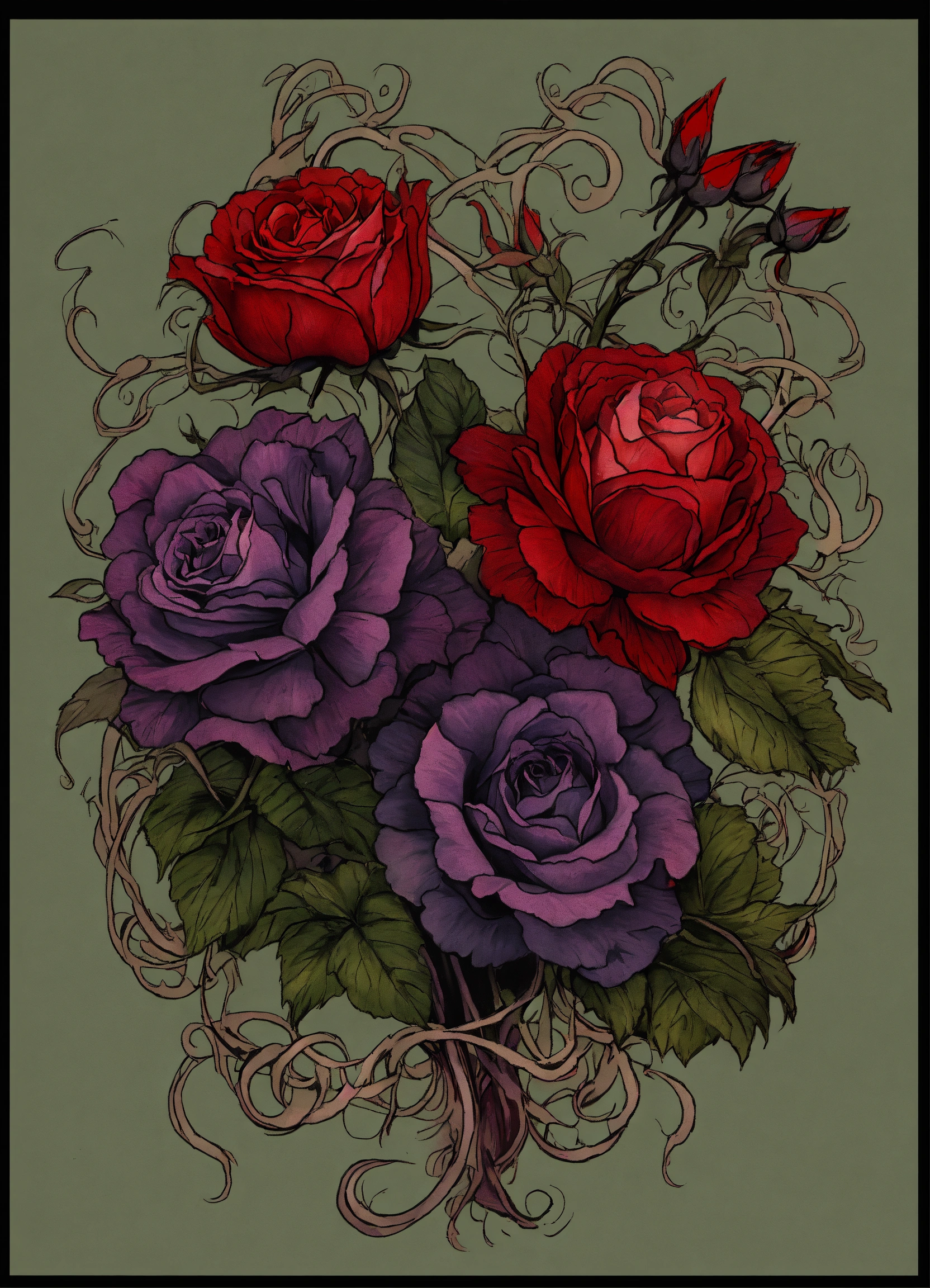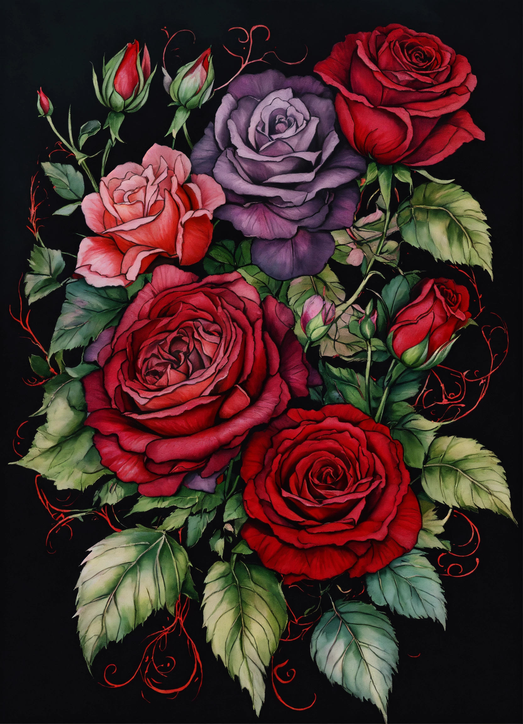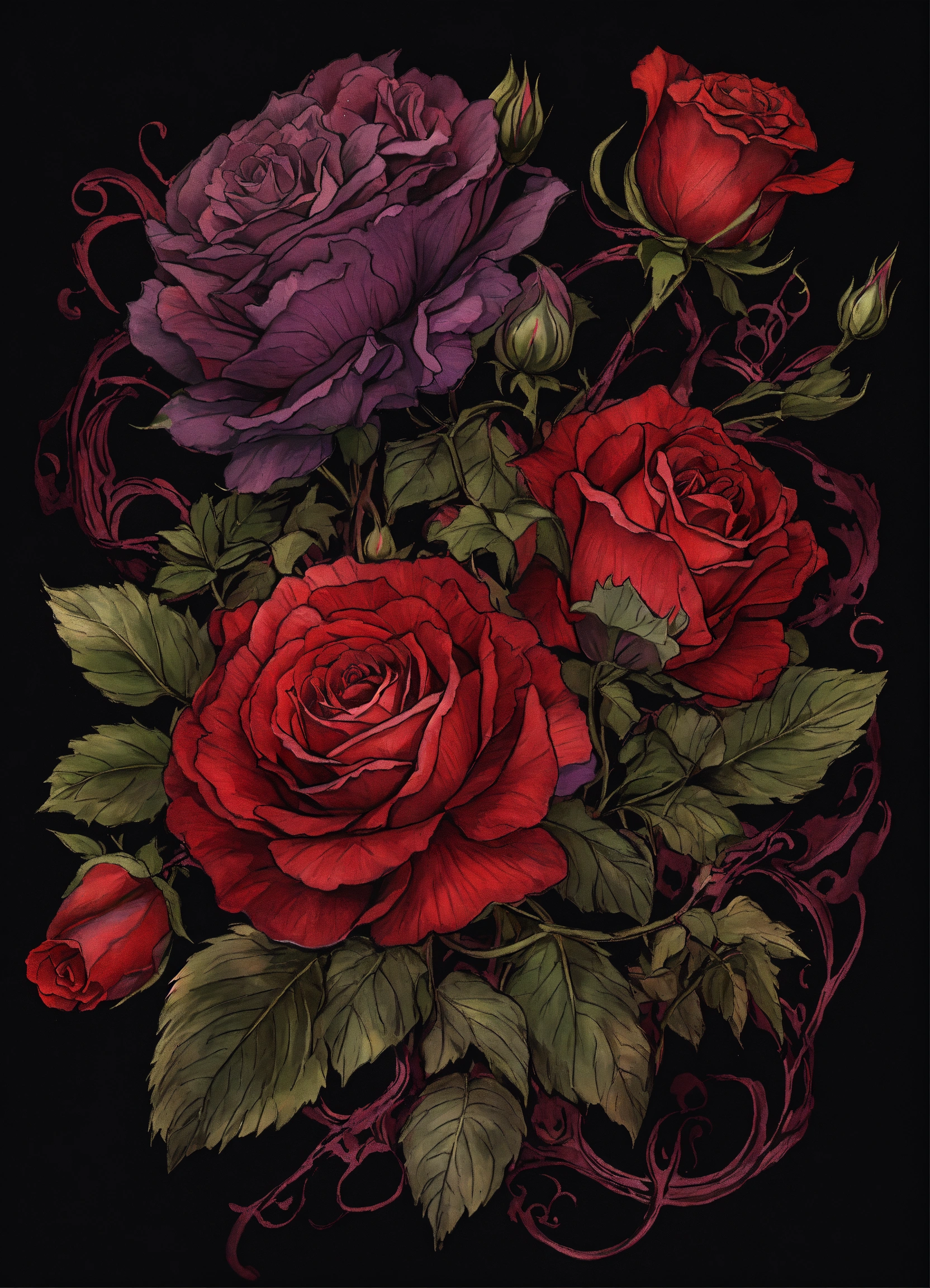 Ink drawing tattoo, gothic style image of flowers including roses with dark muted green, purple and red with stems and leaves entwined into black background